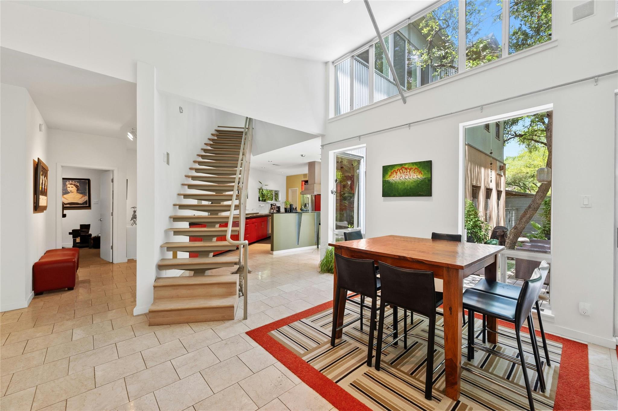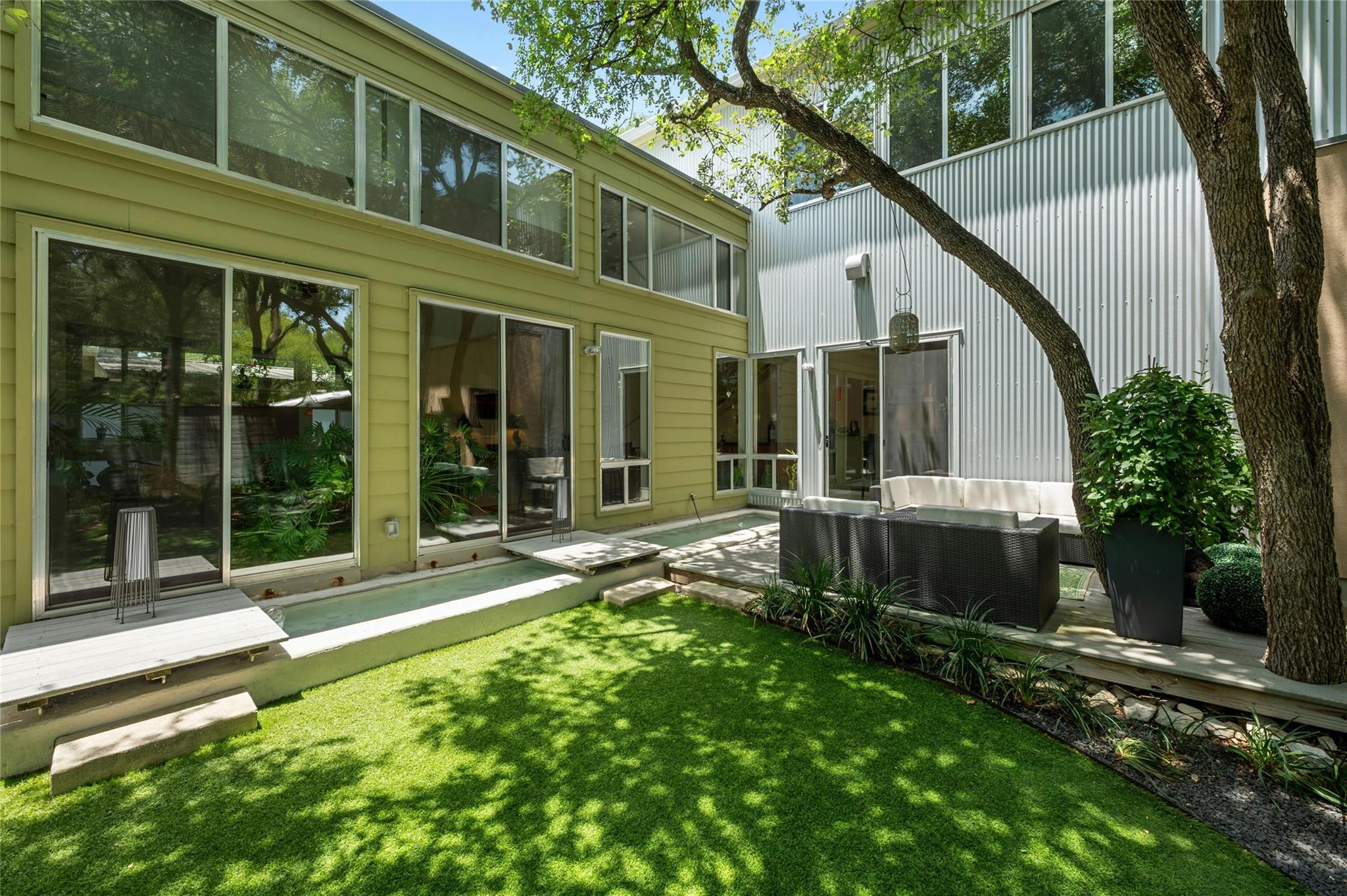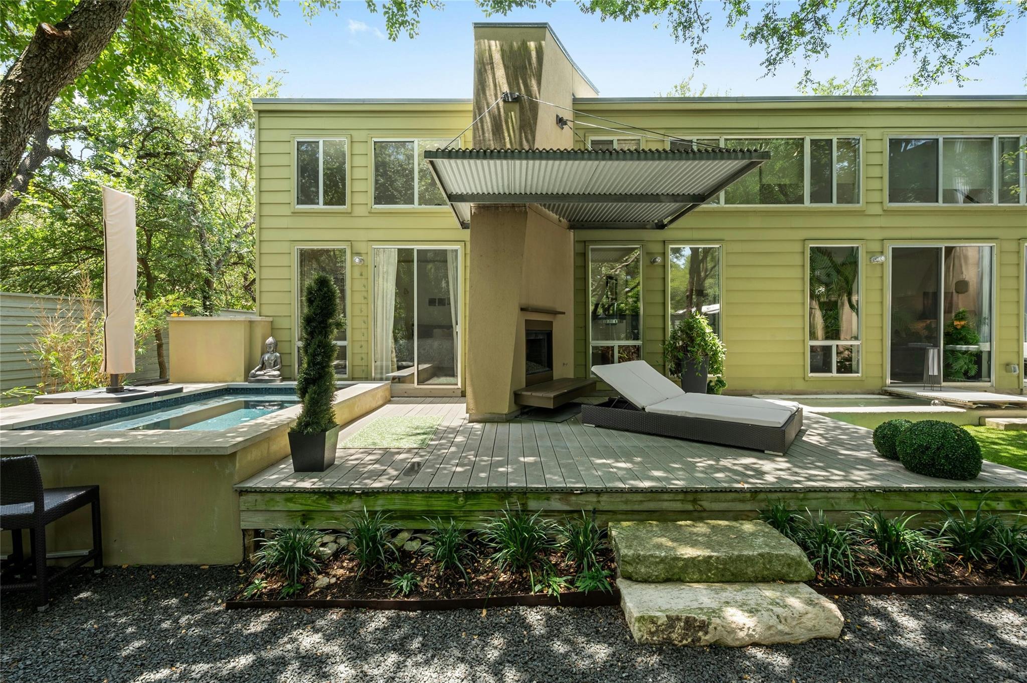 Very private modern home from street. Inside the house opens up with tall ceilings and a wall of windows to a beautiful private backyard sanctuary with gardens, a splash pool that also serves as a hot tub and an outdoor fireplace. Curved walls and an open staircase add an interesting design element to the house. Primary bedroom and a guest bedroom are on the main level. There's a beautiful, open, well lit living area as well as a private office on main level. Upstairs are 2 bedrooms and another living area. Great location and beautifully designed house. 42 Solar Panels make electric bills almost nothing!!!