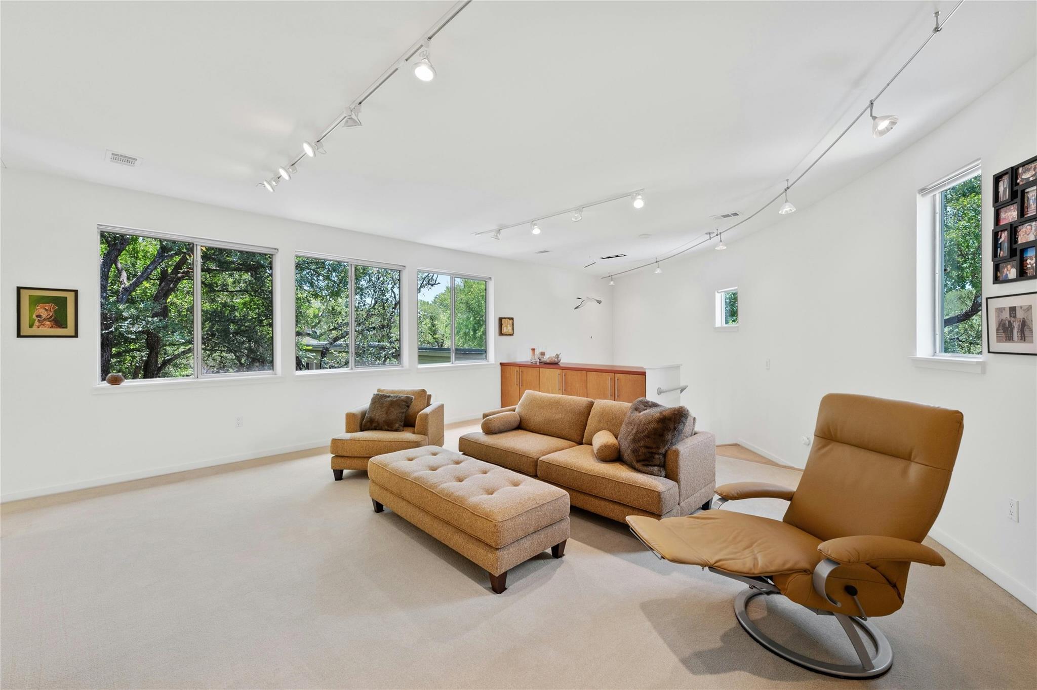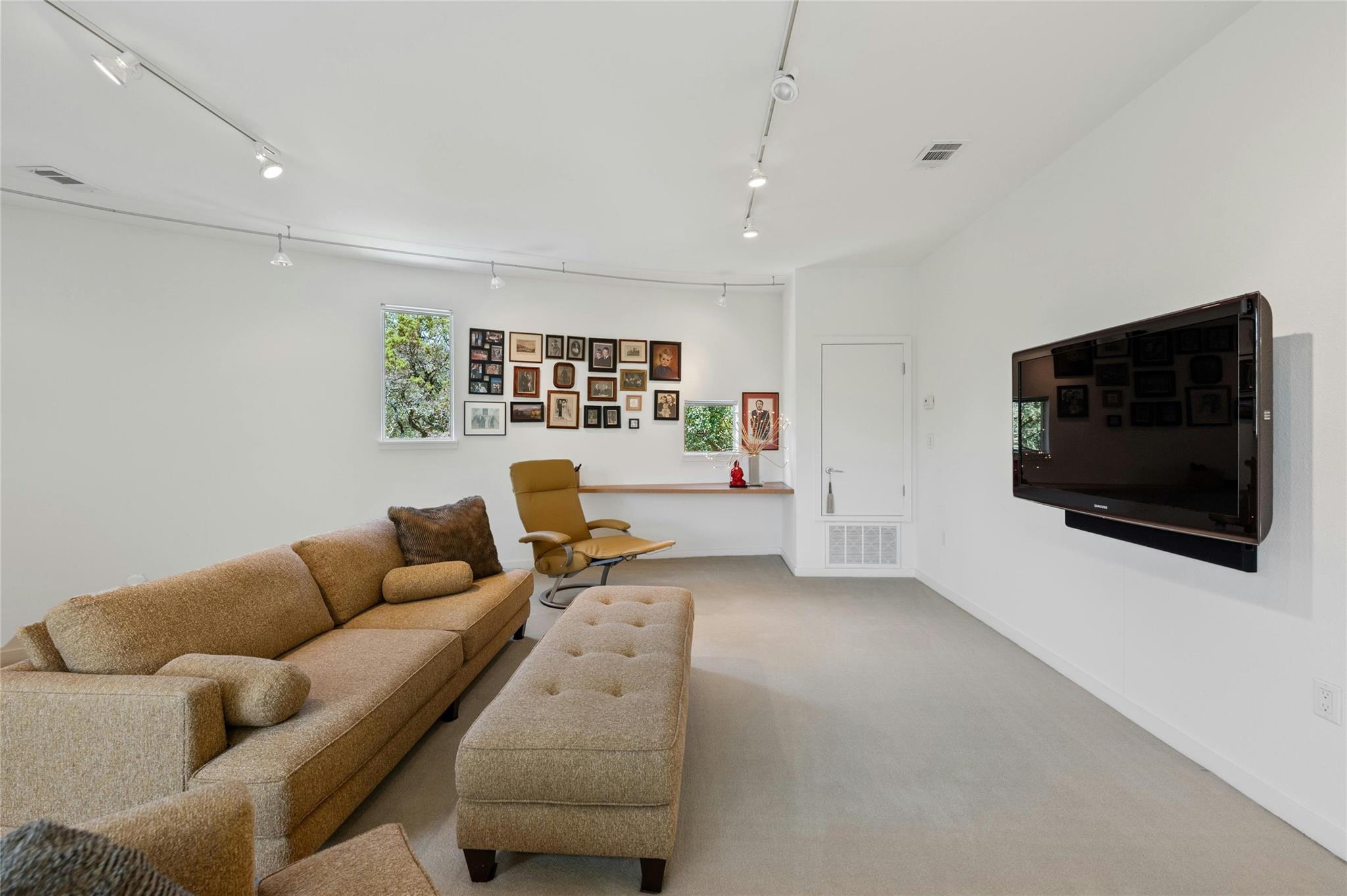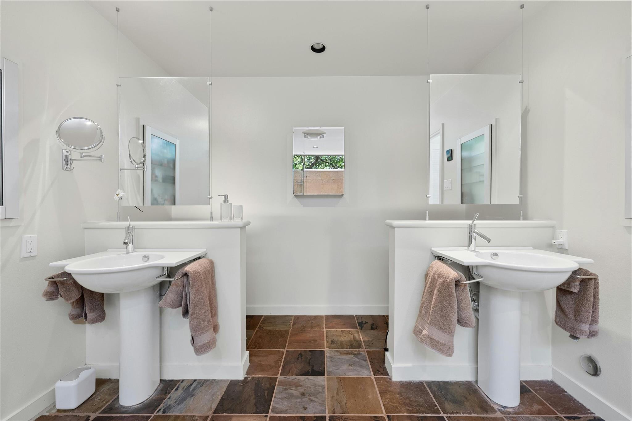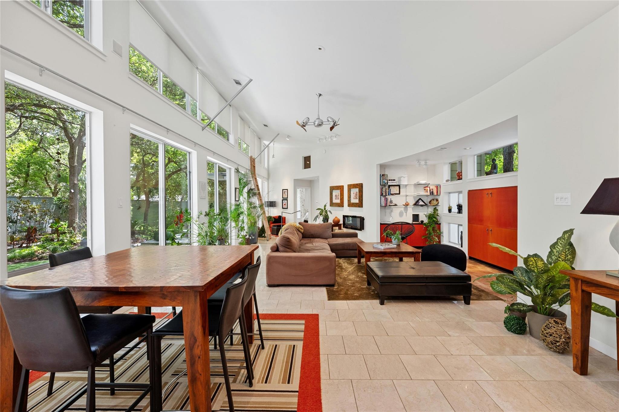 Very private modern home from street. Inside the house opens up with tall ceilings and a wall of windows to a beautiful private backyard sanctuary with gardens, a splash pool that also serves as a hot tub and an outdoor fireplace. Curved walls and an open staircase add an interesting design element to the house. Primary bedroom and a guest bedroom are on the main level. There's a beautiful, open, well lit living area as well as a private office on main level. Upstairs are 2 bedrooms and another living area. Great location and beautifully designed house. 42 Solar Panels make electric bills almost nothing!!!