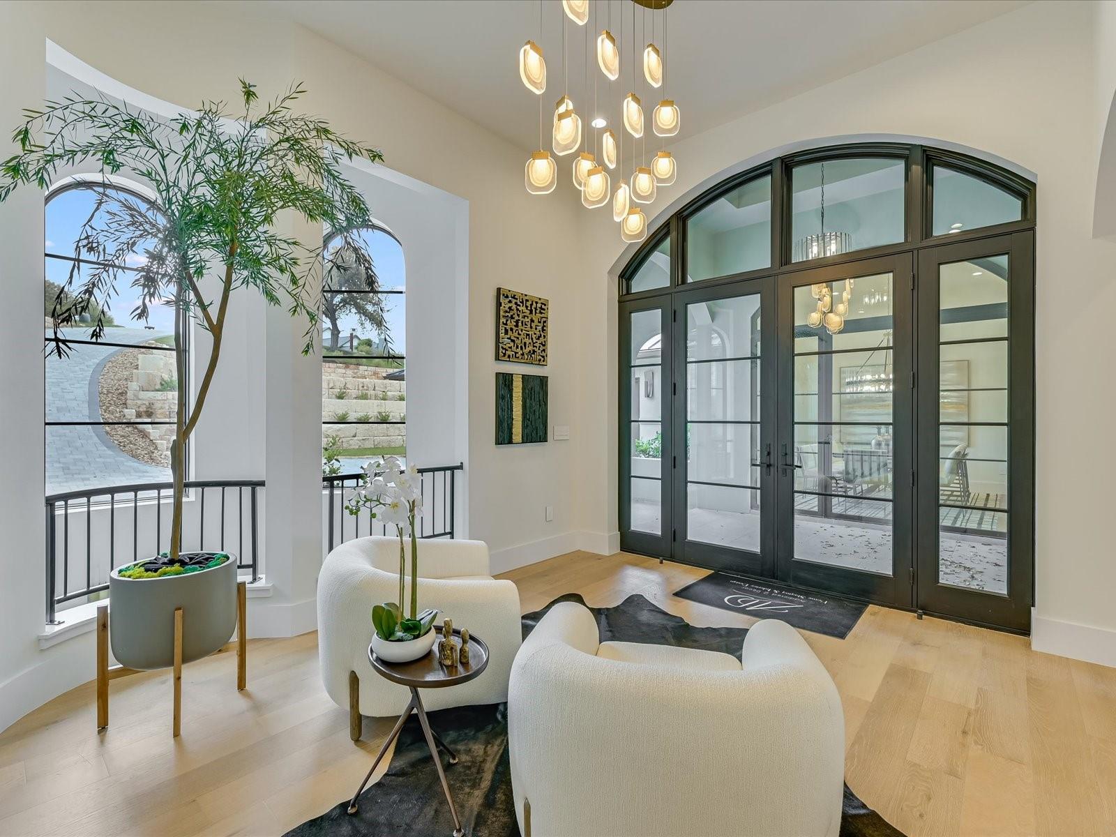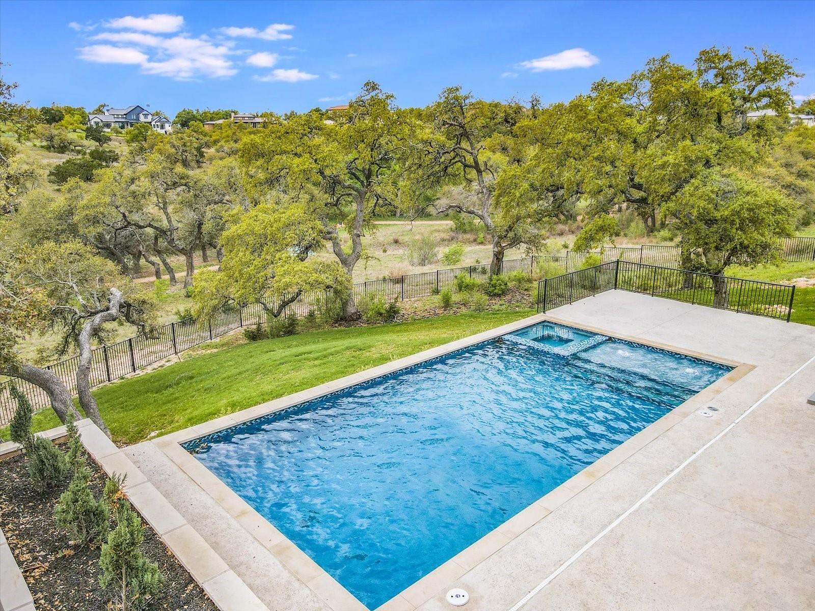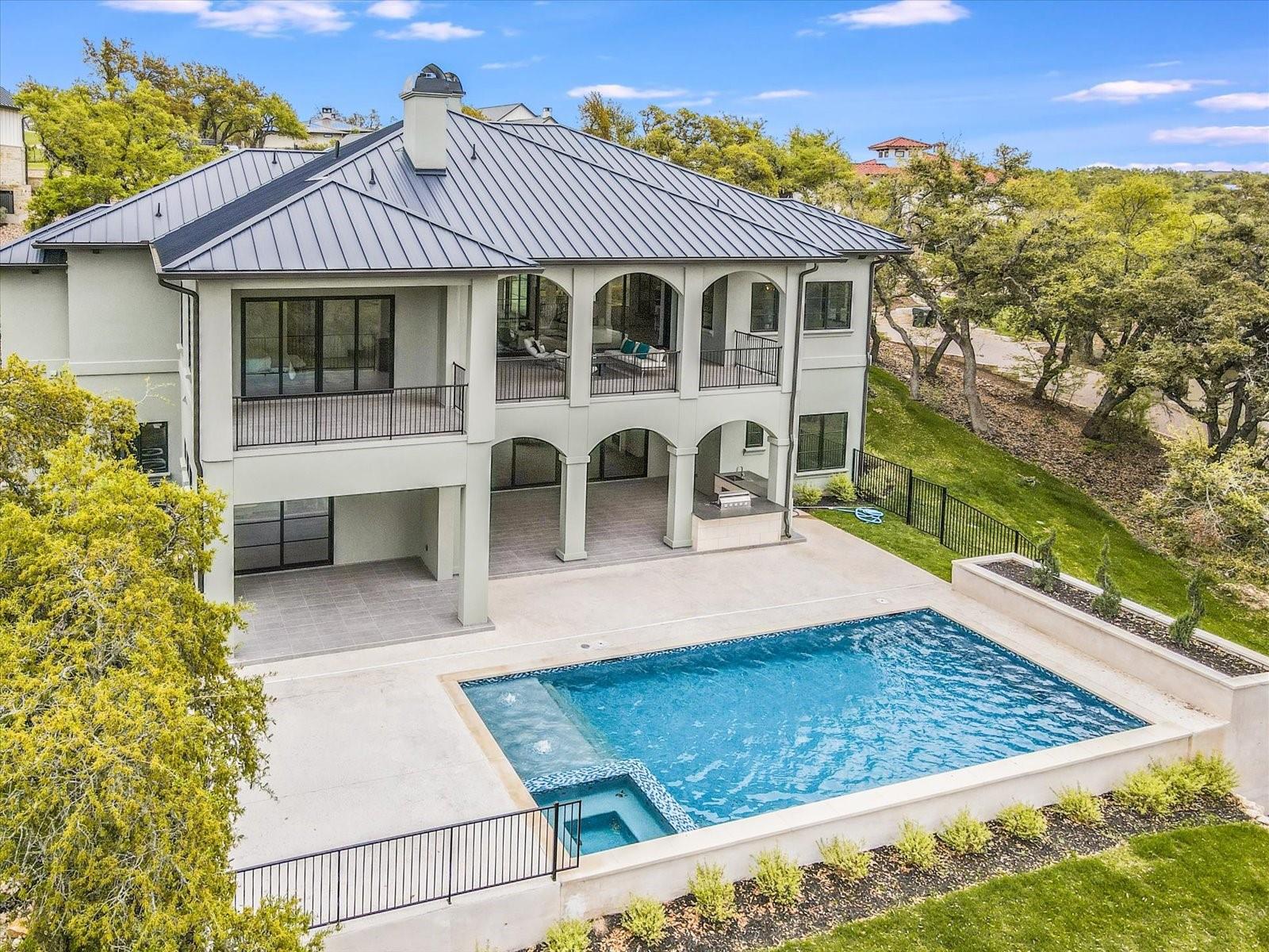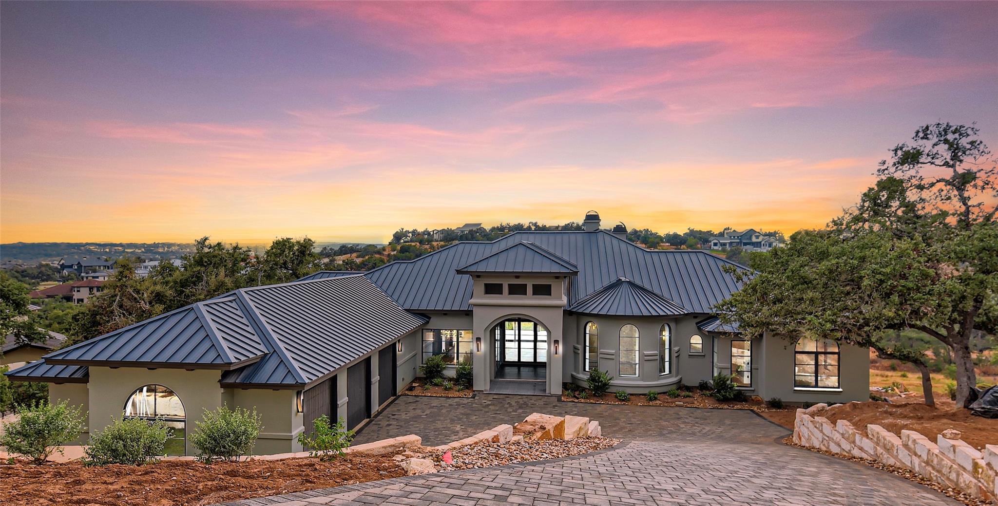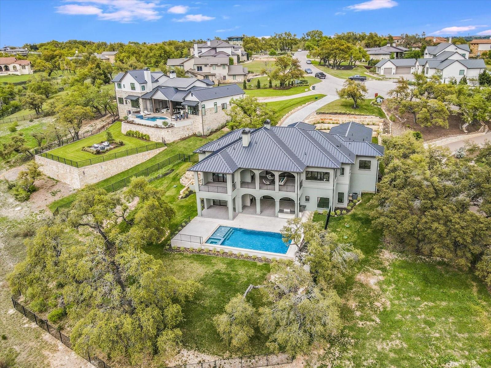 Tucked away in the gated, sought after community of Belvedere, this fully furnished, newly constructed sanctuary is truly a bespoke labor of love. There is no other like it! No backyard neighbors-the sweeping 1.3 acre lot extends all the way to the nature trails of an 80 acre nature preserve for utmost privacy and makes the addition of more garages and casita/pool house, or your very own small vineyard, a breeze! The ingenious reverse living floorpan maximizes the vast rolling hills VIEW! On the main level, the primary suite, guest suite, office, and living areas bask in an abundance of natural light, offering an enchanting retreat. Prepare to be awestruck as you step onto the verandah, the perfect perch to witness the dramatic sunsets. Downstairs,a world of entertainment awaits in the state-of-the-art home theater or in the expansive game room, outside the resort-style pool and hot tub grace the expansive backyard with limitless potential to create the oasis of your dreams. Positioned below street level, this home conceals its splendor, adding an extra layer of seclusion to its already private, cul-de-sac location. An addition of a driveway staircase, and additional parking pads at street level makes guest access and hosting large gatherings convenient. Prepare to be captivated by the soaring 12-20 foot ceilings throughout, intricate ceiling treatments, and dramatic arches that adorn this exquisite residence. An elevator shaft, wine cellar, superior Dacor appliances, premium glass doors & windows, waterfall Quartz island, 3 inch mitered counters, whole-house custom solid core doors, solid metal hardware, custom frameless European cabinets, and designer lights & fixtures further elevate this haven. Enjoy hiking trails, natural pools, a medley of nearby wineries and distilleries, only 30 min to central Austin, 20 min to the waters edge of Lake Travis,10 min to The Galleria’s vibrant shops, eateries, & entertainment. Enjoy the best of Austin at this address!