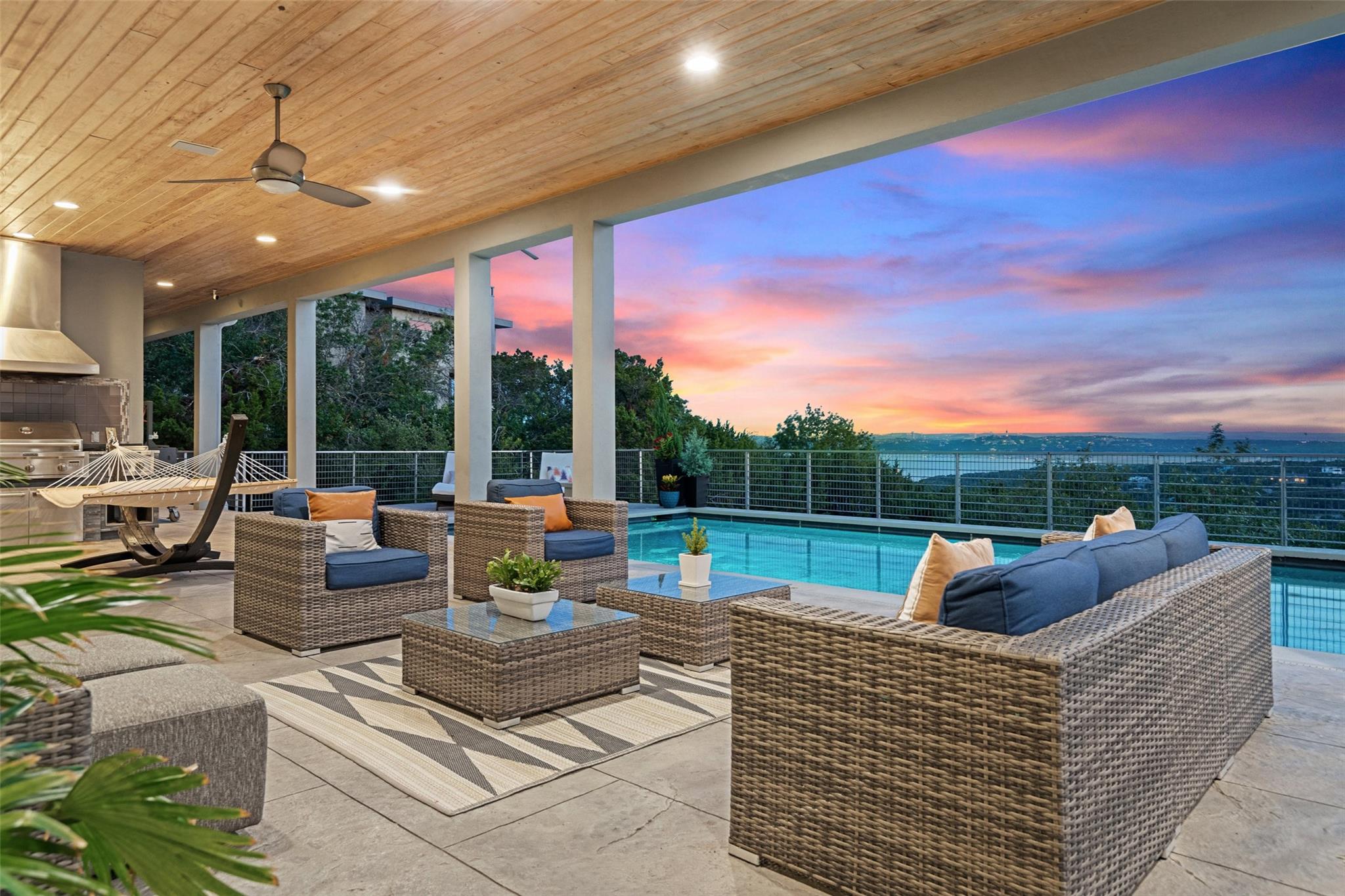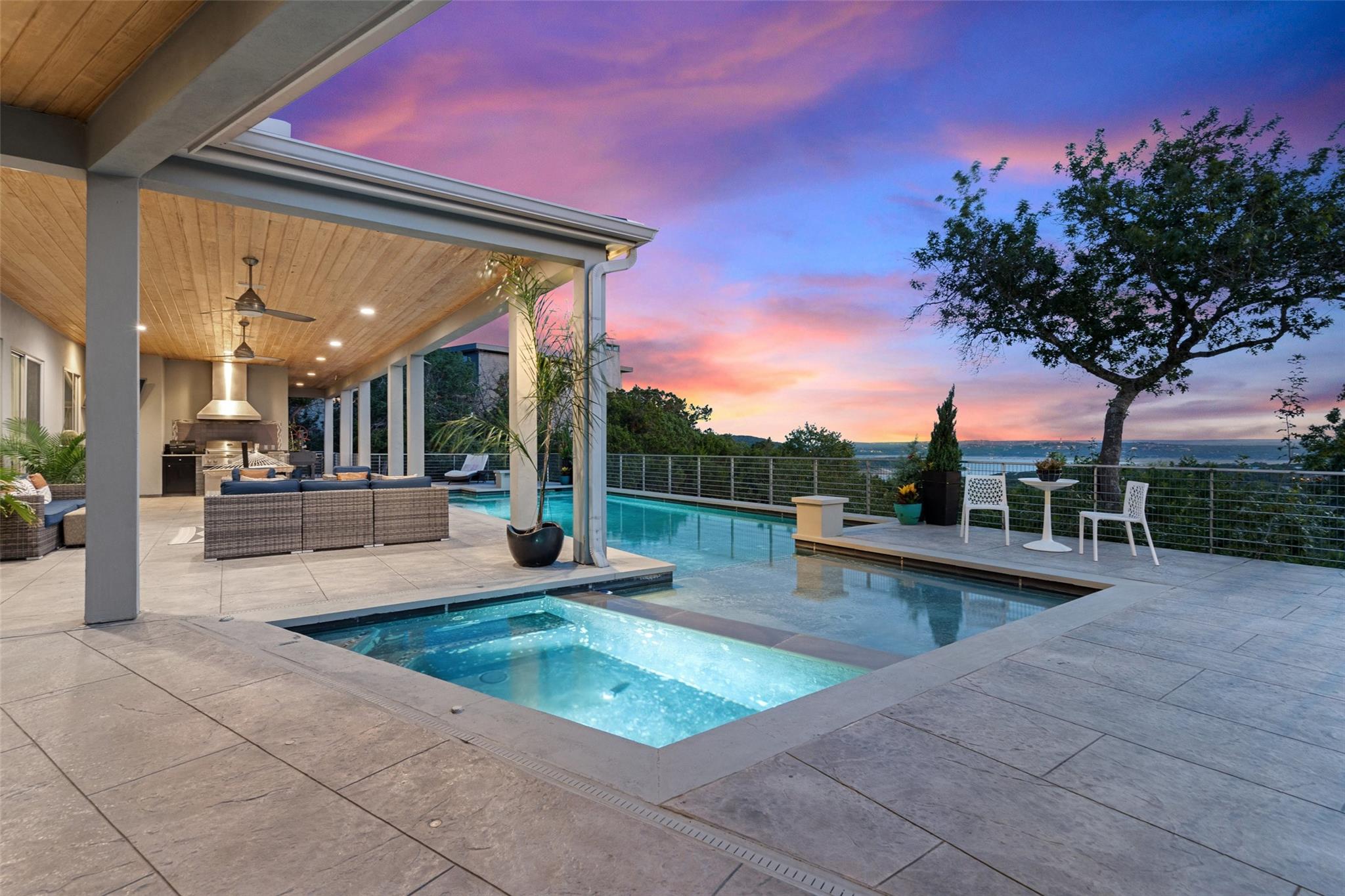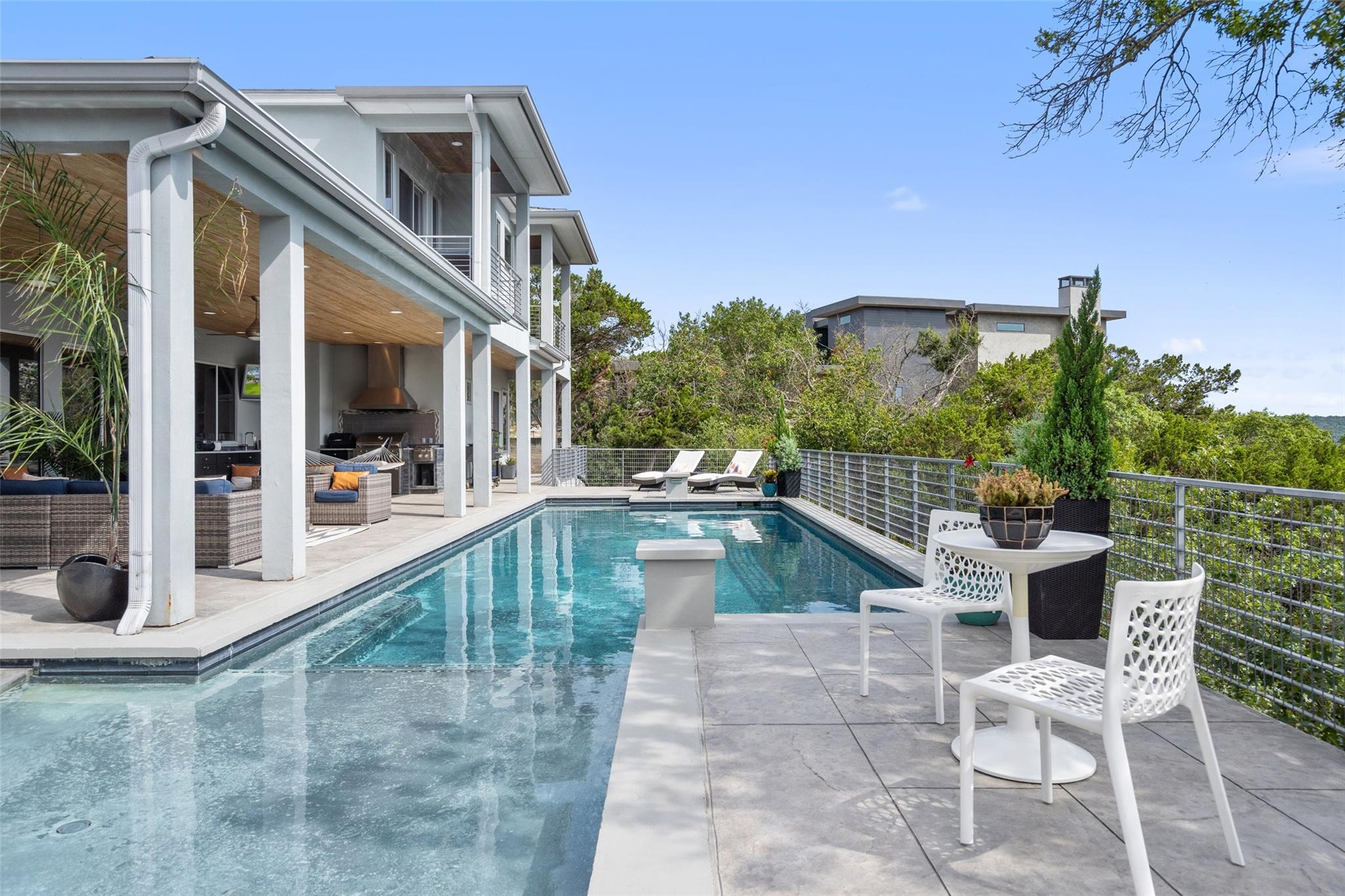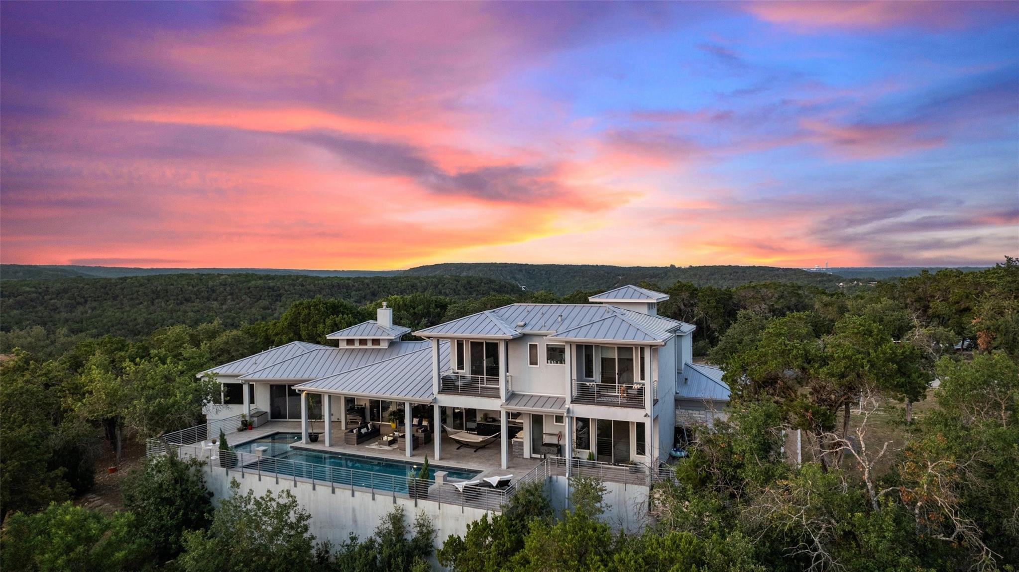 Welcome to this magnificent luxury home perched atop a serene hill, providing breathtaking panoramic views of lake Travis that sprawls across the horizon. Nestled within a private gated community, this residence offers an unparalleled level of exclusivity, privacy, and security on a 2-acre lot that backs to the LCRA reservation. Upon entering the elegant estate, you are greeted by high ceilings and expansive windows throughout that showcase the captivating lake views. The gourmet kitchen is a culinary enthusiast's dream, fitted with top-of-the-line appliances, custom cabinetry, and a large center island, making it a delightful space for both preparing meals and entertaining guests. The master suite is a tranquil oasis offering a private retreat from the world with its own access to the pool area and romantic lake views. The en-suite bathroom exudes sophistication, featuring a spa-like soaking tub, a walk-in shower, and dual vanities. The outdoor area is a testament to refined leisure, featuring a gorgeous pool and spa, wired surround sound, and lovely outdoor firepit patio area. A spacious outdoor kitchen and entertaining area make al fresco entertaining a pleasure, as you and your guests relish the fresh air and stunning vistas. As a part of an exemplary school district, families can rest assured that their children will receive an outstanding education, adding to the desirability of this exceptional location. Includes a neighborhood tennis court, sport court, and private walking trails. Only 2 minutes from the Riviera Marina and 5 minutes from the VIP Marina. This luxury home represents the epitome of refined living, offering an unmatched blend of elegance, tranquility, and natural beauty. It is a rare opportunity to experience a lifestyle of prestige and comfort in one of the most coveted locations imaginable.