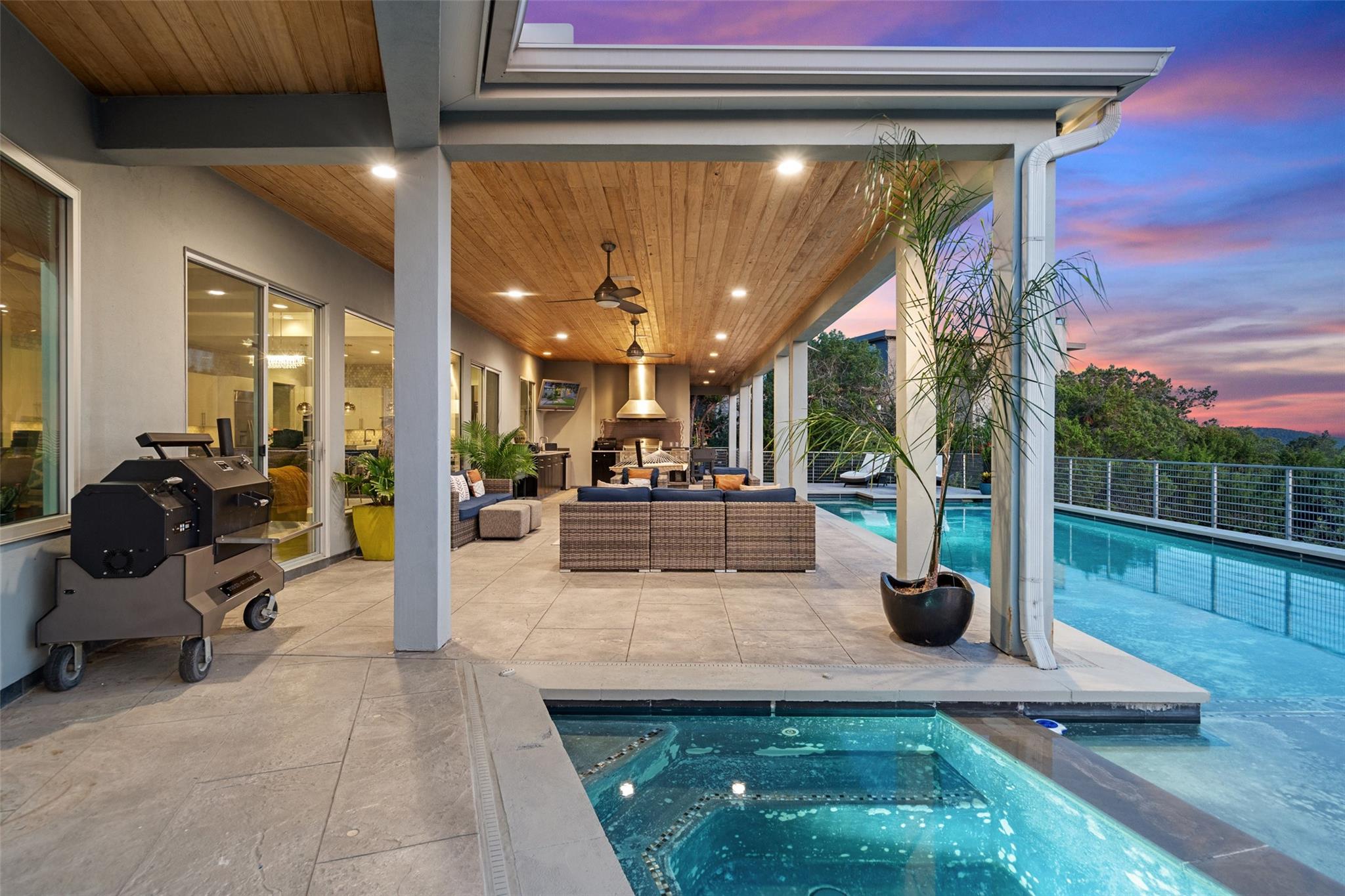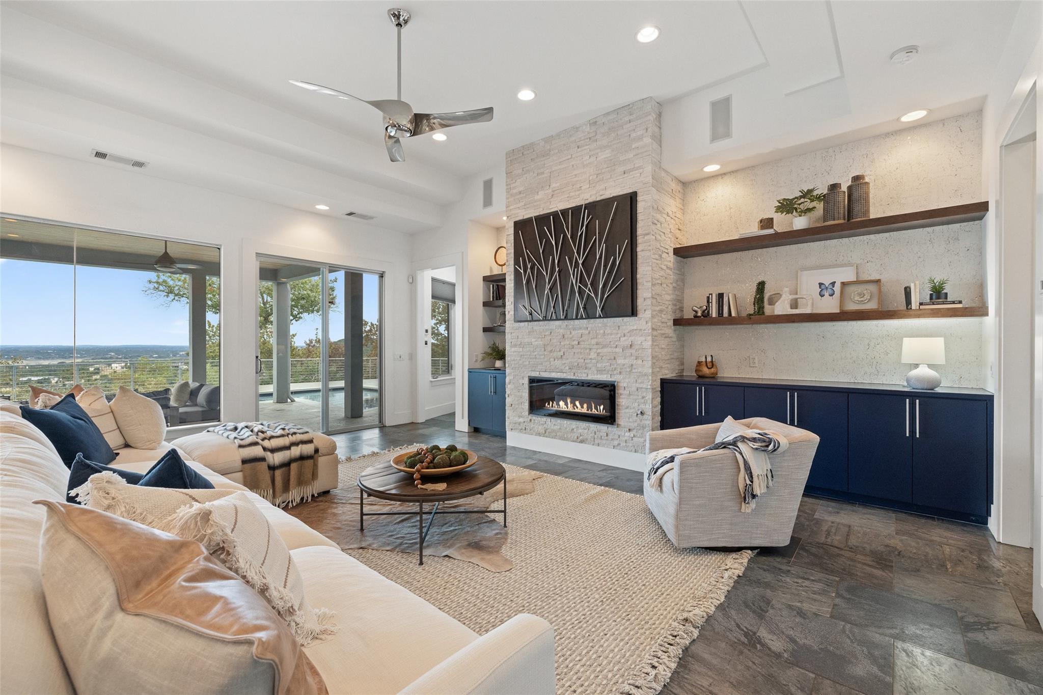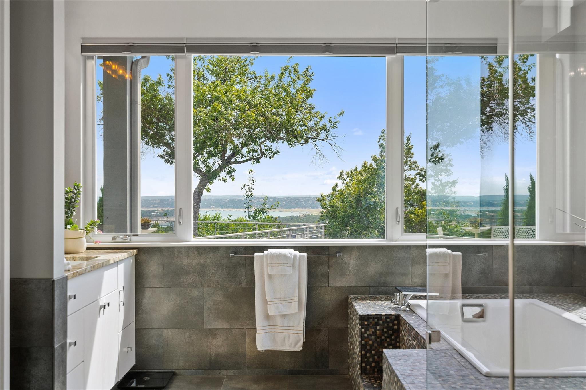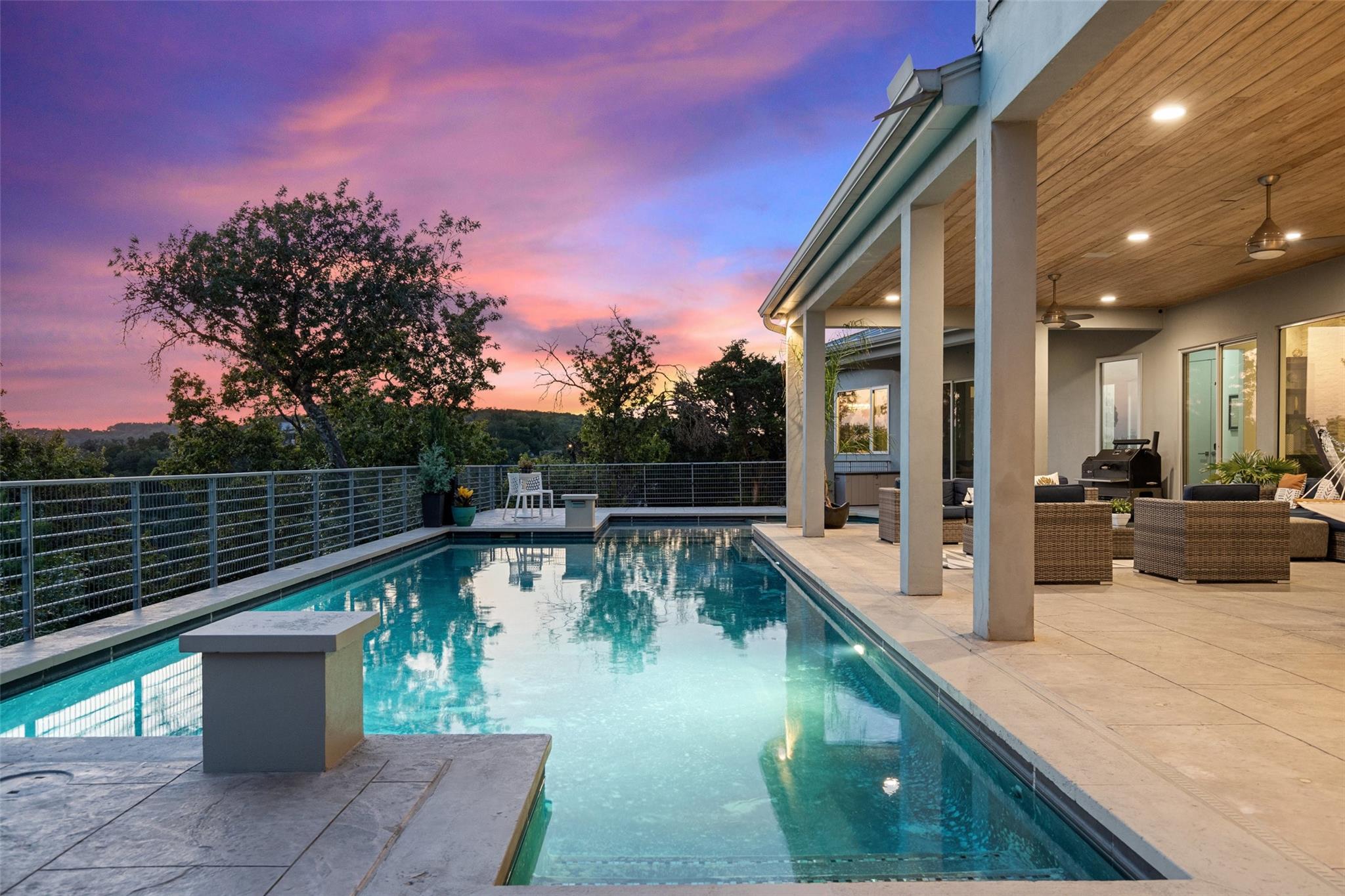 Welcome to this magnificent luxury home perched atop a serene hill, providing breathtaking panoramic views of lake Travis that sprawls across the horizon. Nestled within a private gated community, this residence offers an unparalleled level of exclusivity, privacy, and security on a 2-acre lot that backs to the LCRA reservation. Upon entering the elegant estate, you are greeted by high ceilings and expansive windows throughout that showcase the captivating lake views. The gourmet kitchen is a culinary enthusiast's dream, fitted with top-of-the-line appliances, custom cabinetry, and a large center island, making it a delightful space for both preparing meals and entertaining guests. The master suite is a tranquil oasis offering a private retreat from the world with its own access to the pool area and romantic lake views. The en-suite bathroom exudes sophistication, featuring a spa-like soaking tub, a walk-in shower, and dual vanities. The outdoor area is a testament to refined leisure, featuring a gorgeous pool and spa, wired surround sound, and lovely outdoor firepit patio area. A spacious outdoor kitchen and entertaining area make al fresco entertaining a pleasure, as you and your guests relish the fresh air and stunning vistas. As a part of an exemplary school district, families can rest assured that their children will receive an outstanding education, adding to the desirability of this exceptional location. Includes a neighborhood tennis court, sport court, and private walking trails. Only 2 minutes from the Riviera Marina and 5 minutes from the VIP Marina. This luxury home represents the epitome of refined living, offering an unmatched blend of elegance, tranquility, and natural beauty. It is a rare opportunity to experience a lifestyle of prestige and comfort in one of the most coveted locations imaginable.