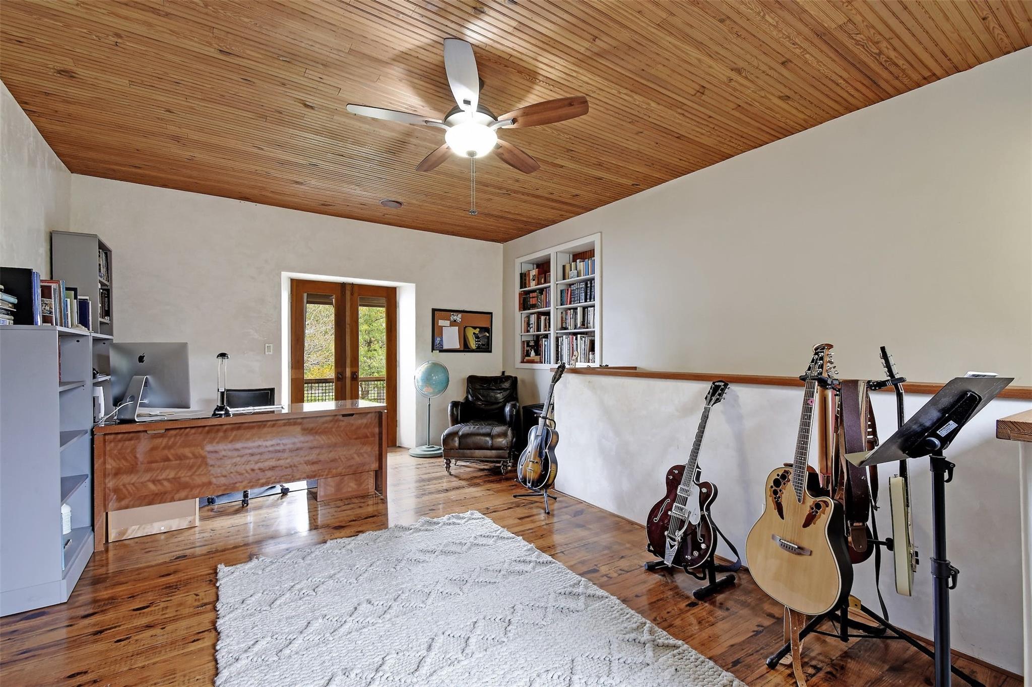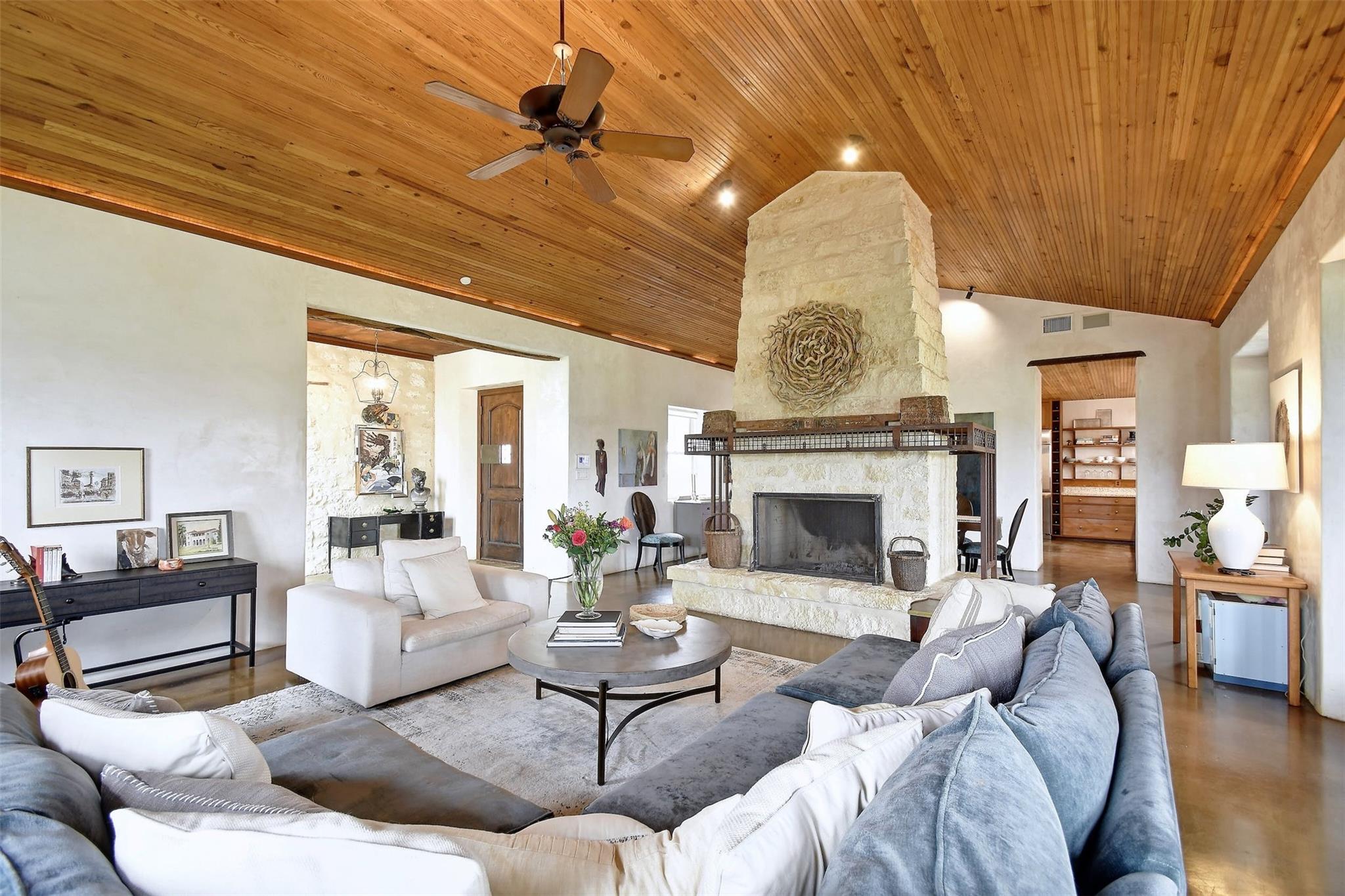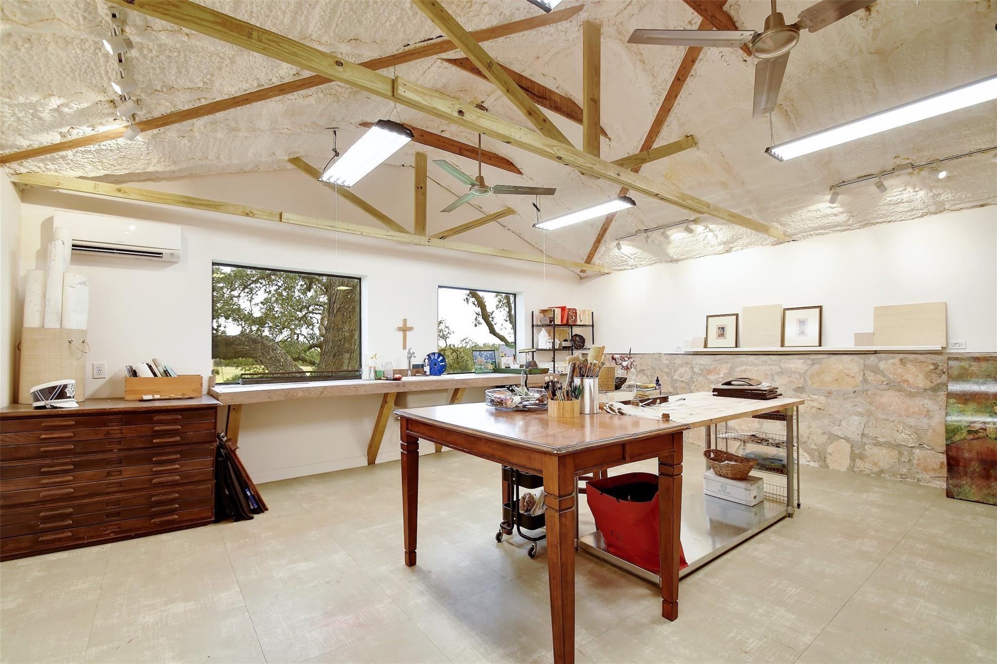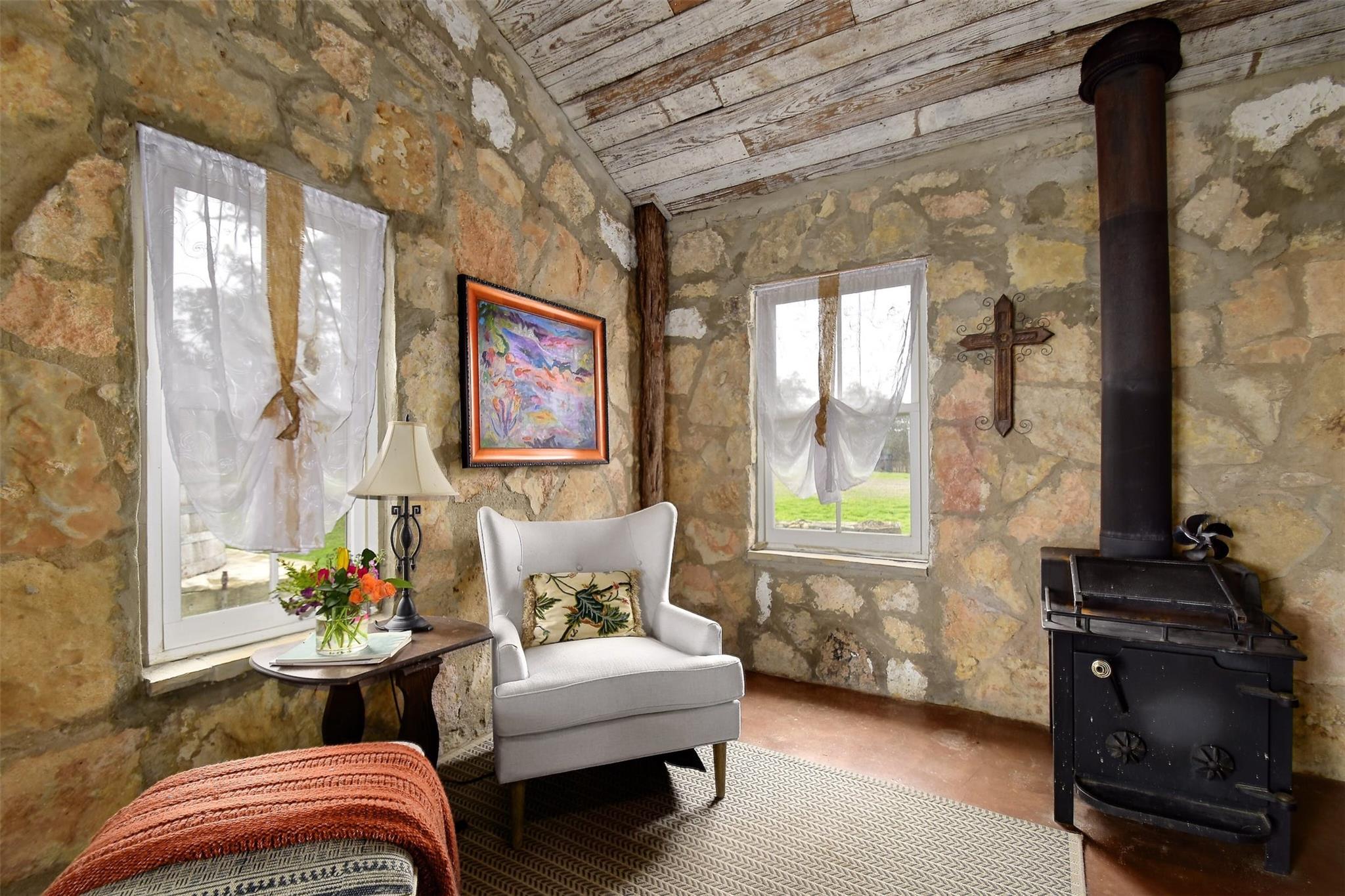 Discover your exclusive Hill Country oasis on 25.729 acres, a haven of luxury and tranquility. This extraordinary estate comprises four meticulously crafted houses, each with its unique charm, set against the backdrop of rolling hills. The historic main home, dating back to the 1800s, has been thoughtfully renovated. Its chef's kitchen is a culinary masterpiece, complemented by two living areas with stone fireplaces. The primary ensuite is a retreat with walk-in closets, a spa-like bathroom, a walk-in shower, and a clawfoot tub. The dream aesthetic captures the essence of Hill Country living. Connected by a breezeway, the guest quarters feature two bedrooms, two bathrooms, a galley kitchen, and a stone fireplace. The party barn house offers one bedroom, one bathroom, and an open floor plan. A recording studio/bonus house with a full bathroom caters to creative pursuits. Above the animal stables, the light-filled art studio inspires creativity. Animal lovers will appreciate the well-appointed stables, while the cowboy house, a one-bedroom studio with a kitchenette and clawfoot tub bathroom, completes the estate. Step outside to a pool and pavilion, a private retreat for relaxation. This Hill Country estate, with over $500,000 in improvements, invites you to savor serenity, revel in luxury, and create cherished memories. Your dream ranch awaits – welcome home.