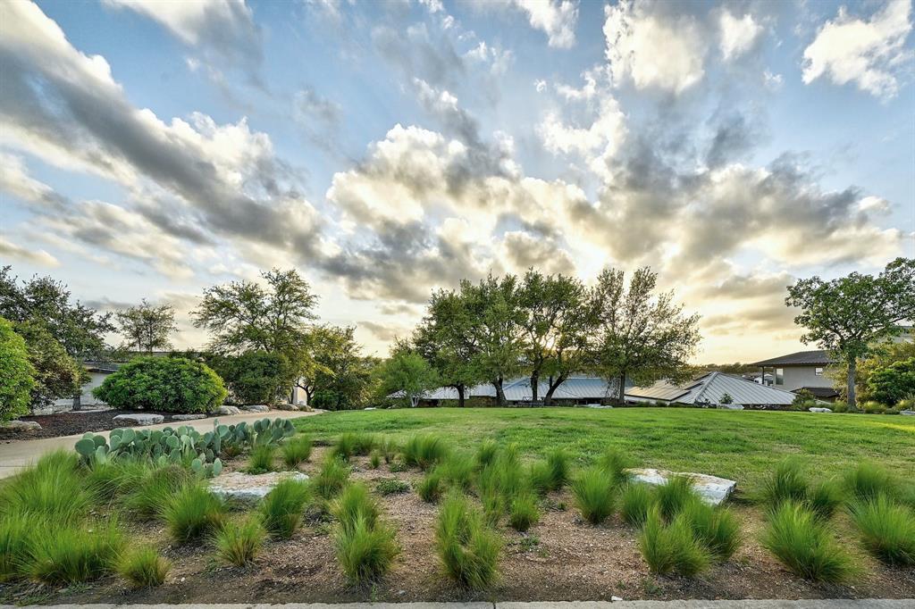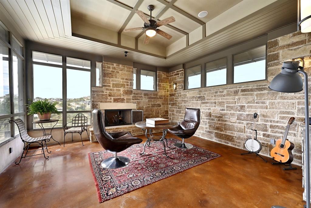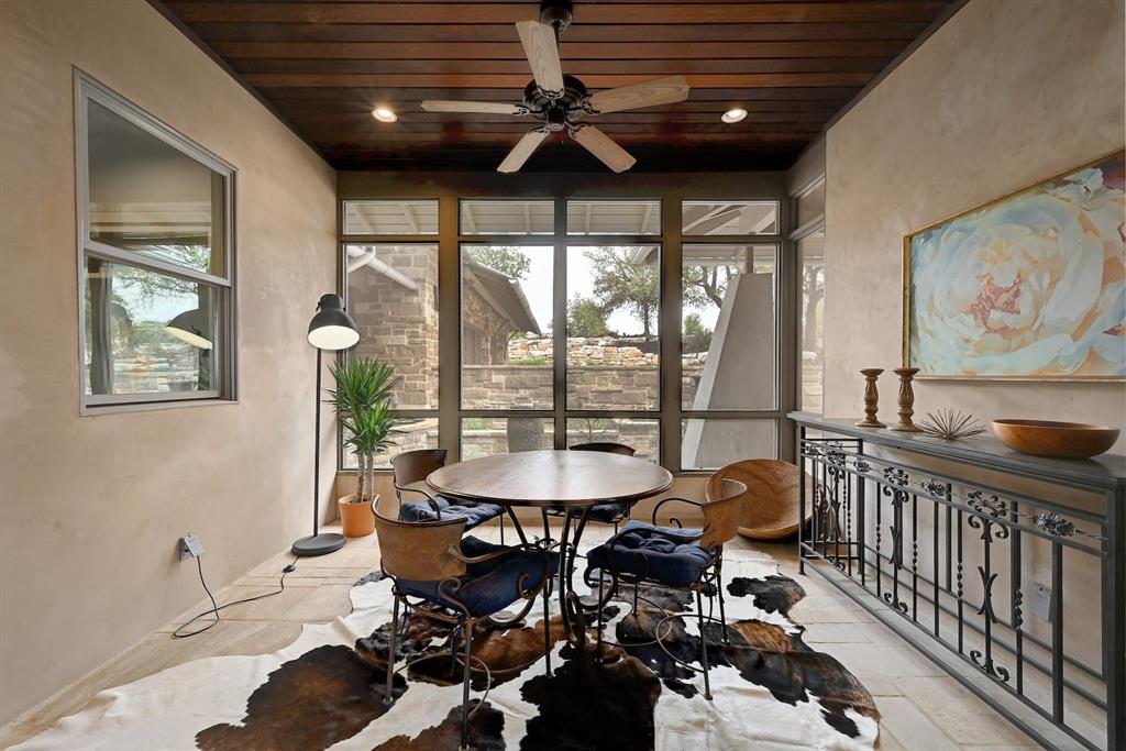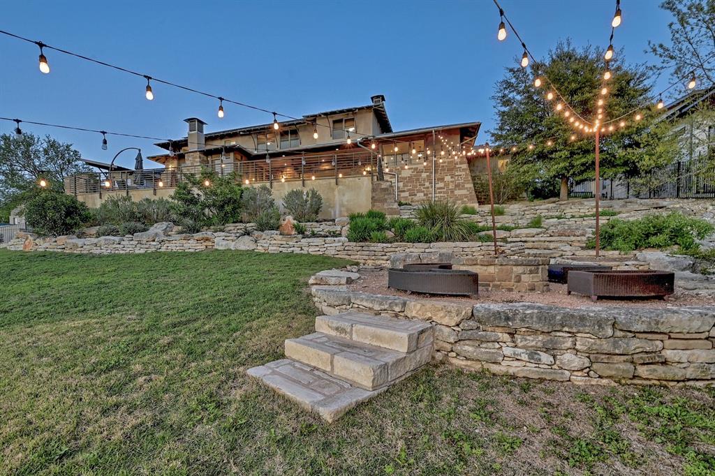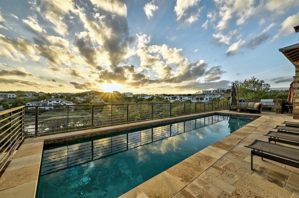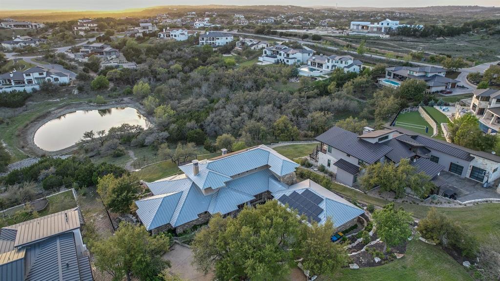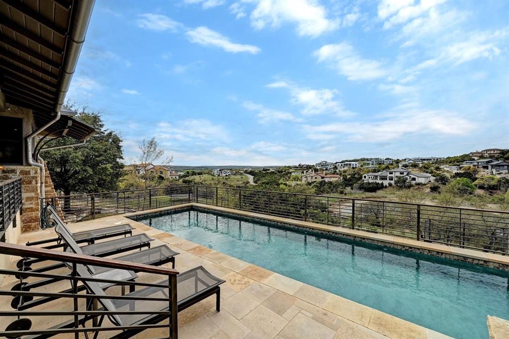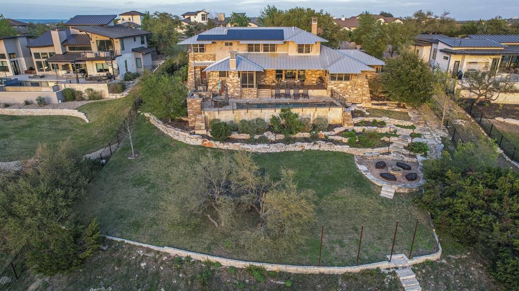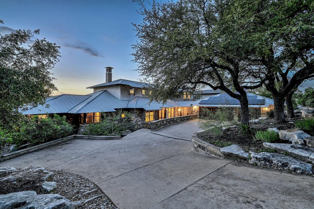 High performance architecture. Perfectly perched on a bluff to maximize privacy and dramatic Hill Country views, this luxurious Spanish Oaks home sits on just over an acre. Designed by Barley & Pfeiffer, with brag-worthy energy efficient elements including a 10kW photovoltaic solar panel system and a metal roof with deep overhangs to shade from direct sun. 4500+sf custom home: 5 bedrooms + office + 5 baths. The modern, open living area, complete with stone fireplace and new hardwood floors, boasts inspiring views and is flanked by two screened porches (one with additional fireplace) creating intimate places to gather. The large covered porch and pool deck on the rear of the home are a spectacular place to entertain. Plus a fire pit and flat green yard. Owner's suite on the main floor is separate from the guest room and office and features a roomy bath (with space for a Peloton) and a large walk in closet. Upstairs you'll find a second living area and 3 more bedrooms along with 2 full baths. Don't miss the 1200+ bottle climate controlled wine cellar. Detached oversized 3 car garage. Current owners installed new HVAC and water heater. Electrical and plumbing have also been updated. Spanish Oaks Lifestyle: 24 hour gated security, resort style pool pavilion, sports courts, fish camp, and 1 of the top private golf courses in Texas surrounded by great architecture in a dramatic hill country setting.