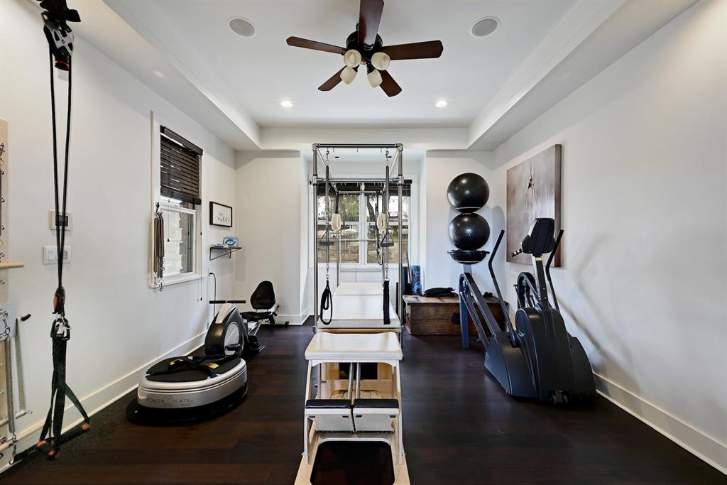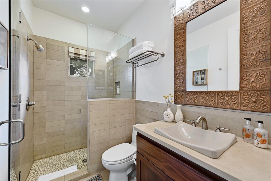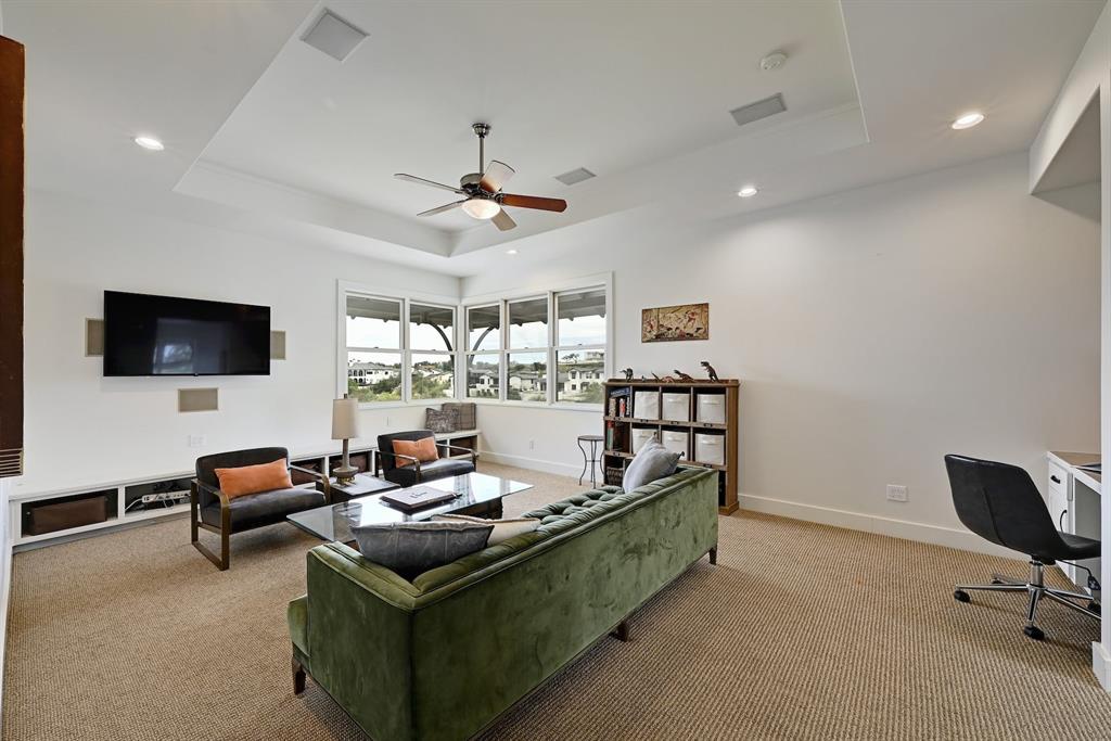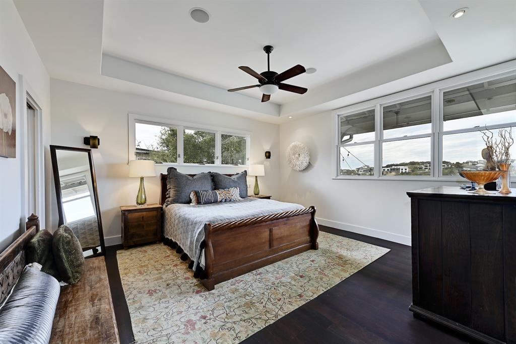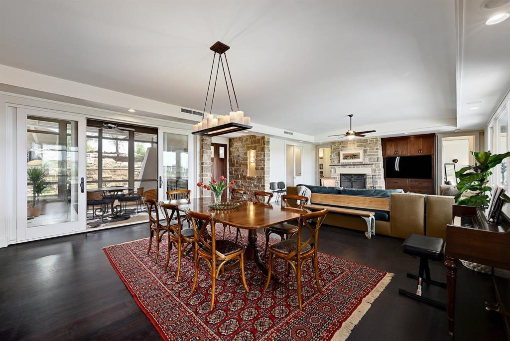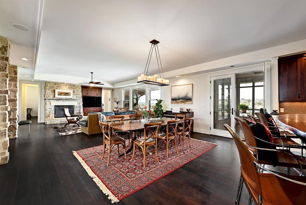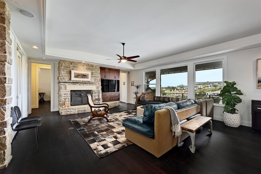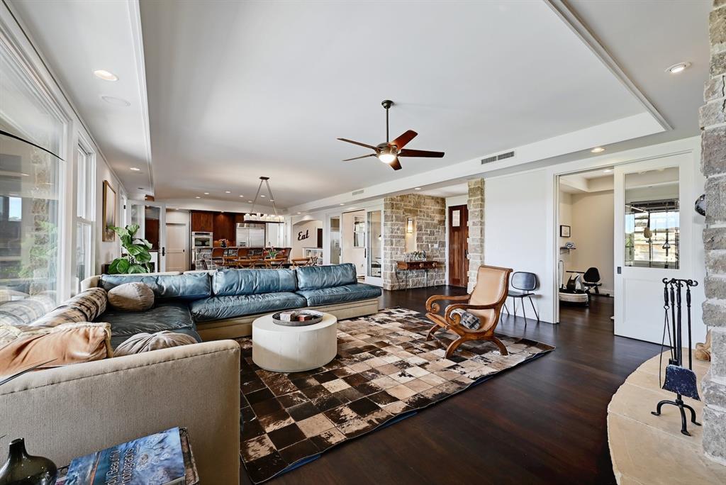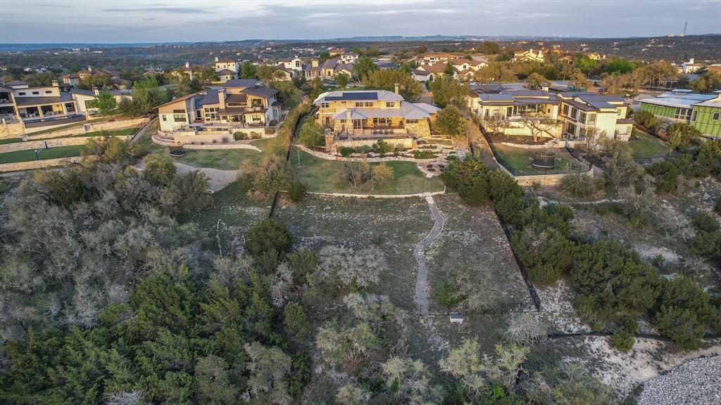 High performance architecture. Perfectly perched on a bluff to maximize privacy and dramatic Hill Country views, this luxurious Spanish Oaks home sits on just over an acre. Designed by Barley & Pfeiffer, with brag-worthy energy efficient elements including a 10kW photovoltaic solar panel system and a metal roof with deep overhangs to shade from direct sun. 4500+sf custom home: 5 bedrooms + office + 5 baths. The modern, open living area, complete with stone fireplace and new hardwood floors, boasts inspiring views and is flanked by two screened porches (one with additional fireplace) creating intimate places to gather. The large covered porch and pool deck on the rear of the home are a spectacular place to entertain. Plus a fire pit and flat green yard. Owner's suite on the main floor is separate from the guest room and office and features a roomy bath (with space for a Peloton) and a large walk in closet. Upstairs you'll find a second living area and 3 more bedrooms along with 2 full baths. Don't miss the 1200+ bottle climate controlled wine cellar. Detached oversized 3 car garage. Current owners installed new HVAC and water heater. Electrical and plumbing have also been updated. Spanish Oaks Lifestyle: 24 hour gated security, resort style pool pavilion, sports courts, fish camp, and 1 of the top private golf courses in Texas surrounded by great architecture in a dramatic hill country setting.