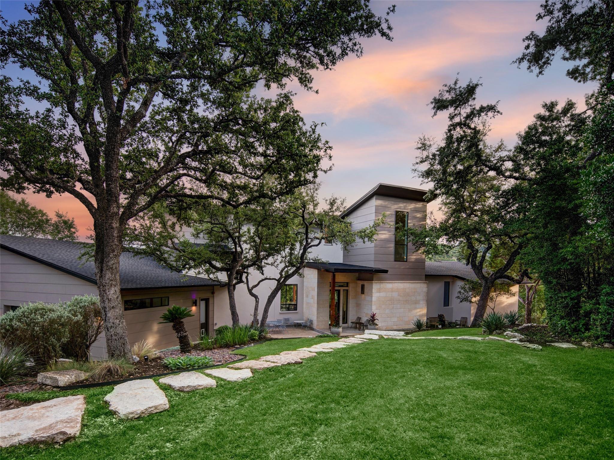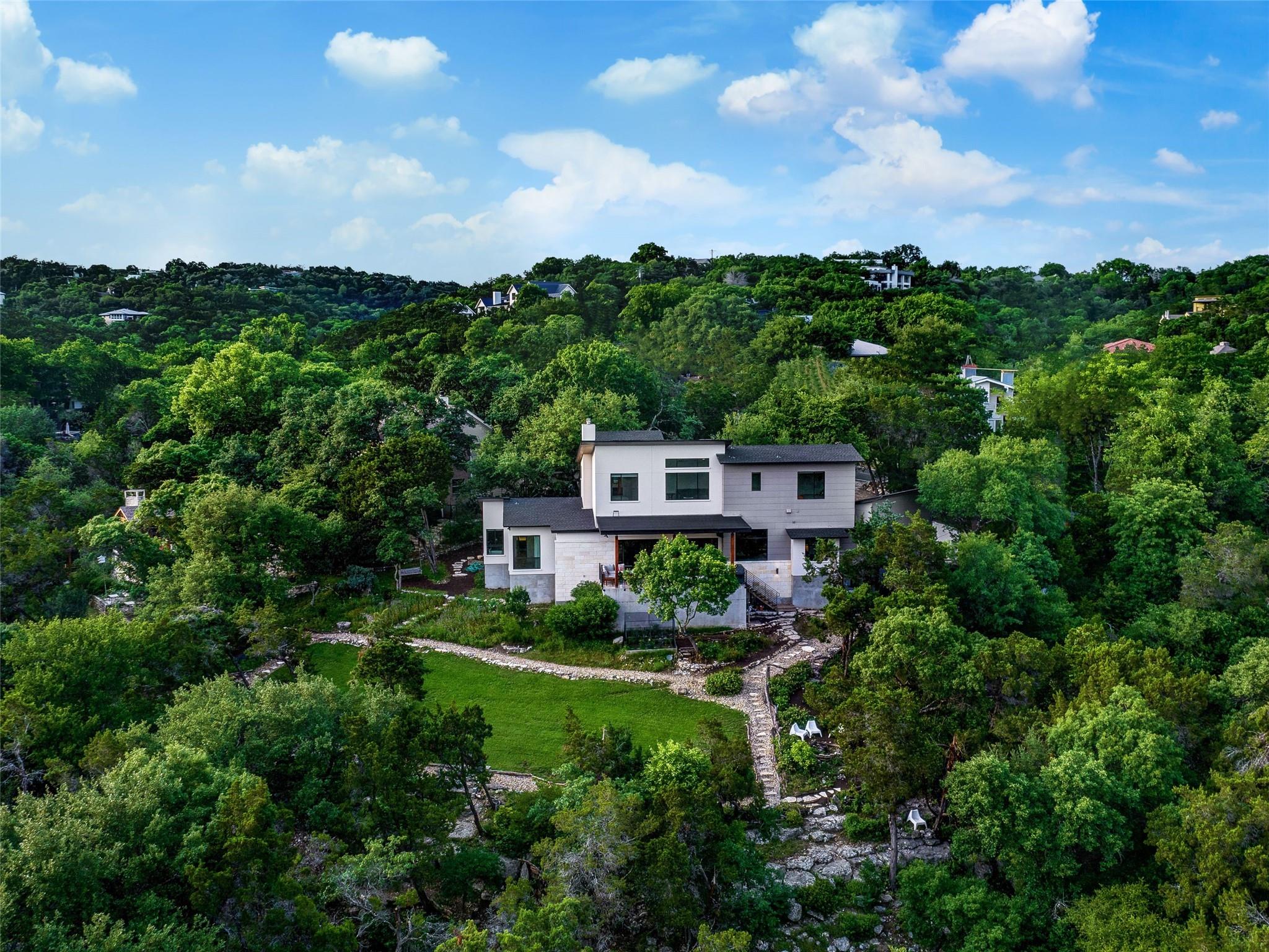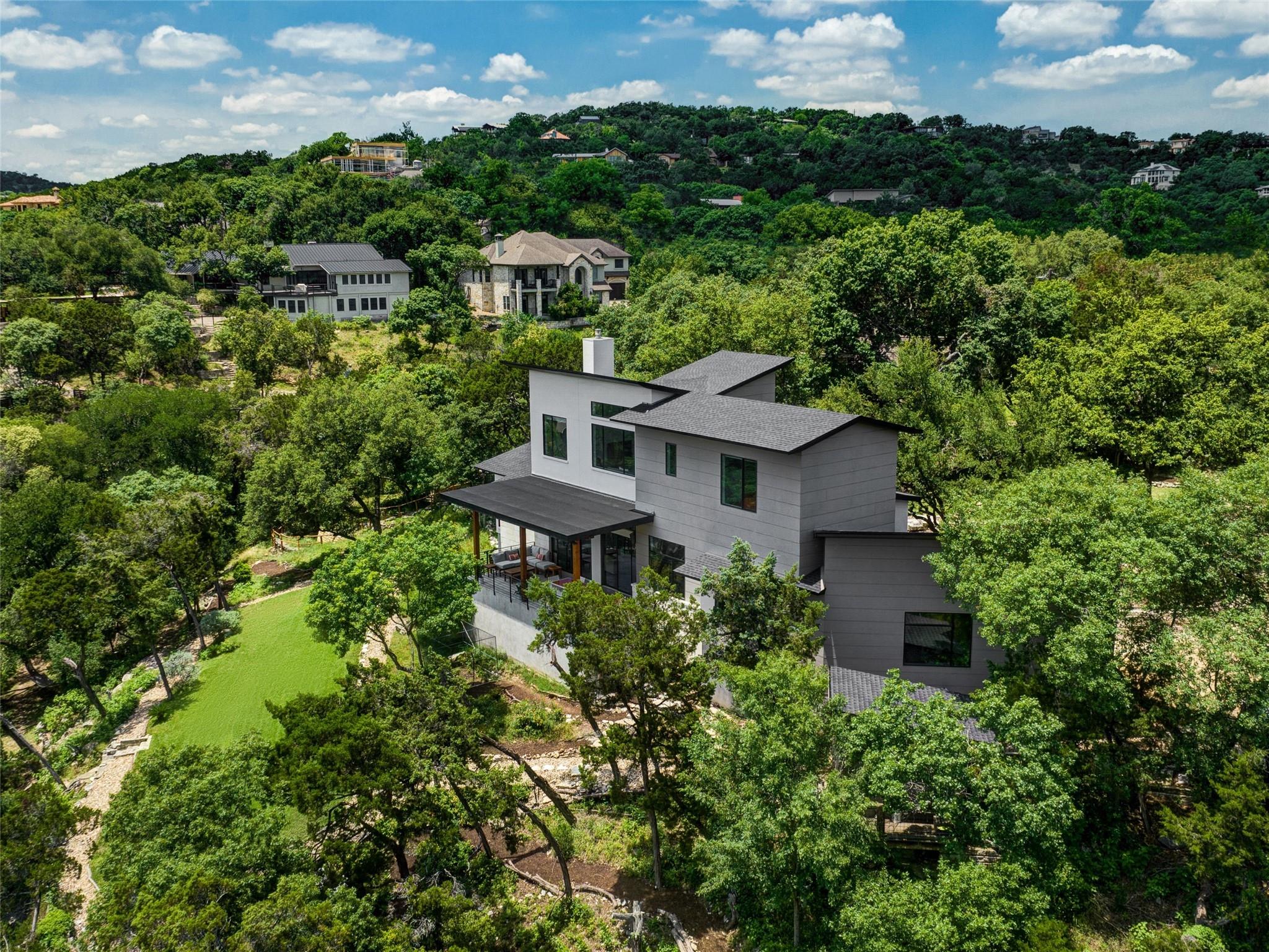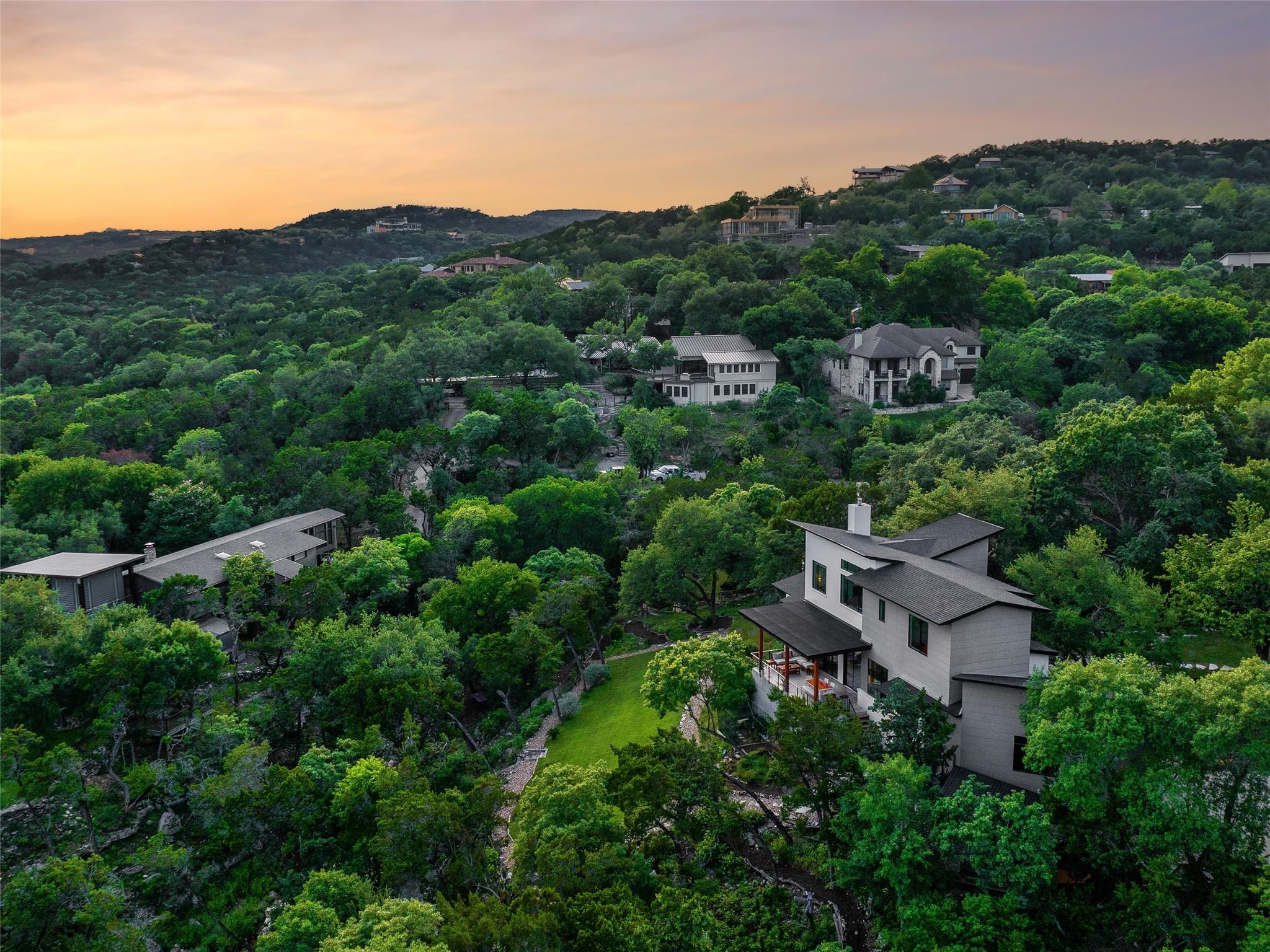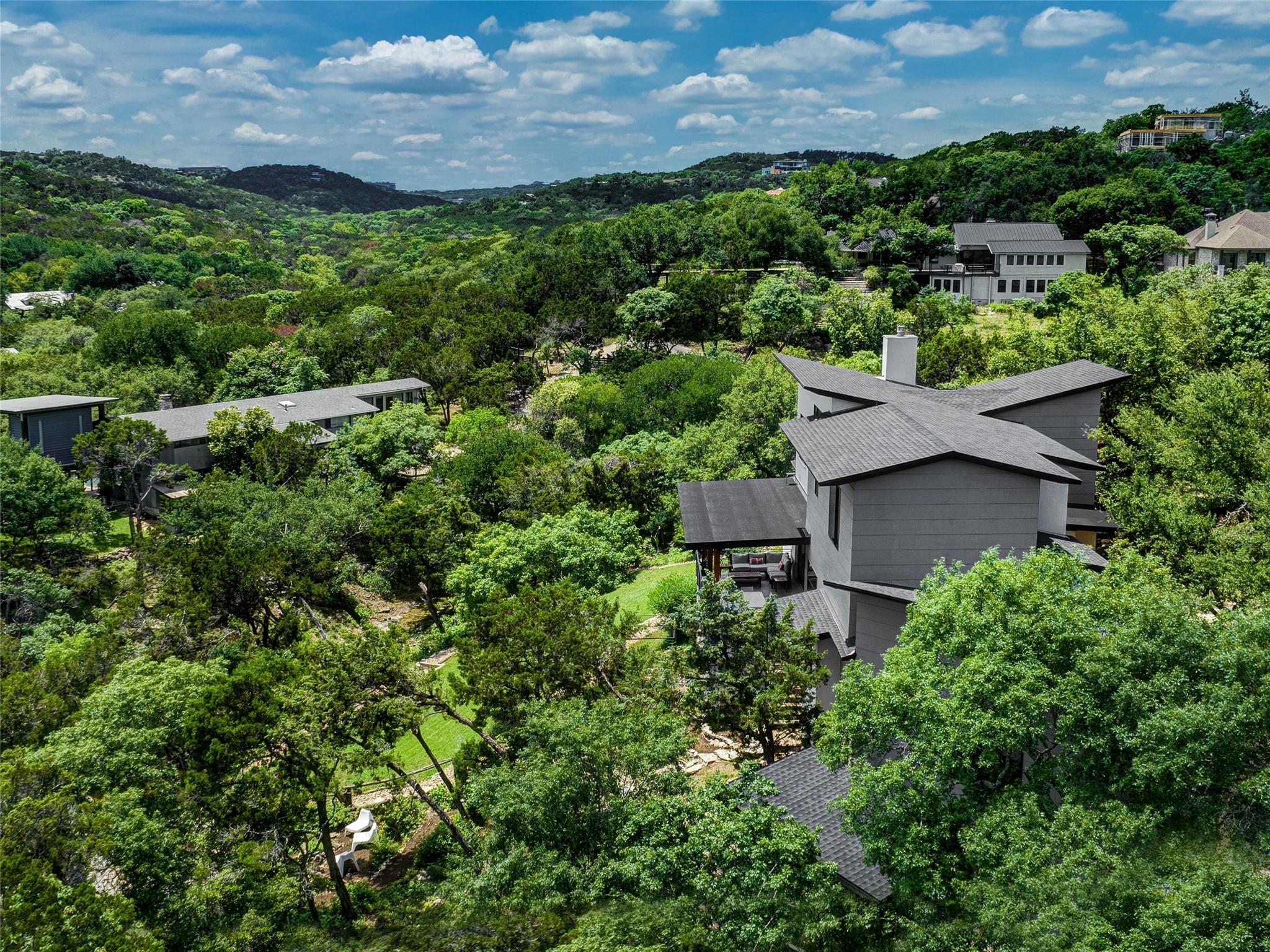 Nestled amidst nature's beauty, this unique home offers an exceptional living experience. Perched on a hillside, it provides breathtaking views of canyons and the expansive hill country. The tranquil surroundings feature the soothing sounds of nature and a flowing creek, immersing you in a serene atmosphere. The property also offers easy access to adventure with trails, swimming holes, and abundant wildlife. Despite its proximity to Downtown Austin, the home provides a secluded oasis. Inside, the warm and modern design complements the natural setting. Expansive windows and 12' ceilings maximize the views, while a stone fireplace adds cozy elegance. The open concept layout connects the kitchen, dining area, and living room seamlessly. The chef's kitchen boasts a spacious island, custom cabinetry, and Caesarstone counters. The primary bedroom offers a sanctuary with stunning vistas, and three additional bedrooms and a game room are located upstairs. The property is equipped with high-end entertainment systems and smart home features. It also offers practical benefits such as a low tax rate, few restrictions, and room for customization. This home harmoniously blends modern elegance with the tranquility of nature, creating a truly remarkable living experience. Don't miss the chance to make it your own and enjoy a daily escape into nature's embrace.