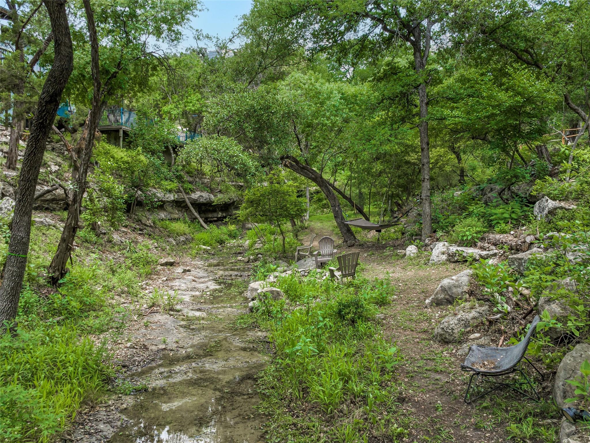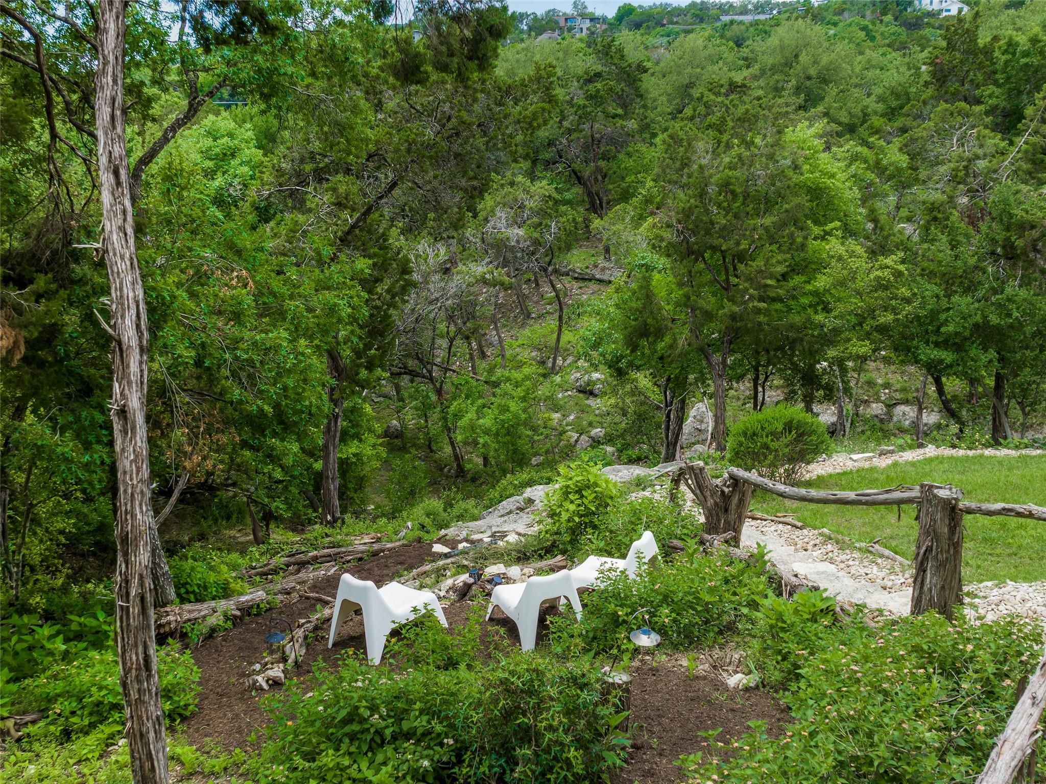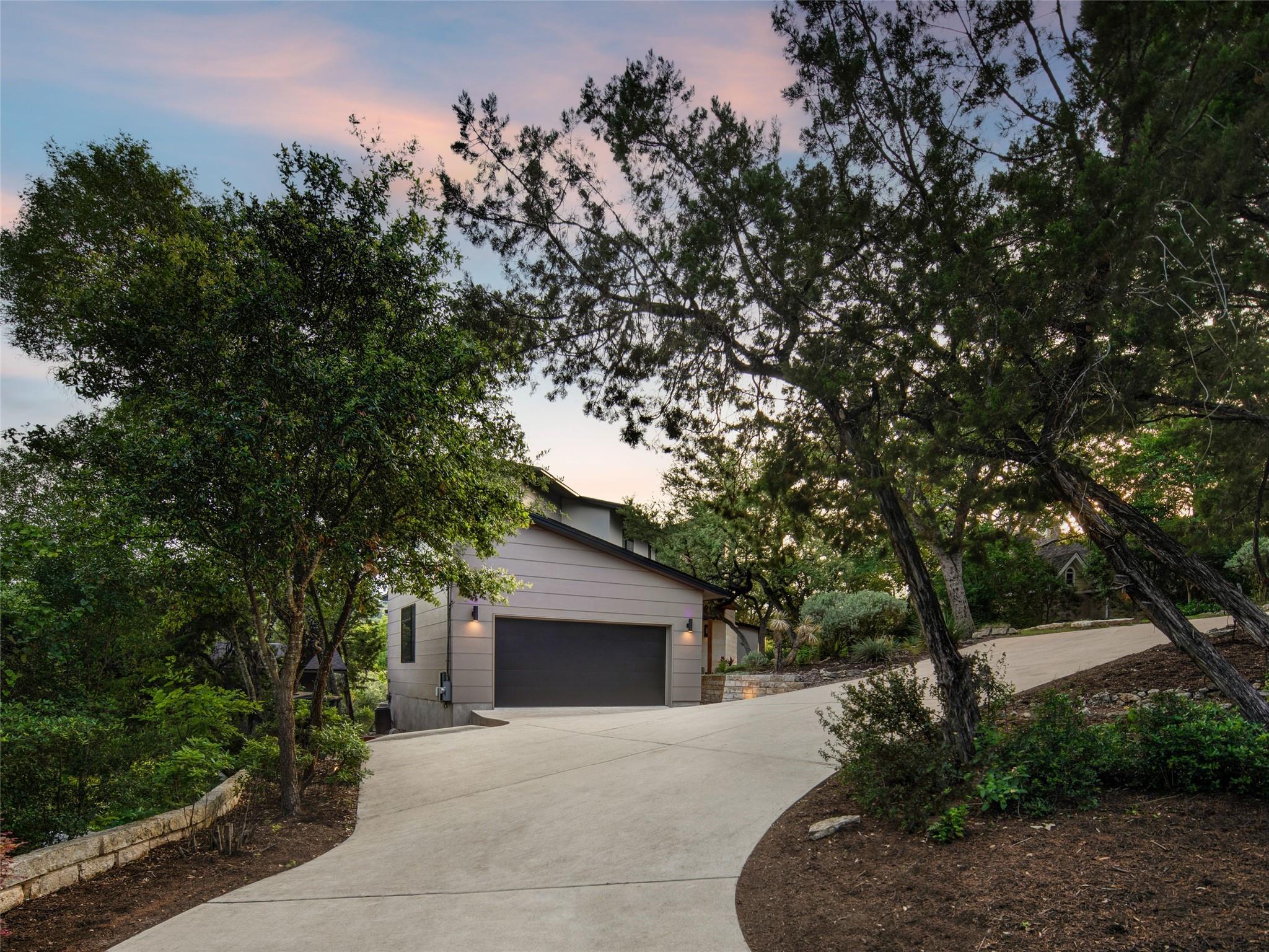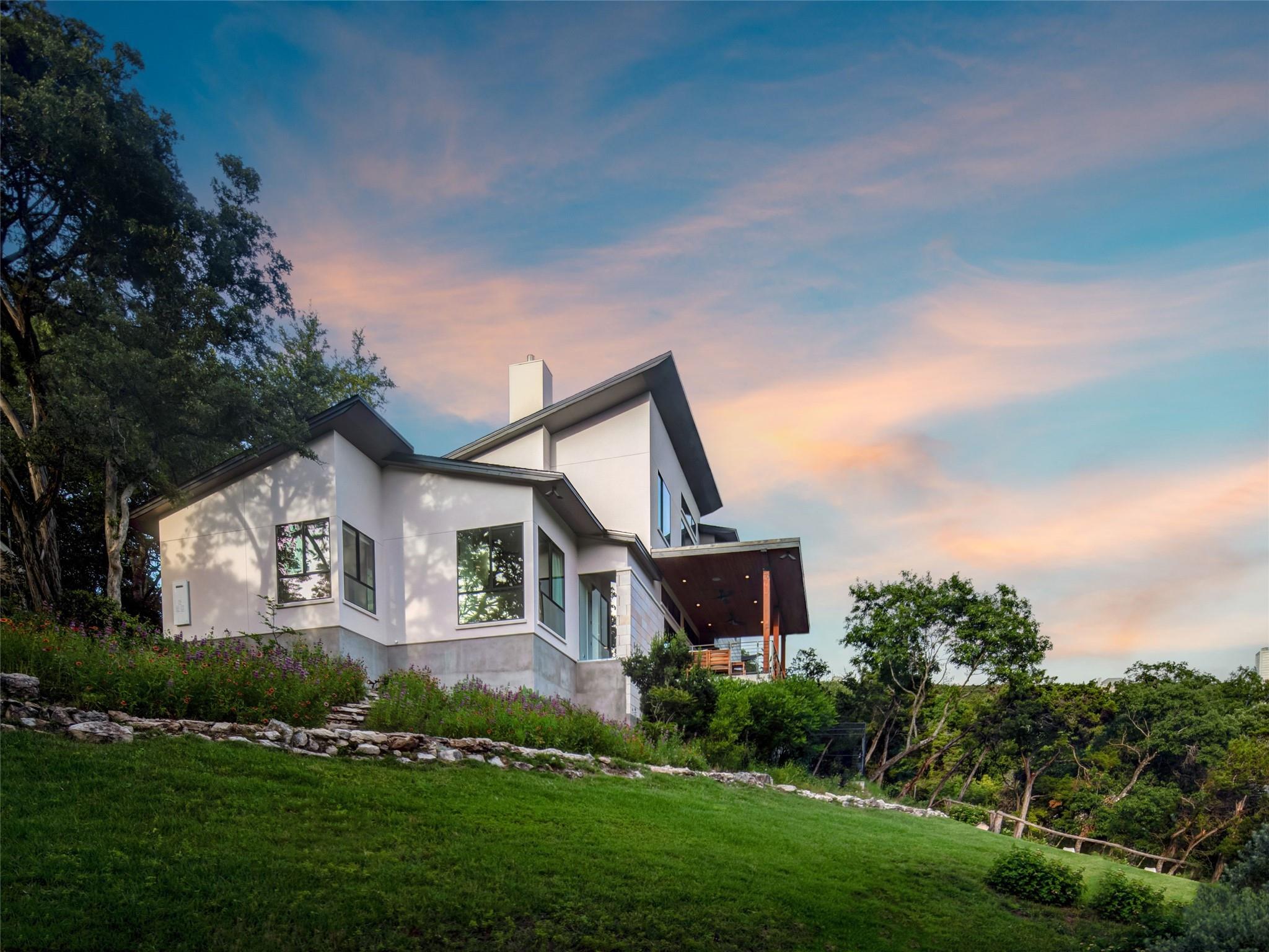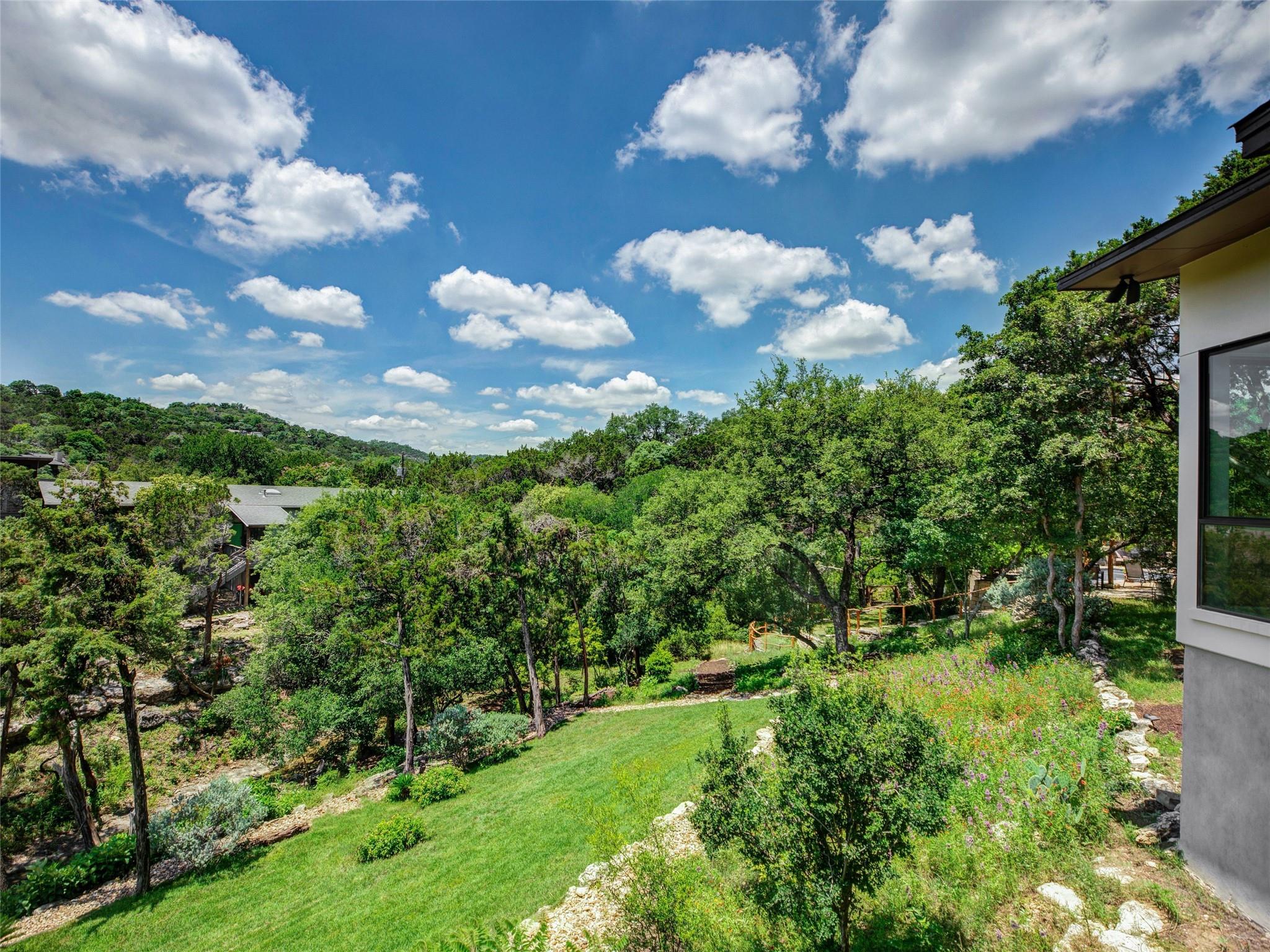 Nestled amidst nature's beauty, this unique home offers an exceptional living experience. Perched on a hillside, it provides breathtaking views of canyons and the expansive hill country. The tranquil surroundings feature the soothing sounds of nature and a flowing creek, immersing you in a serene atmosphere. The property also offers easy access to adventure with trails, swimming holes, and abundant wildlife. Despite its proximity to Downtown Austin, the home provides a secluded oasis. Inside, the warm and modern design complements the natural setting. Expansive windows and 12' ceilings maximize the views, while a stone fireplace adds cozy elegance. The open concept layout connects the kitchen, dining area, and living room seamlessly. The chef's kitchen boasts a spacious island, custom cabinetry, and Caesarstone counters. The primary bedroom offers a sanctuary with stunning vistas, and three additional bedrooms and a game room are located upstairs. The property is equipped with high-end entertainment systems and smart home features. It also offers practical benefits such as a low tax rate, few restrictions, and room for customization. This home harmoniously blends modern elegance with the tranquility of nature, creating a truly remarkable living experience. Don't miss the chance to make it your own and enjoy a daily escape into nature's embrace.