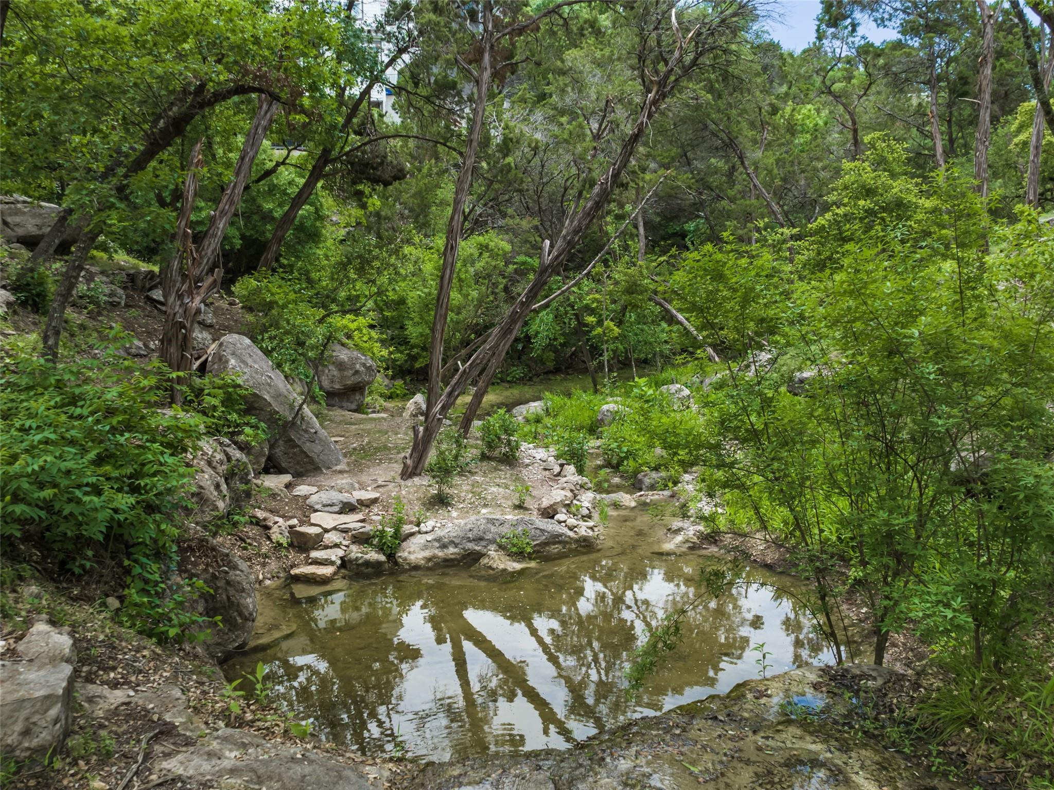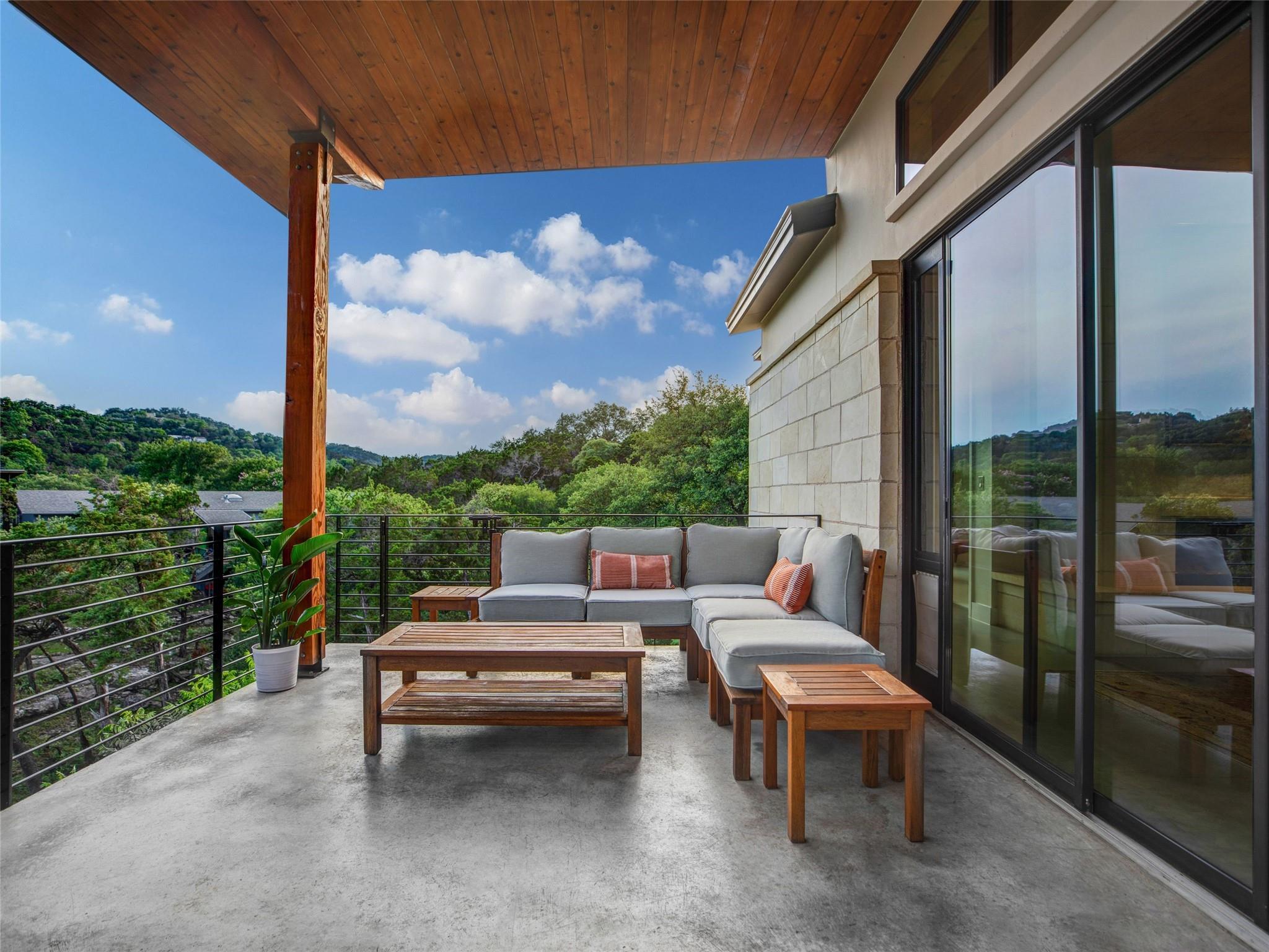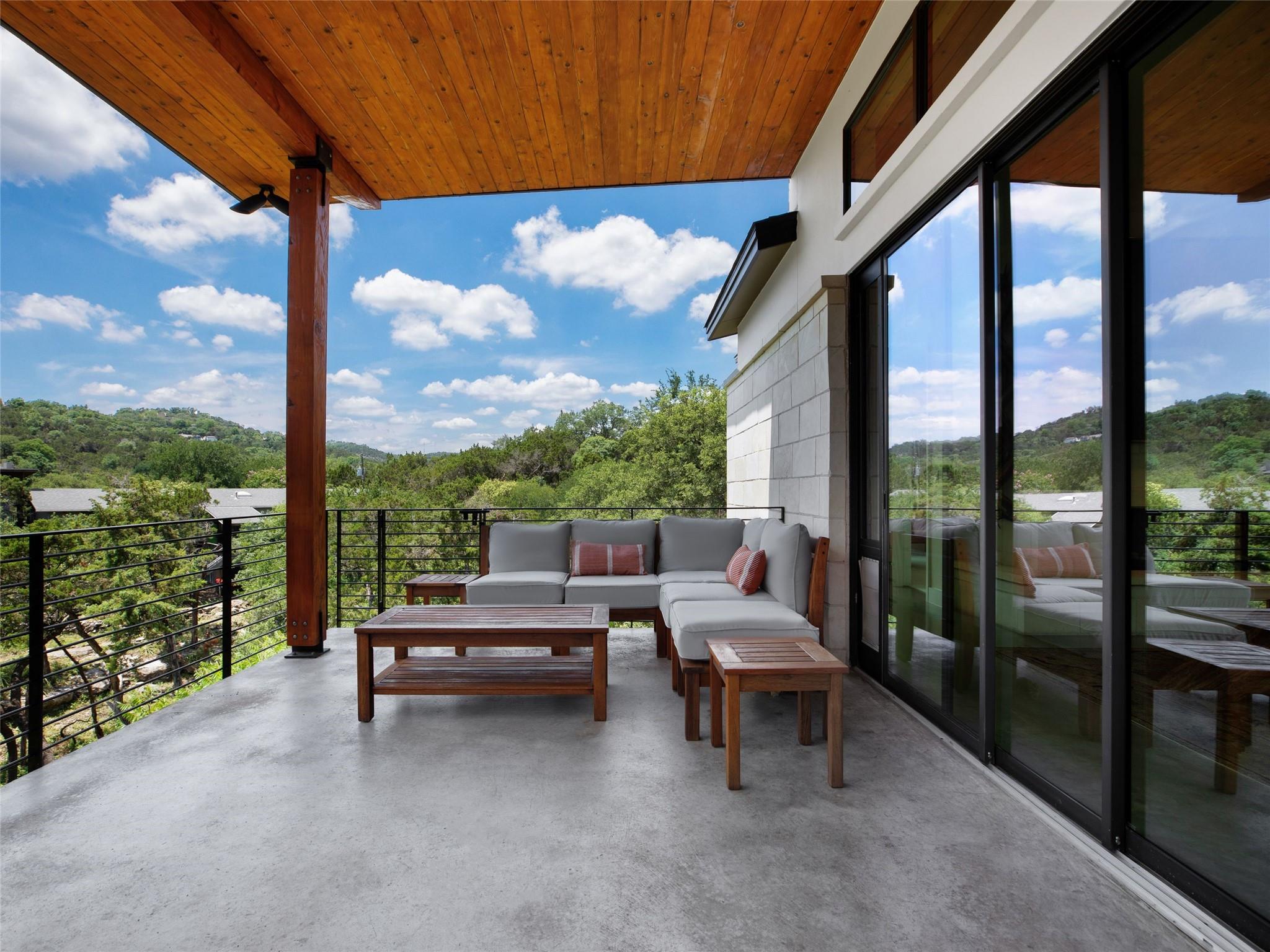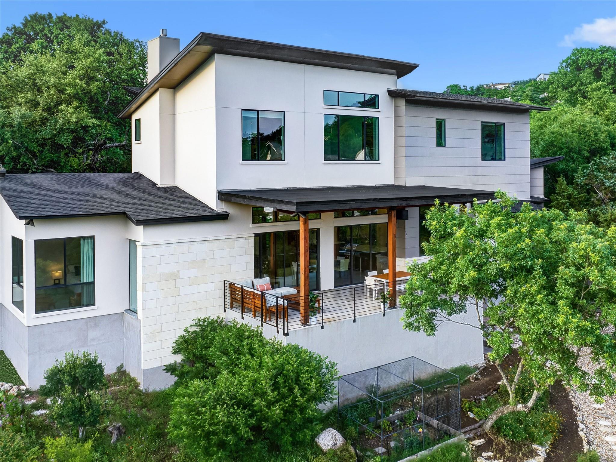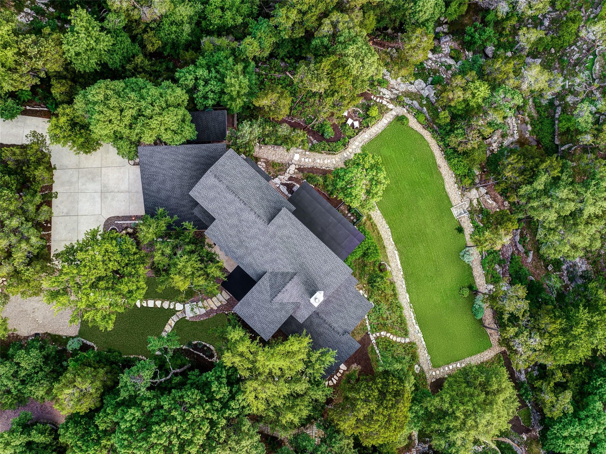 Nestled amidst nature's beauty, this unique home offers an exceptional living experience. Perched on a hillside, it provides breathtaking views of canyons and the expansive hill country. The tranquil surroundings feature the soothing sounds of nature and a flowing creek, immersing you in a serene atmosphere. The property also offers easy access to adventure with trails, swimming holes, and abundant wildlife. Despite its proximity to Downtown Austin, the home provides a secluded oasis. Inside, the warm and modern design complements the natural setting. Expansive windows and 12' ceilings maximize the views, while a stone fireplace adds cozy elegance. The open concept layout connects the kitchen, dining area, and living room seamlessly. The chef's kitchen boasts a spacious island, custom cabinetry, and Caesarstone counters. The primary bedroom offers a sanctuary with stunning vistas, and three additional bedrooms and a game room are located upstairs. The property is equipped with high-end entertainment systems and smart home features. It also offers practical benefits such as a low tax rate, few restrictions, and room for customization. This home harmoniously blends modern elegance with the tranquility of nature, creating a truly remarkable living experience. Don't miss the chance to make it your own and enjoy a daily escape into nature's embrace.