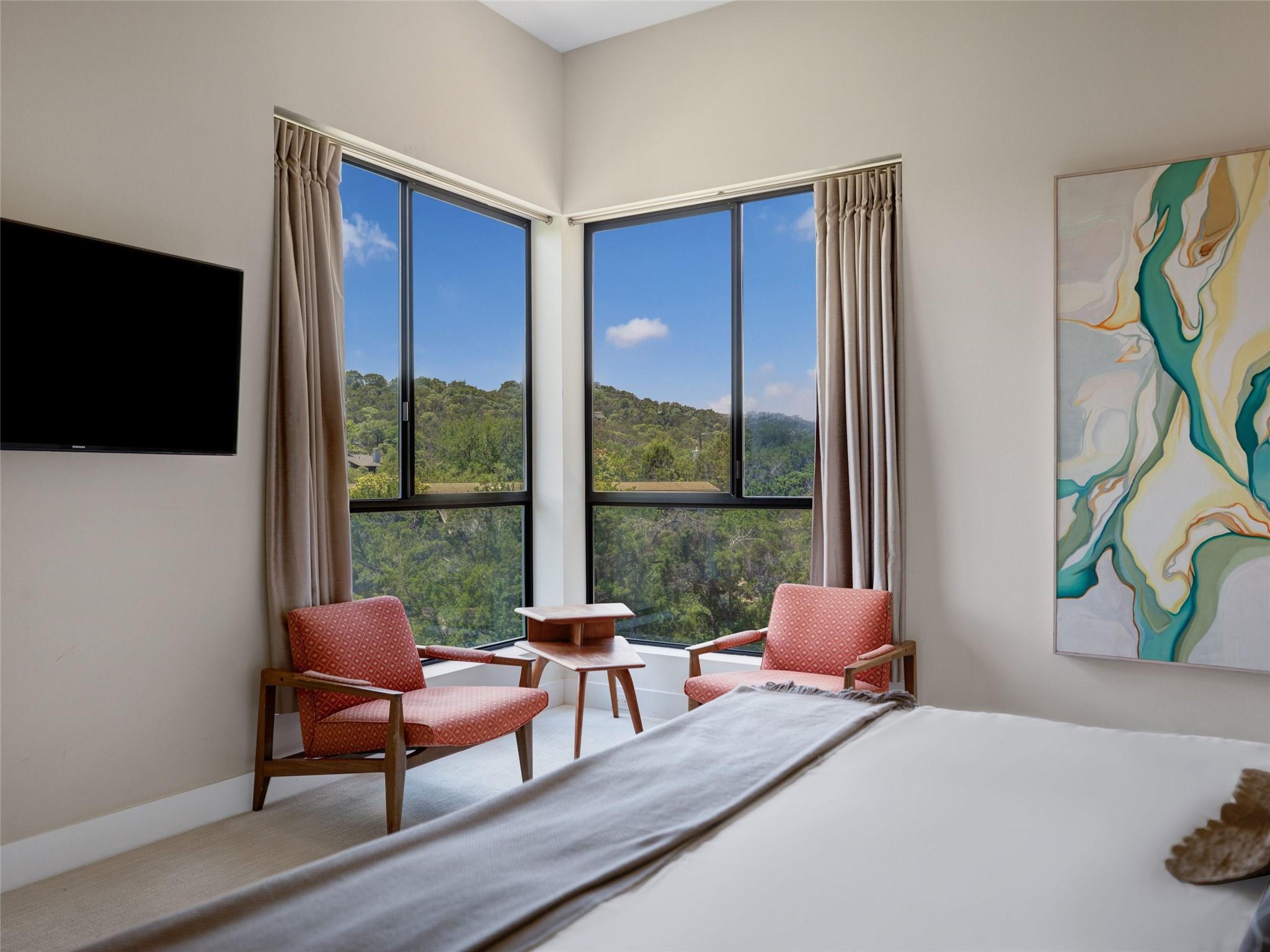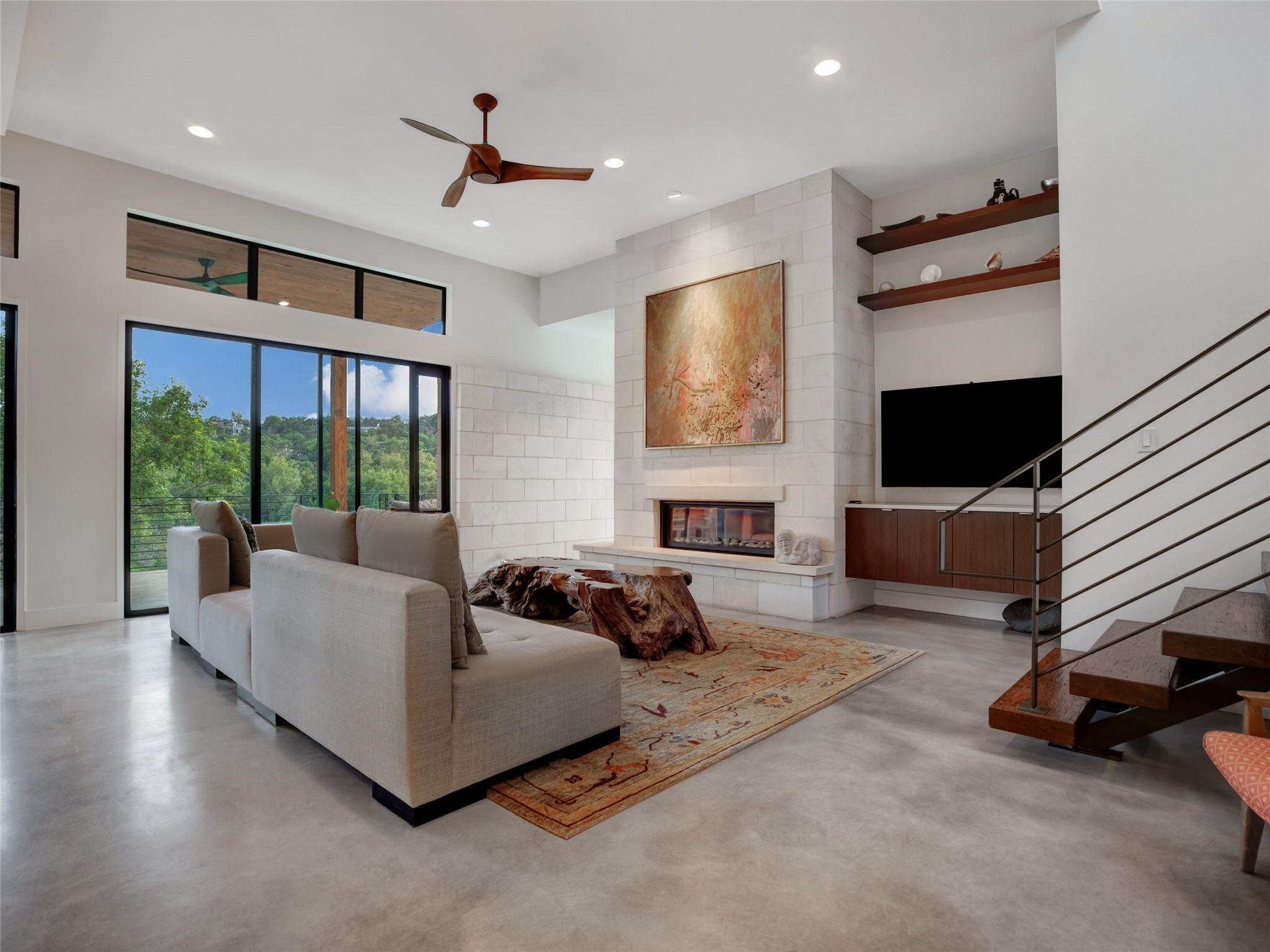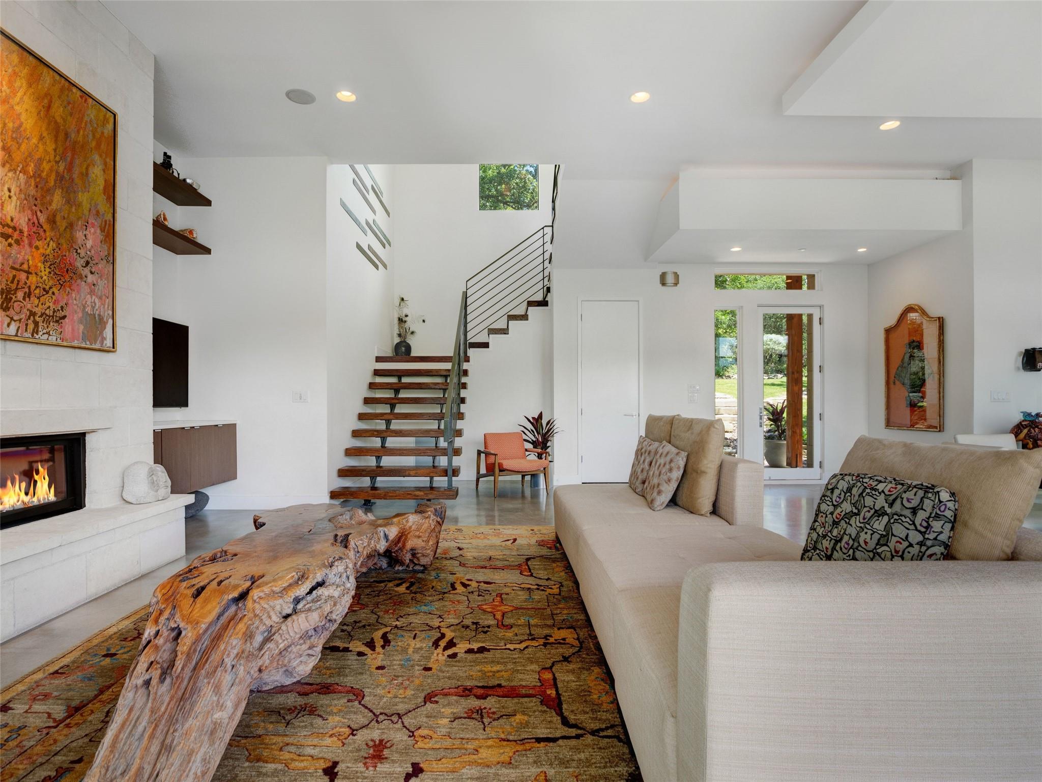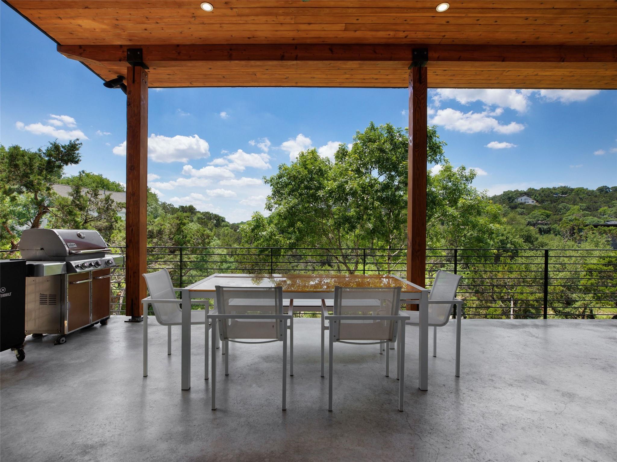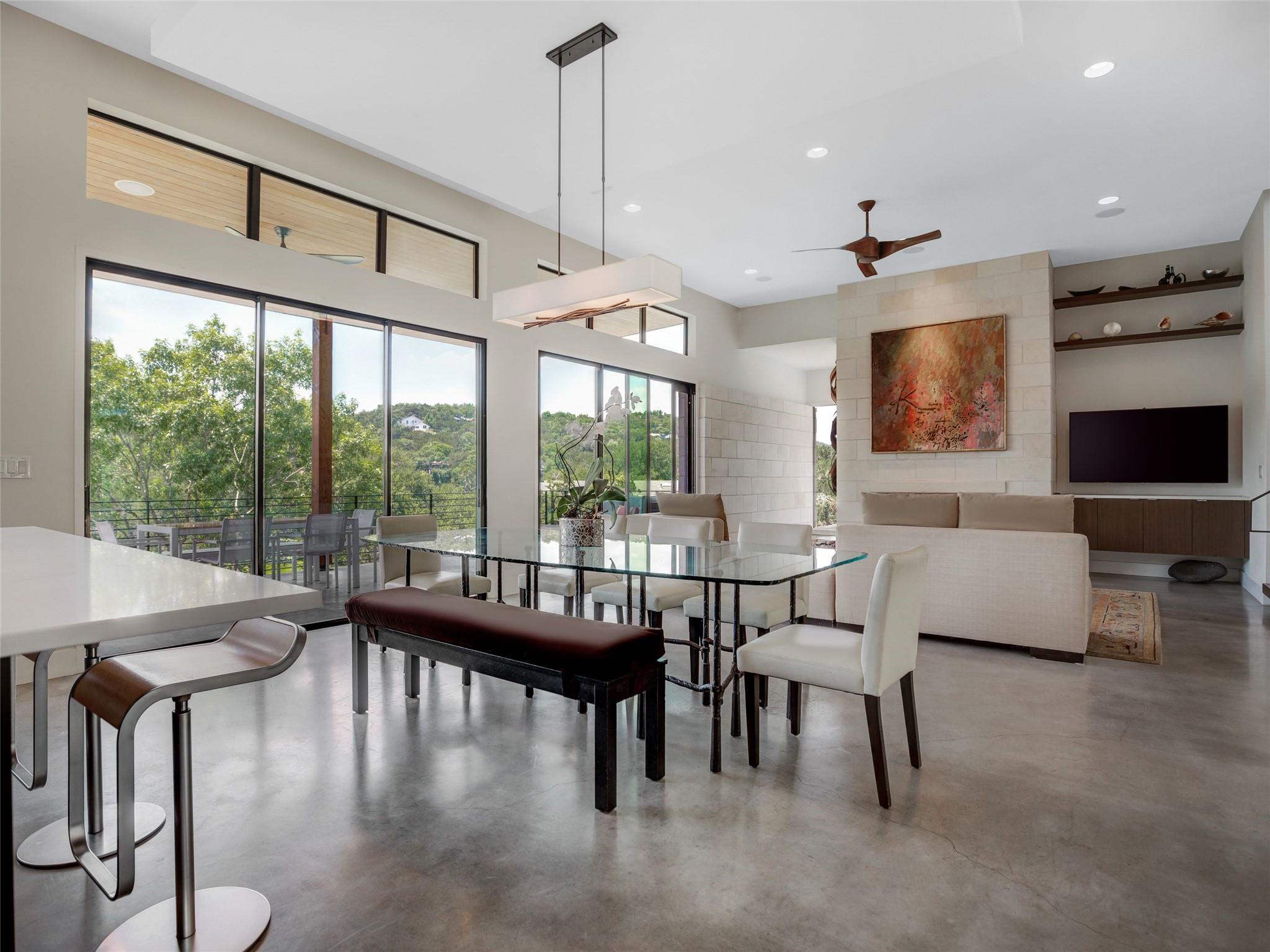 Nestled amidst nature's beauty, this unique home offers an exceptional living experience. Perched on a hillside, it provides breathtaking views of canyons and the expansive hill country. The tranquil surroundings feature the soothing sounds of nature and a flowing creek, immersing you in a serene atmosphere. The property also offers easy access to adventure with trails, swimming holes, and abundant wildlife. Despite its proximity to Downtown Austin, the home provides a secluded oasis. Inside, the warm and modern design complements the natural setting. Expansive windows and 12' ceilings maximize the views, while a stone fireplace adds cozy elegance. The open concept layout connects the kitchen, dining area, and living room seamlessly. The chef's kitchen boasts a spacious island, custom cabinetry, and Caesarstone counters. The primary bedroom offers a sanctuary with stunning vistas, and three additional bedrooms and a game room are located upstairs. The property is equipped with high-end entertainment systems and smart home features. It also offers practical benefits such as a low tax rate, few restrictions, and room for customization. This home harmoniously blends modern elegance with the tranquility of nature, creating a truly remarkable living experience. Don't miss the chance to make it your own and enjoy a daily escape into nature's embrace.