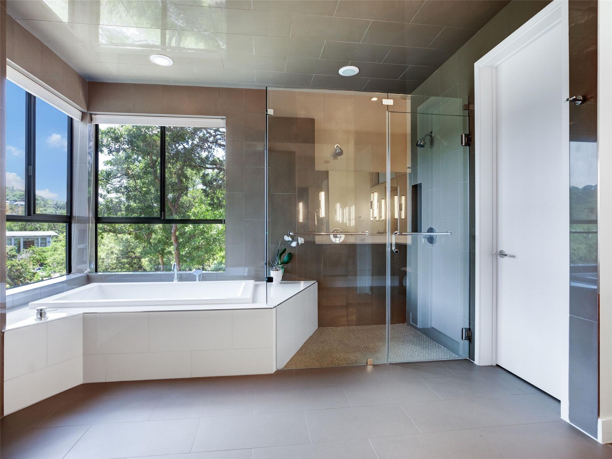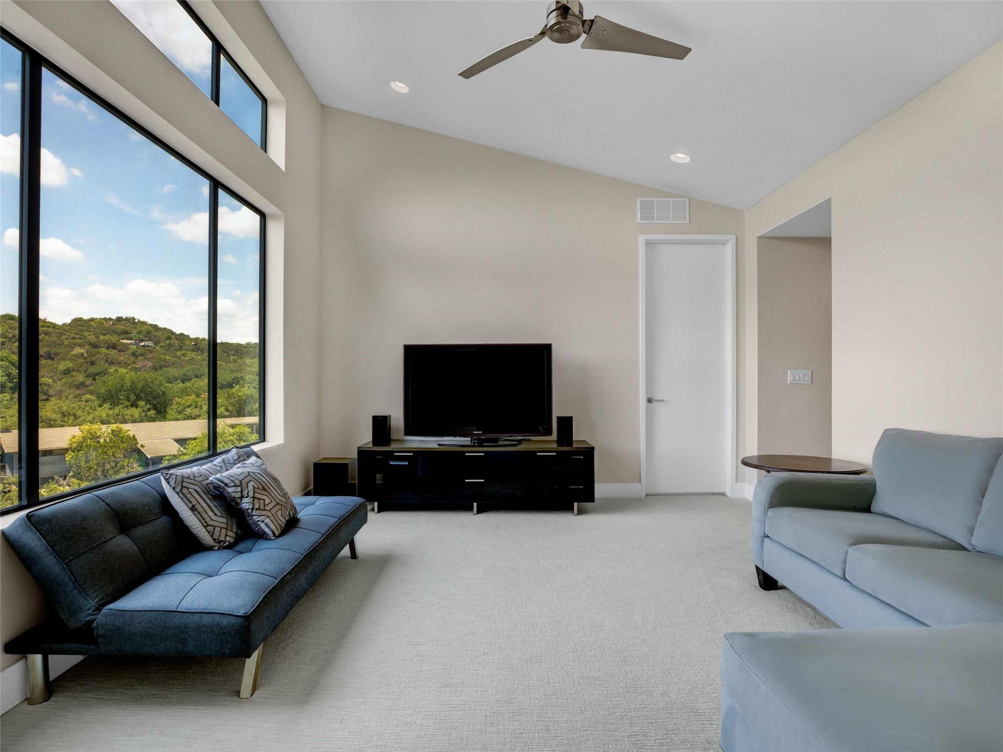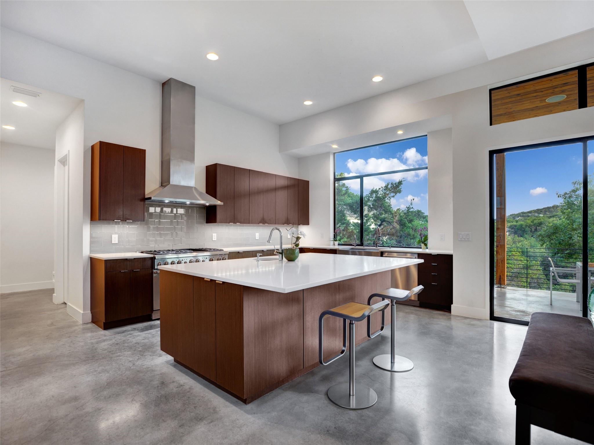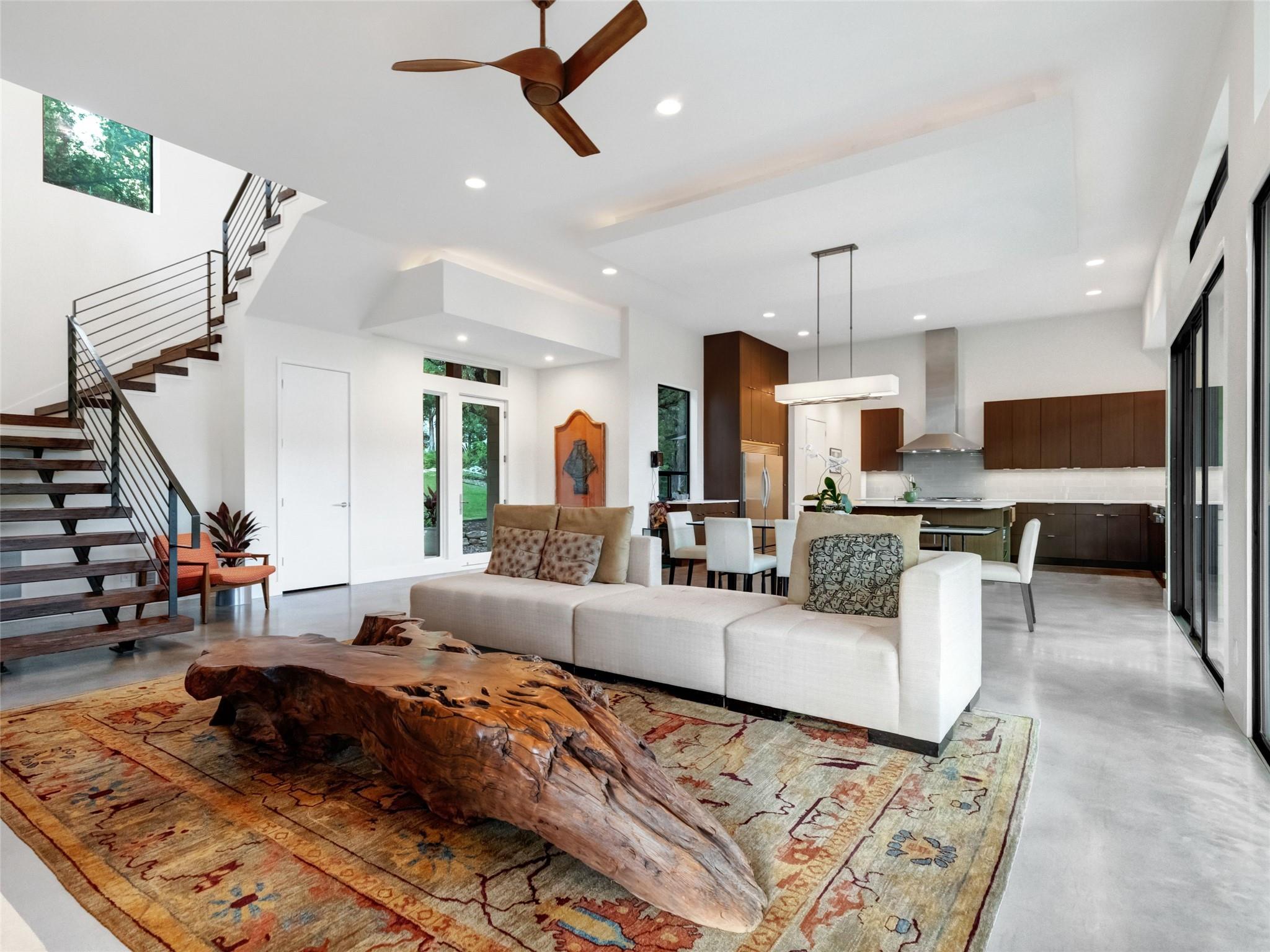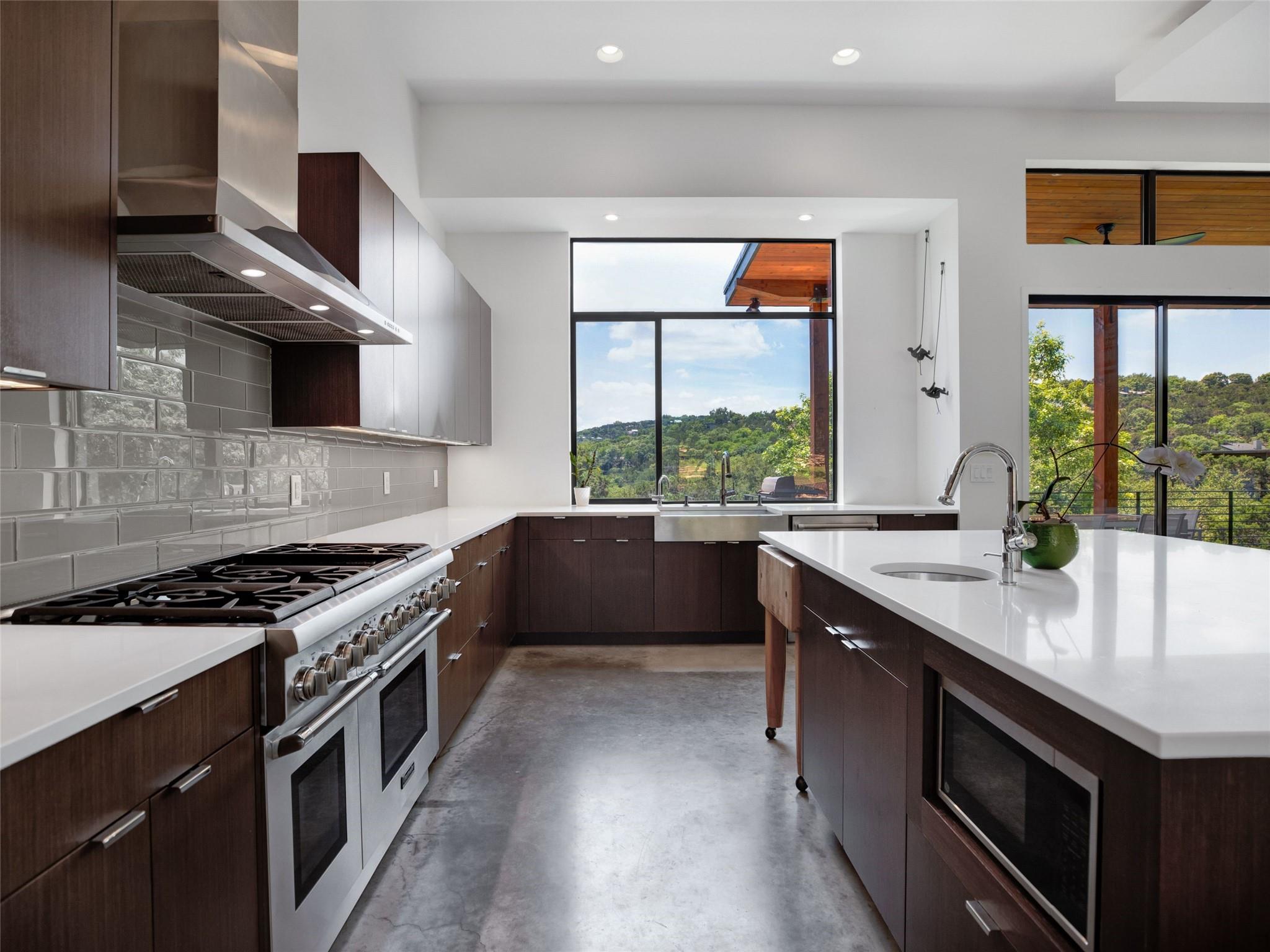 Nestled amidst nature's beauty, this unique home offers an exceptional living experience. Perched on a hillside, it provides breathtaking views of canyons and the expansive hill country. The tranquil surroundings feature the soothing sounds of nature and a flowing creek, immersing you in a serene atmosphere. The property also offers easy access to adventure with trails, swimming holes, and abundant wildlife. Despite its proximity to Downtown Austin, the home provides a secluded oasis. Inside, the warm and modern design complements the natural setting. Expansive windows and 12' ceilings maximize the views, while a stone fireplace adds cozy elegance. The open concept layout connects the kitchen, dining area, and living room seamlessly. The chef's kitchen boasts a spacious island, custom cabinetry, and Caesarstone counters. The primary bedroom offers a sanctuary with stunning vistas, and three additional bedrooms and a game room are located upstairs. The property is equipped with high-end entertainment systems and smart home features. It also offers practical benefits such as a low tax rate, few restrictions, and room for customization. This home harmoniously blends modern elegance with the tranquility of nature, creating a truly remarkable living experience. Don't miss the chance to make it your own and enjoy a daily escape into nature's embrace.