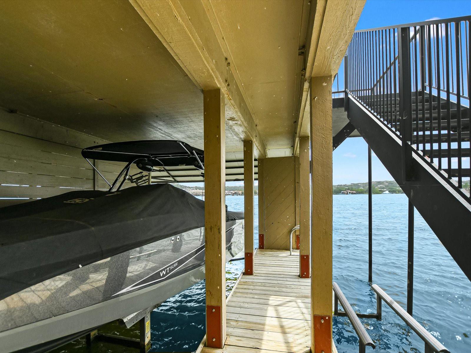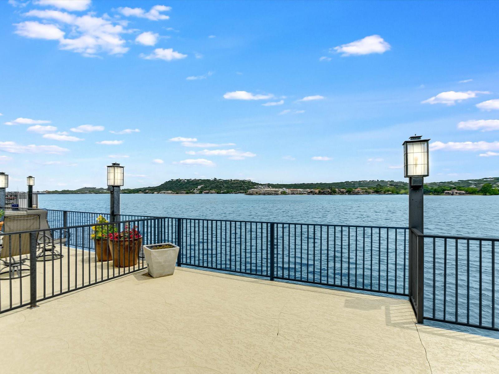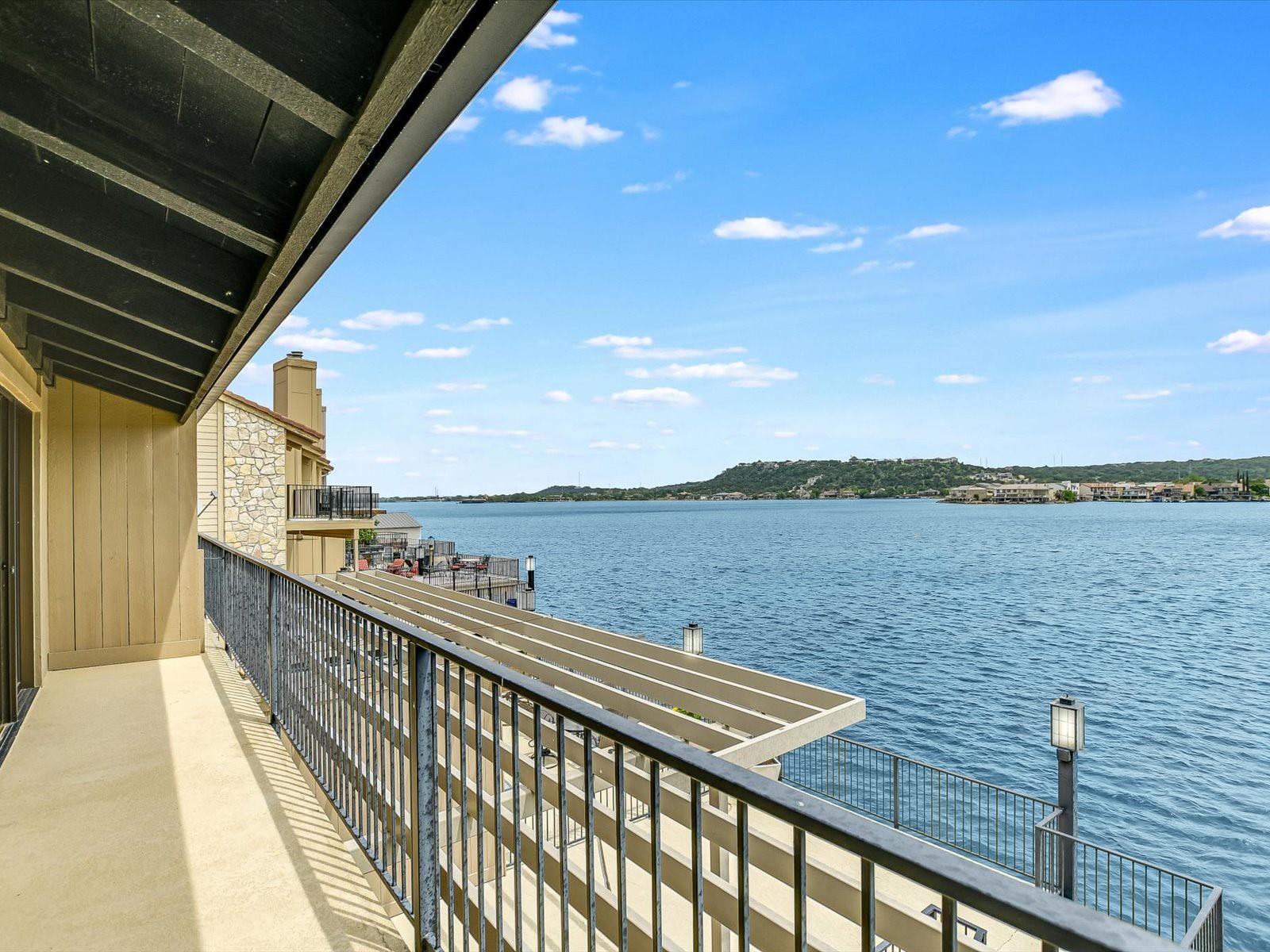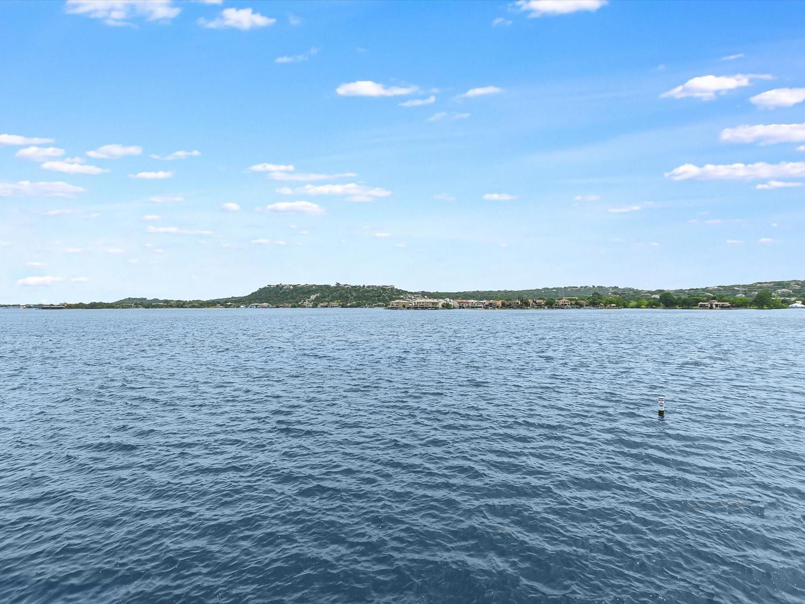 Located in the highly desired core area of Horseshoe Bay, this 4-bedroom, 4-bath Lake LBJ waterfront townhome is your chance to be in the heart of Horseshoe Bay within walking distance of many of the Horseshoe Bay Resort's world-class amenities. (Membership required to enjoy amenities). By the summer, you could enjoy fantastic southeast-facing open water views from your patio! Inside, the main level is filled with natural light shining through the wall of glass doors and windows that perfectly frame the panoramic views. The open floorplan features spacious dining and living areas, which offer access to the 300 sq. ft. patio overlooking Lake LBJ, the perfect spot to watch the annual July 4th fireworks display surrounded by family & friends. The updated kitchen boasts stainless steel appliances, a breakfast bar, granite countertops and a generous pantry. The main floor also boasts a spacious guest room and full bath. Upstairs, one guestroom, currently used as a bunk room, features patio access, and the primary suite opens to a terrace overlooking the lake where you can enjoy morning coffee. The walk-in closet leads to the en-suite bathroom, with a double vanity and skylight allowing natural lighting to fill the space. Full bath and laundry are also located on this level. One large bedroom with a seating area, a walk-in closet and a full bath can be found downstairs, with patio access leading to the boat slip and the PWC lift. Access to an oversized attached garage is on the lower level.