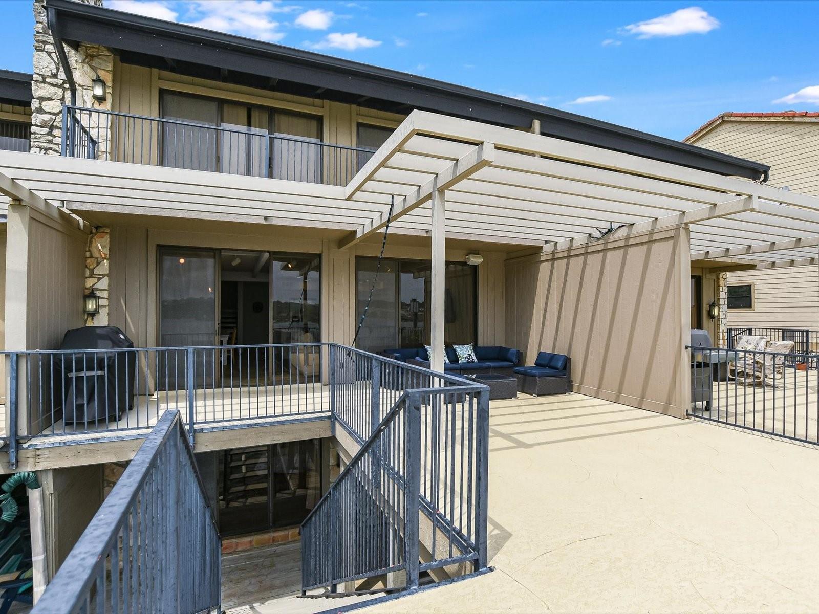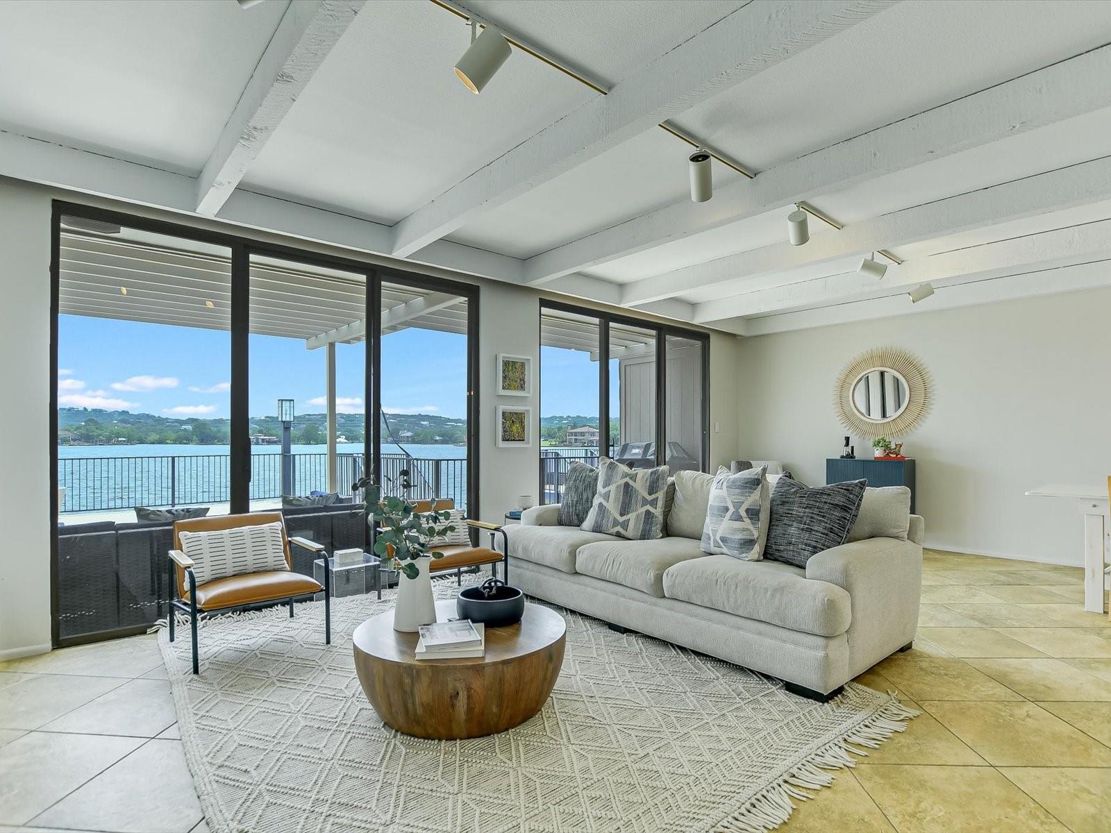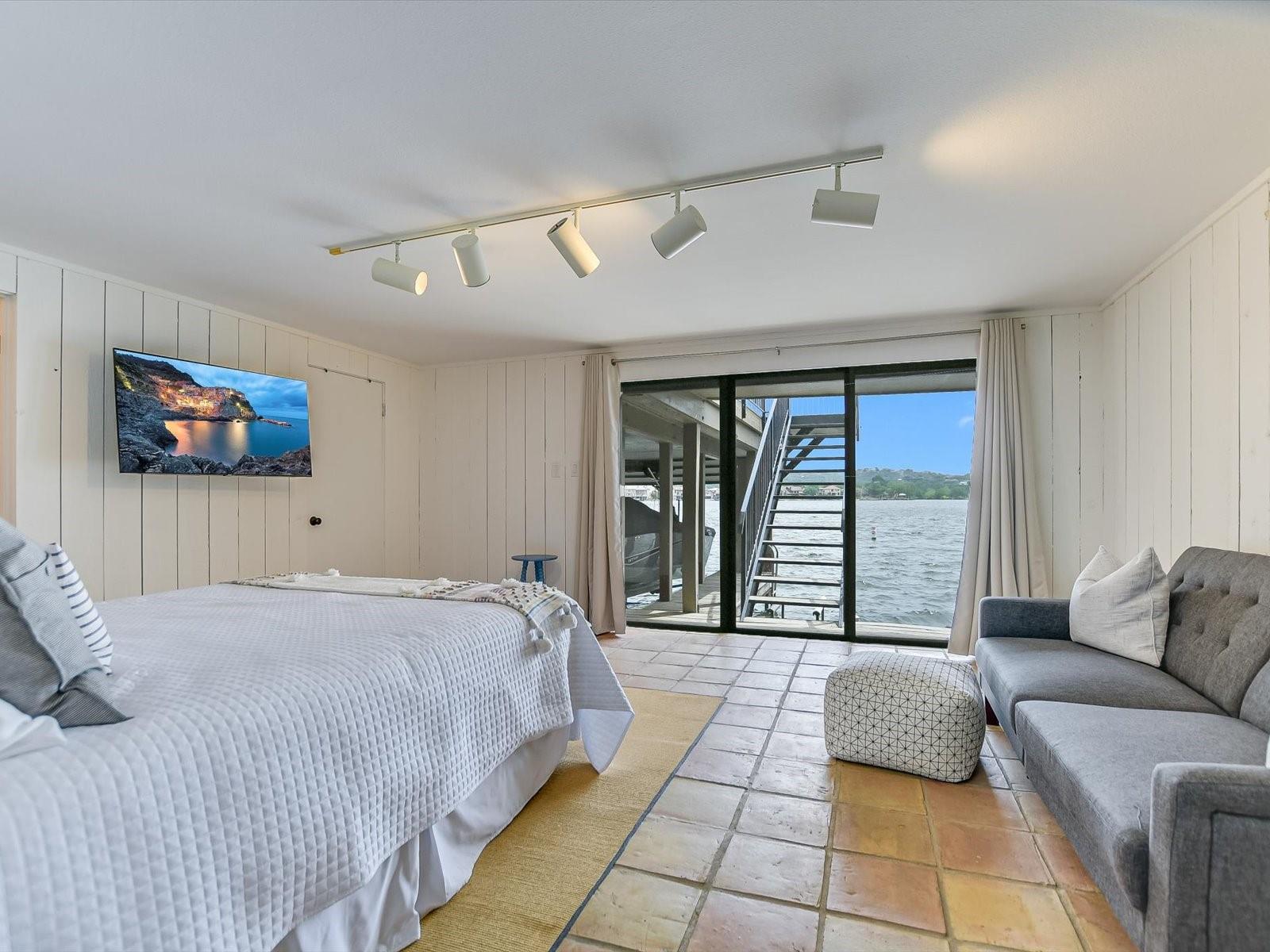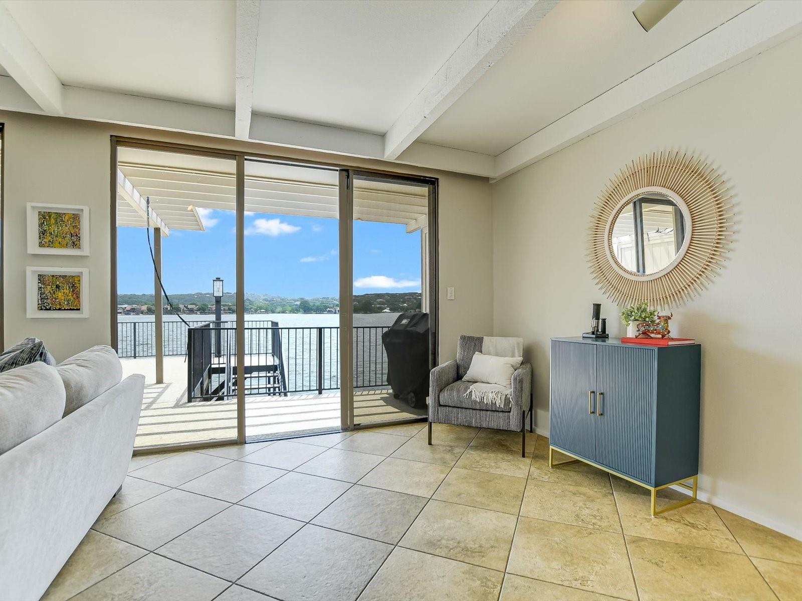 Located in the highly desired core area of Horseshoe Bay, this 4-bedroom, 4-bath Lake LBJ waterfront townhome is your chance to be in the heart of Horseshoe Bay within walking distance of many of the Horseshoe Bay Resort's world-class amenities. (Membership required to enjoy amenities). By the summer, you could enjoy fantastic southeast-facing open water views from your patio! Inside, the main level is filled with natural light shining through the wall of glass doors and windows that perfectly frame the panoramic views. The open floorplan features spacious dining and living areas, which offer access to the 300 sq. ft. patio overlooking Lake LBJ, the perfect spot to watch the annual July 4th fireworks display surrounded by family & friends. The updated kitchen boasts stainless steel appliances, a breakfast bar, granite countertops and a generous pantry. The main floor also boasts a spacious guest room and full bath. Upstairs, one guestroom, currently used as a bunk room, features patio access, and the primary suite opens to a terrace overlooking the lake where you can enjoy morning coffee. The walk-in closet leads to the en-suite bathroom, with a double vanity and skylight allowing natural lighting to fill the space. Full bath and laundry are also located on this level. One large bedroom with a seating area, a walk-in closet and a full bath can be found downstairs, with patio access leading to the boat slip and the PWC lift. Access to an oversized attached garage is on the lower level.