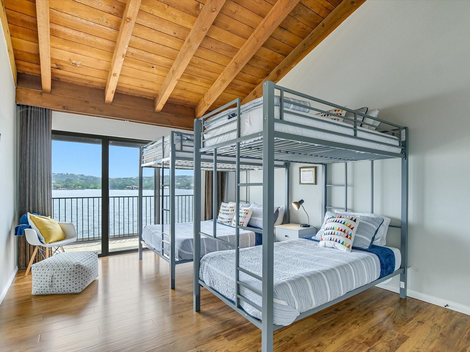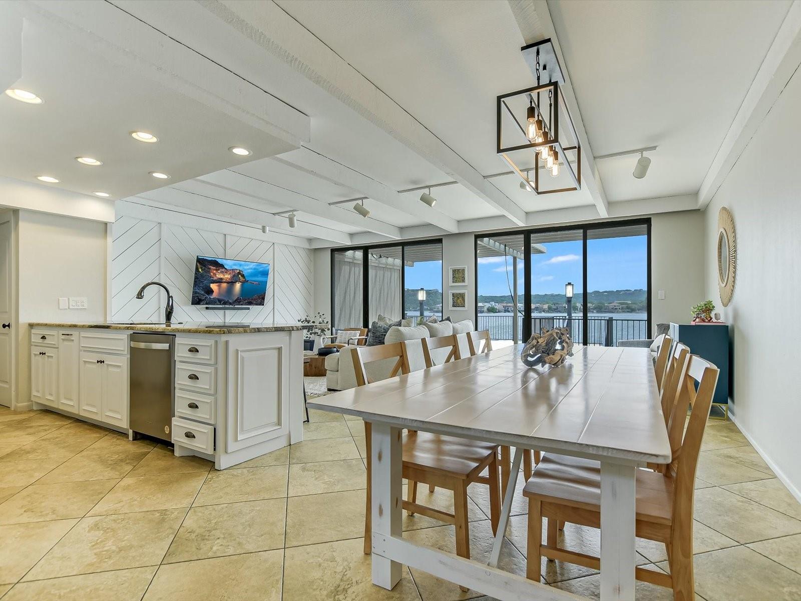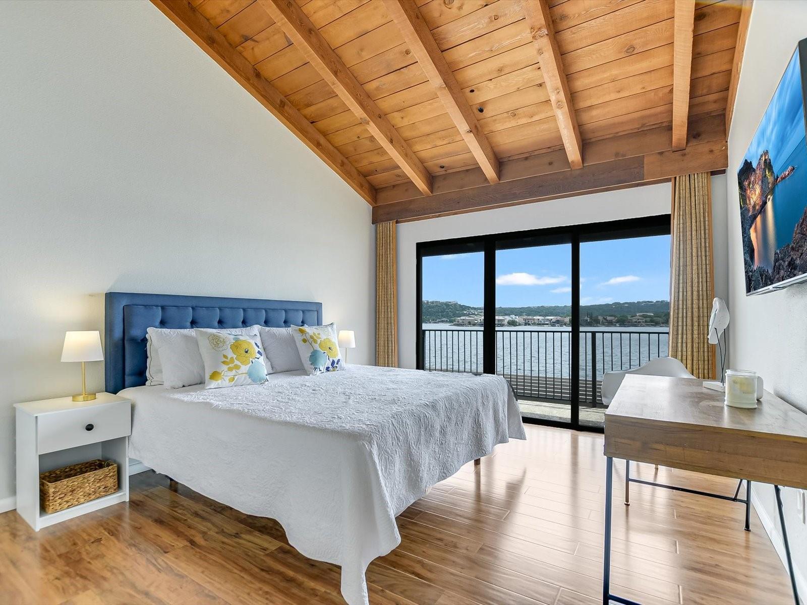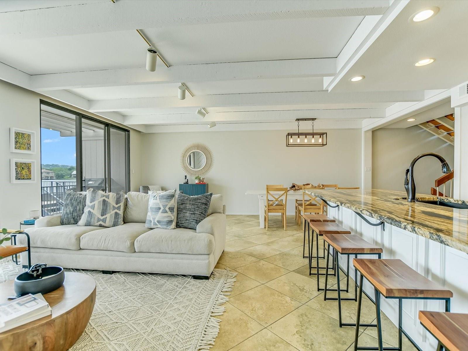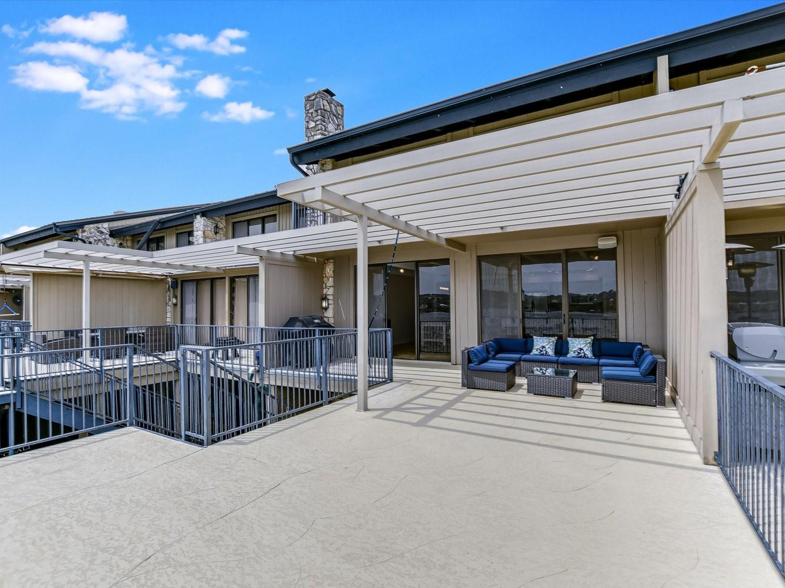 Located in the highly desired core area of Horseshoe Bay, this 4-bedroom, 4-bath Lake LBJ waterfront townhome is your chance to be in the heart of Horseshoe Bay within walking distance of many of the Horseshoe Bay Resort's world-class amenities. (Membership required to enjoy amenities). By the summer, you could enjoy fantastic southeast-facing open water views from your patio! Inside, the main level is filled with natural light shining through the wall of glass doors and windows that perfectly frame the panoramic views. The open floorplan features spacious dining and living areas, which offer access to the 300 sq. ft. patio overlooking Lake LBJ, the perfect spot to watch the annual July 4th fireworks display surrounded by family & friends. The updated kitchen boasts stainless steel appliances, a breakfast bar, granite countertops and a generous pantry. The main floor also boasts a spacious guest room and full bath. Upstairs, one guestroom, currently used as a bunk room, features patio access, and the primary suite opens to a terrace overlooking the lake where you can enjoy morning coffee. The walk-in closet leads to the en-suite bathroom, with a double vanity and skylight allowing natural lighting to fill the space. Full bath and laundry are also located on this level. One large bedroom with a seating area, a walk-in closet and a full bath can be found downstairs, with patio access leading to the boat slip and the PWC lift. Access to an oversized attached garage is on the lower level.