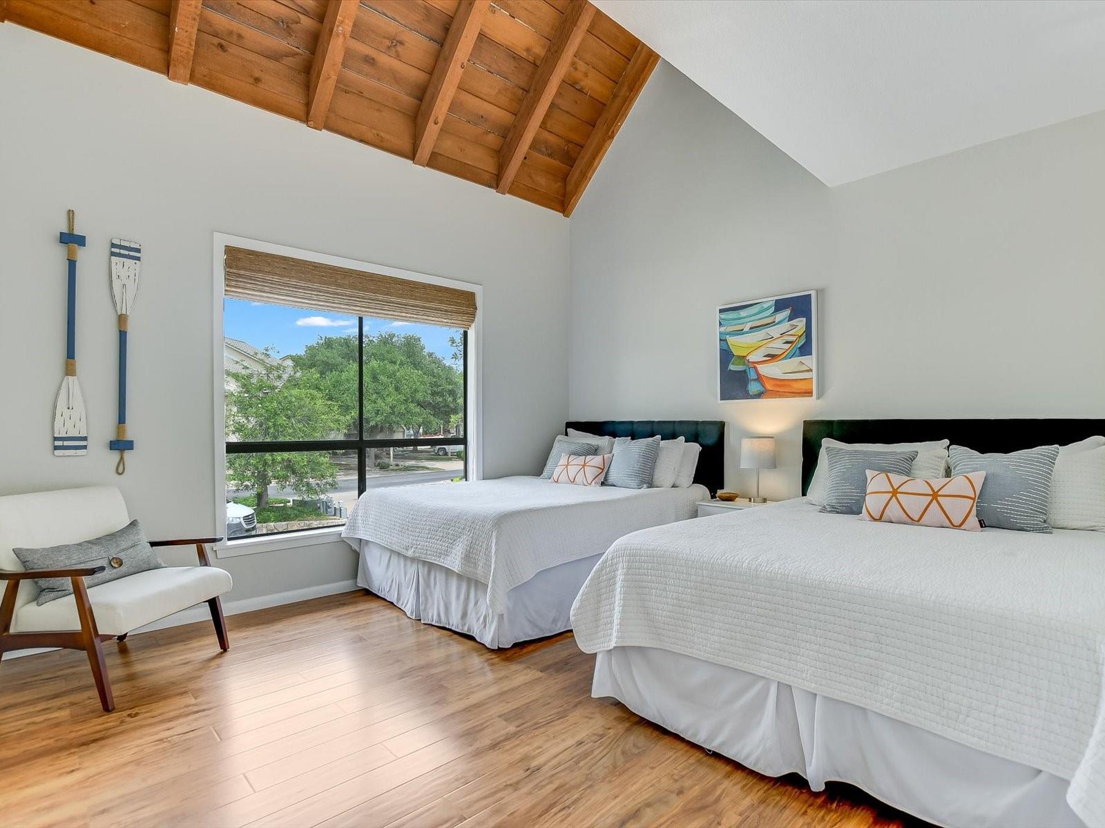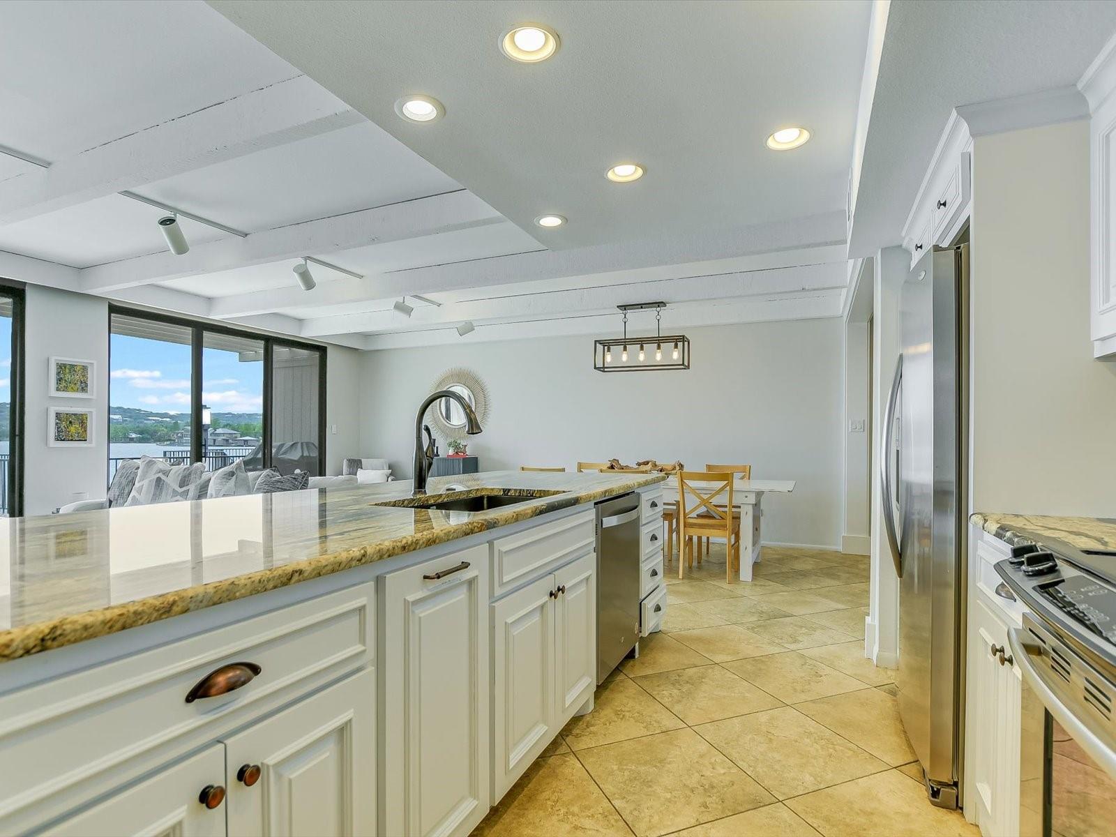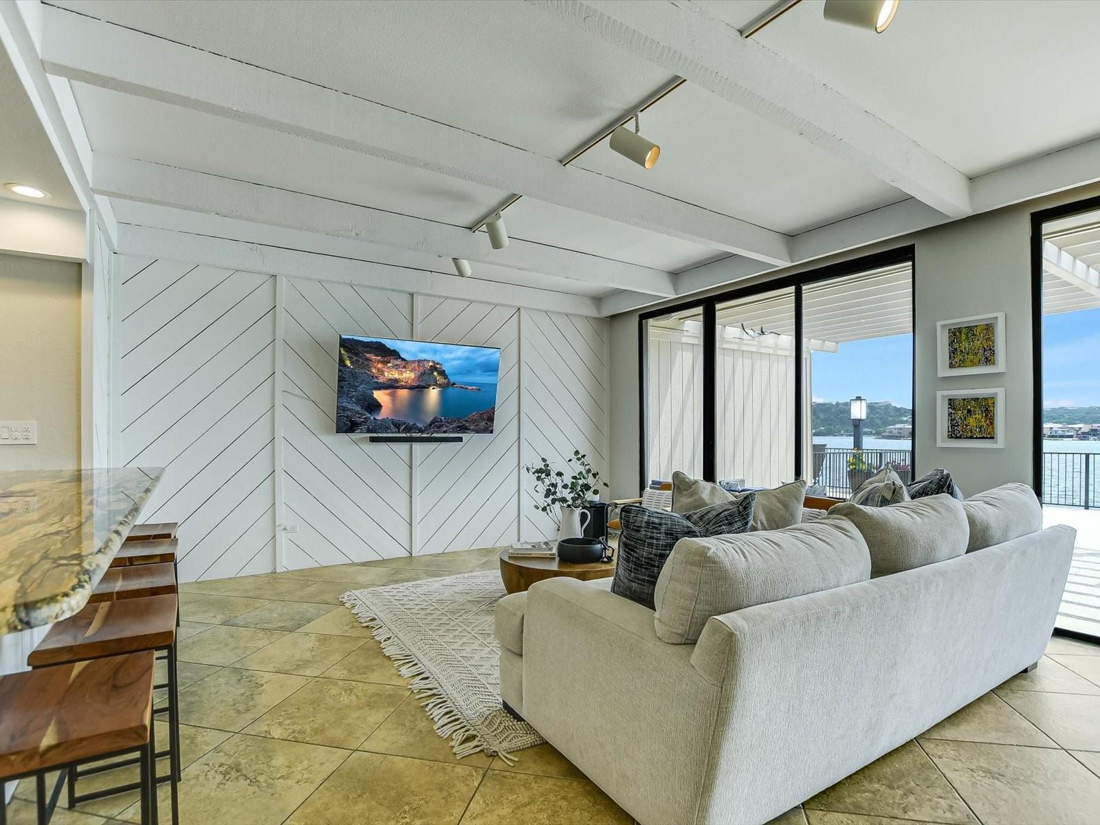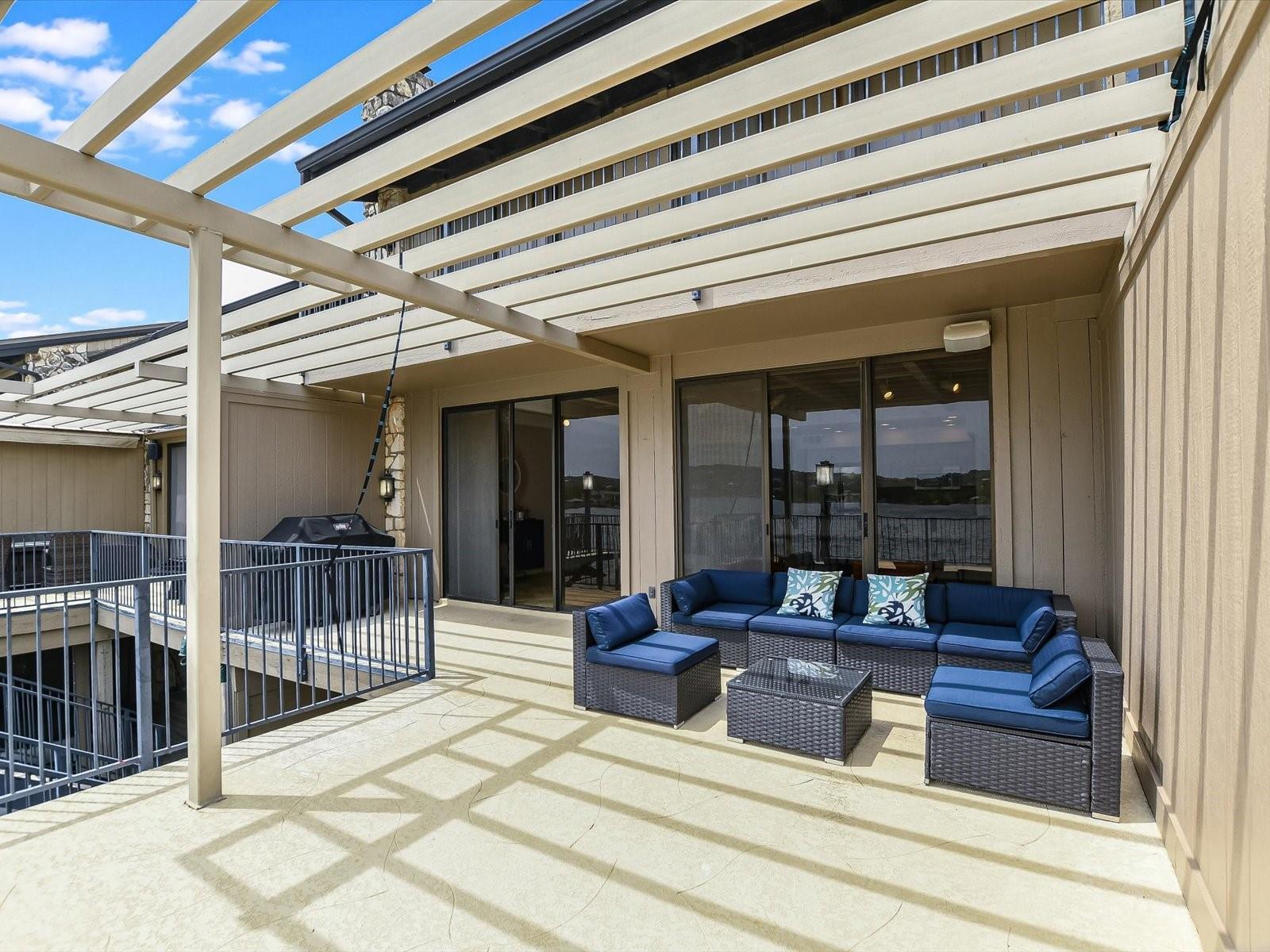 Located in the highly desired core area of Horseshoe Bay, this 4-bedroom, 4-bath Lake LBJ waterfront townhome is your chance to be in the heart of Horseshoe Bay within walking distance of many of the Horseshoe Bay Resort's world-class amenities. (Membership required to enjoy amenities). By the summer, you could enjoy fantastic southeast-facing open water views from your patio! Inside, the main level is filled with natural light shining through the wall of glass doors and windows that perfectly frame the panoramic views. The open floorplan features spacious dining and living areas, which offer access to the 300 sq. ft. patio overlooking Lake LBJ, the perfect spot to watch the annual July 4th fireworks display surrounded by family & friends. The updated kitchen boasts stainless steel appliances, a breakfast bar, granite countertops and a generous pantry. The main floor also boasts a spacious guest room and full bath. Upstairs, one guestroom, currently used as a bunk room, features patio access, and the primary suite opens to a terrace overlooking the lake where you can enjoy morning coffee. The walk-in closet leads to the en-suite bathroom, with a double vanity and skylight allowing natural lighting to fill the space. Full bath and laundry are also located on this level. One large bedroom with a seating area, a walk-in closet and a full bath can be found downstairs, with patio access leading to the boat slip and the PWC lift. Access to an oversized attached garage is on the lower level.