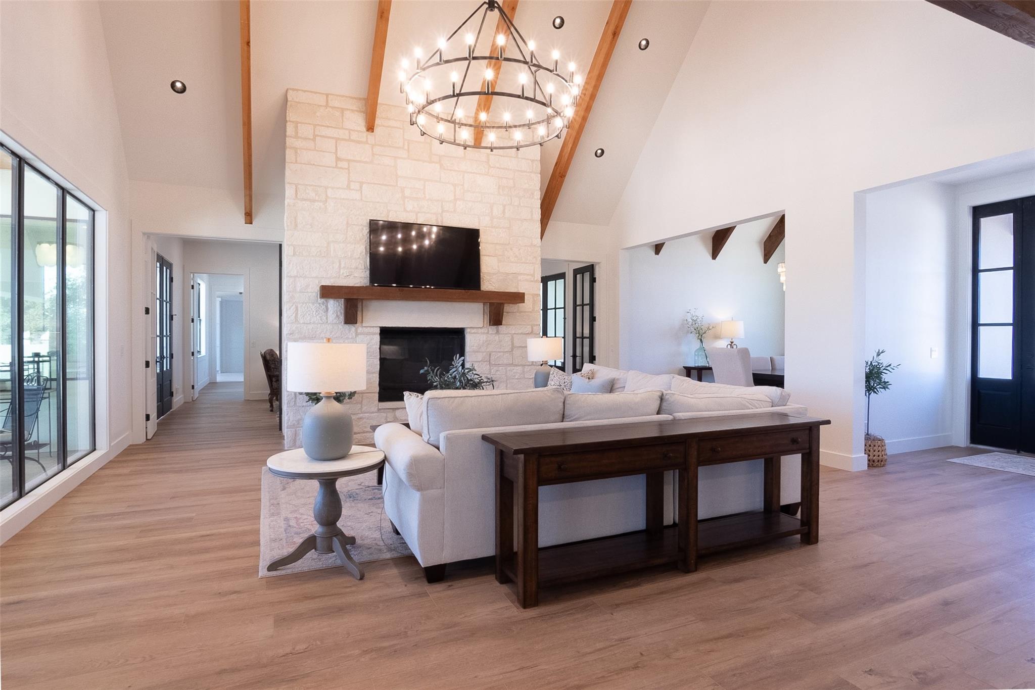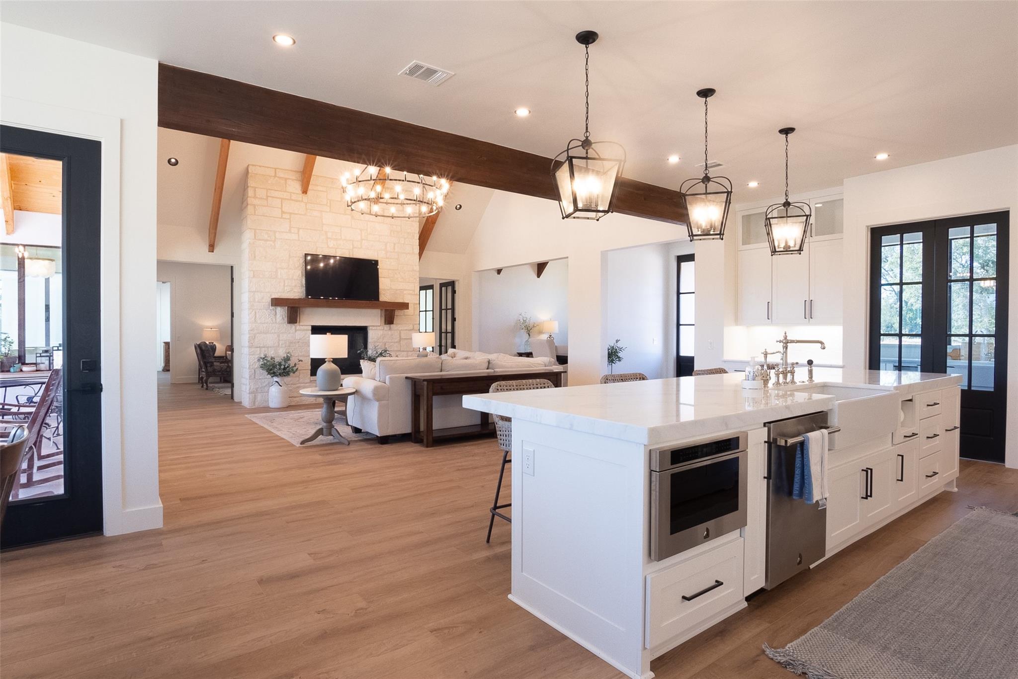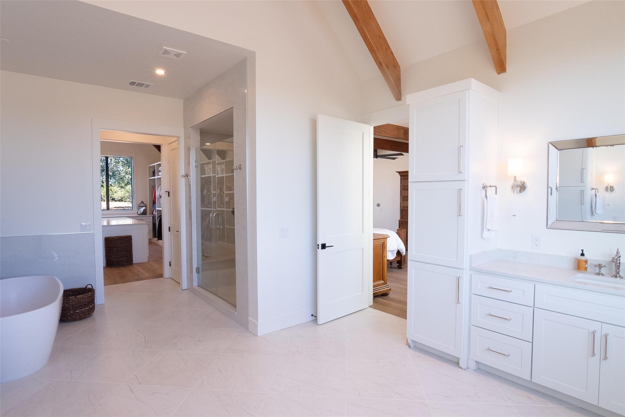 | Interior Features | Beamed Ceilings, Quartz Counters, Double Vanity, In-Law Floorplan, Multiple Living Areas, Open Floorplan, Primary Bedroom on Main | |