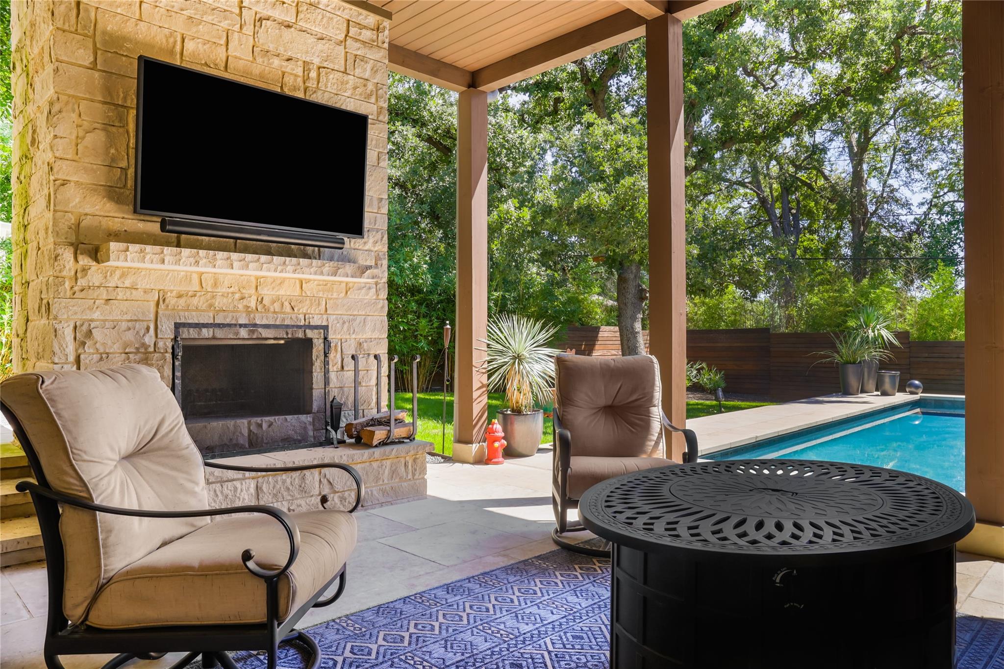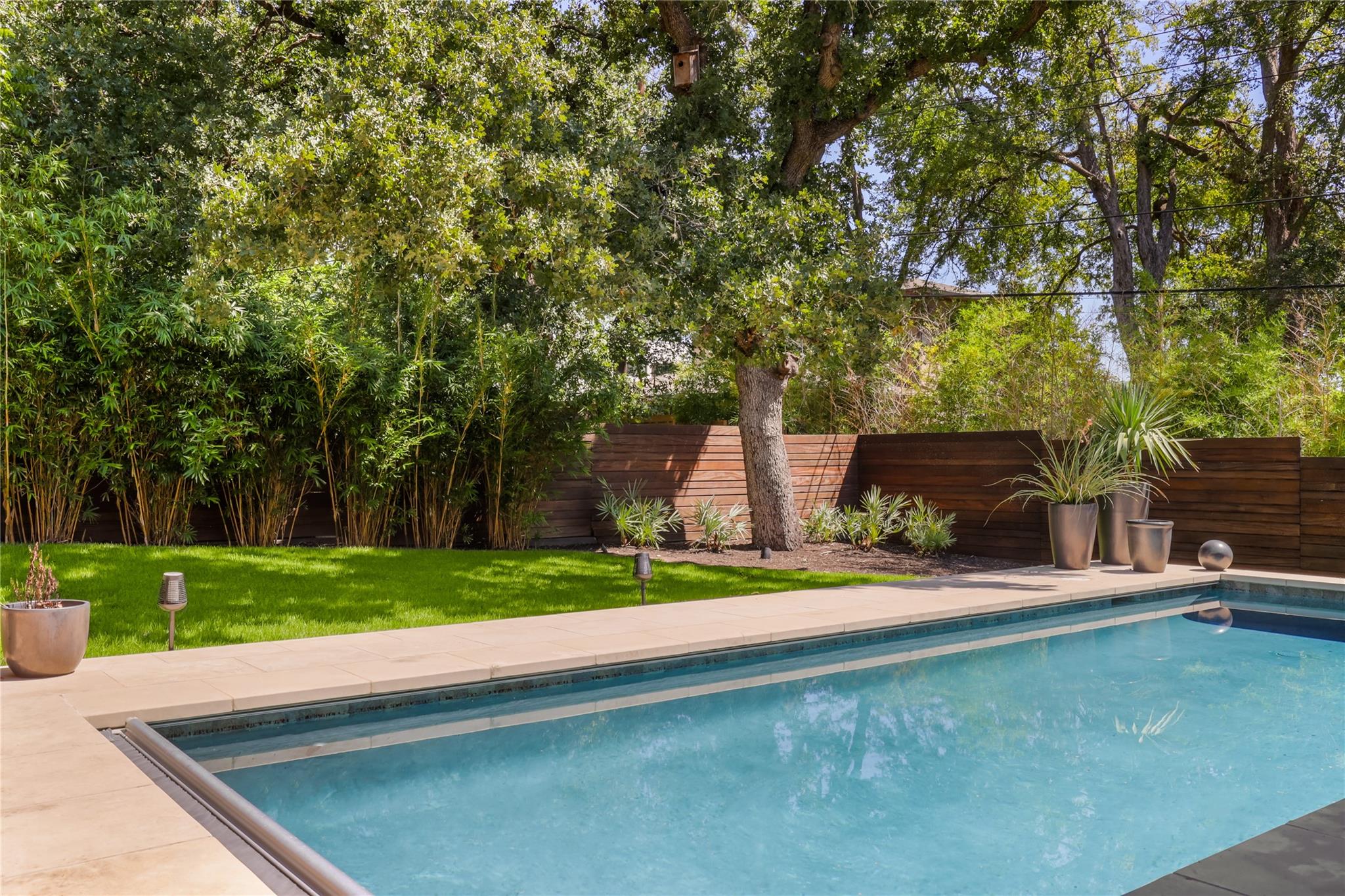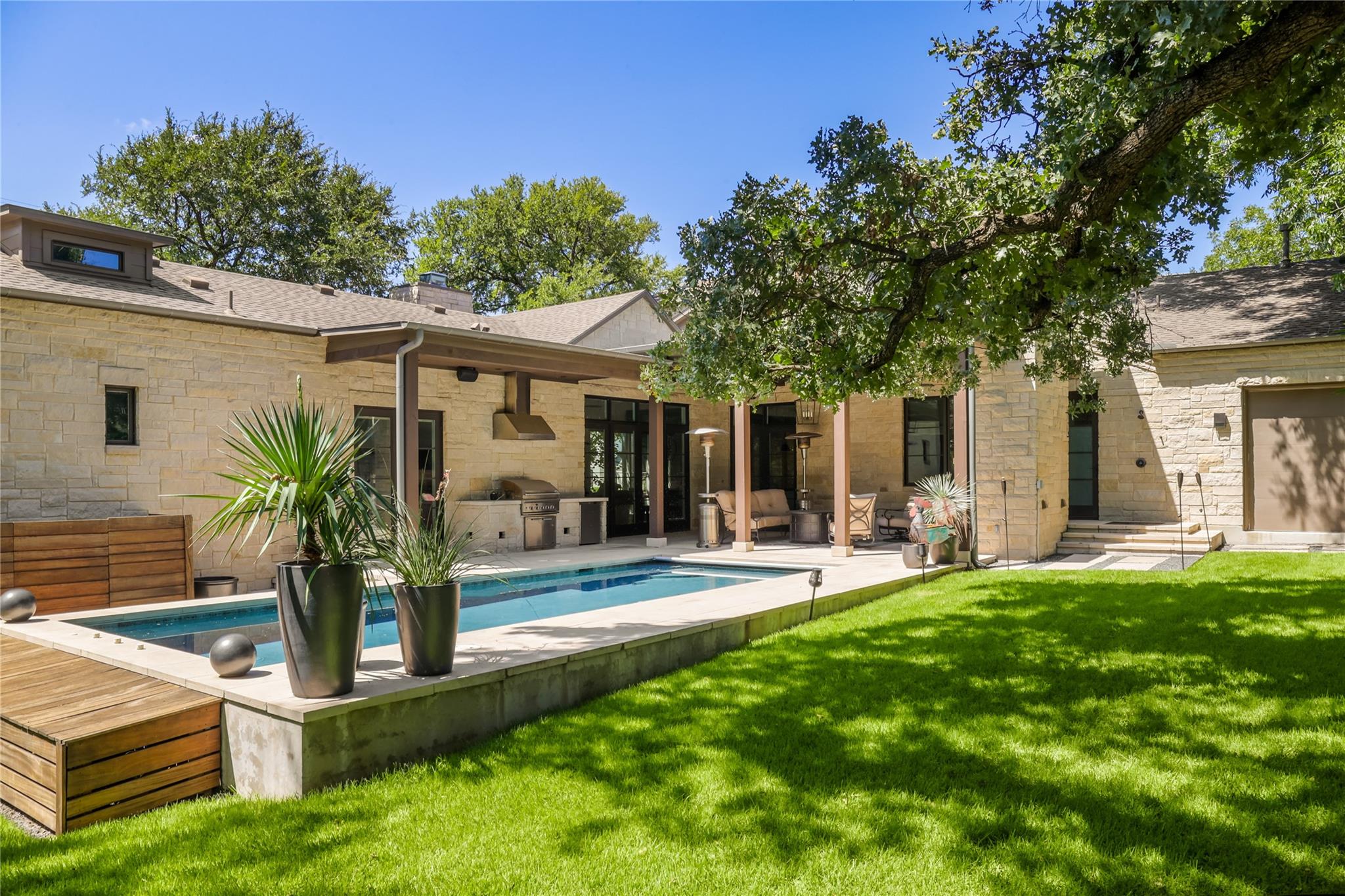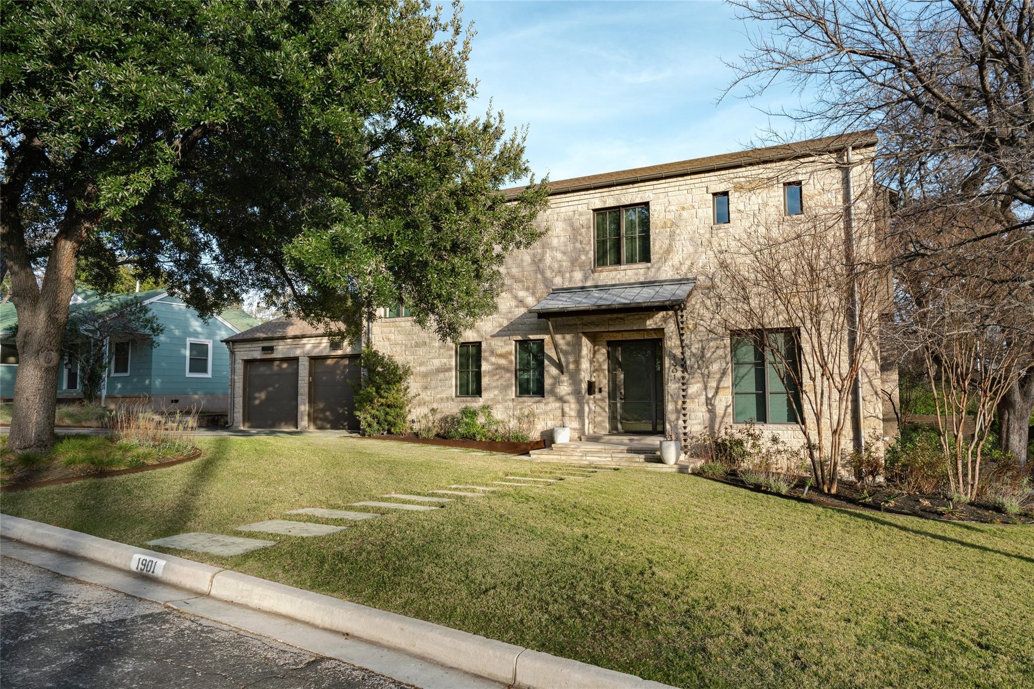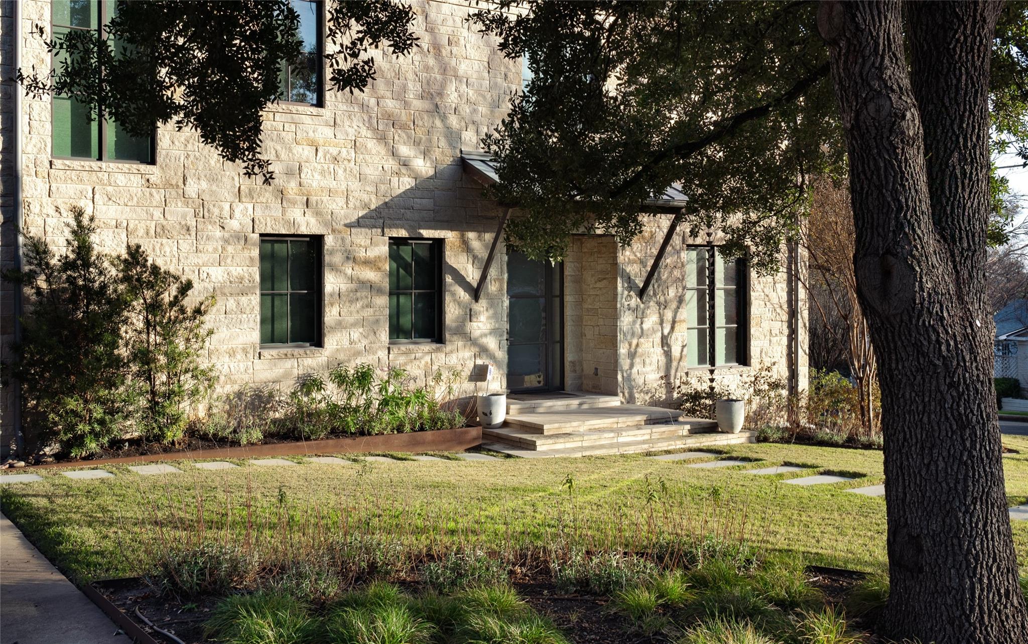 Sophisticated contemporary in ultra-convenient Tarrytown, one of Austin’s most desirable neighborhoods. This established enclave is filled with shady, walkable streets hosting beautiful homes; a quaint neighborhood shopping center is just a few blocks away as is Lions Municipal Golf Course. While the environment is quiet and serene, you can be downtown in less than 10 minutes without getting on the highway. Set on a large corner lot shaded with mature pecan and oak trees, this property enjoys a very private backyard where you will find yourself enjoying dinner on the patio, a fire on cool evenings or splashing in the pool. A large, level lawn provides plenty of space to run and play. The stone-clad home is a warm and modern with the rockwork continuing inside to add texture and depth to the rich wide-plank oak floors, limestone fireplace and fresh white walls. A cozy formal living area or executive office space at the front of the house features a hidden desk area making the space multi-functional. A convenient bar welcomes you to the main living area which is bracketed by large windows looking out over the side lawn and the covered terrace. The bright gourmet kitchen centers the living/entertaining space and allows the cook to be part of the fun while preparing. The flowing layout provides plenty of space for entertaining and encourages guests to enjoy indoor and outdoor spaces. The main-floor primary suite is set privately towards the back of the house and enjoys a sleek, skylit bath with soaking tub and large walk-through shower – two walk-in closets provide a place for everything. The main floor also features an en-suite guest room that has direct access to the back yard. Upstairs, two additional bedrooms surround a game room perfect for movie night or kid’s entertaining. Additional amenities include a second office/planning area and a large utility/laundry with sink.