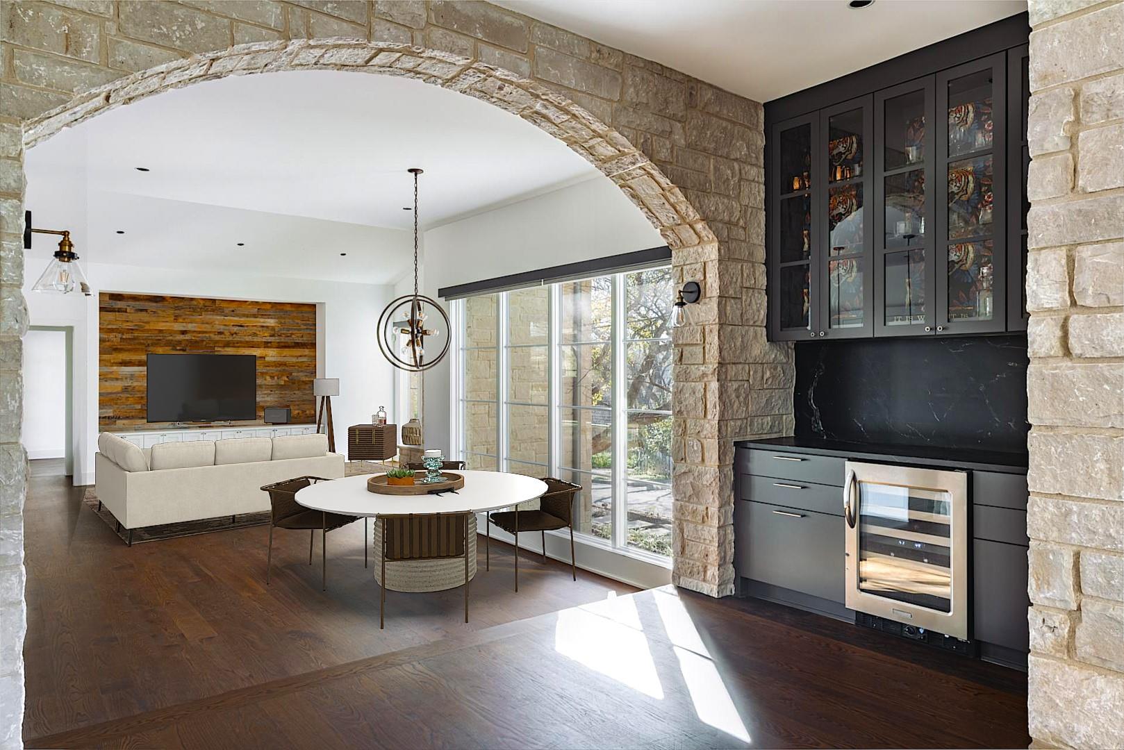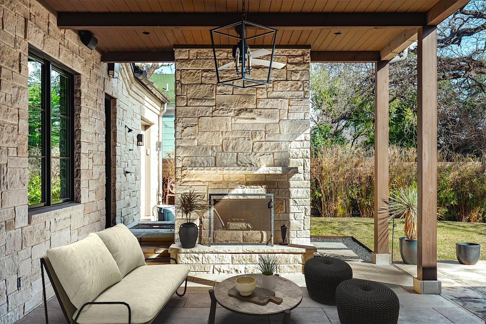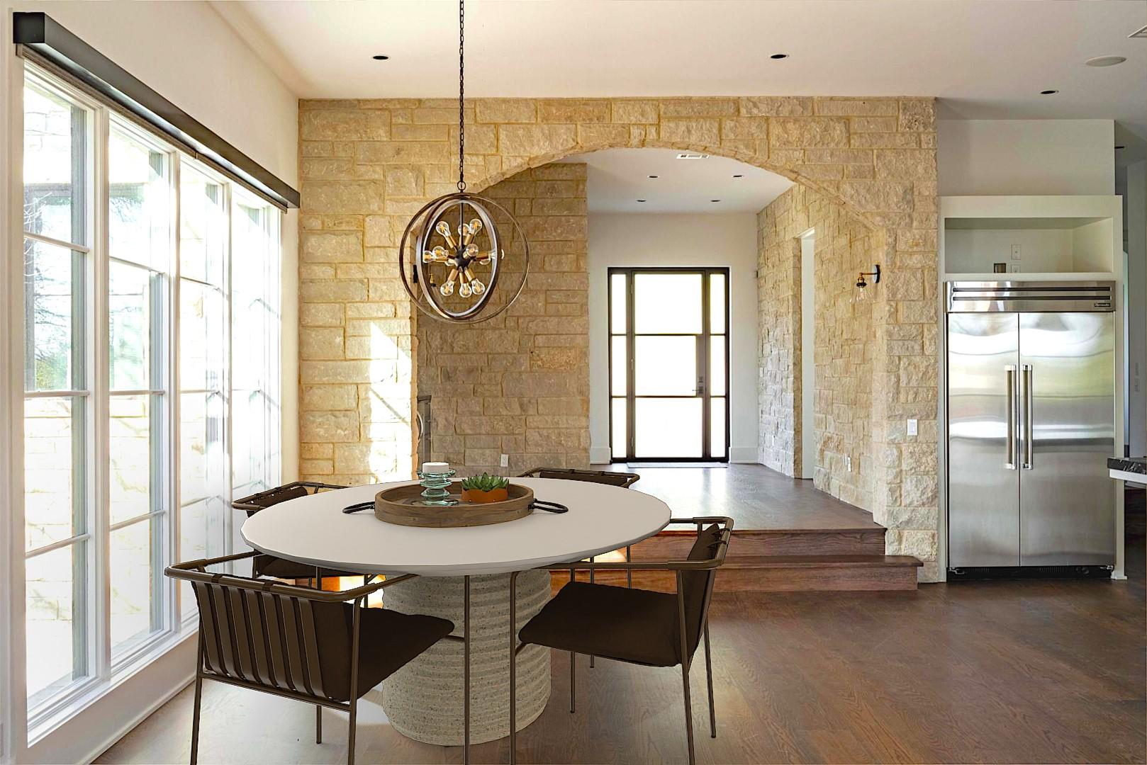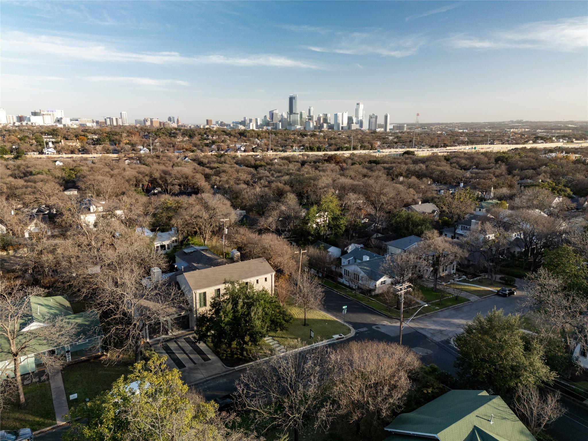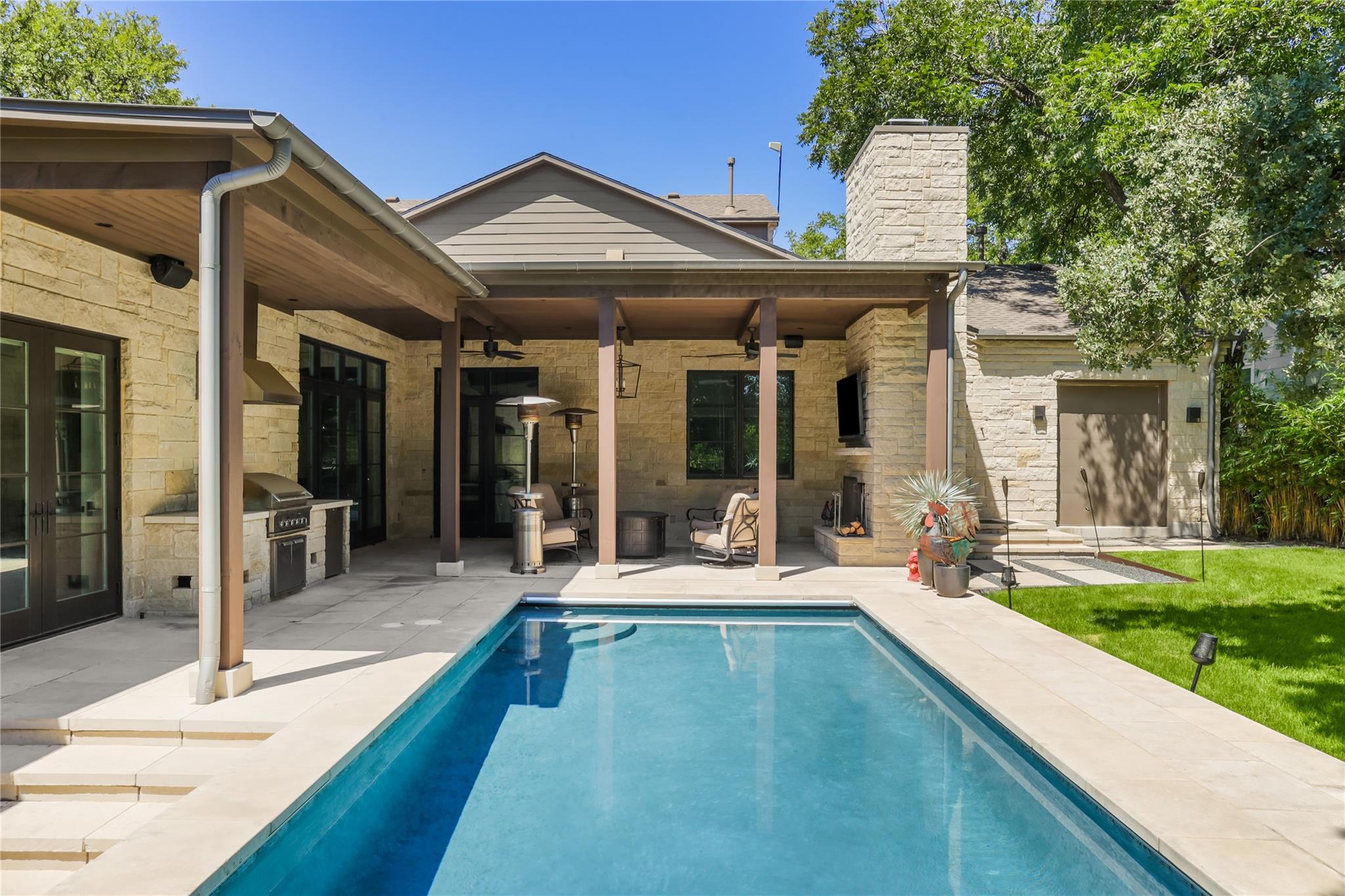 Sophisticated contemporary in ultra-convenient Tarrytown, one of Austin’s most desirable neighborhoods. This established enclave is filled with shady, walkable streets hosting beautiful homes; a quaint neighborhood shopping center is just a few blocks away as is Lions Municipal Golf Course. While the environment is quiet and serene, you can be downtown in less than 10 minutes without getting on the highway. Set on a large corner lot shaded with mature pecan and oak trees, this property enjoys a very private backyard where you will find yourself enjoying dinner on the patio, a fire on cool evenings or splashing in the pool. A large, level lawn provides plenty of space to run and play. The stone-clad home is a warm and modern with the rockwork continuing inside to add texture and depth to the rich wide-plank oak floors, limestone fireplace and fresh white walls. A cozy formal living area or executive office space at the front of the house features a hidden desk area making the space multi-functional. A convenient bar welcomes you to the main living area which is bracketed by large windows looking out over the side lawn and the covered terrace. The bright gourmet kitchen centers the living/entertaining space and allows the cook to be part of the fun while preparing. The flowing layout provides plenty of space for entertaining and encourages guests to enjoy indoor and outdoor spaces. The main-floor primary suite is set privately towards the back of the house and enjoys a sleek, skylit bath with soaking tub and large walk-through shower – two walk-in closets provide a place for everything. The main floor also features an en-suite guest room that has direct access to the back yard. Upstairs, two additional bedrooms surround a game room perfect for movie night or kid’s entertaining. Additional amenities include a second office/planning area and a large utility/laundry with sink.