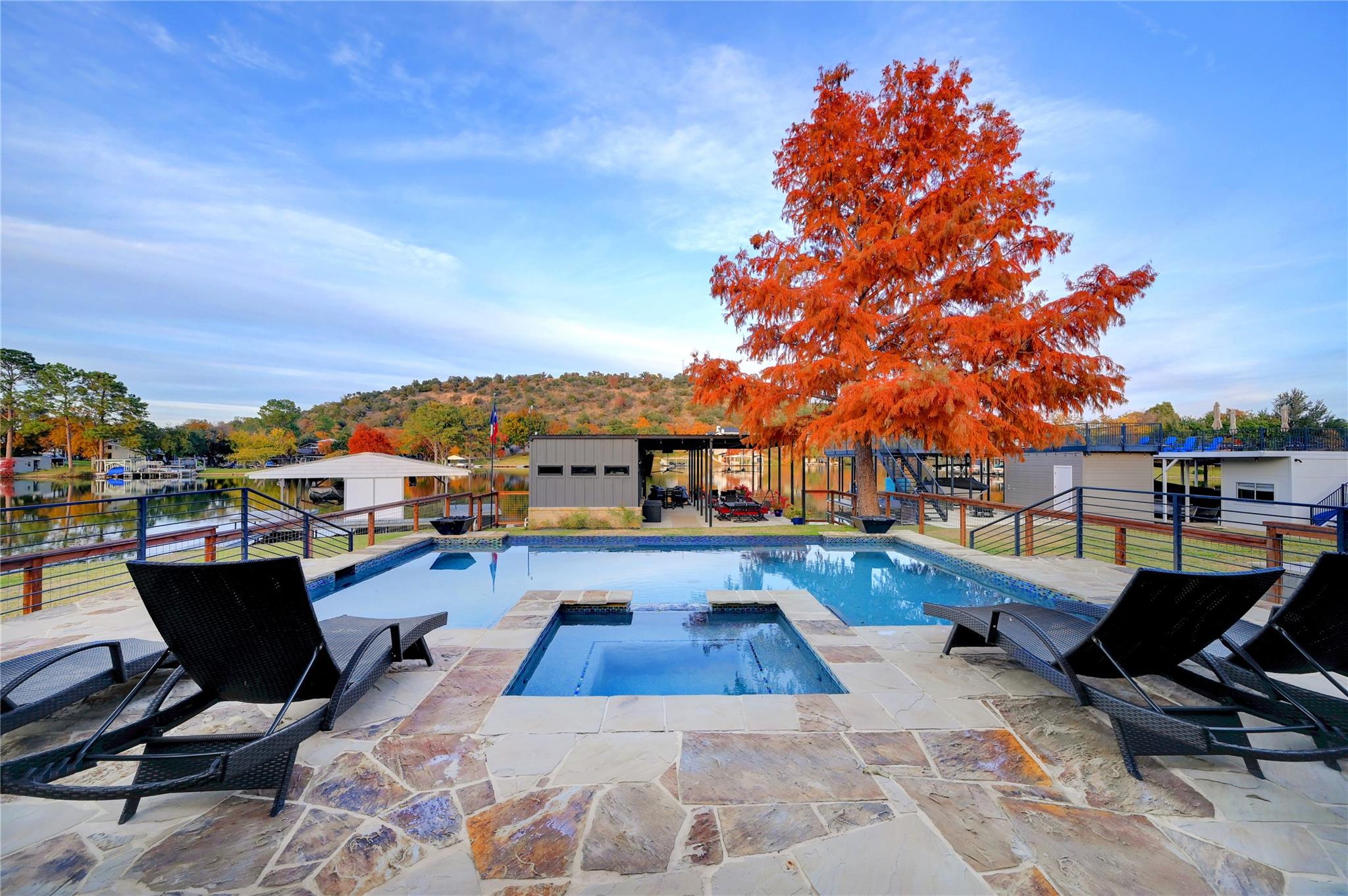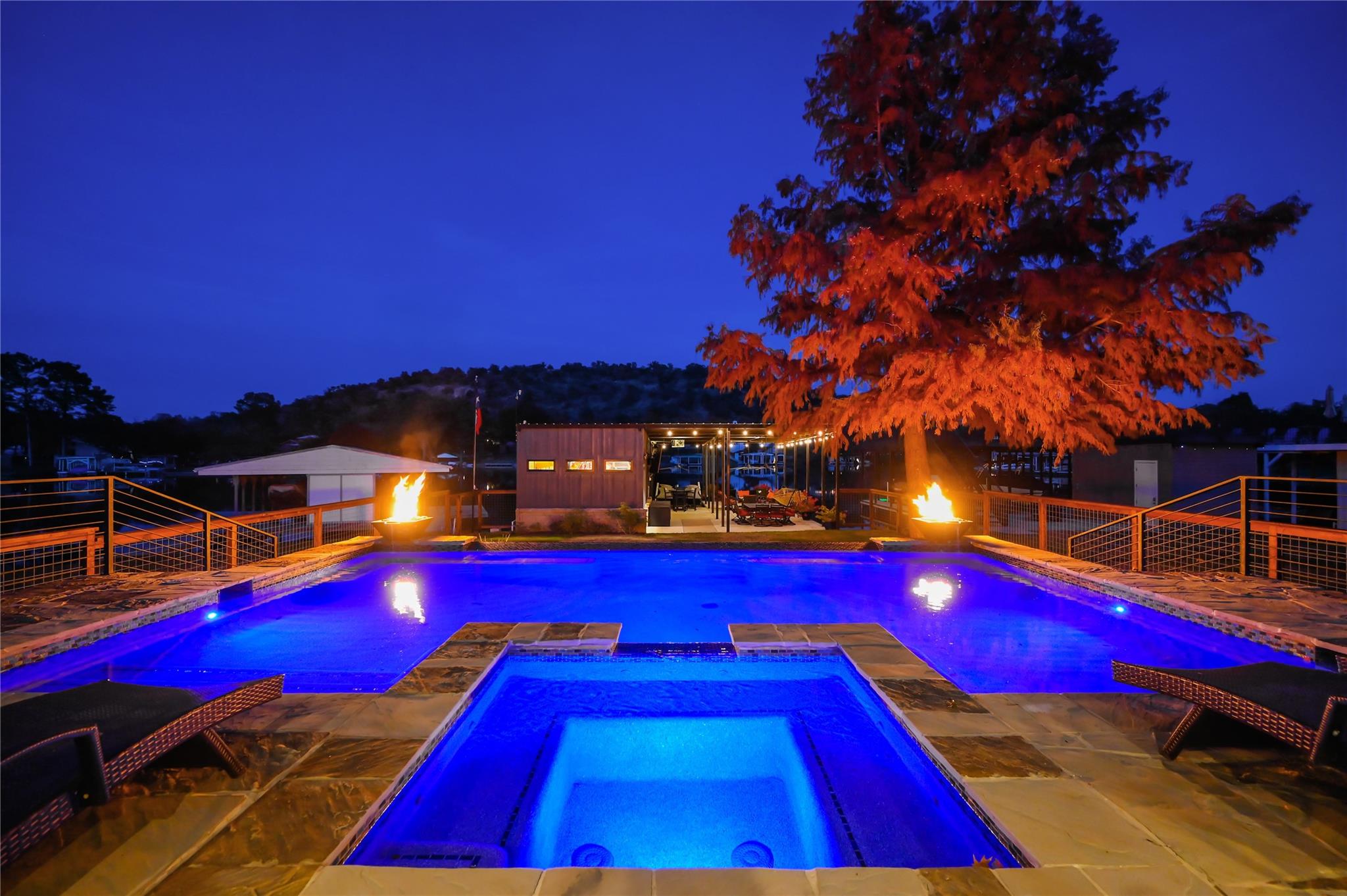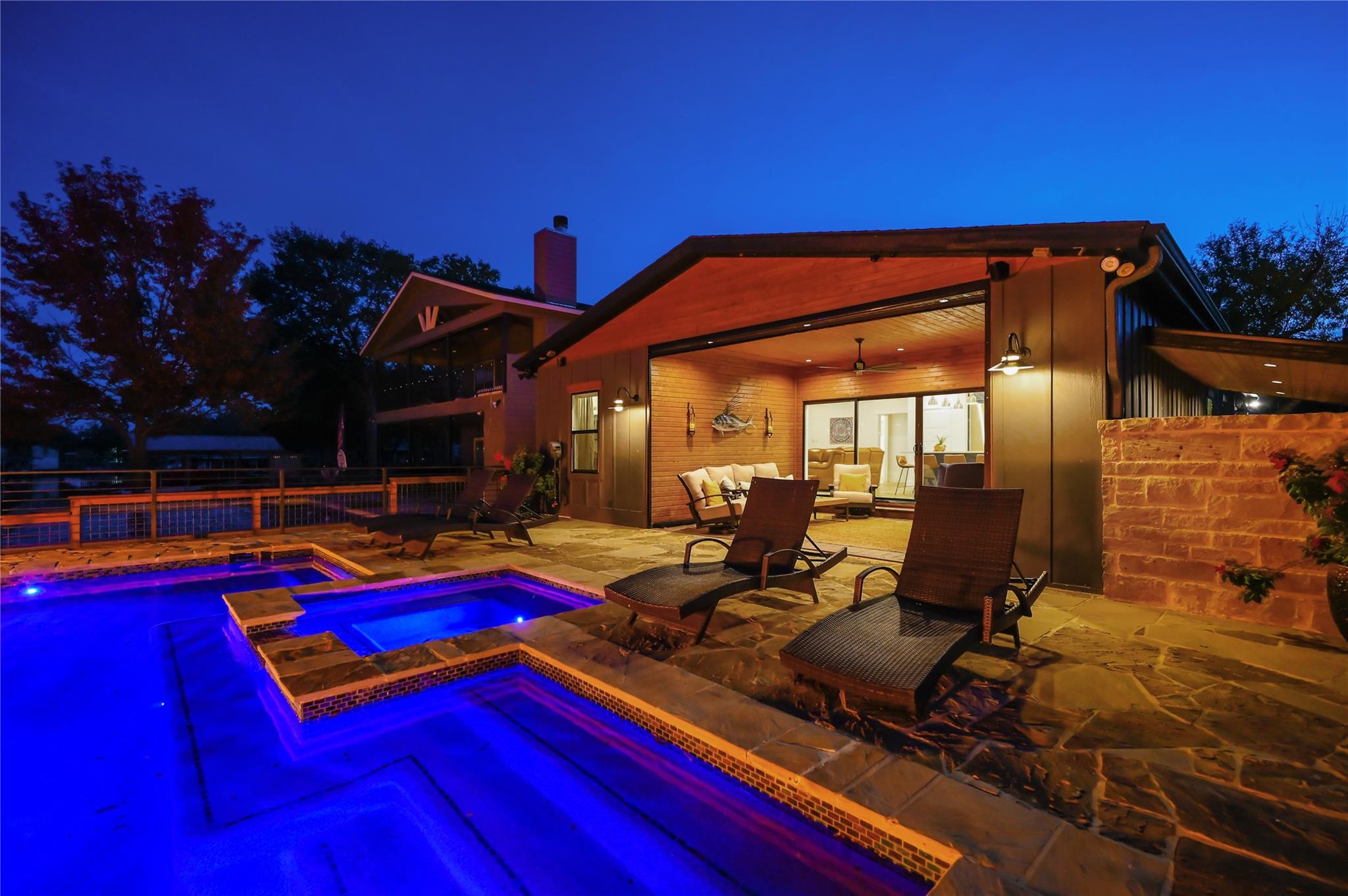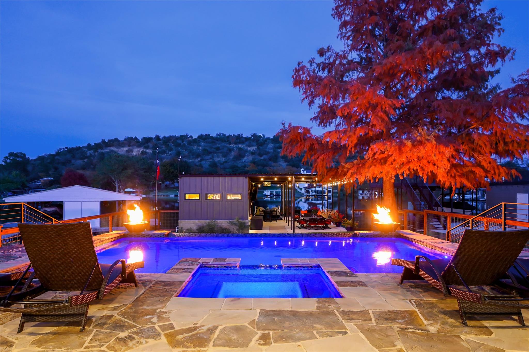 Luxurious Lakefront Getaway in Sunrise Beach! Check out this freshly remodeled 3 bedroom, 2 bath plus office which was taken down to the studs and completely rebuilt from the foundation up. All single-story, very open floor plan with up-to-date finishes including a gorgeous kitchen with gas cook top, double oven and large eat-at center island with beautiful views out to the back yard and pool. Cozy living room with fireplace plus 3 spacious bedrooms, a large office / flex space and two bathrooms including the beautiful master en-suite with double vanity and walk-in shower. Step outside to the covered back porch out to the outdoor living room with fireplace and TV overlooking the newly built swimming pool. Firepits set the tone at night and provide the perfect ambiance for lake life! Don't miss the full outdoor kitchen on the side of the home where you will enjoy grilling out with friends and family all year around. Steel-constructed boat dock with huge tack room, oversized boat slip plus potential for a second boat slip or use as-is for wave runners. Lots of outdoor seating area space on the dock as well. This east-facing lot is set back in a very desirable, large cove to protect against rough boat traffic and provide the ideal spot to fish, paddleboard and swim. This builder-owned Lake House has everything you could want or need and is move-in ready for the discerning buyer. Qualified prospects reach out to learn more or to schedule your private tour today.