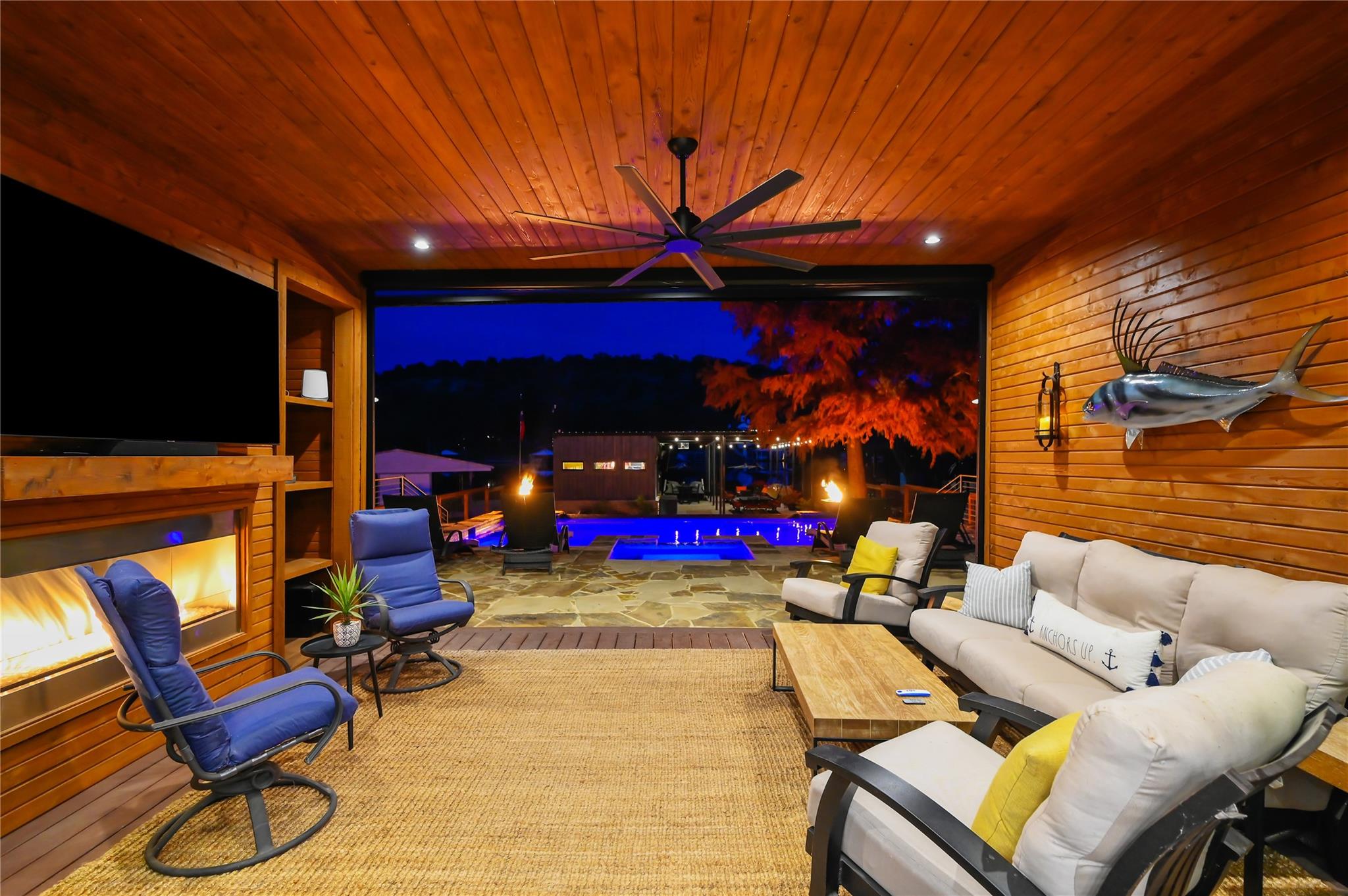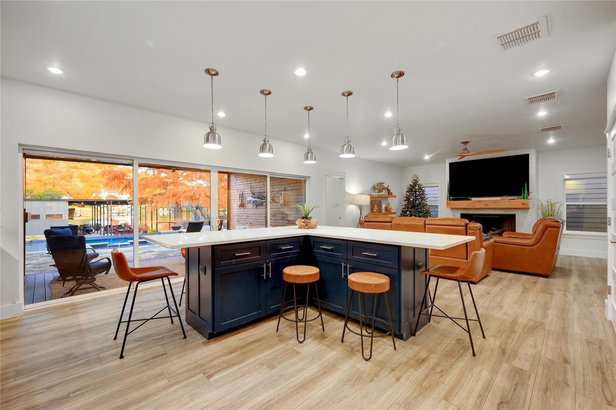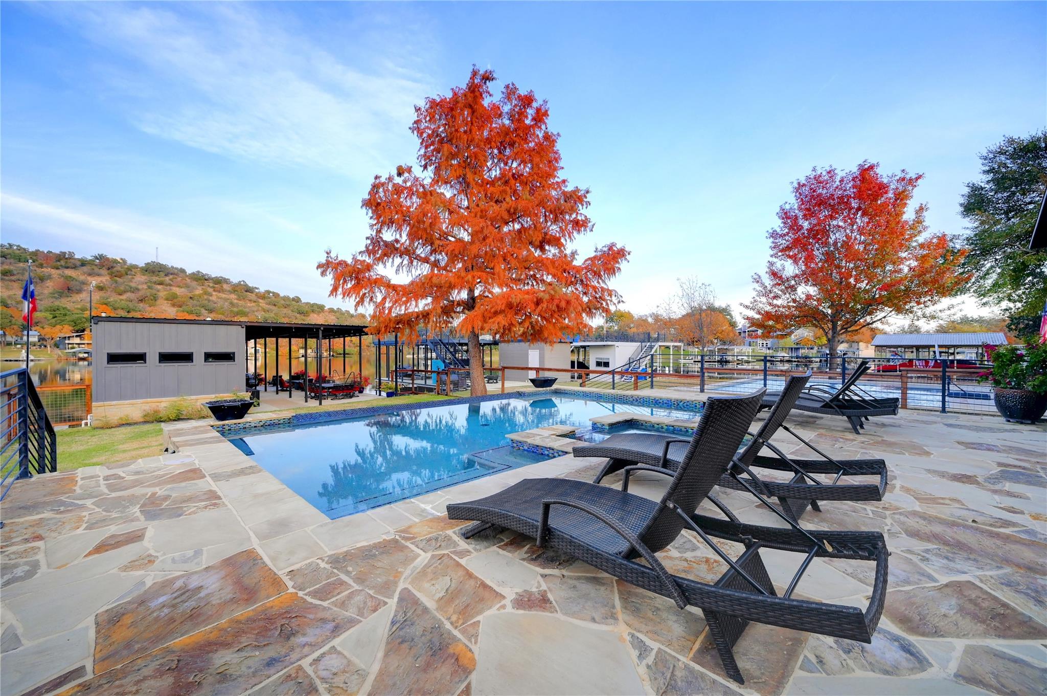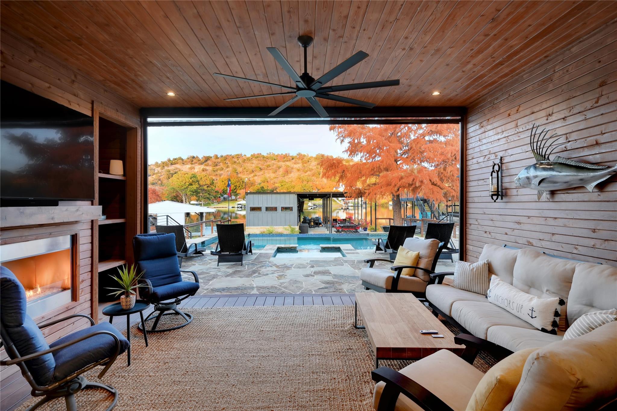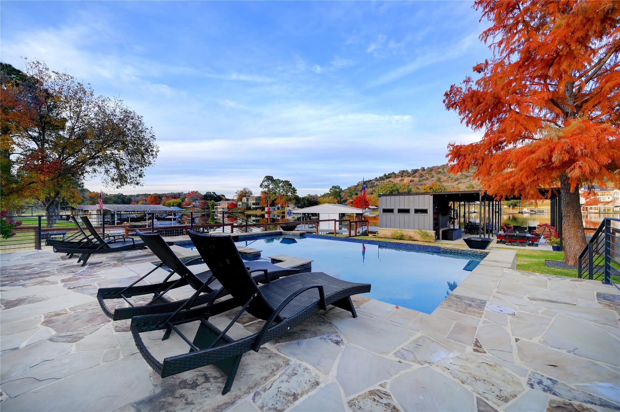 Luxurious Lakefront Getaway in Sunrise Beach! Check out this freshly remodeled 3 bedroom, 2 bath plus office which was taken down to the studs and completely rebuilt from the foundation up. All single-story, very open floor plan with up-to-date finishes including a gorgeous kitchen with gas cook top, double oven and large eat-at center island with beautiful views out to the back yard and pool. Cozy living room with fireplace plus 3 spacious bedrooms, a large office / flex space and two bathrooms including the beautiful master en-suite with double vanity and walk-in shower. Step outside to the covered back porch out to the outdoor living room with fireplace and TV overlooking the newly built swimming pool. Firepits set the tone at night and provide the perfect ambiance for lake life! Don't miss the full outdoor kitchen on the side of the home where you will enjoy grilling out with friends and family all year around. Steel-constructed boat dock with huge tack room, oversized boat slip plus potential for a second boat slip or use as-is for wave runners. Lots of outdoor seating area space on the dock as well. This east-facing lot is set back in a very desirable, large cove to protect against rough boat traffic and provide the ideal spot to fish, paddleboard and swim. This builder-owned Lake House has everything you could want or need and is move-in ready for the discerning buyer. Qualified prospects reach out to learn more or to schedule your private tour today.