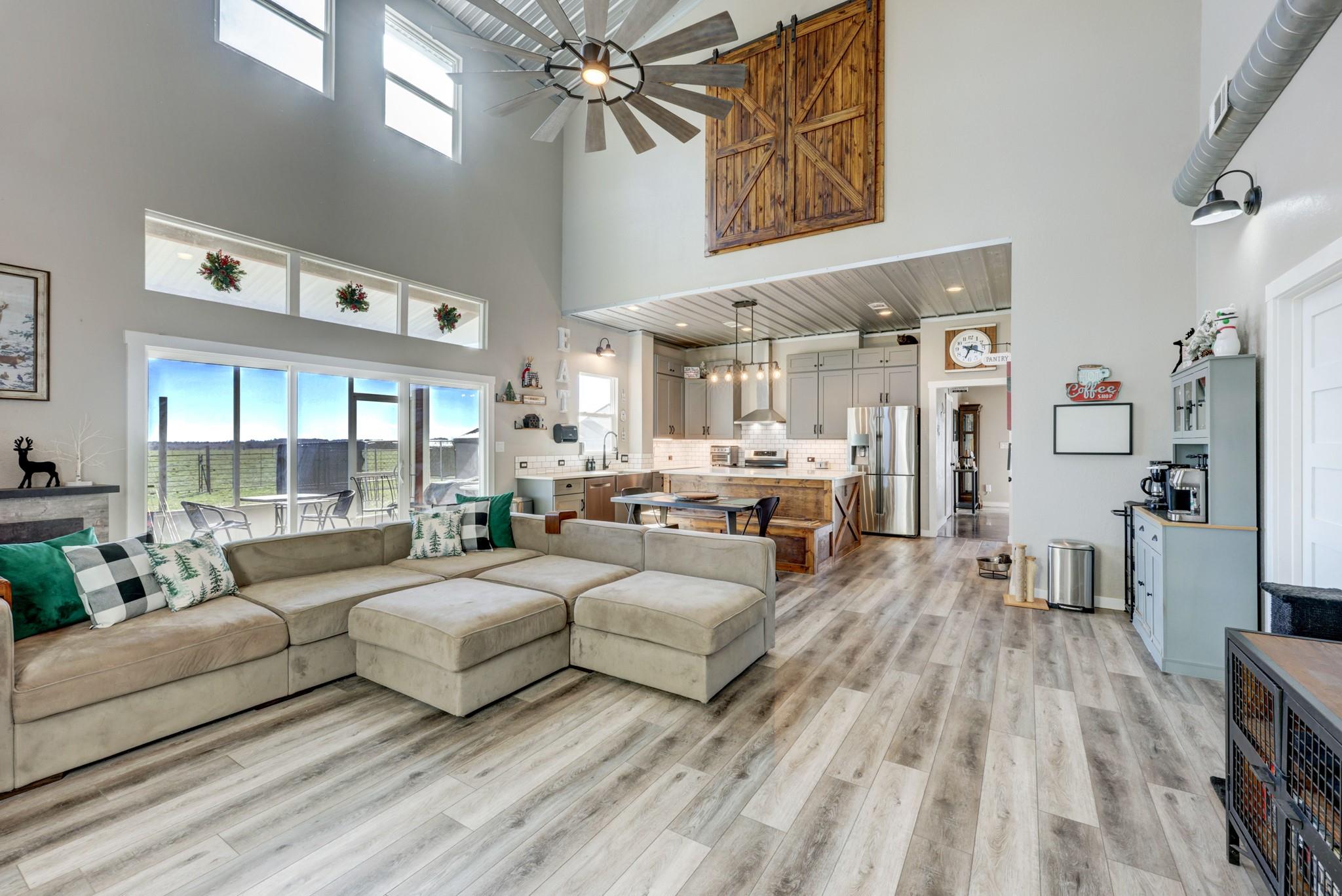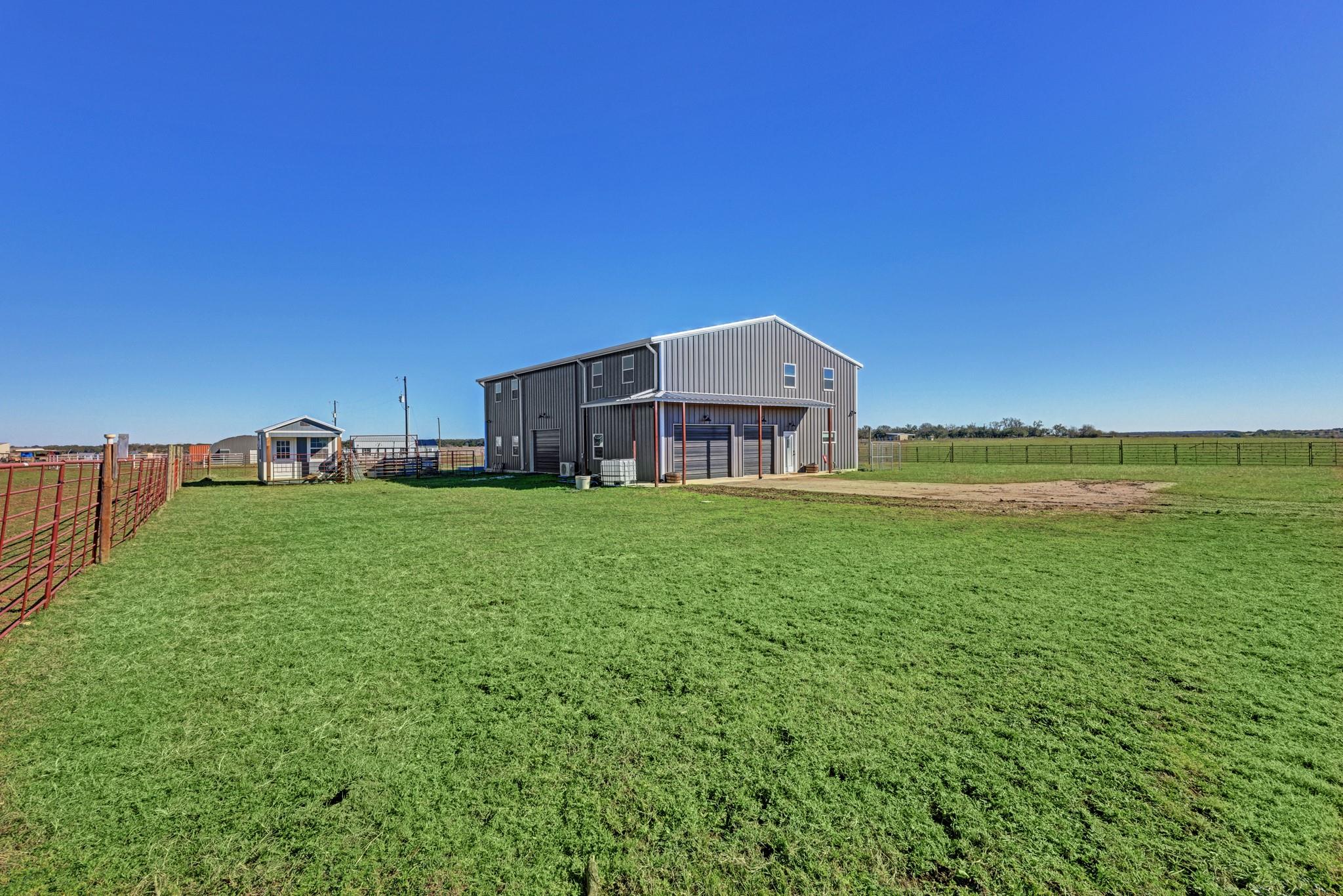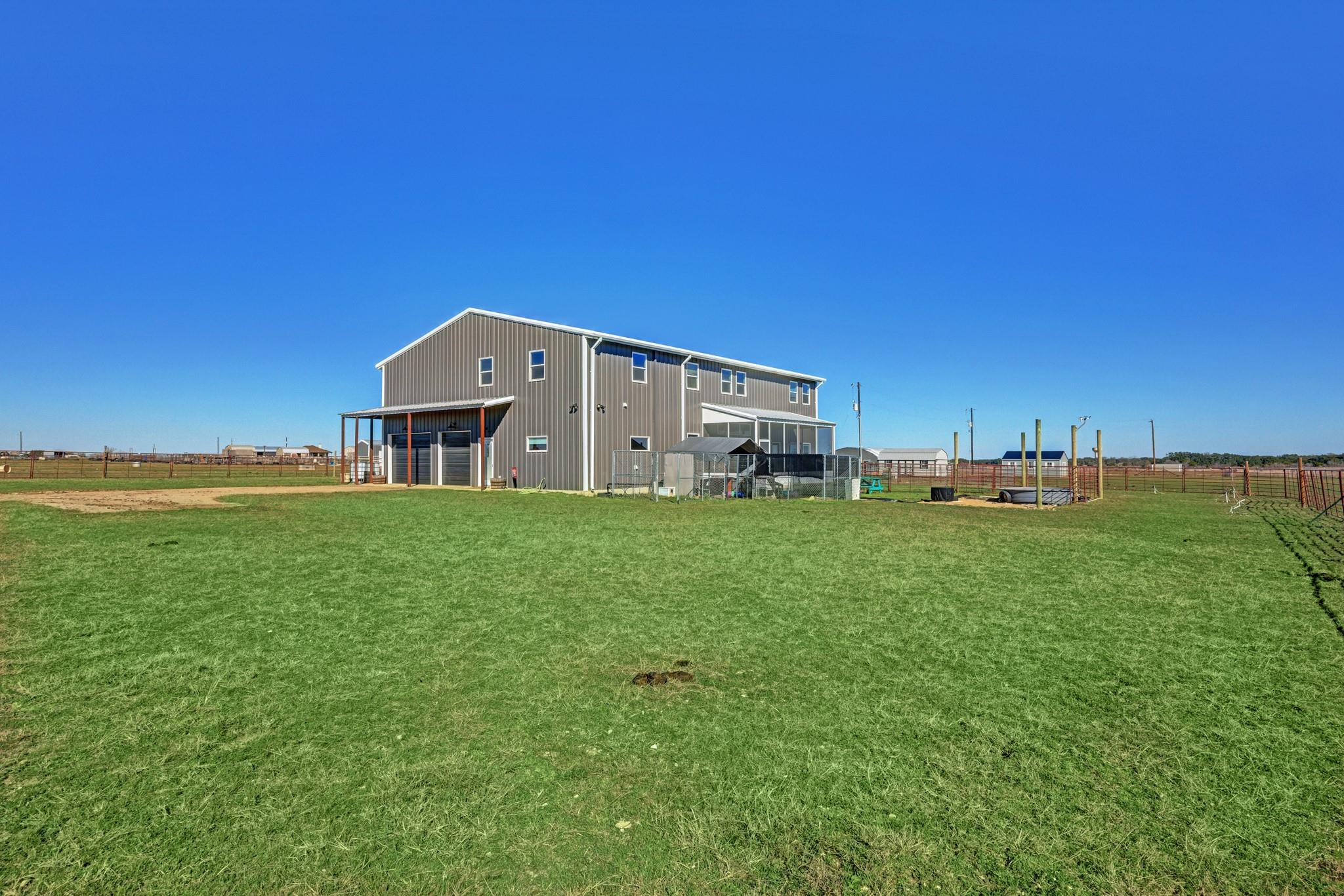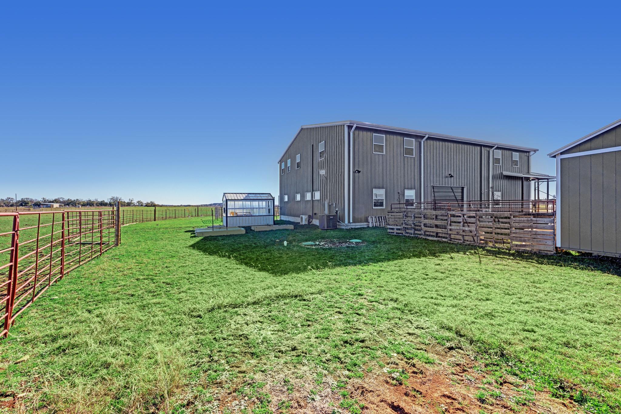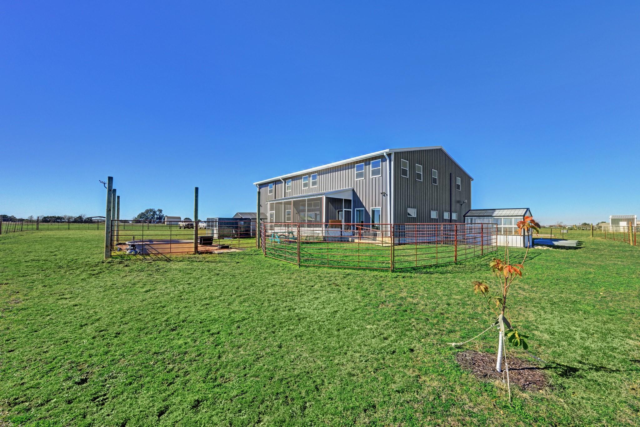 Step into this stunning ranch nestled on 54.374 acres of prime Texas land, offering unrestricted freedom. Discover a magnificent 3-bed, 3-bath, 4,692 sqft residence thoughtfully designed for both luxury & functionality. Accessible via a private gated entrance from CR 221, experience the tranquility of this secluded estate surrounded by picturesque rolling pastures. Inside, bask in the spaciousness of the open floor plan featuring vaulted ceilings & an abundance of windows, flooding the home with natural light. Convenient stained concrete & LVP flooring, ensures effortless maintenance. The chef's kitchen boasts modern stainless steel appliances, ample cabinetry, a walk-in pantry & an oversized island. Two main floor bedrooms offer privacy with ensuite bathrooms and walk-in closets, while the owner's suite doubles as a storm shelter. Upstairs, a partially finished area presents versatile possibilities, from extra bedrooms to a media room or homeschool space, and a rough-plumbed bath. Indulge in bug-free outdoor relaxation on the screened porch. The property features a commercial greenhouse, a starter greenhouse & a 40’x8’x9’ high cube, Conex container for all your agricultural needs. A deep well with a 2,500-gallon tank housed in an insulated well house ensures ample water supply, with electricity available to the home, greenhouse & animal pens. For remote work, a private 10’x12’ insulated external office equipped with electric & networking awaits. Bring your beloved animals to this expansive fenced property, which offers two run-in barns, three enclosed farm animal homes, & multiple spacious penned areas. Your furry friends will appreciate a climate-controlled 12’x24’ doghouse with private yards. Additional amenities include a 16’x24’ feed barn, storage shed & breathtaking panoramic views, creating a sense of serene seclusion while remaining conveniently accessible to nearby towns & cities. Welcome home to unparalleled comfort and natural beauty.