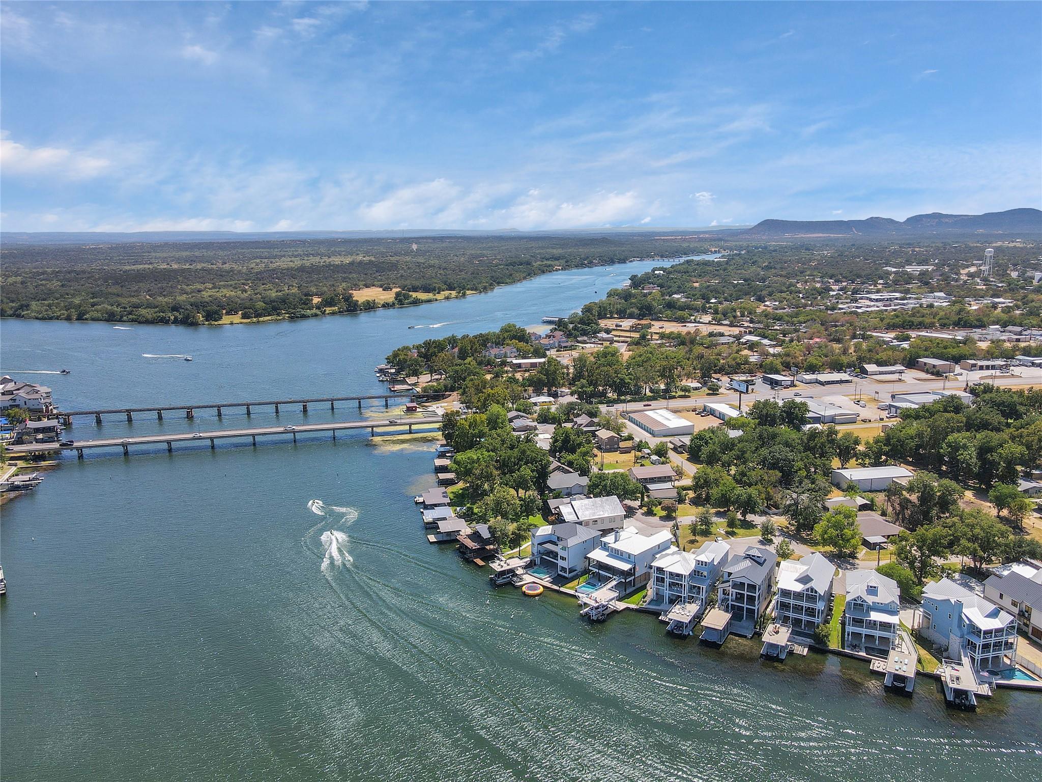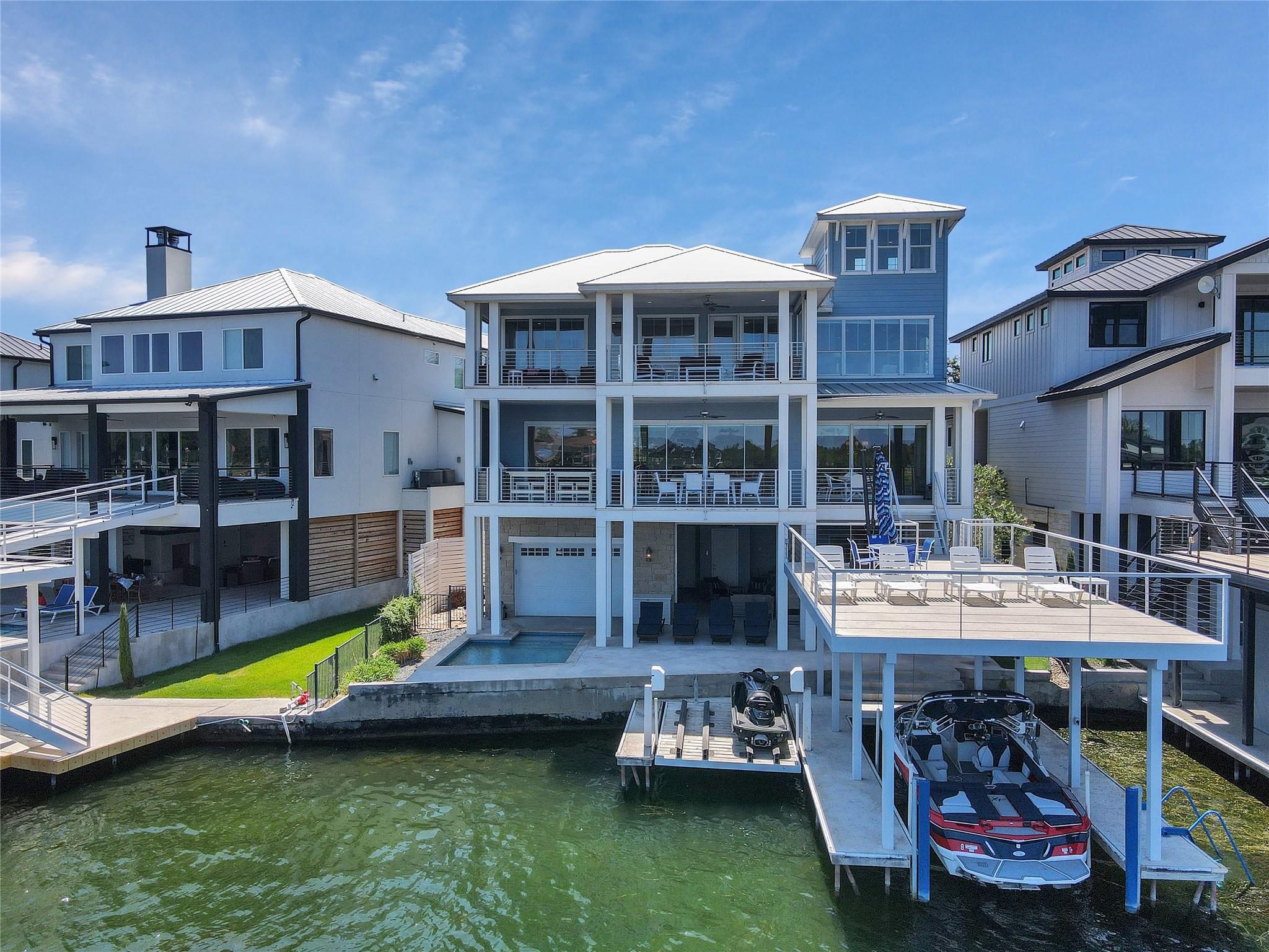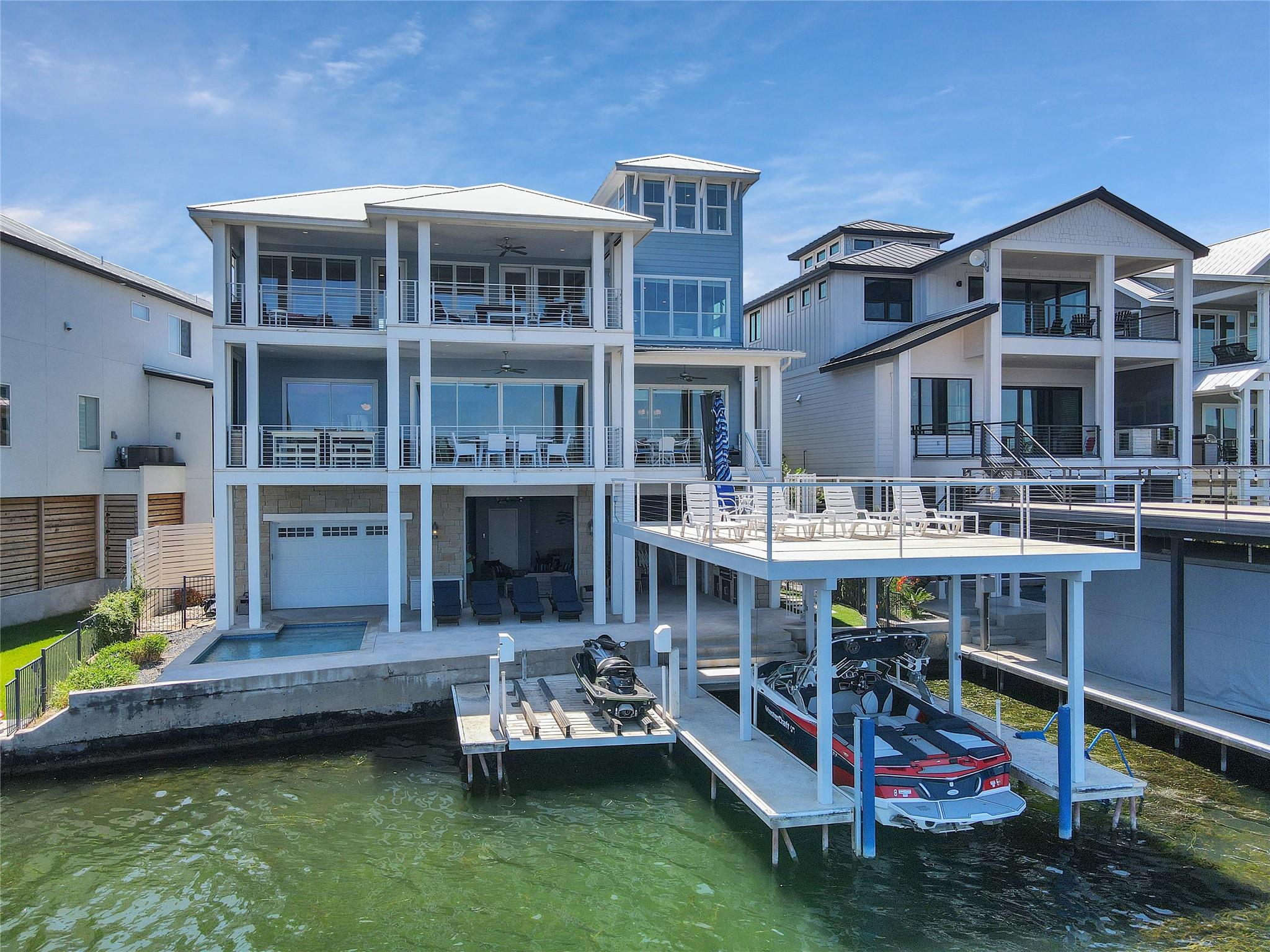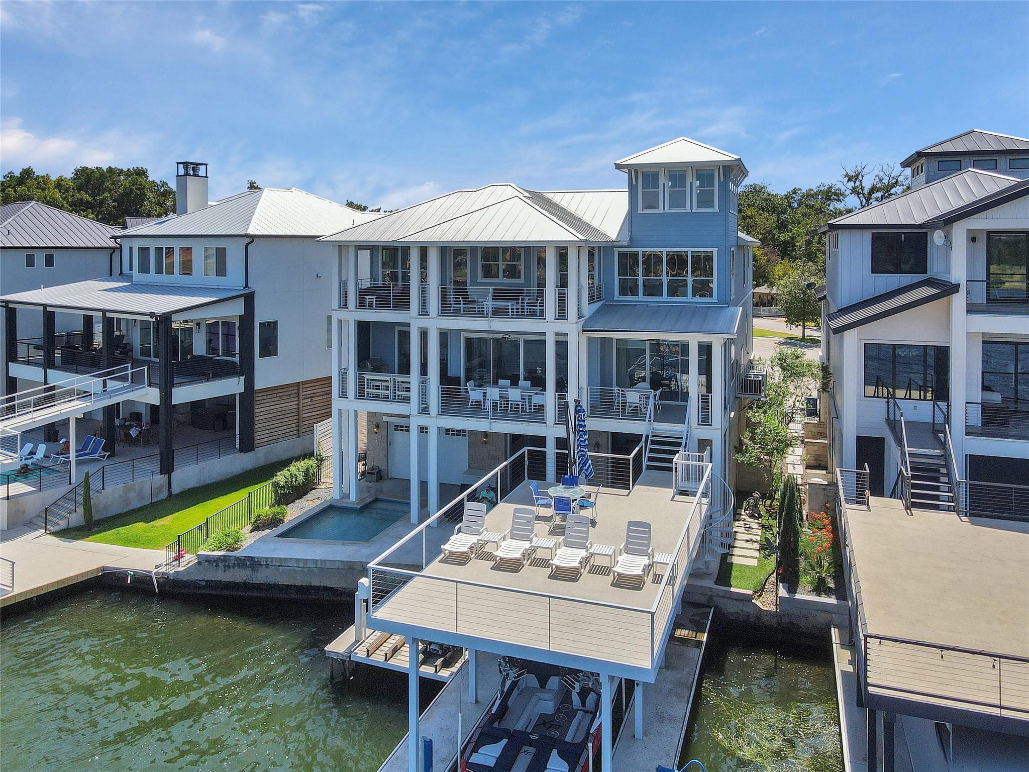 Welcome to your dream home on Lake LBJ, where luxury meets tranquility. This stunning waterfront property boasts breathtaking panoramic views of the serene lake and offers an unparalleled lifestyle of entertainment, relaxation and recreation. Nestled on a zero-scaped lot, this meticulously crafted residence features four bedrooms, including 2 lavish master suites each with an en-suite bathroom and access to outdoor patios. With three full bathrooms and two half bathrooms, every detail of comfort and convenience has been thoughtfully considered. Step outside onto the expansive outdoor oasis, where a sparkling pool and a covered fully screened outdoor entertainment area awaits, inviting you to cool off on hot summer days or unwind under the Texas sun on the top deck of the boat dock. Entertain guests on one of the many sprawling patio areas this home offers, complete with 2 built-in grills and ample seating throughout, perfect for hosting unforgettable gatherings with loved ones. Enjoy seamless indoor-outdoor living with multiple access points from the living spaces to the outdoor areas, creating a seamless flow for relaxation and entertainment. Whether you're savoring morning coffee as the sun rises over the lake or gathering around the fire pit on cool evenings, this home offers an idyllic setting for every occasion. Located in a coveted lakeside community, residents enjoy access to a wealth of amenities, including boating, fishing, and water sports right from their own backyard. With its prime location and luxurious features, this Lake LBJ retreat offers a rare opportunity to experience the ultimate in waterfront living. Don't miss your chance to make this extraordinary property your own slice of paradise.