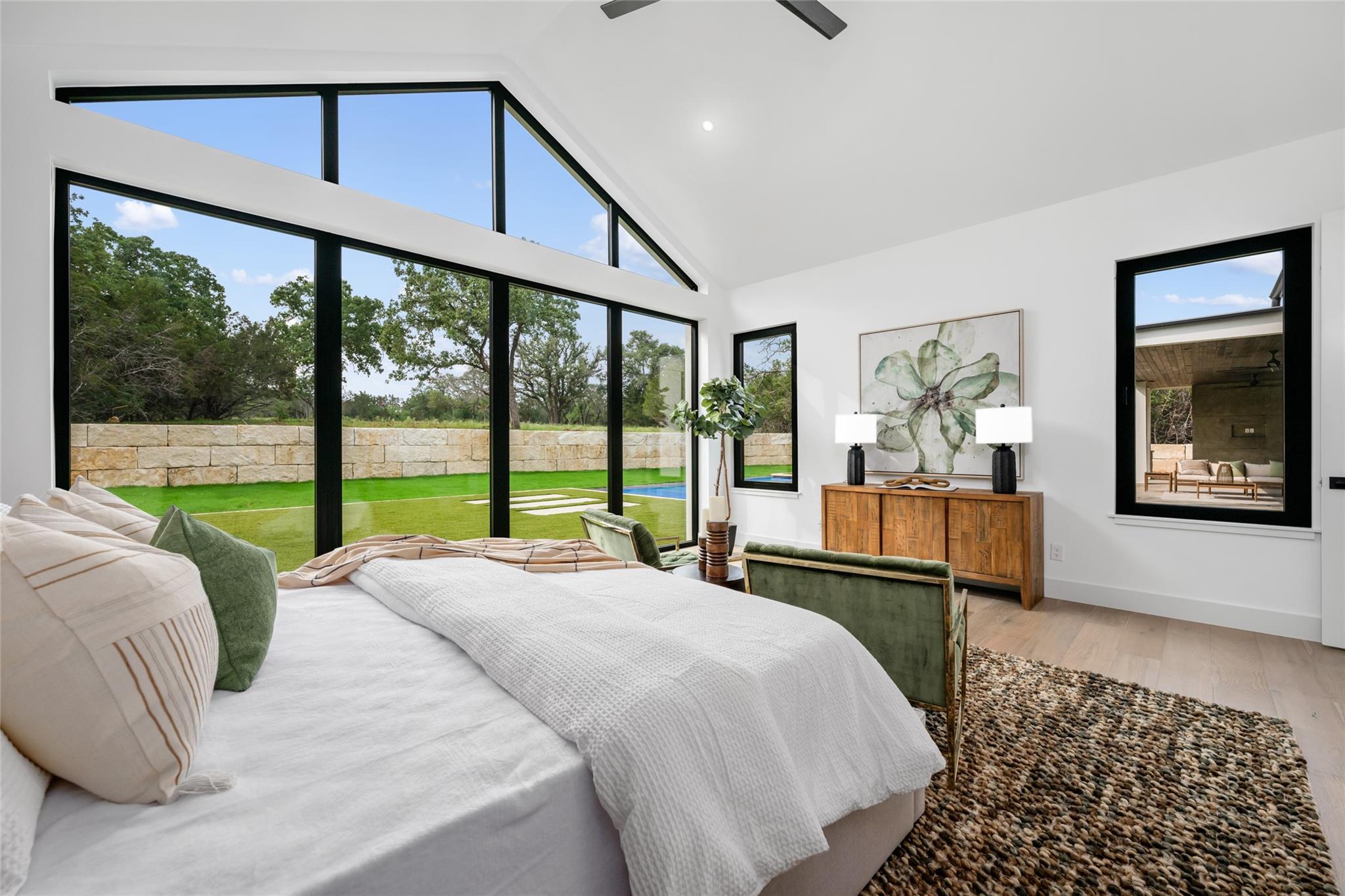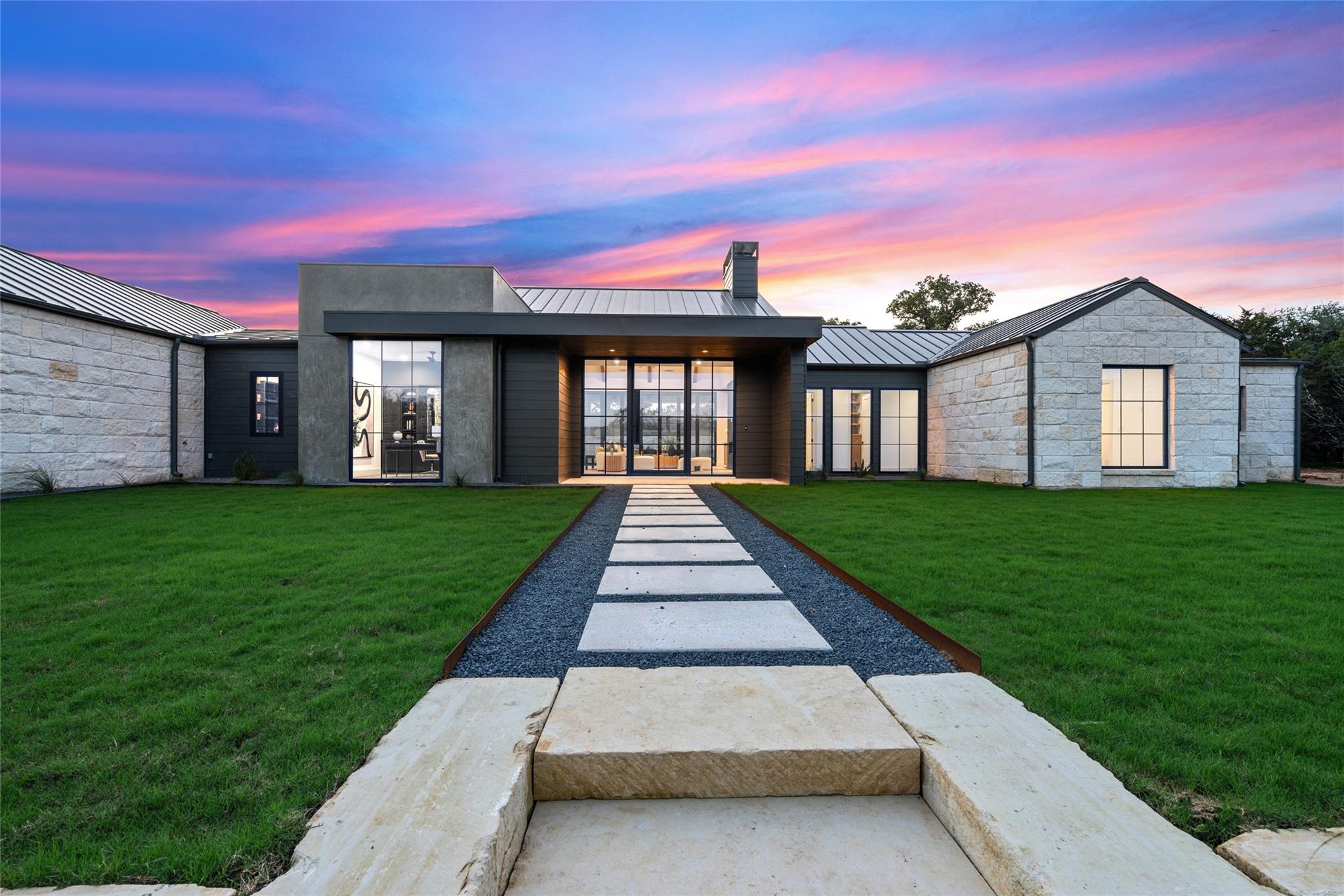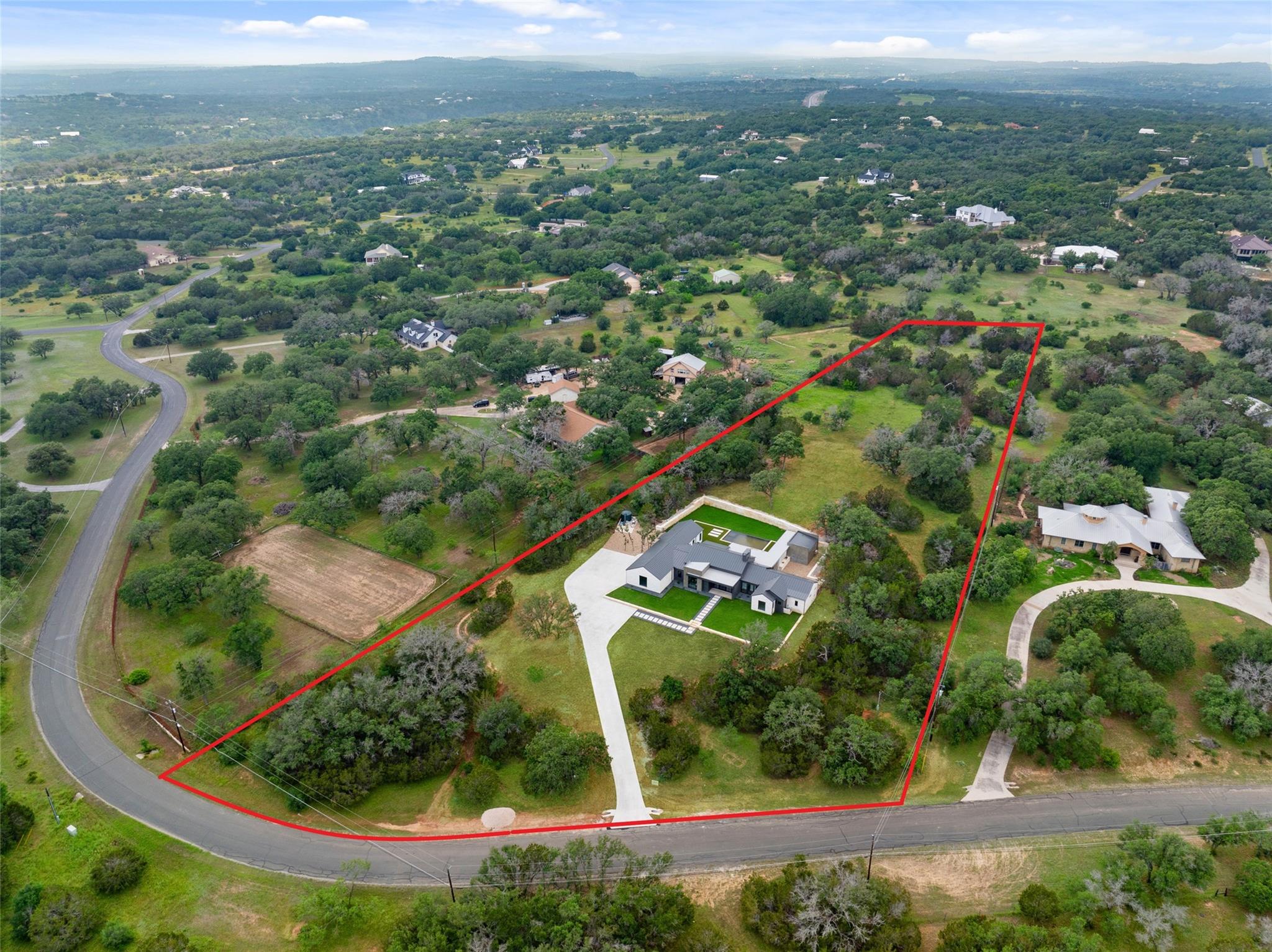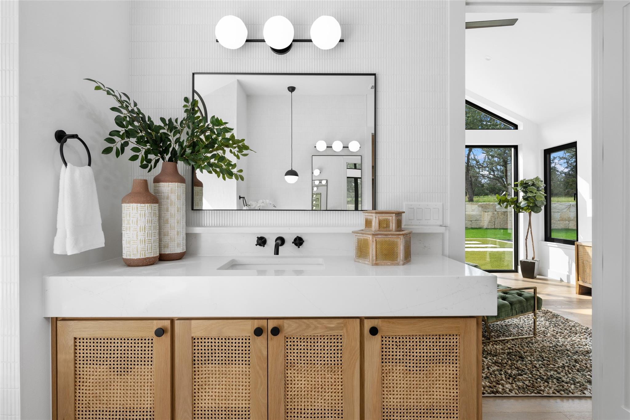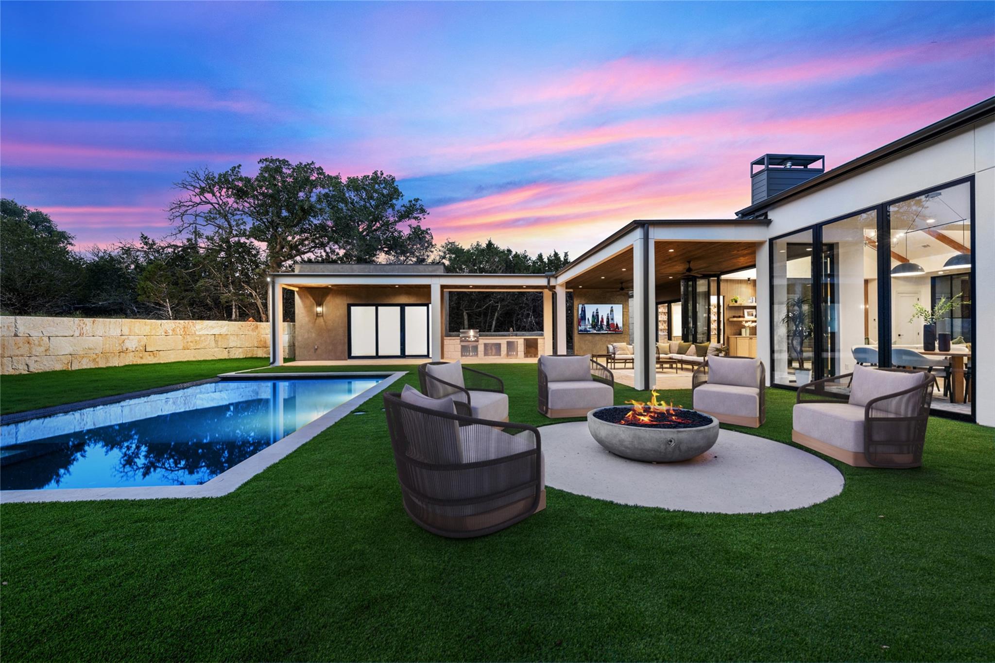 Experience the pinnacle of luxury living in this newly built, exquisite single-story residence nestled within the prestigious gated estate community of Paleface Ranch in Spicewood, Texas. Spanning an impressive 3,900 square feet on a sprawling five-acre lot, this architectural masterpiece designed by Kelley Design Group, built by Riverbend Homes, and perfected by Saltbox Studio offers an unparalleled blend of sophistication and tranquility. Inside, discover French white oak floors and cathedral ceilings that create a bright, expansive ambiance. The interior showcases exquisite taste, featuring a striking linear burner fireplace with a Venetian plaster set against an oak board and batten wall. The kitchen boasts leather-finish black quartzite atop shaker-style crafted cabinets and is equipped with high-end Thermador appliances, ensuring culinary excellence. The main house offers four generously sized bedrooms that offer serene views and are complemented by 4.5 luxurious bathrooms. The detached casita with a bedroom and full bathroom provides perfect guest accommodations. A vibrant private office with a walk-in safe off the main foyer offers the perfect workspace. A thoughtfully placed playroom off the great room caters to family needs, while a wall of collapsible glass doors in the great room opens to an outdoor living area, merging indoor elegance with outdoor relaxation. This area includes a pristine swimming pool and meticulously maintained artificial turf grounds, minimizing maintenance and water usage. Located in the Lake Travis School District and equipped with energy-efficient technologies like spray foam insulation, this property ensures comfort, efficiency, and educational excellence. Just moments from Lake Travis, it offers peace without sacrificing access to urban conveniences. This home is not just a residence—it’s a retreat designed for those who appreciate beauty, privacy, and a connection to nature.