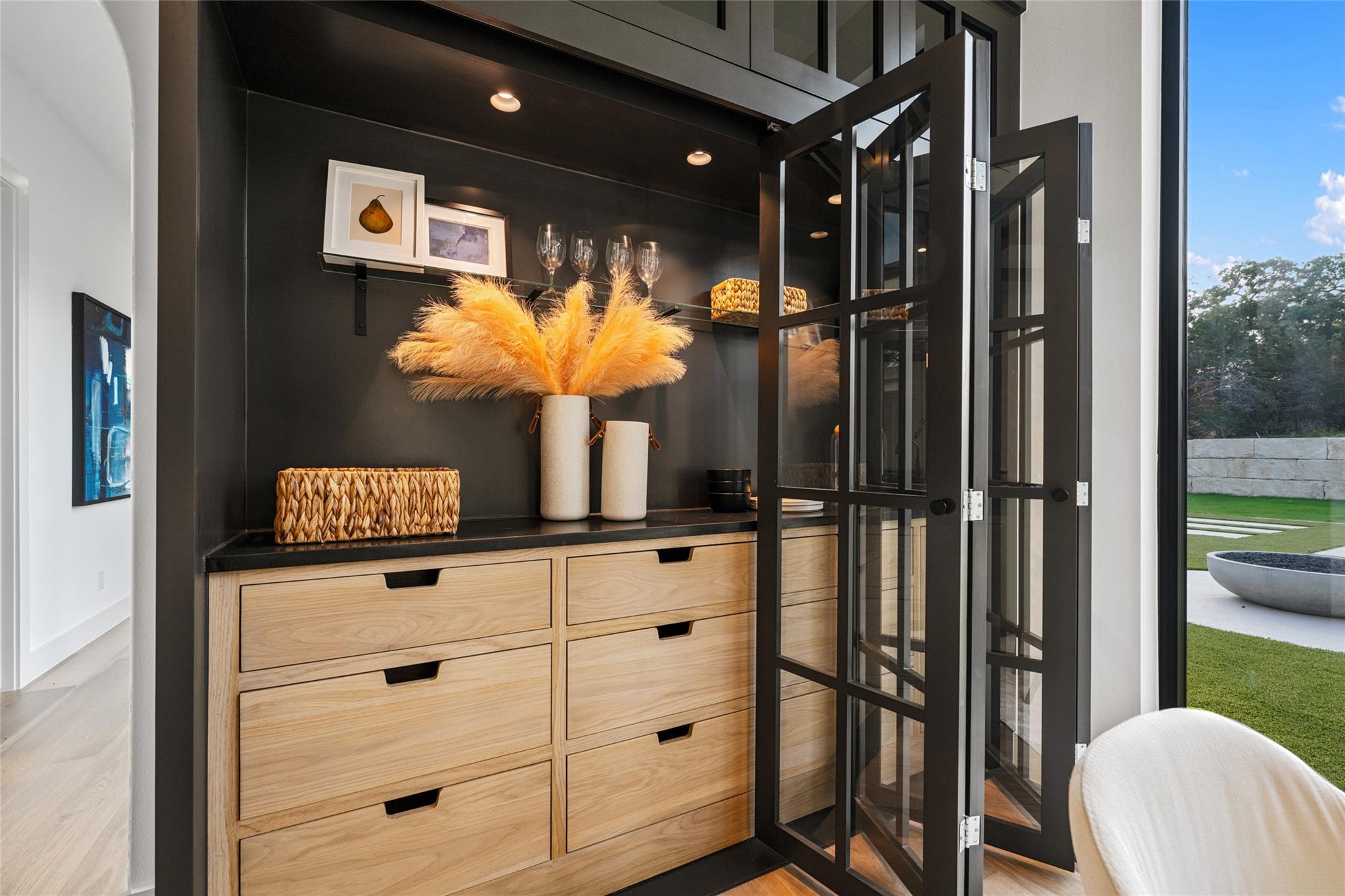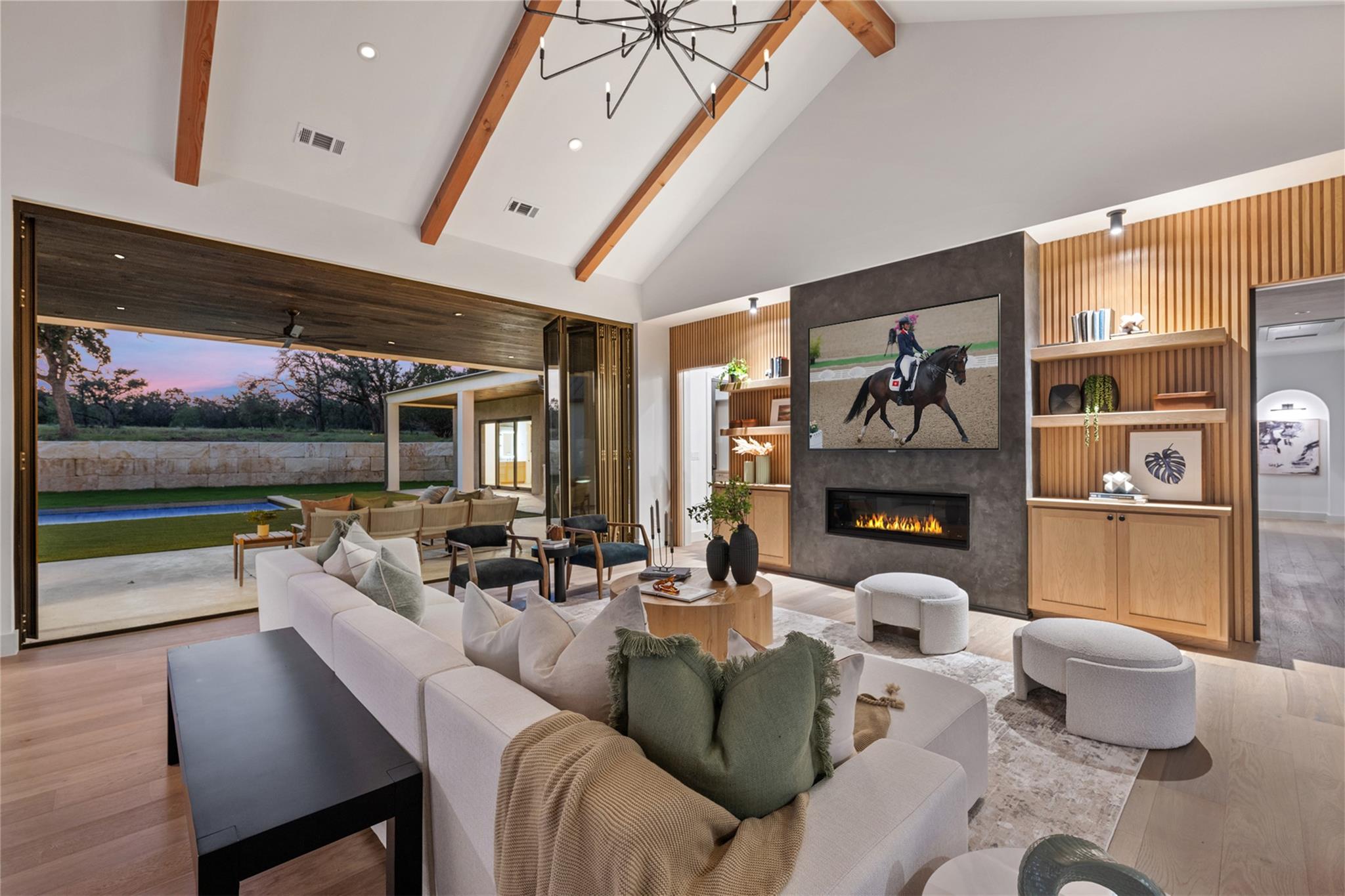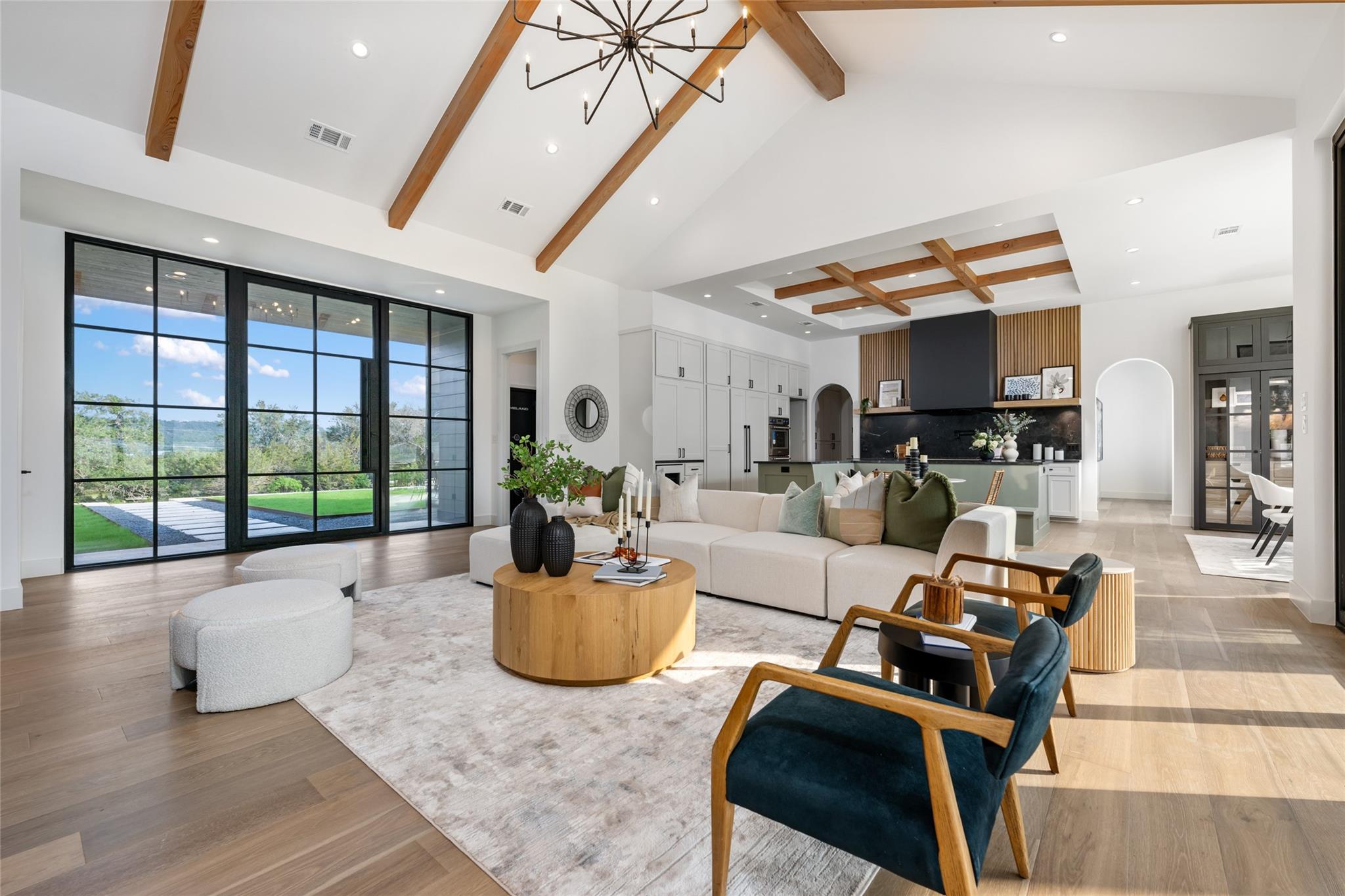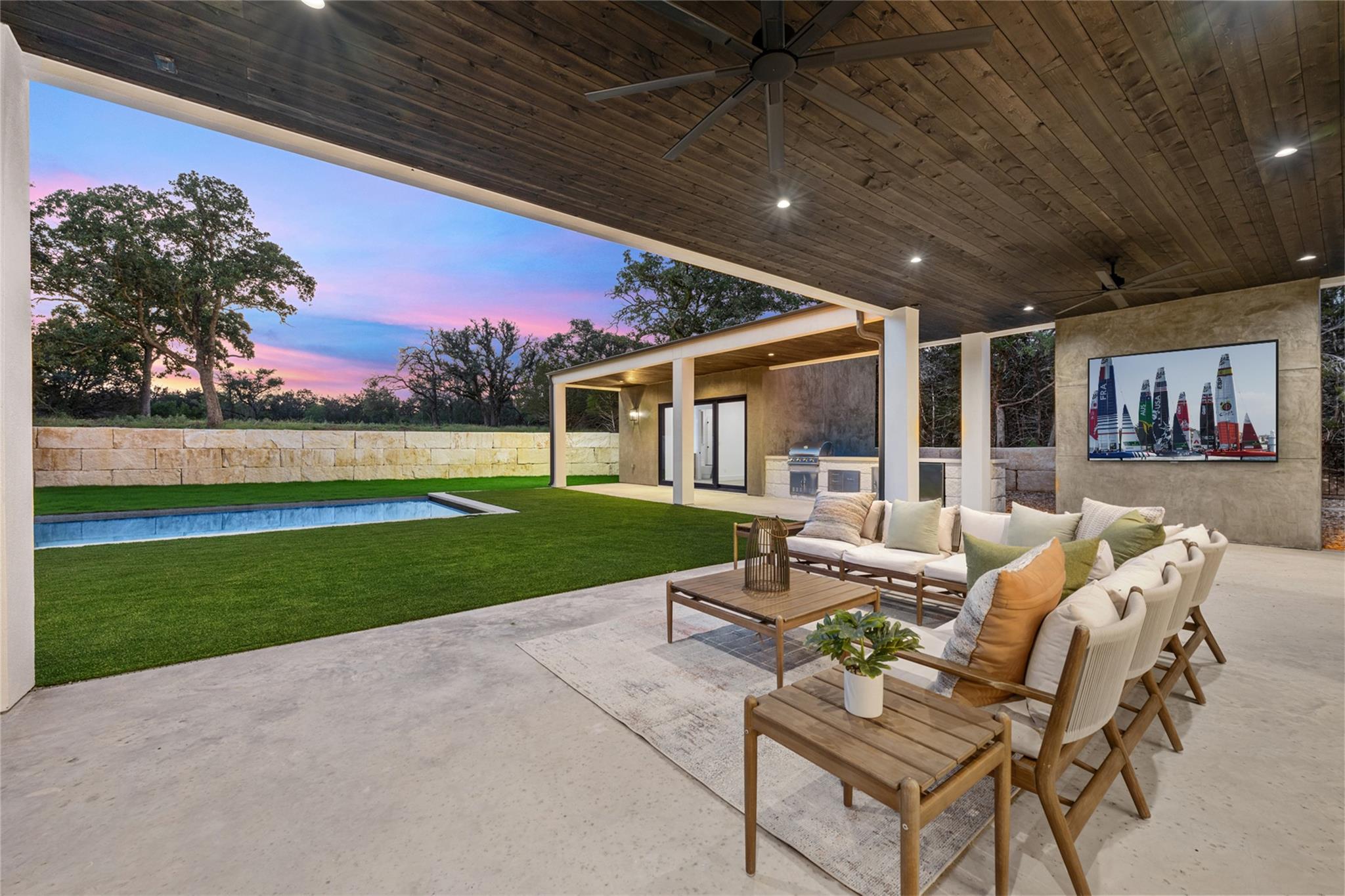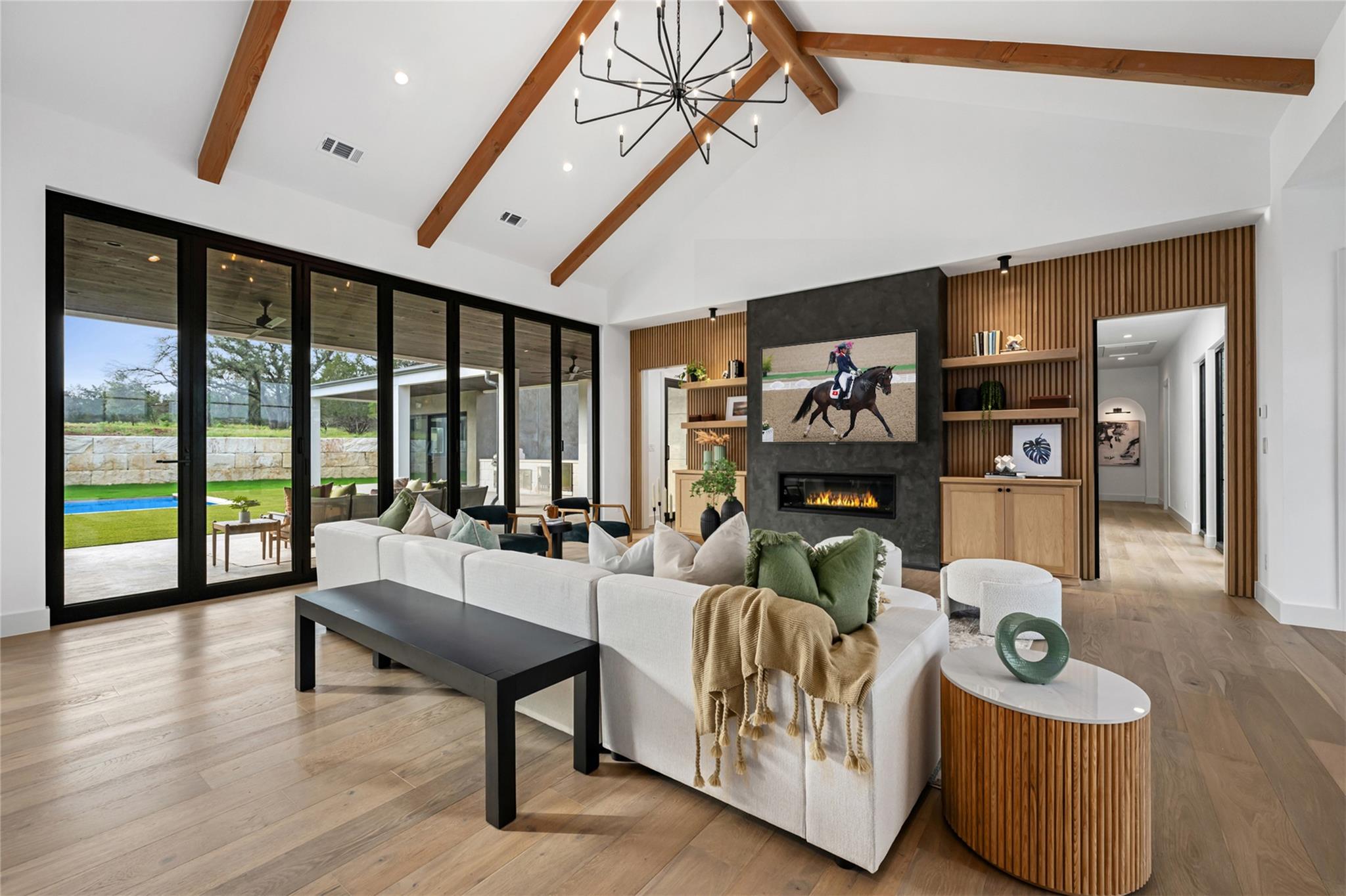 Experience the pinnacle of luxury living in this newly built, exquisite single-story residence nestled within the prestigious gated estate community of Paleface Ranch in Spicewood, Texas. Spanning an impressive 3,900 square feet on a sprawling five-acre lot, this architectural masterpiece designed by Kelley Design Group, built by Riverbend Homes, and perfected by Saltbox Studio offers an unparalleled blend of sophistication and tranquility. Inside, discover French white oak floors and cathedral ceilings that create a bright, expansive ambiance. The interior showcases exquisite taste, featuring a striking linear burner fireplace with a Venetian plaster set against an oak board and batten wall. The kitchen boasts leather-finish black quartzite atop shaker-style crafted cabinets and is equipped with high-end Thermador appliances, ensuring culinary excellence. The main house offers four generously sized bedrooms that offer serene views and are complemented by 4.5 luxurious bathrooms. The detached casita with a bedroom and full bathroom provides perfect guest accommodations. A vibrant private office with a walk-in safe off the main foyer offers the perfect workspace. A thoughtfully placed playroom off the great room caters to family needs, while a wall of collapsible glass doors in the great room opens to an outdoor living area, merging indoor elegance with outdoor relaxation. This area includes a pristine swimming pool and meticulously maintained artificial turf grounds, minimizing maintenance and water usage. Located in the Lake Travis School District and equipped with energy-efficient technologies like spray foam insulation, this property ensures comfort, efficiency, and educational excellence. Just moments from Lake Travis, it offers peace without sacrificing access to urban conveniences. This home is not just a residence—it’s a retreat designed for those who appreciate beauty, privacy, and a connection to nature.