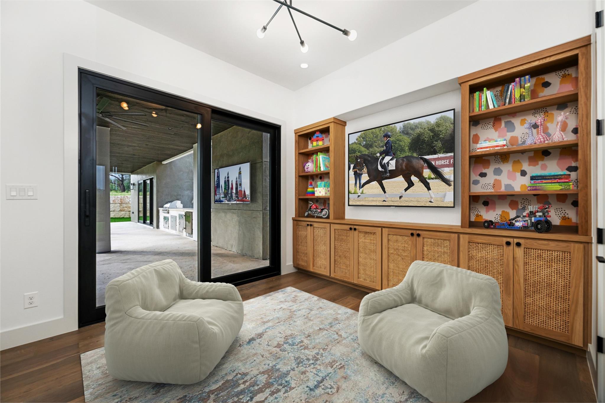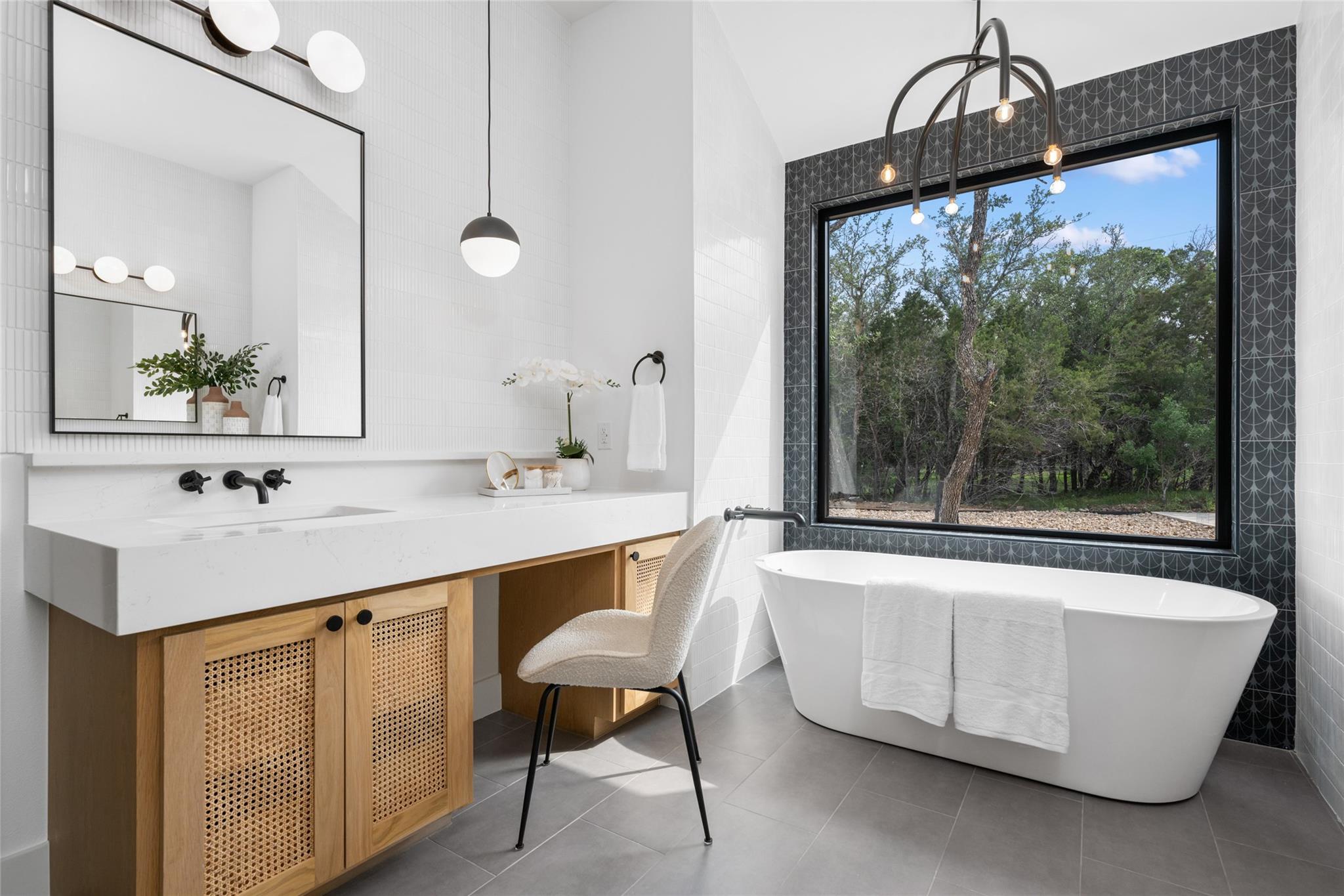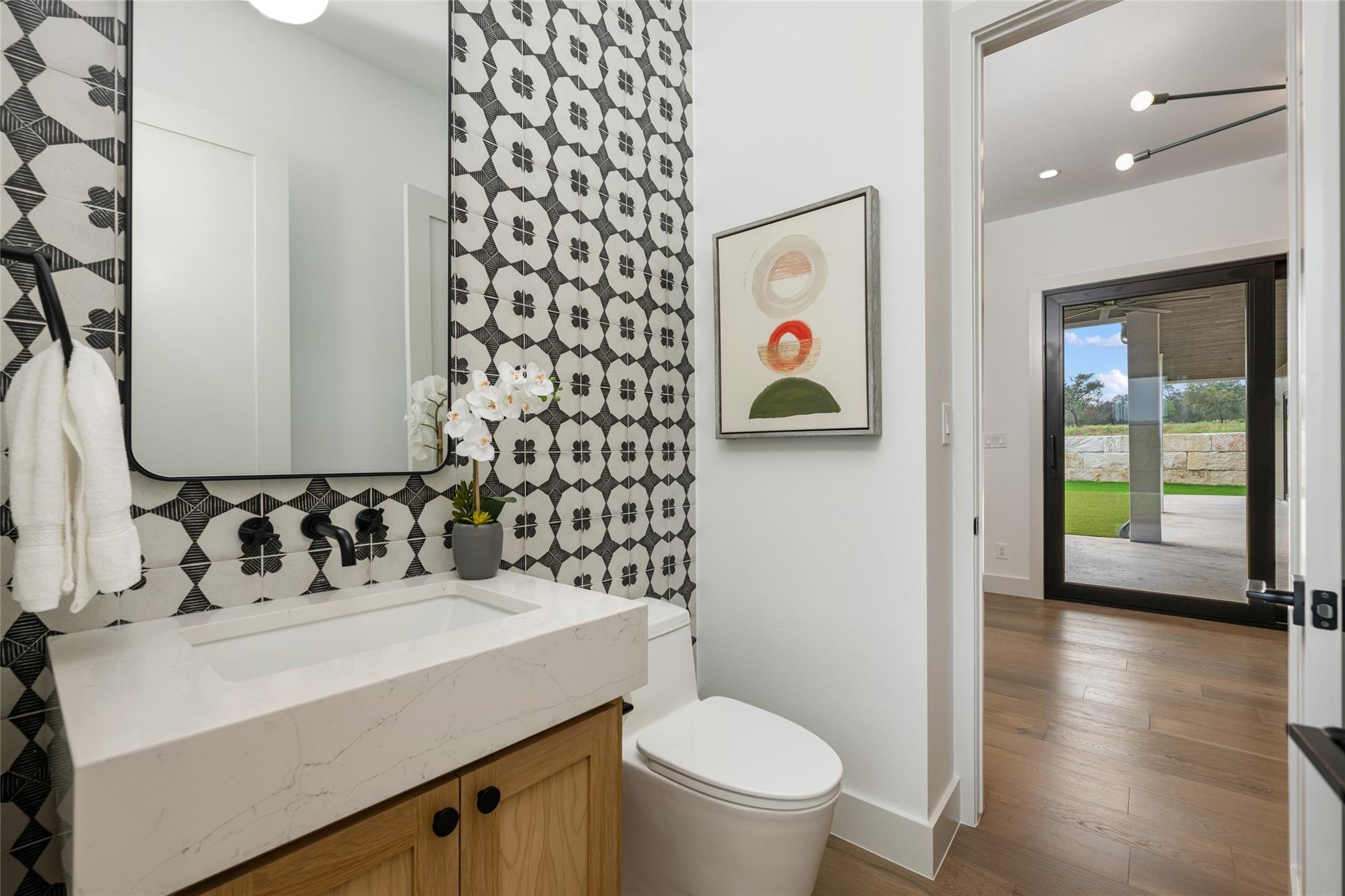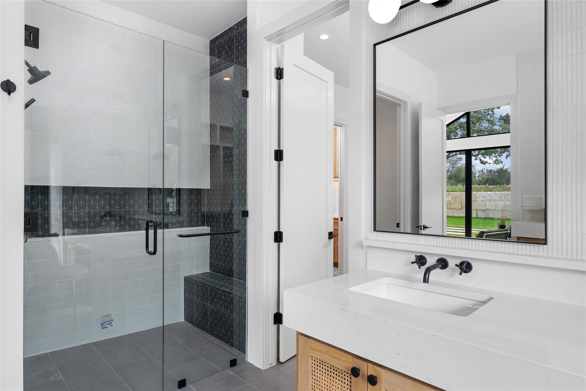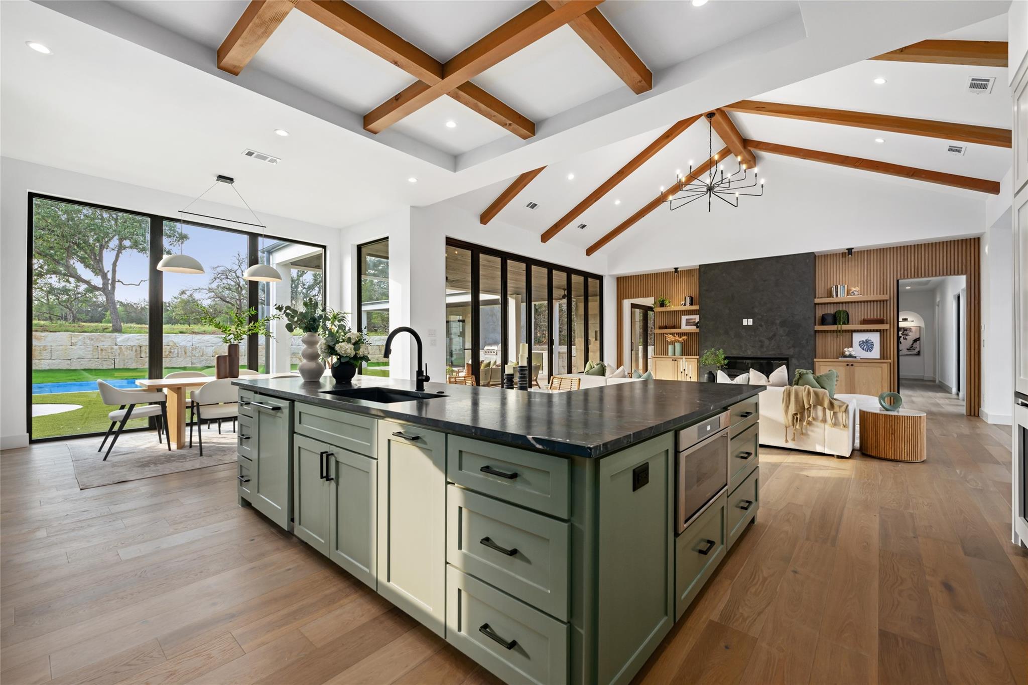 Experience the pinnacle of luxury living in this newly built, exquisite single-story residence nestled within the prestigious gated estate community of Paleface Ranch in Spicewood, Texas. Spanning an impressive 3,900 square feet on a sprawling five-acre lot, this architectural masterpiece designed by Kelley Design Group, built by Riverbend Homes, and perfected by Saltbox Studio offers an unparalleled blend of sophistication and tranquility. Inside, discover French white oak floors and cathedral ceilings that create a bright, expansive ambiance. The interior showcases exquisite taste, featuring a striking linear burner fireplace with a Venetian plaster set against an oak board and batten wall. The kitchen boasts leather-finish black quartzite atop shaker-style crafted cabinets and is equipped with high-end Thermador appliances, ensuring culinary excellence. The main house offers four generously sized bedrooms that offer serene views and are complemented by 4.5 luxurious bathrooms. The detached casita with a bedroom and full bathroom provides perfect guest accommodations. A vibrant private office with a walk-in safe off the main foyer offers the perfect workspace. A thoughtfully placed playroom off the great room caters to family needs, while a wall of collapsible glass doors in the great room opens to an outdoor living area, merging indoor elegance with outdoor relaxation. This area includes a pristine swimming pool and meticulously maintained artificial turf grounds, minimizing maintenance and water usage. Located in the Lake Travis School District and equipped with energy-efficient technologies like spray foam insulation, this property ensures comfort, efficiency, and educational excellence. Just moments from Lake Travis, it offers peace without sacrificing access to urban conveniences. This home is not just a residence—it’s a retreat designed for those who appreciate beauty, privacy, and a connection to nature.