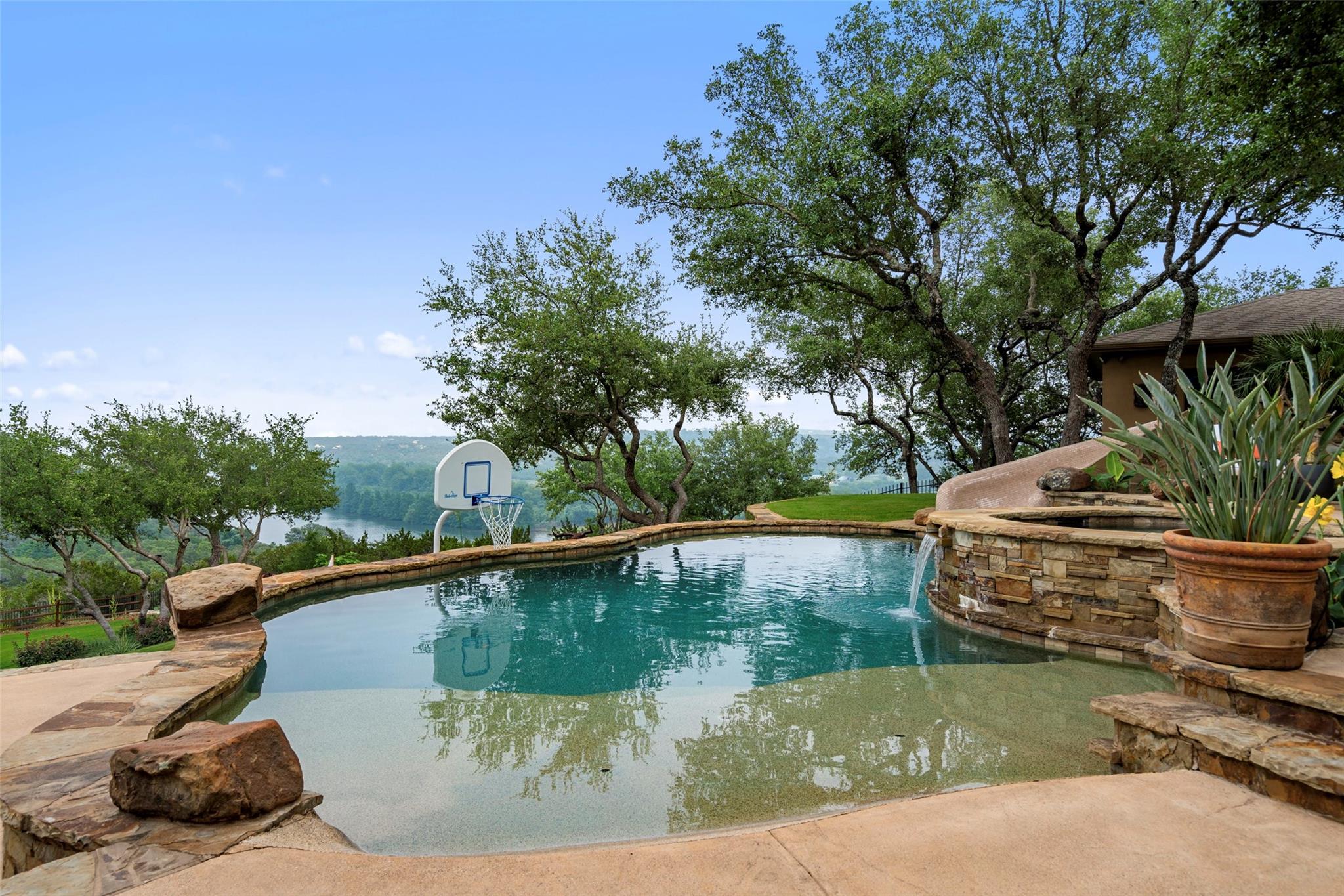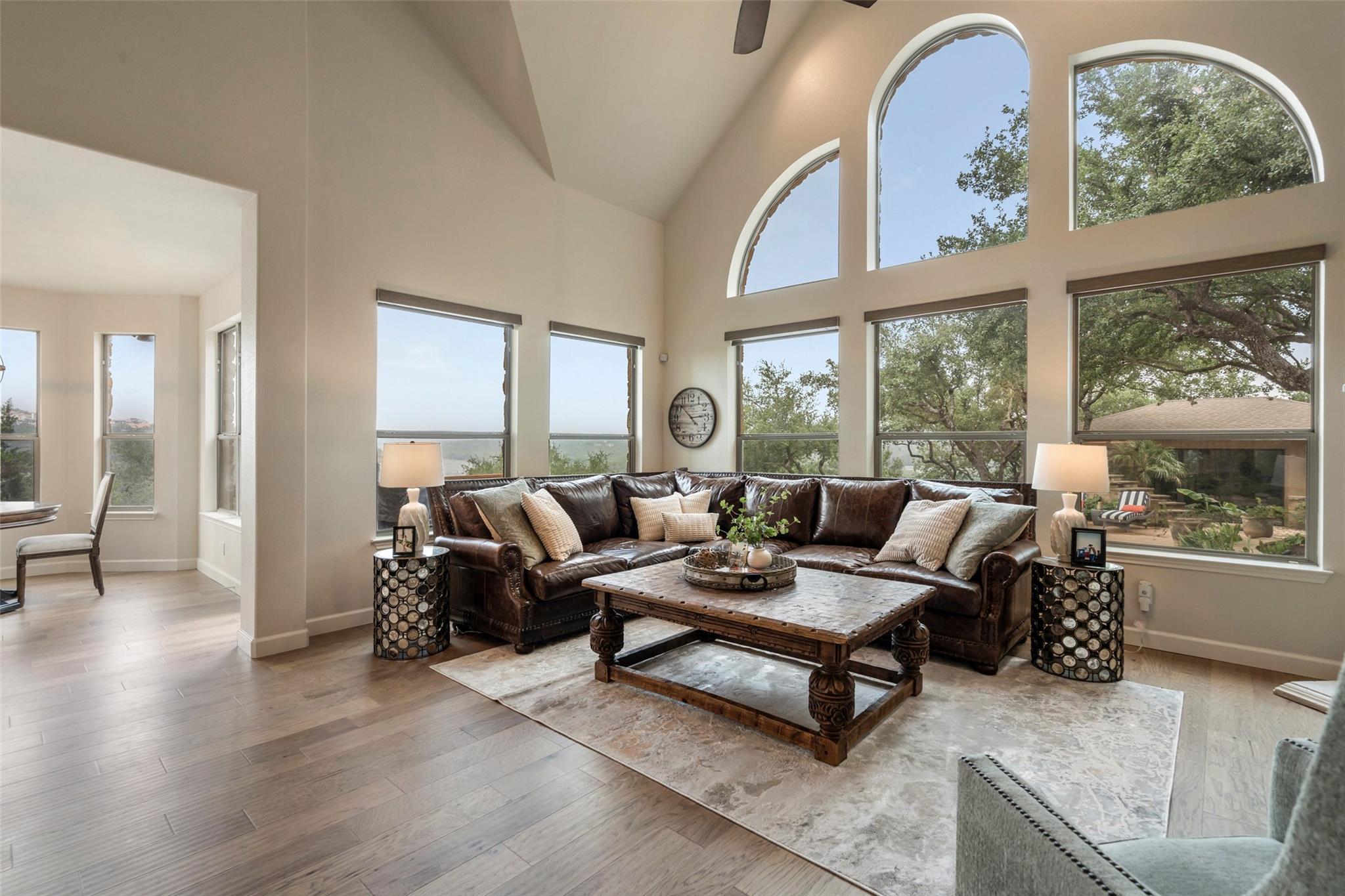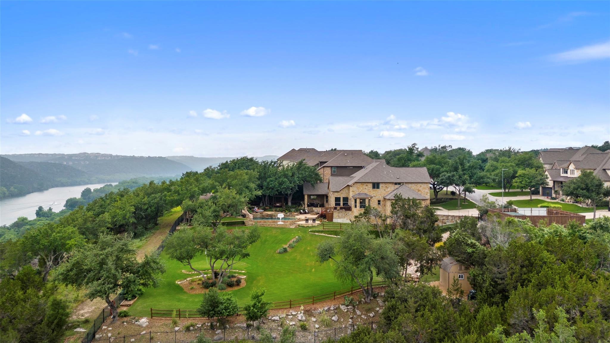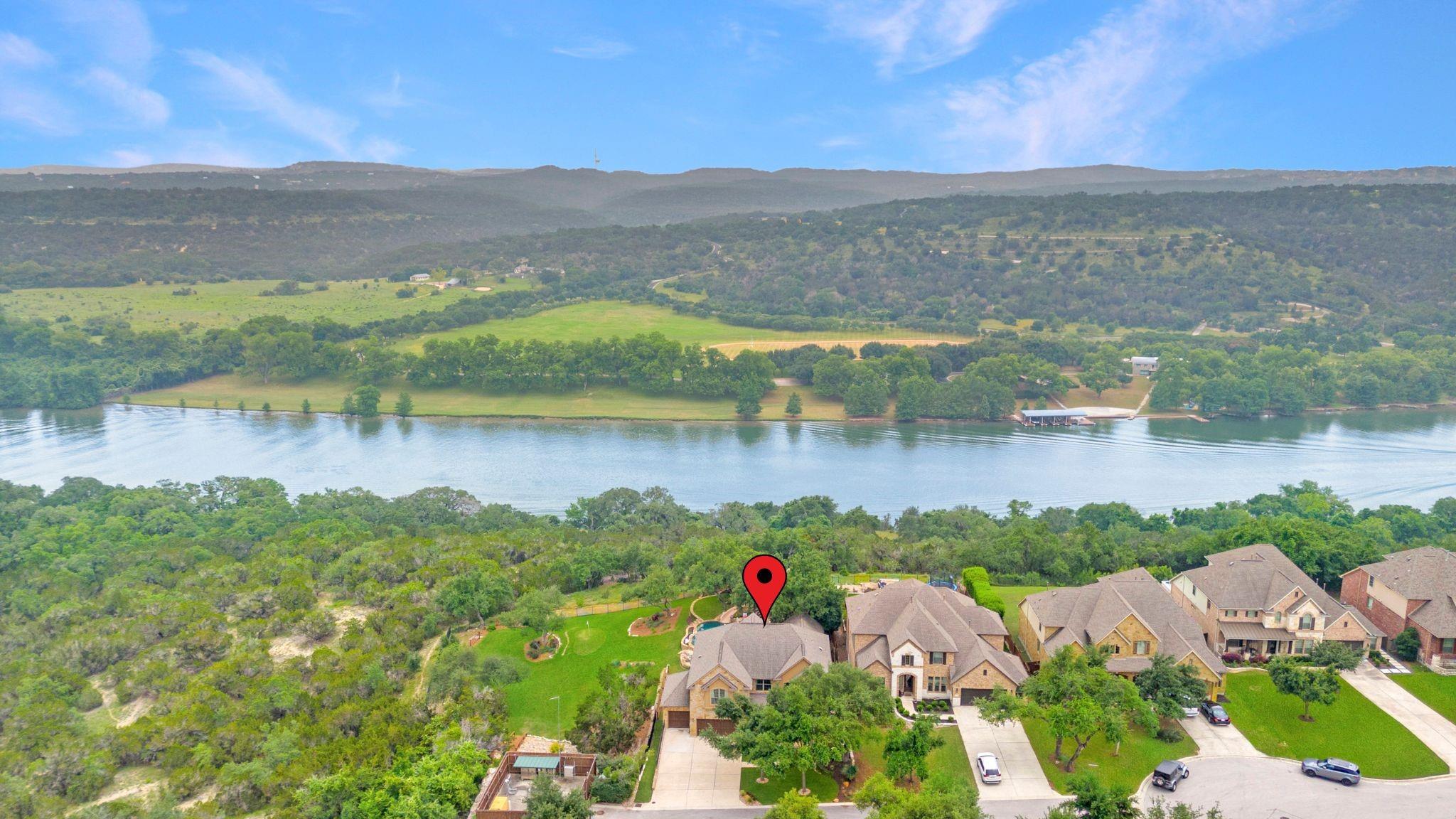 Don't miss this rare Steiner Ranch home with SPRAWLING Lake Austin and Hill Country Views.5 bedroom,3.5 bath plus office,media room,gaming room,AND detached approx 610 sq. ft. casita (walls of windows, kitchenette,full bath and closet)is one-of-a-kind and a rare market opportunity!This picturesque property sits on .36 acres at the bottom of a Bella Mar private drive,but also boasts an additional .42 acre greenbelt easement, exclusive to owners, for a total of .78 acres of space.Open floor plan with freshly painted white walls,spacious island kitchen,light and bright cabinets,quartz counters,stainless appliances,and is open to living area,which is surrounded by walls of windows capturing lake views!Downstairs primary bedroom with wood flooring and custom barn door into primary bath has dual vanities,jetted tub,separate shower,& french doors open to outdoor patio and pool/spa to enjoy those sunsets in the evenings.Upstairs media room with pocket doors,& 4 bedrooms split on either side,each with a shared bath.Secret flex space off hallway.One upstairs bedroom is oversized over garage for multiple children or multi-generational living as an additional primary bedroom.As you enter the backyard off the recent decking,your breath is taken away by the incredible Lake Austin views!This southeast facing backyard boasts beautiful sunrises,and is shaded by early afternoon.In addition,adjacent .42 acre exclusive easement surrounded by bird preserve provides plenty of space around you for extra privacy!Beautiful pool/spa with waterfalls & tile slide leaves room for hours of enjoyment in these hot Texas summers!Approx. 616 sq. ft detached pool house with full bath and kitchenette surrounded by sliding doors that open,is a space that offers endless possibilities!Epoxied floor 3 car garage off oversized driveway.Four attic spaces,hot water circulating pumps for instant hot water throughout,integrated home automation,6 camera security system,zwave locks,and so much more.