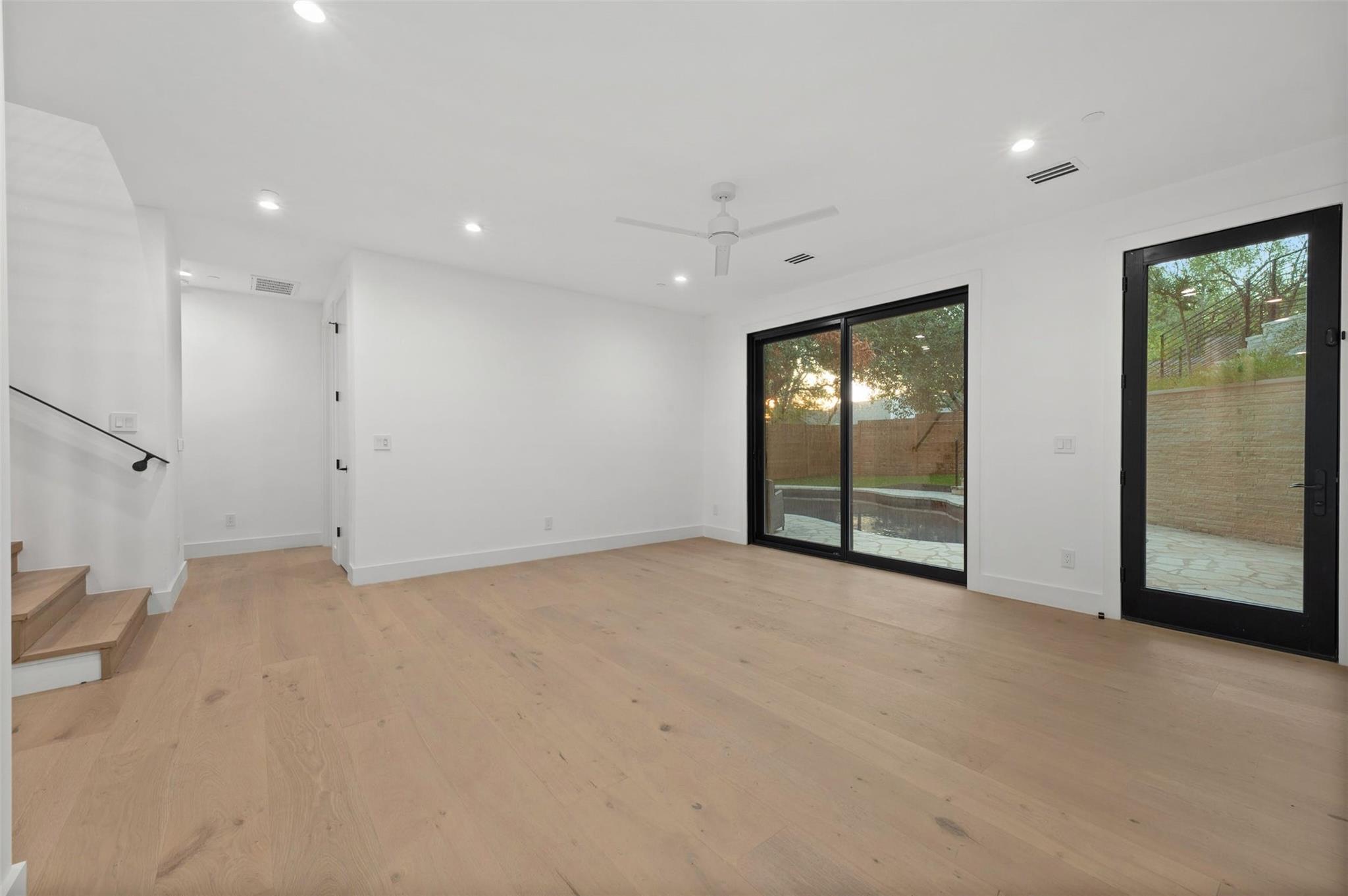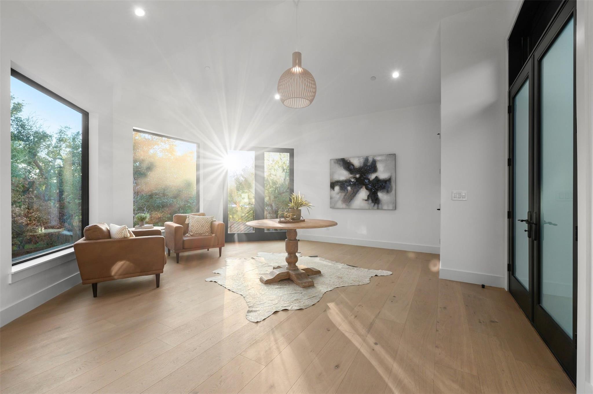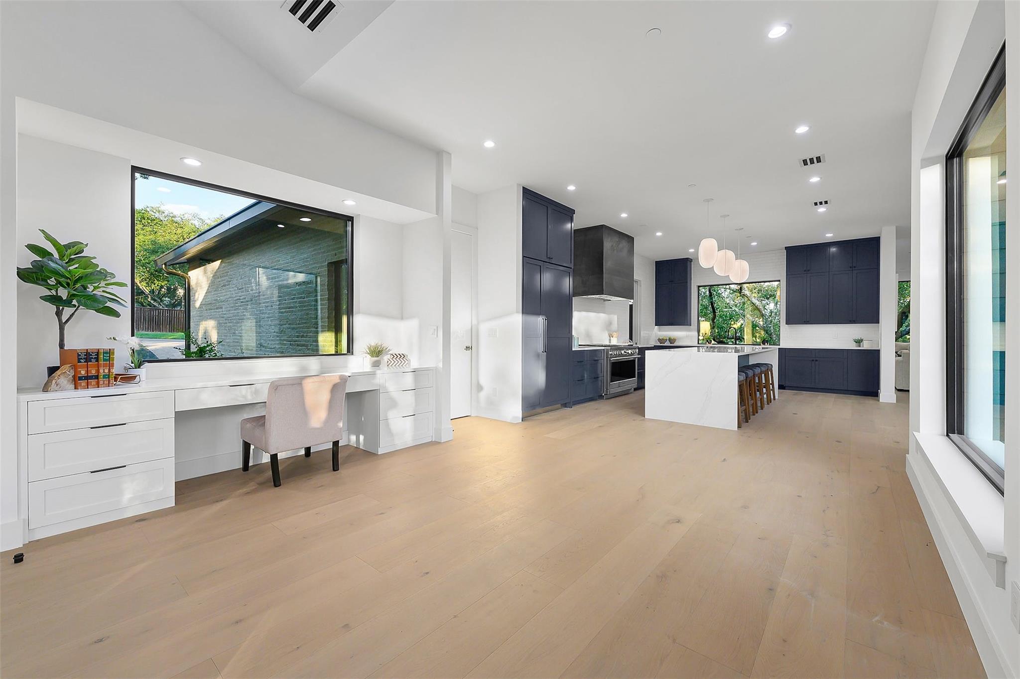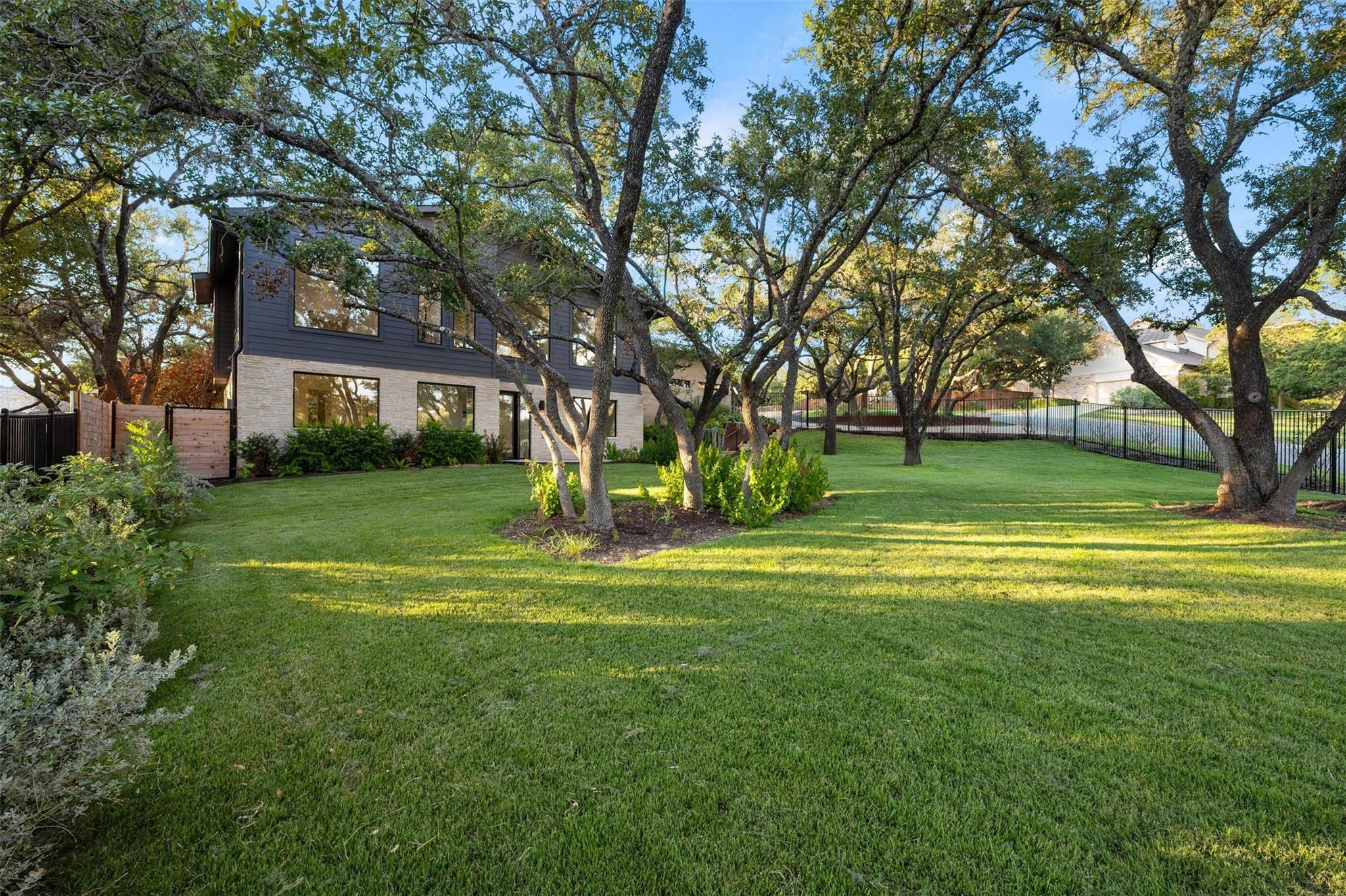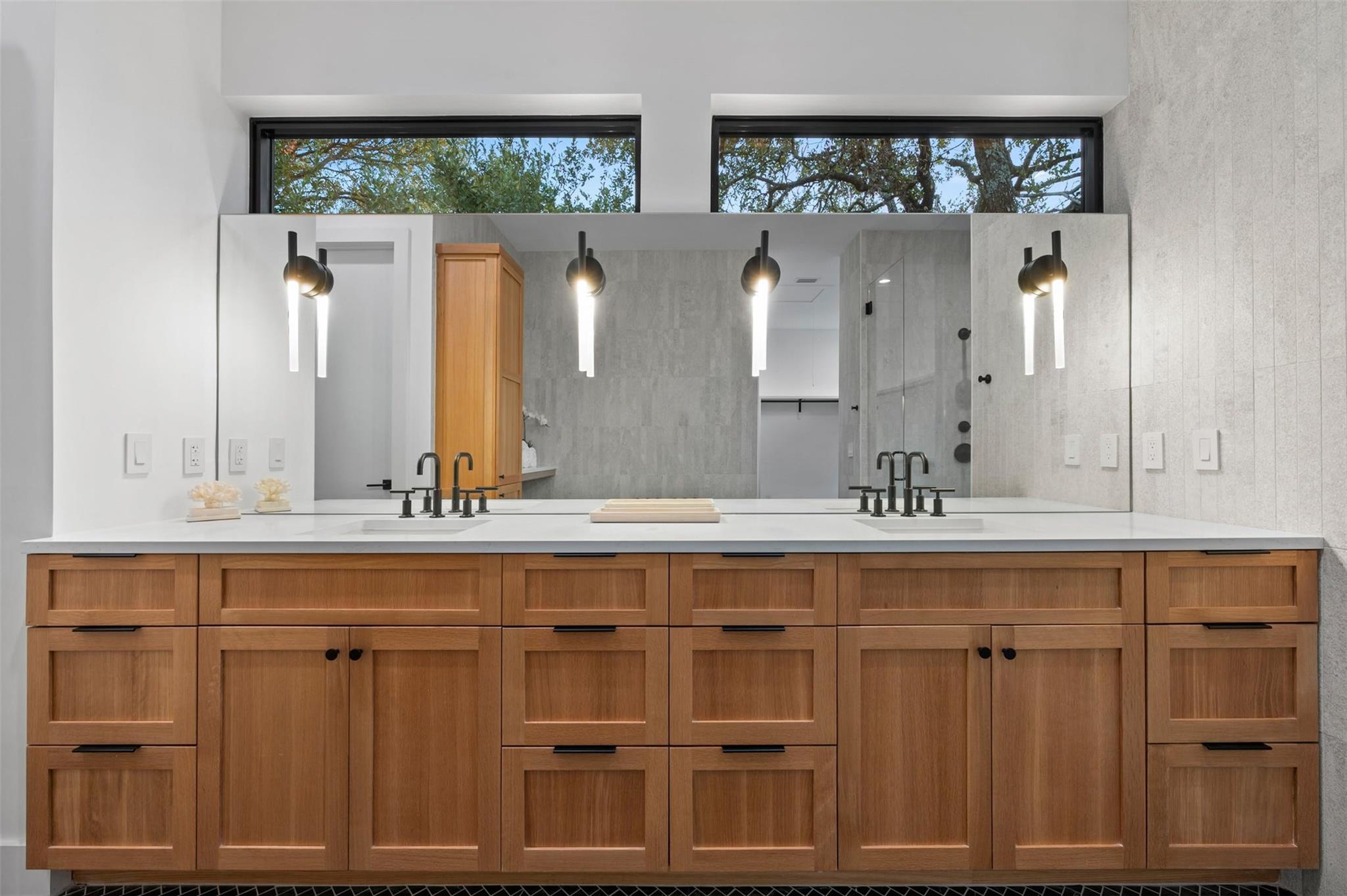 *This home is completely new construction other than garage slab and pool structure, although pool was remodeled by Liquid Assets during construction.* On a sprawling tree-lined lot in iconic Lost Creek this 4,490 SF NEW home designed by Erin Kant of ESK Studio and Parkside Homes is ready for occupancy. Whether it’s the flood of natural light from the expansive Pella windows or the casual luxury of the 9” European white oak floors that run throughout, this property perfectly blends upscale fixtures and finishes with functional family living in Eanes ISD. As you approach this stacked limestone house, a welcoming circular drive provides ample parking for family and guests while a plush, fenced-in zoysia lawn adorned with professionally landscaped steel beds makes for gorgeous views from both the home’s exterior and interior. The home’s main floor boasts a gorgeous entryway that could be utilized in a variety of ways: a cozy sitting area, a library nook, or overflow space for entertaining. The gorgeous kitchen features high-end GE Luxury Monogram appliances including a cabinet-front refrigerator and dishwasher, 8-burner gas range with double oven, dual cabinet-front trash bins, and even a work pantry that houses the microwave, a built-in coffee maker, and plenty of storage tucked away out of sight, keeping the waterfall quartz counters and shaker style cabinets sleek and clean. The dining room and additional living/family room flank the kitchen, supplying even more light and bright space for a family to gather and special occasions. Also on the main floor, the home’s spacious primary bedroom provides a perfectly peaceful retreat, and the spa-like primary bathroom is the ideal addition to this space. Moving downstairs, a game room with an entire wall of sliding glass doors adjoins four additional bedrooms, two ensuite and two that share a Jack-and-Jill bathroom. Around the corner, a cozy office with built-ins will be the favorite place for everyone in the house to work.