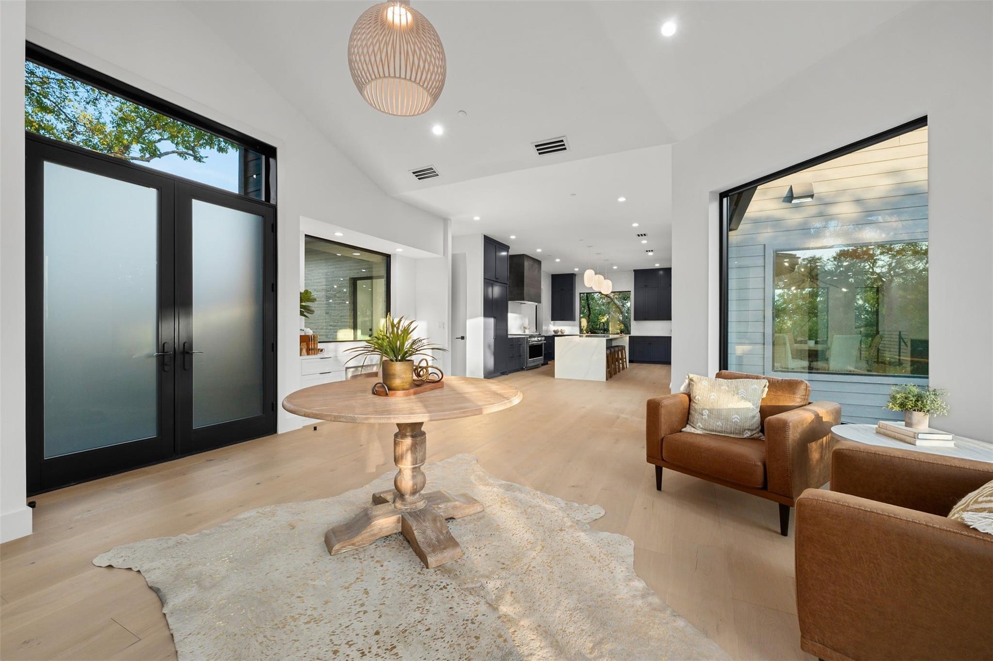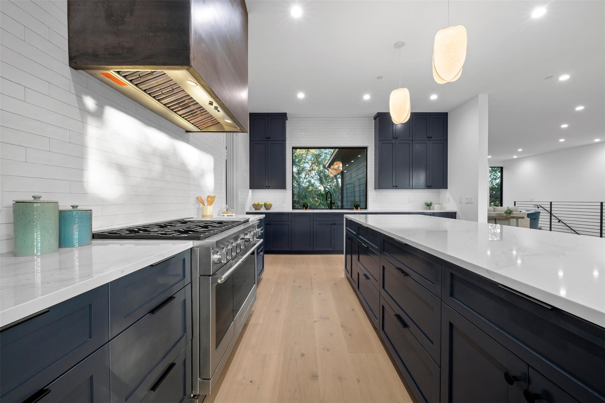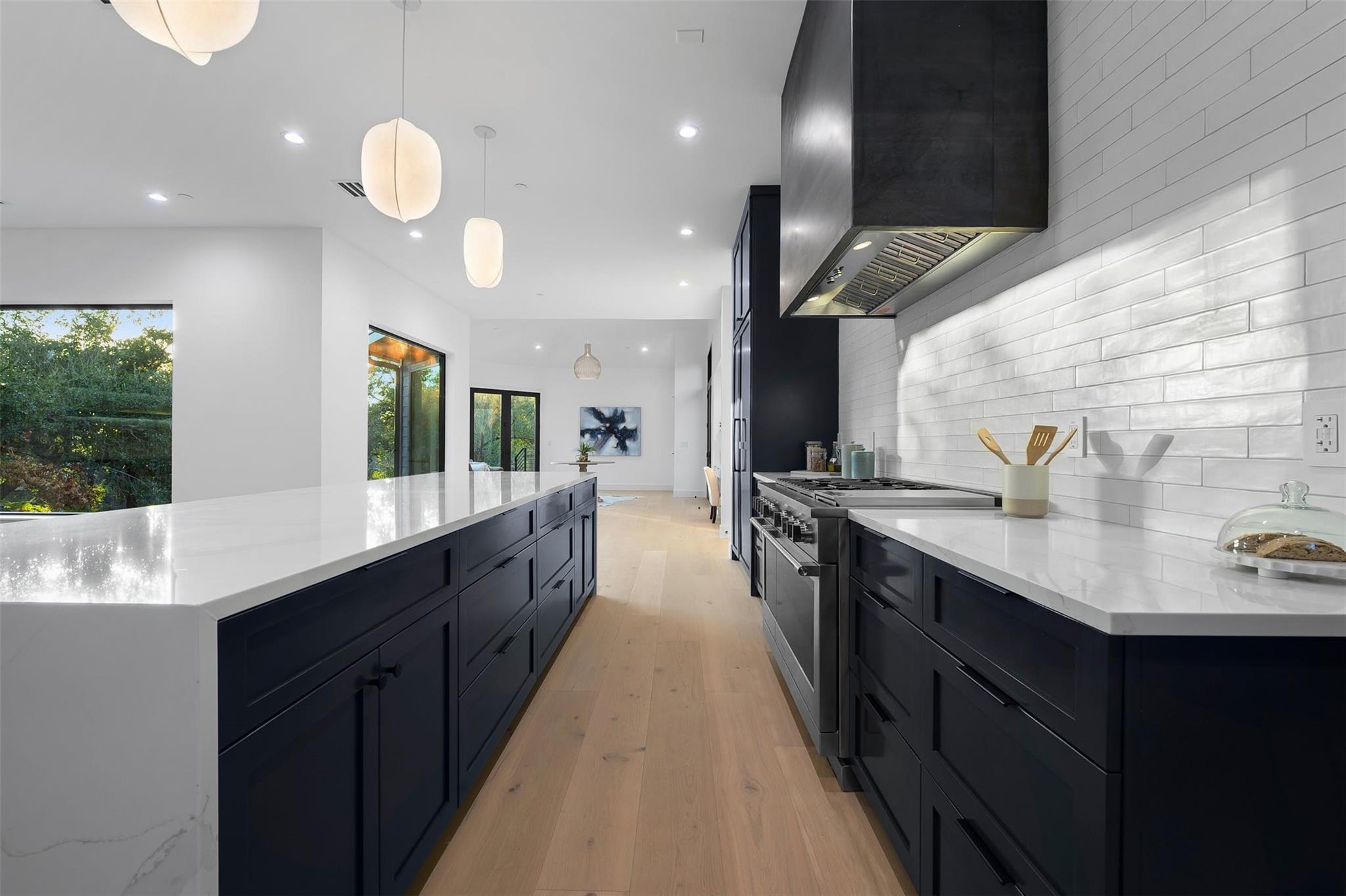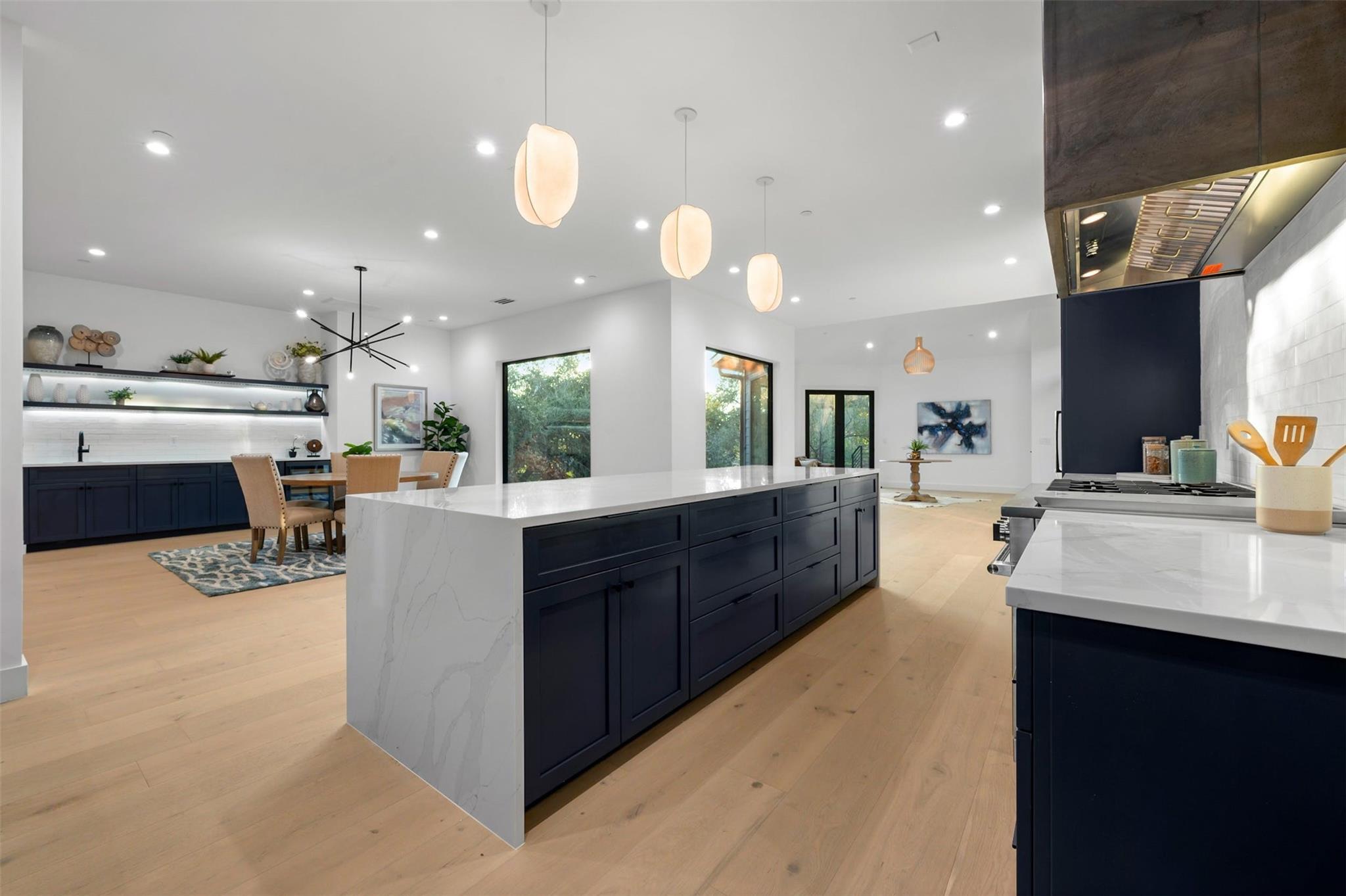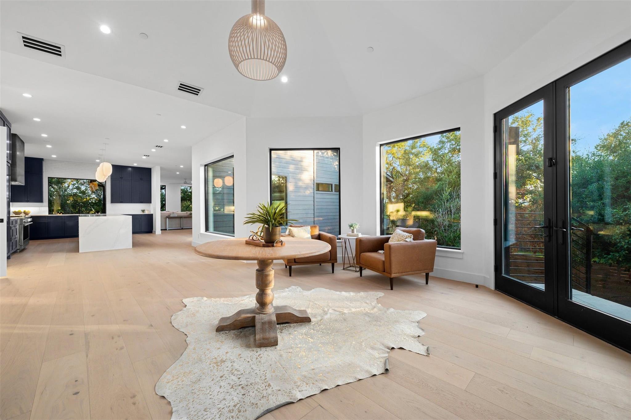 *This home is completely new construction other than garage slab and pool structure, although pool was remodeled by Liquid Assets during construction.* On a sprawling tree-lined lot in iconic Lost Creek this 4,490 SF NEW home designed by Erin Kant of ESK Studio and Parkside Homes is ready for occupancy. Whether it’s the flood of natural light from the expansive Pella windows or the casual luxury of the 9” European white oak floors that run throughout, this property perfectly blends upscale fixtures and finishes with functional family living in Eanes ISD. As you approach this stacked limestone house, a welcoming circular drive provides ample parking for family and guests while a plush, fenced-in zoysia lawn adorned with professionally landscaped steel beds makes for gorgeous views from both the home’s exterior and interior. The home’s main floor boasts a gorgeous entryway that could be utilized in a variety of ways: a cozy sitting area, a library nook, or overflow space for entertaining. The gorgeous kitchen features high-end GE Luxury Monogram appliances including a cabinet-front refrigerator and dishwasher, 8-burner gas range with double oven, dual cabinet-front trash bins, and even a work pantry that houses the microwave, a built-in coffee maker, and plenty of storage tucked away out of sight, keeping the waterfall quartz counters and shaker style cabinets sleek and clean. The dining room and additional living/family room flank the kitchen, supplying even more light and bright space for a family to gather and special occasions. Also on the main floor, the home’s spacious primary bedroom provides a perfectly peaceful retreat, and the spa-like primary bathroom is the ideal addition to this space. Moving downstairs, a game room with an entire wall of sliding glass doors adjoins four additional bedrooms, two ensuite and two that share a Jack-and-Jill bathroom. Around the corner, a cozy office with built-ins will be the favorite place for everyone in the house to work.