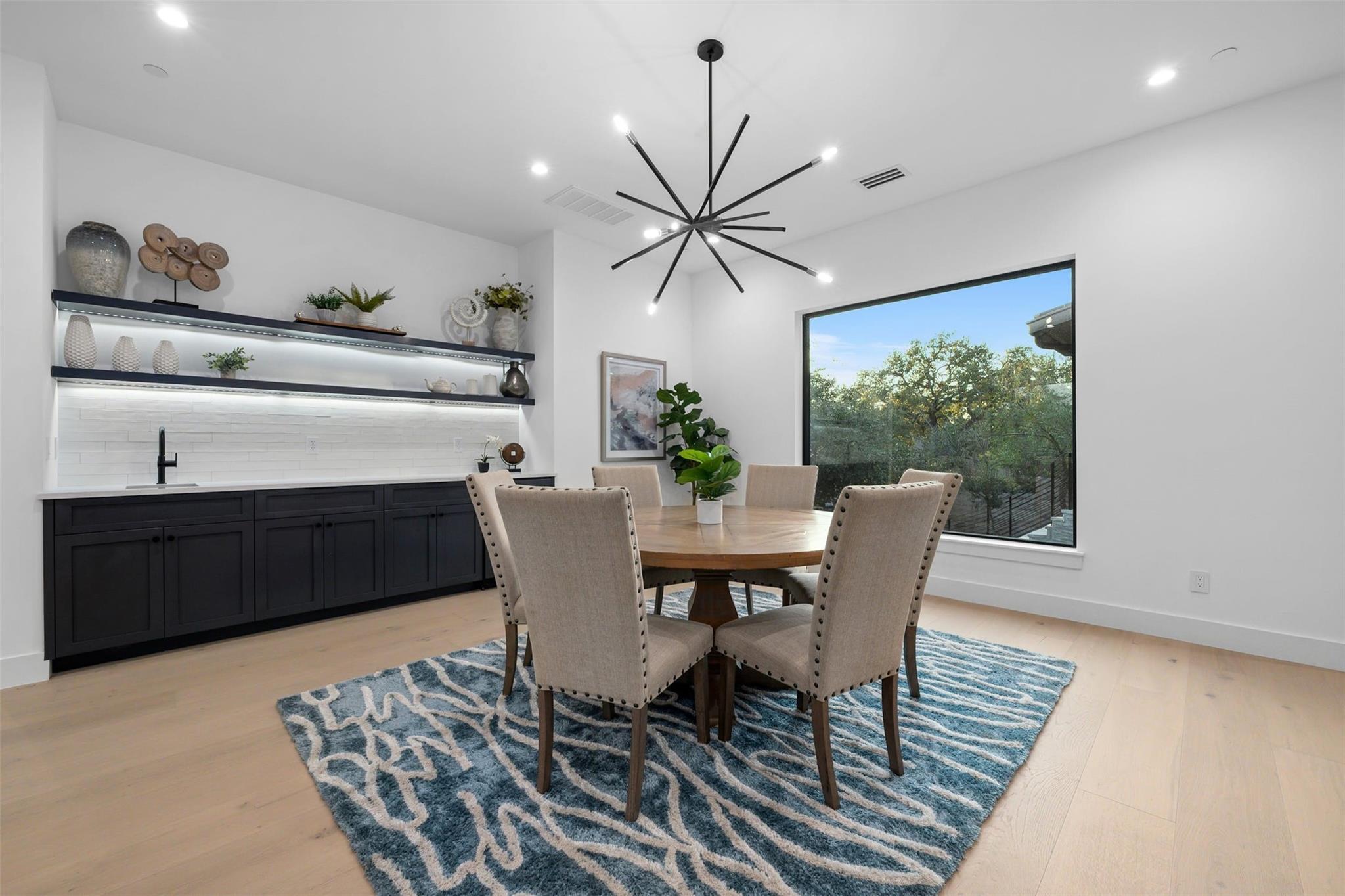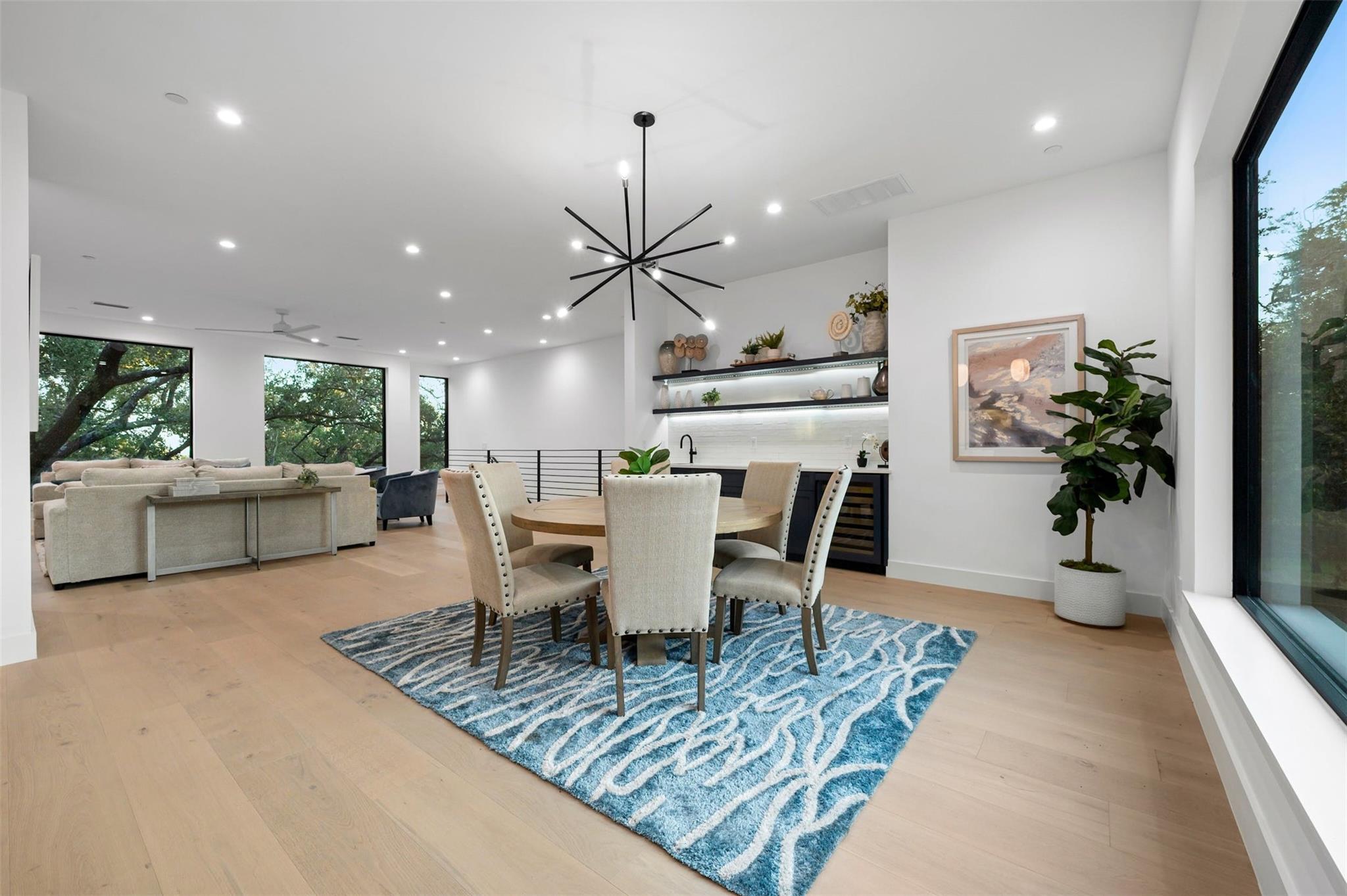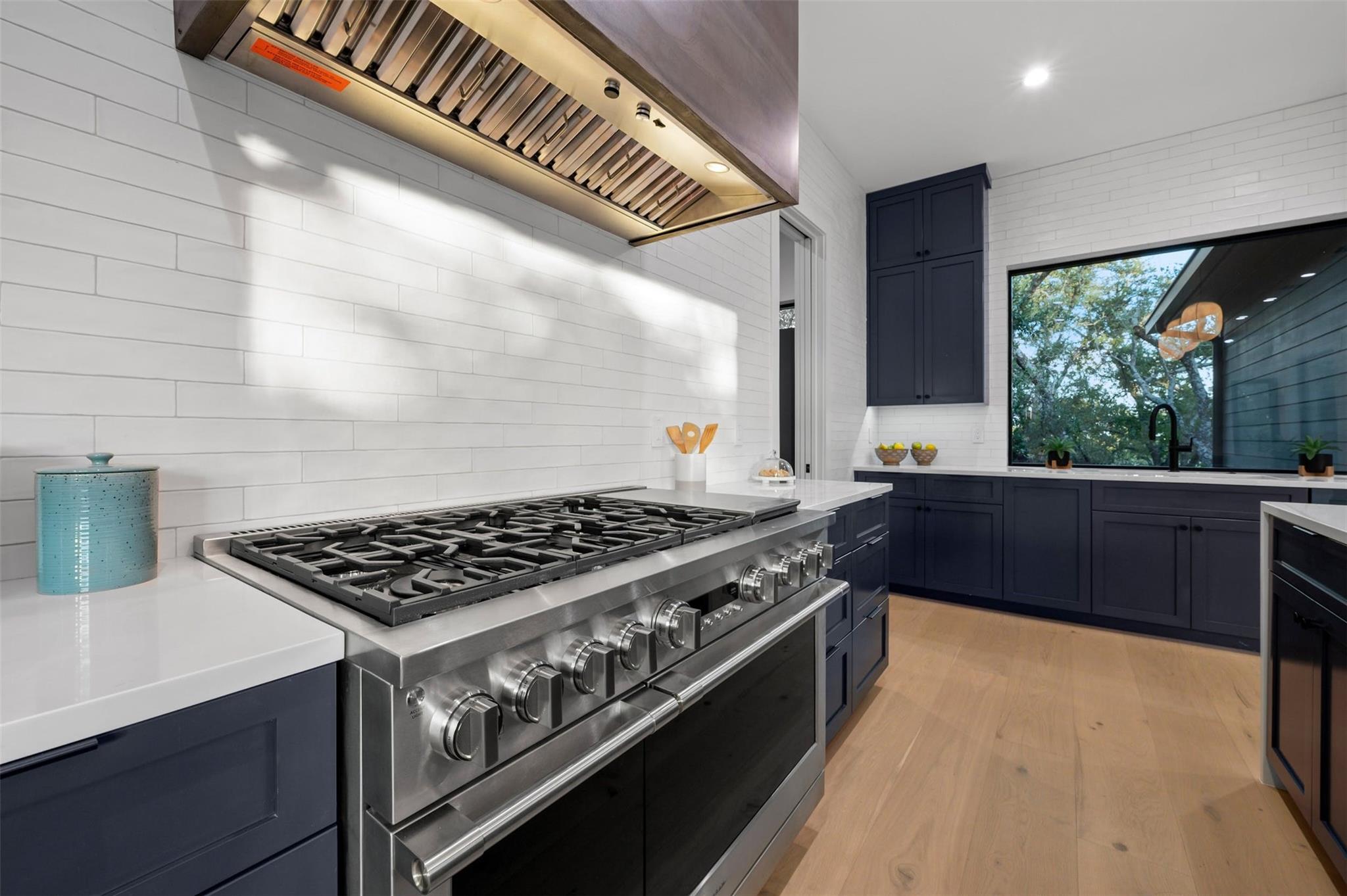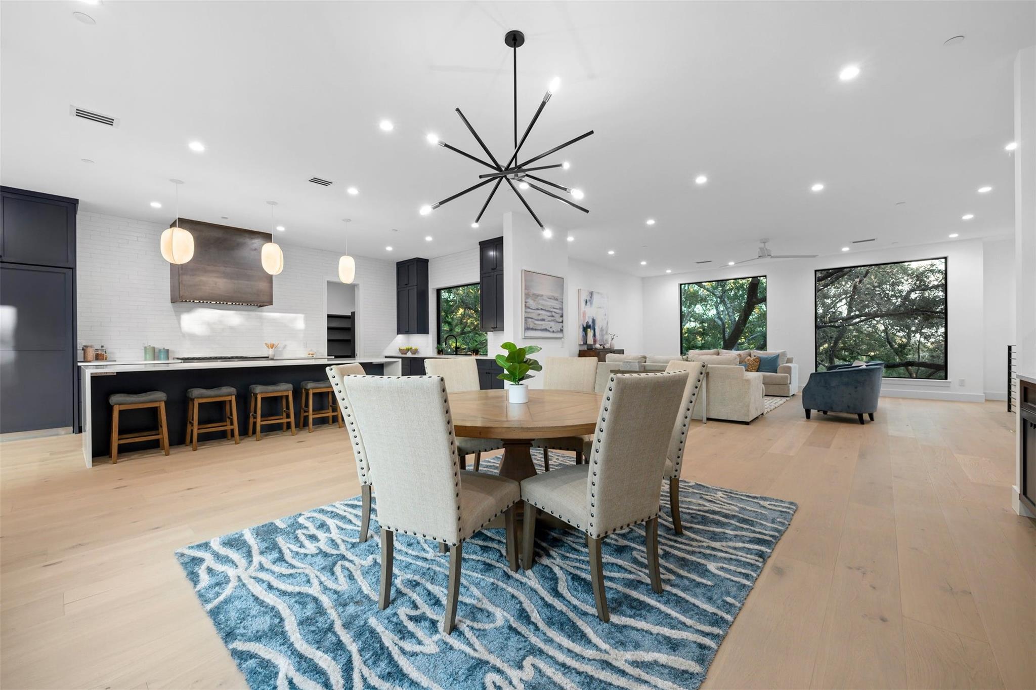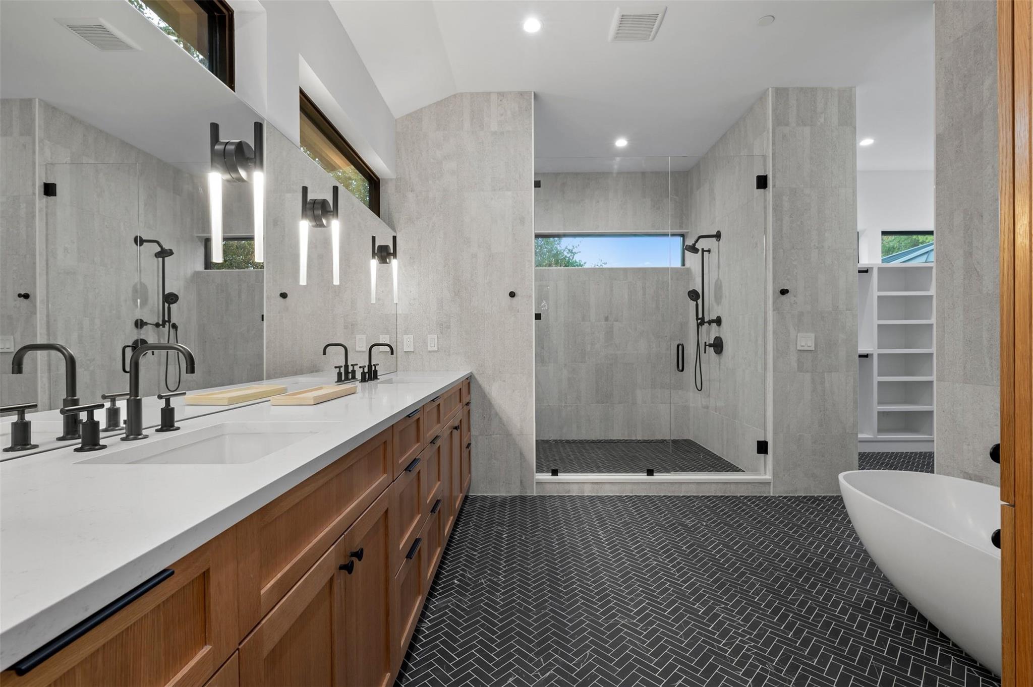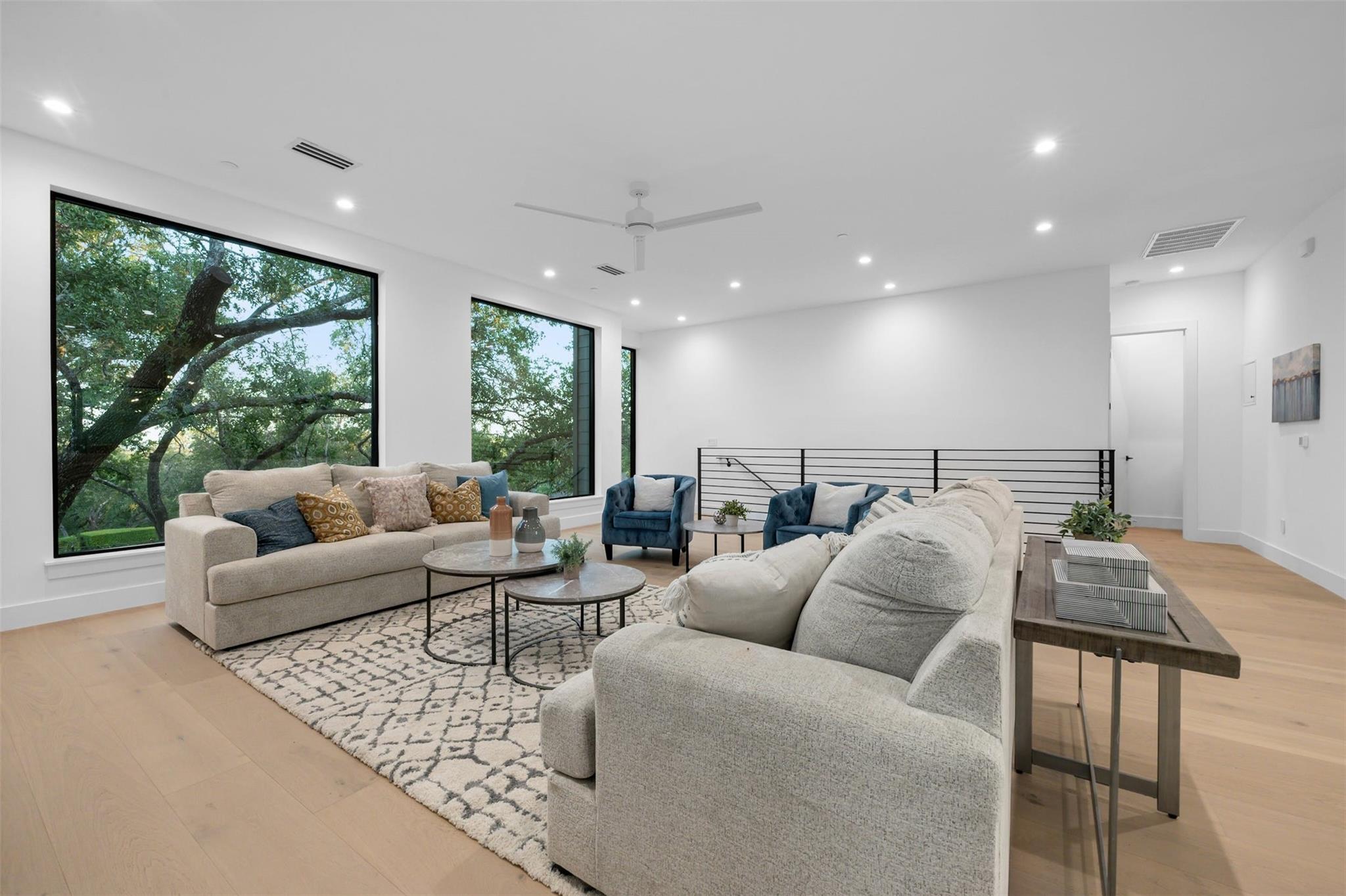 *This home is completely new construction other than garage slab and pool structure, although pool was remodeled by Liquid Assets during construction.* On a sprawling tree-lined lot in iconic Lost Creek this 4,490 SF NEW home designed by Erin Kant of ESK Studio and Parkside Homes is ready for occupancy. Whether it’s the flood of natural light from the expansive Pella windows or the casual luxury of the 9” European white oak floors that run throughout, this property perfectly blends upscale fixtures and finishes with functional family living in Eanes ISD. As you approach this stacked limestone house, a welcoming circular drive provides ample parking for family and guests while a plush, fenced-in zoysia lawn adorned with professionally landscaped steel beds makes for gorgeous views from both the home’s exterior and interior. The home’s main floor boasts a gorgeous entryway that could be utilized in a variety of ways: a cozy sitting area, a library nook, or overflow space for entertaining. The gorgeous kitchen features high-end GE Luxury Monogram appliances including a cabinet-front refrigerator and dishwasher, 8-burner gas range with double oven, dual cabinet-front trash bins, and even a work pantry that houses the microwave, a built-in coffee maker, and plenty of storage tucked away out of sight, keeping the waterfall quartz counters and shaker style cabinets sleek and clean. The dining room and additional living/family room flank the kitchen, supplying even more light and bright space for a family to gather and special occasions. Also on the main floor, the home’s spacious primary bedroom provides a perfectly peaceful retreat, and the spa-like primary bathroom is the ideal addition to this space. Moving downstairs, a game room with an entire wall of sliding glass doors adjoins four additional bedrooms, two ensuite and two that share a Jack-and-Jill bathroom. Around the corner, a cozy office with built-ins will be the favorite place for everyone in the house to work.