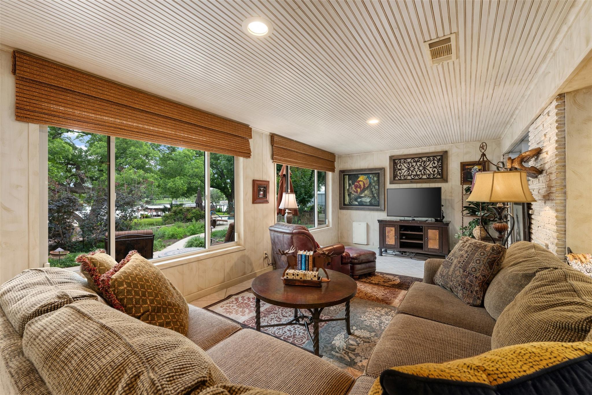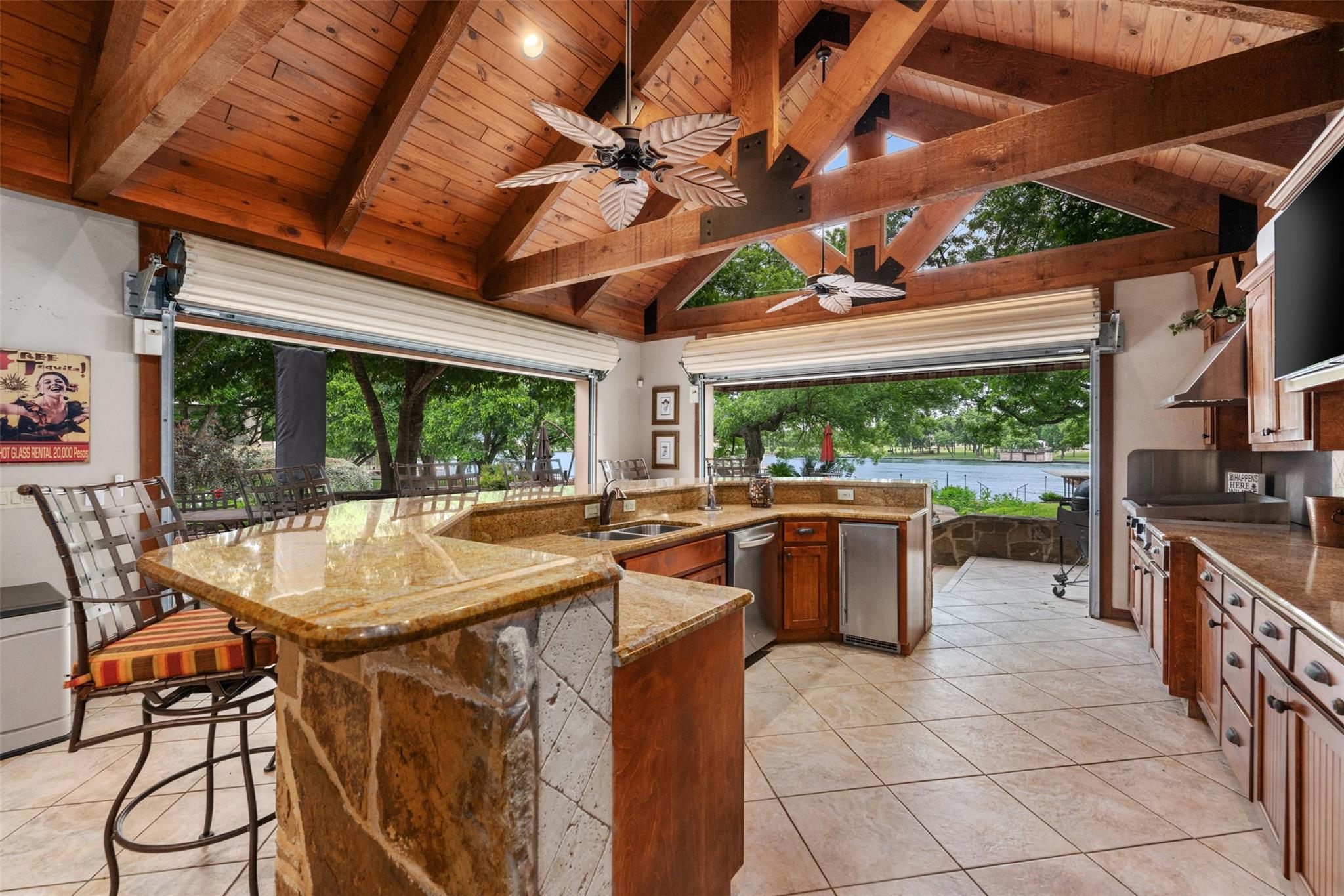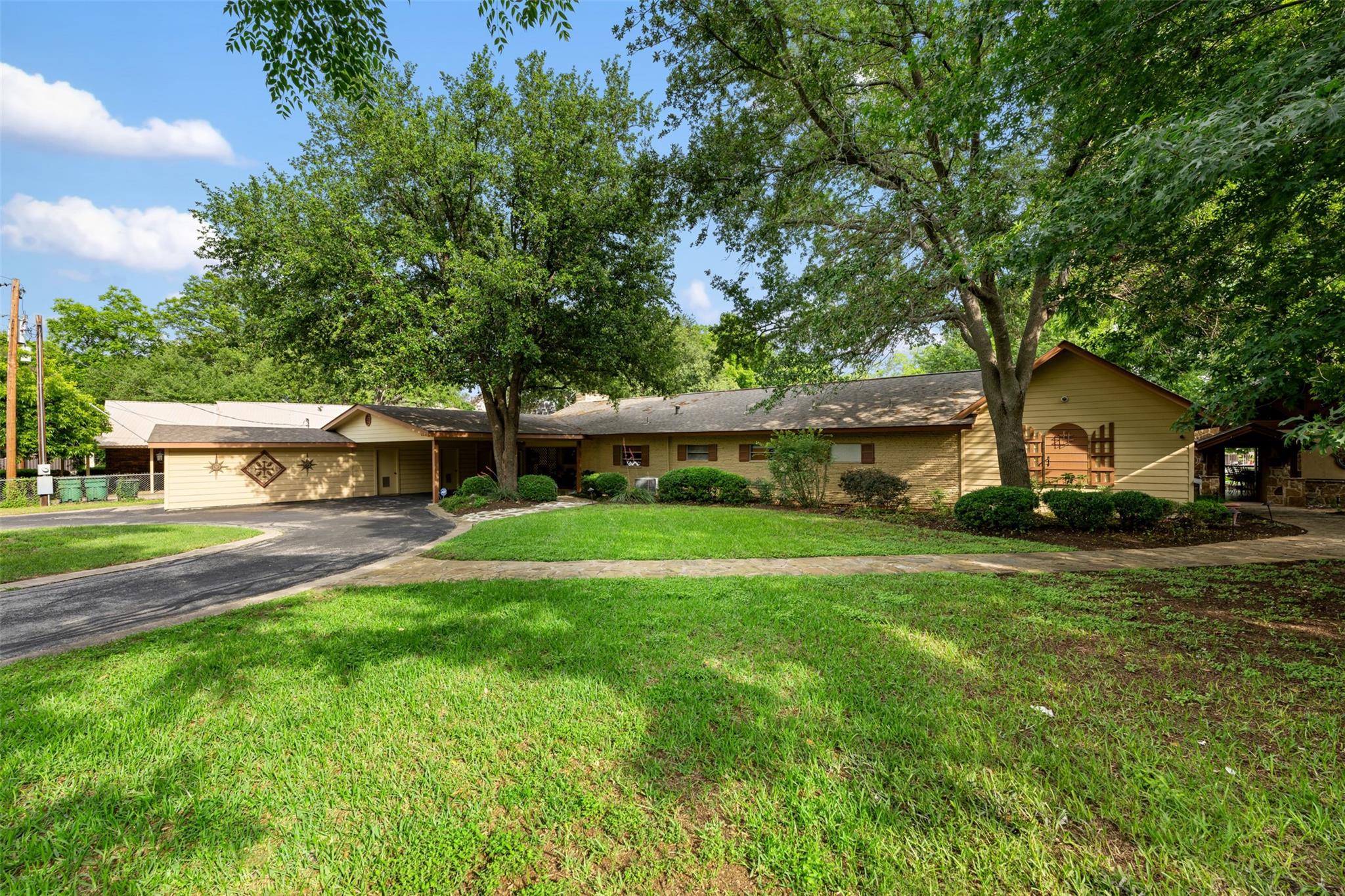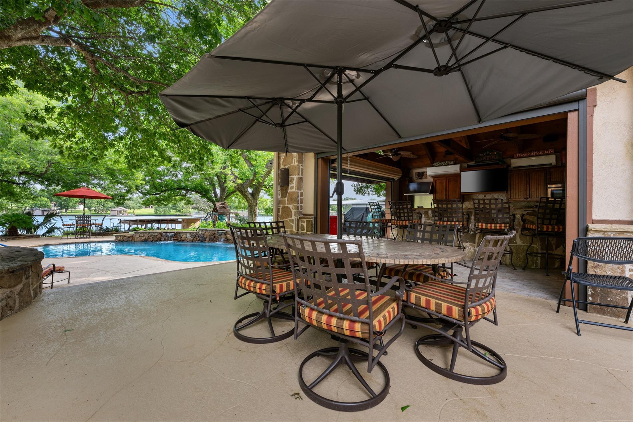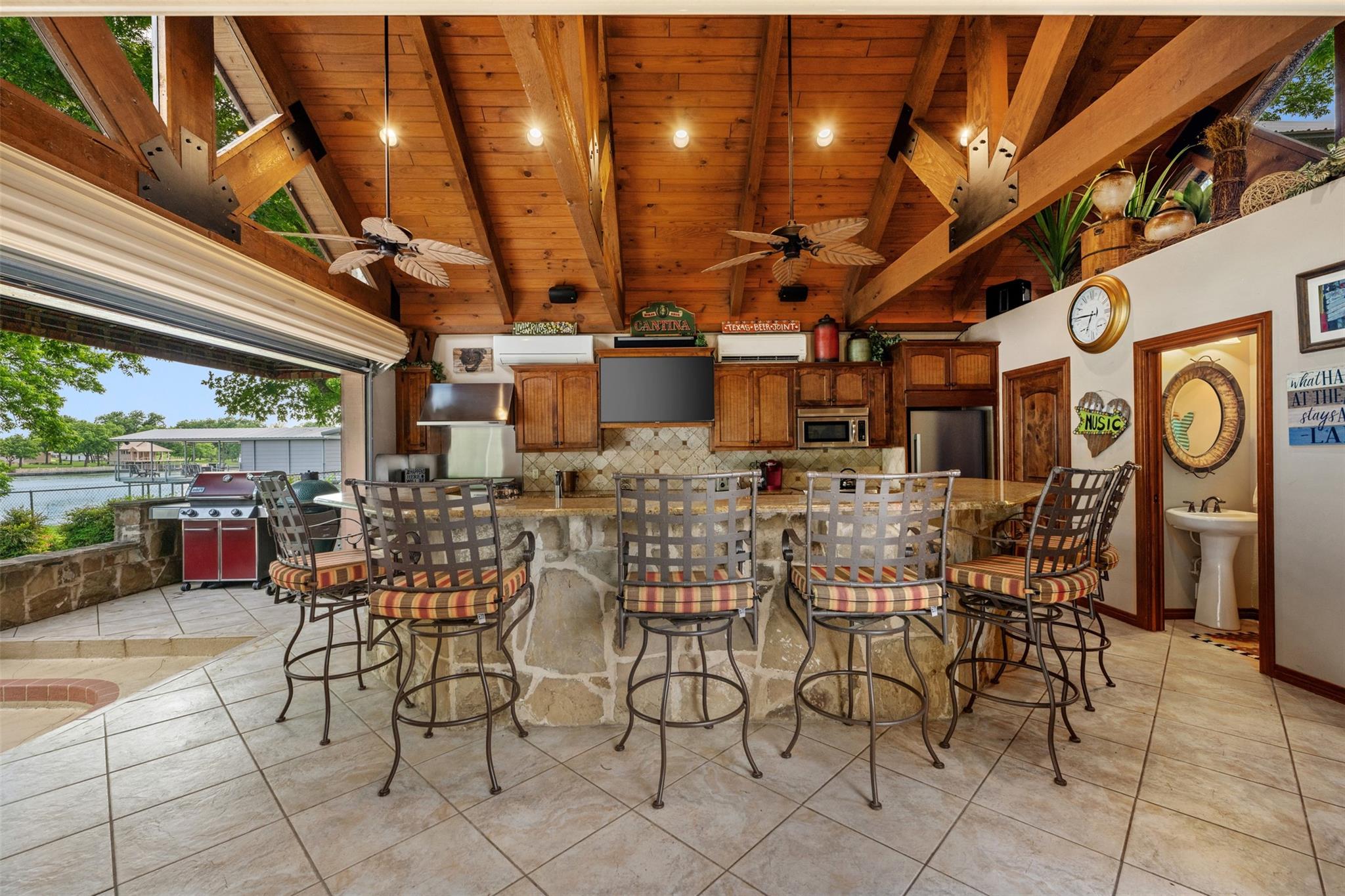 Escape to luxury living in this 4/ 3 home nestled on the shores of Lake LBJ. With 2706 square feet of living space, this exquisite retreat offers the perfect blend of comfort and elegance. Walk into a large open living area with a cozy fireplace or bask in the natural light streaming through the windows that frame picturesque views of the landscaped yard and lake beyond. Outside, paradise awaits with 100 feet of water frontage boasting two boat lifts, two jet ski lifts, and a boat slip for all your aquatic adventures. Dive into the refreshing pool, or unwind by the 11foot-long fire-pit under the starlit sky. The backyard oasis features an outdoor kitchen equipped with granite countertops, stainless steel appliances, and ice maker for your convenience. A half bath ensures your guests' comfort while enjoying outdoor festivities. Feel like you're in your own private resort as you soak in the serene ambiance of this meticulously landscaped haven. Need extra space for guests? The 1122 sq. ft bunkhouse offers three bedrooms and two bathrooms, providing ample accommodations for family and friends. Plus, with a mother-in-law suite boasting its own private entrance, everyone can enjoy their own slice of paradise. Has 6 storage rooms off the carport. Property can be placed in a short-term rental pool offering investors an excellent potential for lucrative returns. Don't miss your chance to own this dream lakeside retreat where every day feels like a vacation!