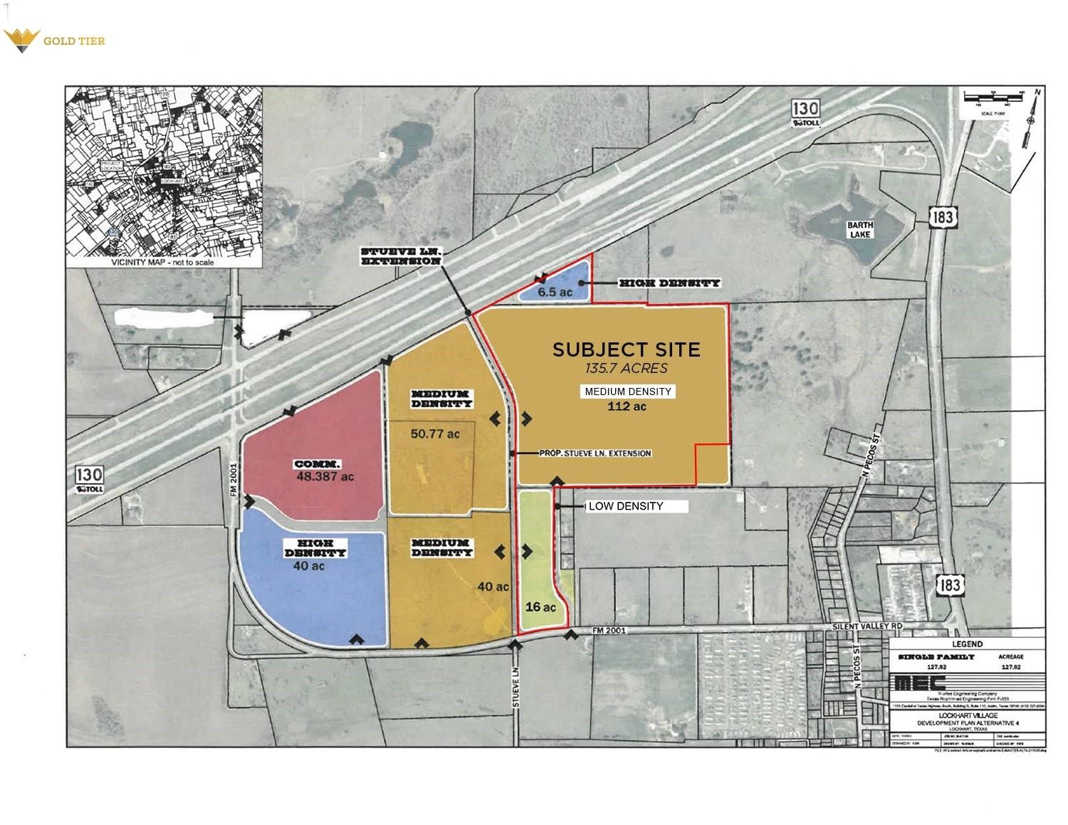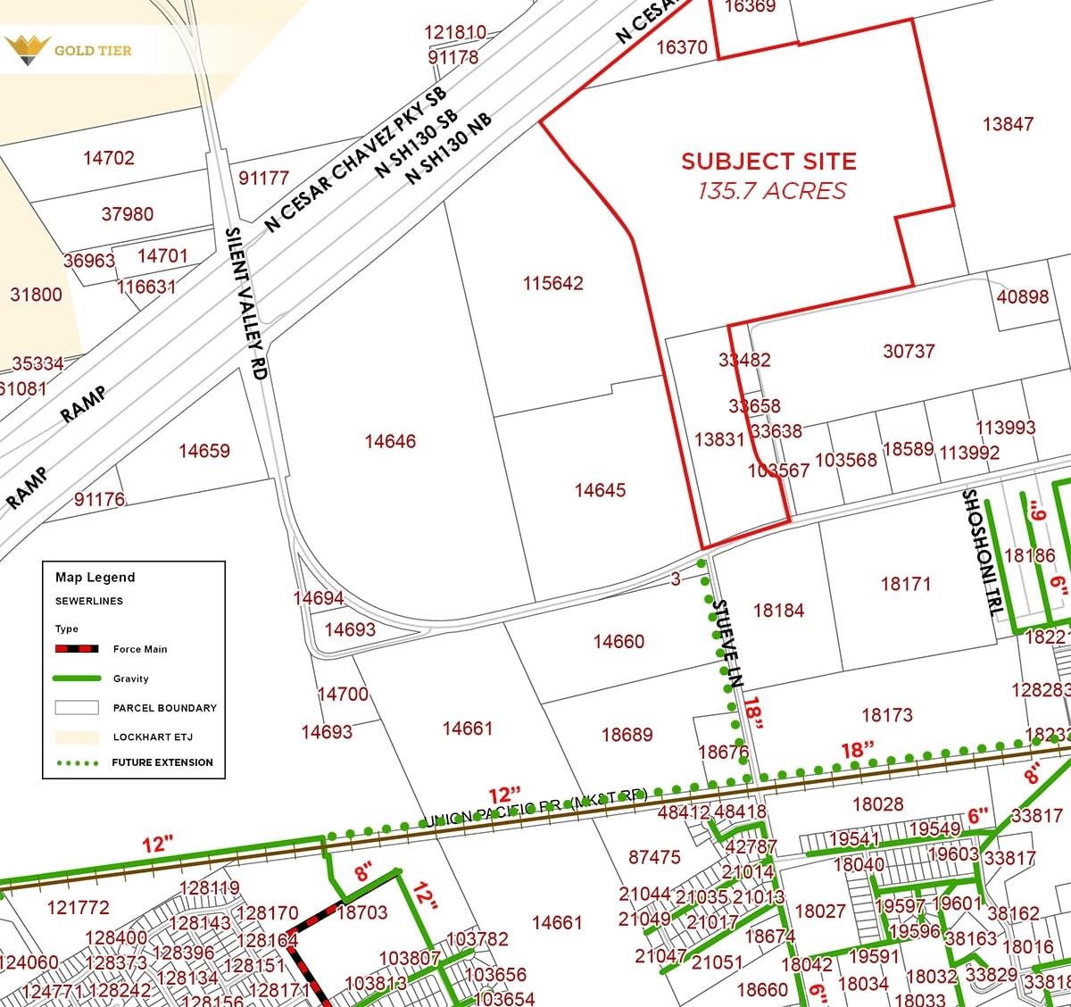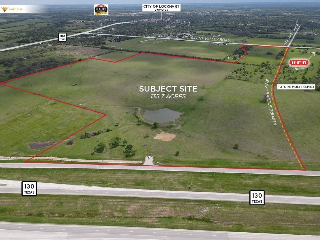 Gold Tier Real Estate is proud to present the sale of approximately 135.70 acres in Lockhart, Texas. This property offers phenomenal development potential with outstanding visibility and frontage along Toll 130 and Silent Valley Road. Additionally, a future extension of Stueve Lane is set to provide thousands more feet of prominent road frontage. With a comprehensive zoning plan in effect, the property is ideally suited for commercial, high-density residential, medium-density residential, and low-density residential purposes. Furthermore, a 12” water line is already in place at the southern boundary, with an 18” wastewater line proposed for extension to the same boundary. Infrastructure development is projected to be completed by Q4 2024. For further details, please contact the broker. Prospective purchasers are advised to conduct independent analyses of the property. The broker does not warrant the accuracy of any provided information.