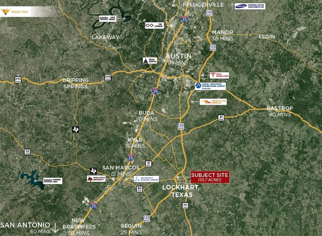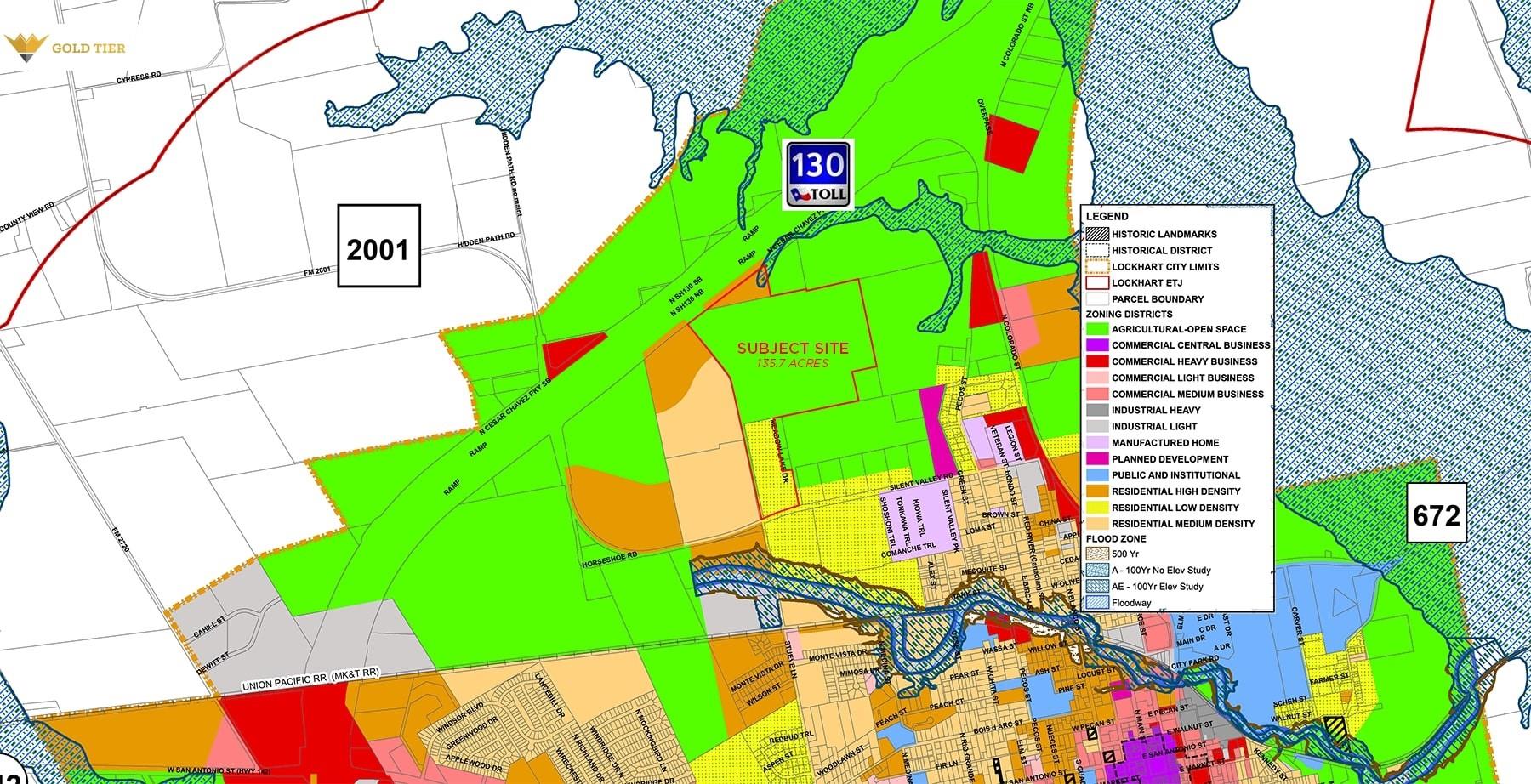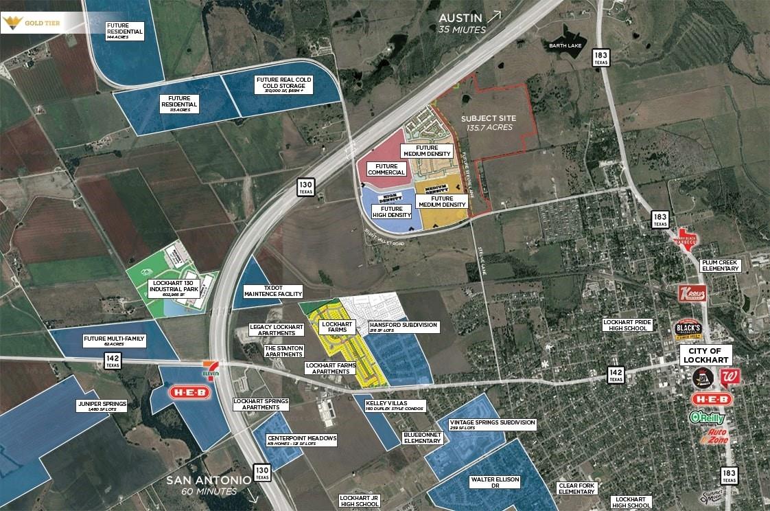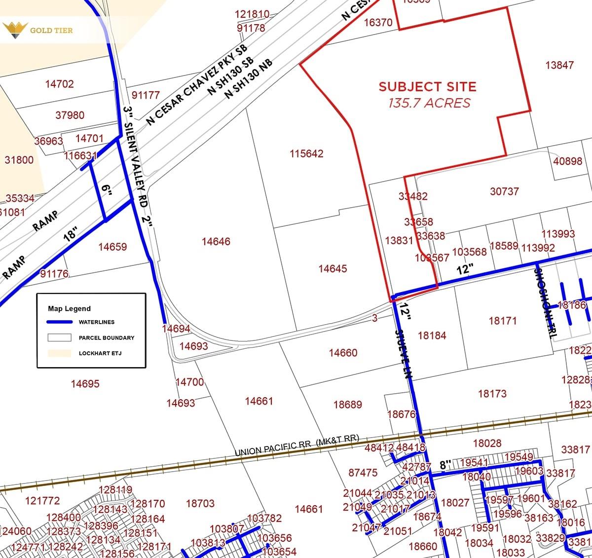 Gold Tier Real Estate is proud to present the sale of approximately 135.70 acres in Lockhart, Texas. This property offers phenomenal development potential with outstanding visibility and frontage along Toll 130 and Silent Valley Road. Additionally, a future extension of Stueve Lane is set to provide thousands more feet of prominent road frontage. With a comprehensive zoning plan in effect, the property is ideally suited for commercial, high-density residential, medium-density residential, and low-density residential purposes. Furthermore, a 12” water line is already in place at the southern boundary, with an 18” wastewater line proposed for extension to the same boundary. Infrastructure development is projected to be completed by Q4 2024. For further details, please contact the broker. Prospective purchasers are advised to conduct independent analyses of the property. The broker does not warrant the accuracy of any provided information.
