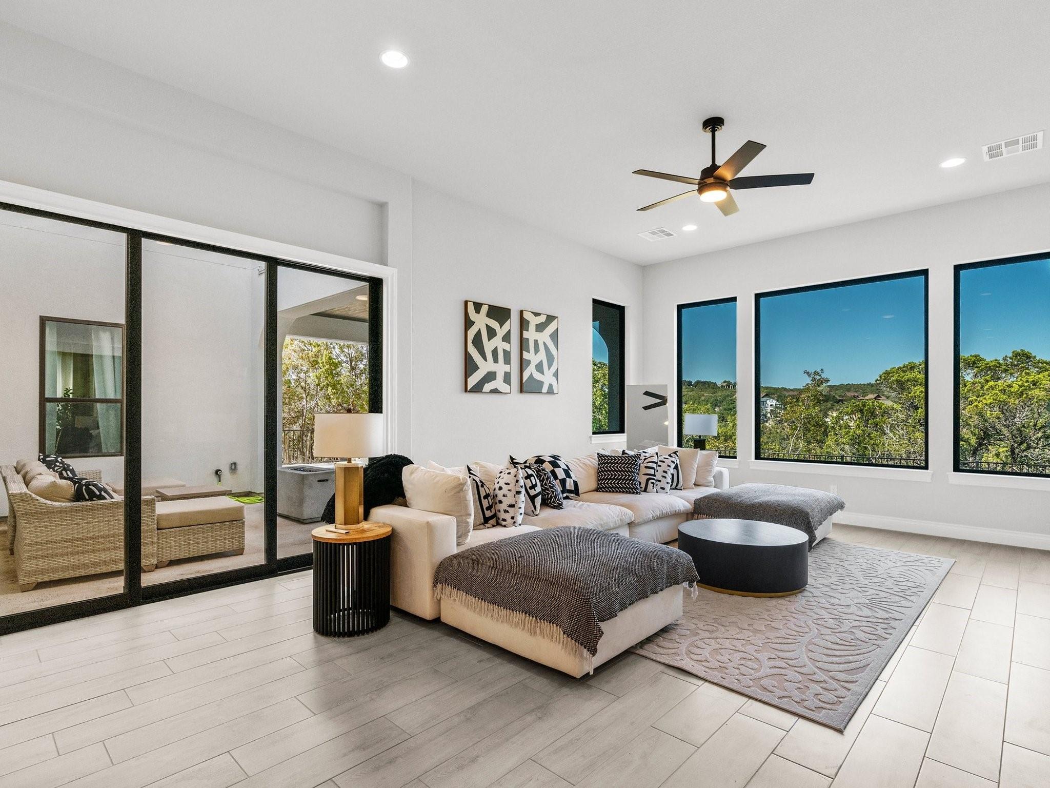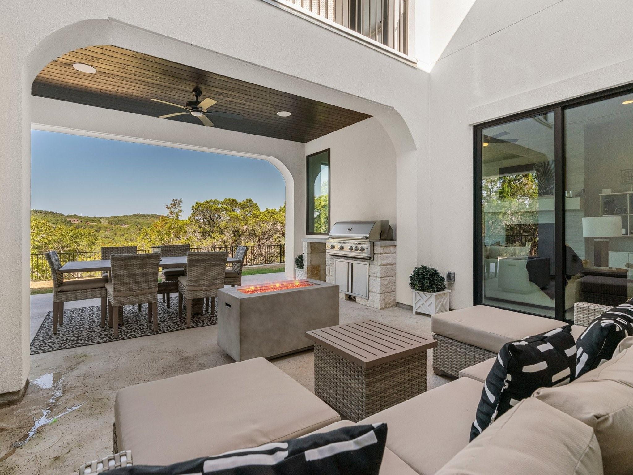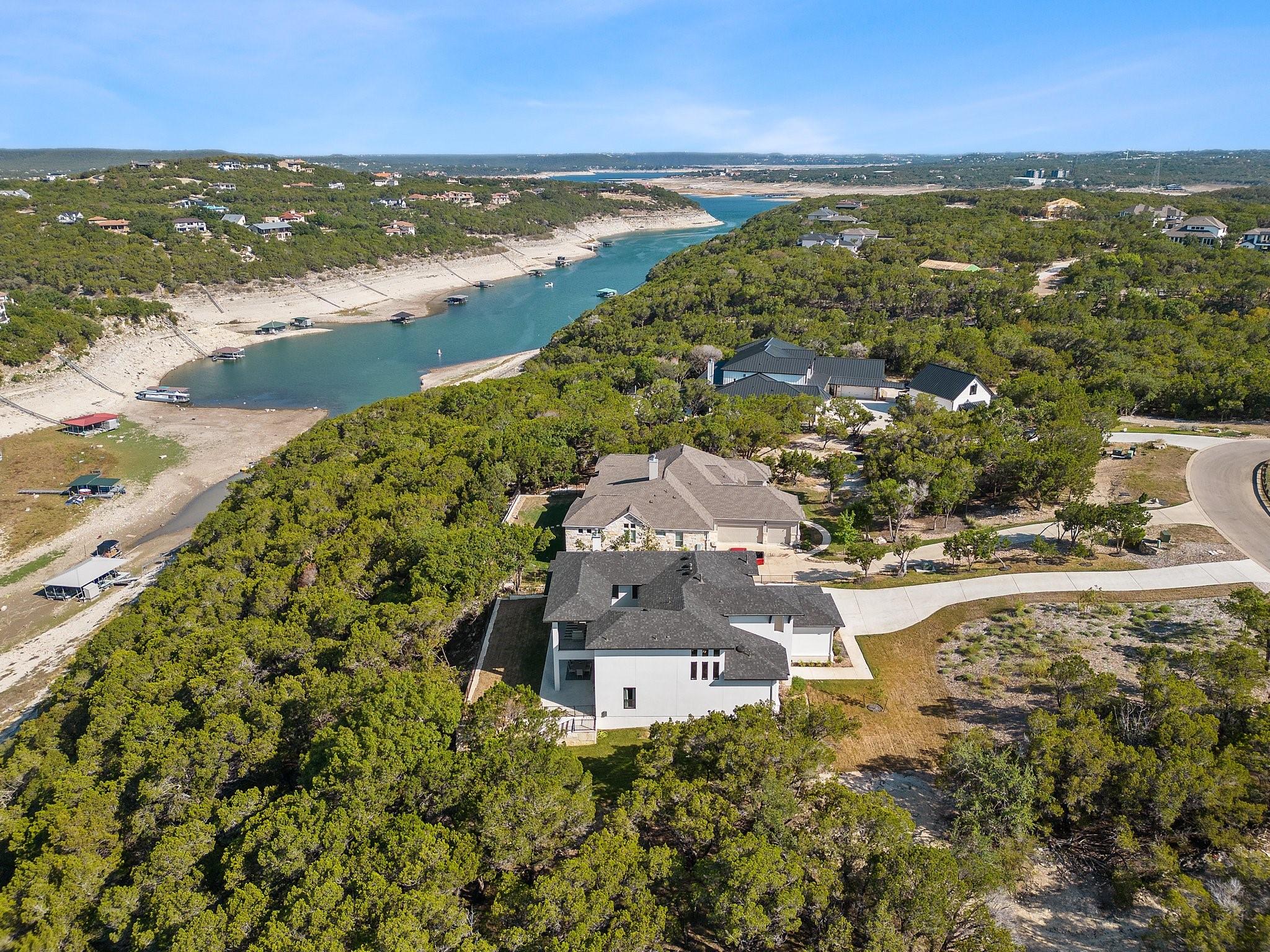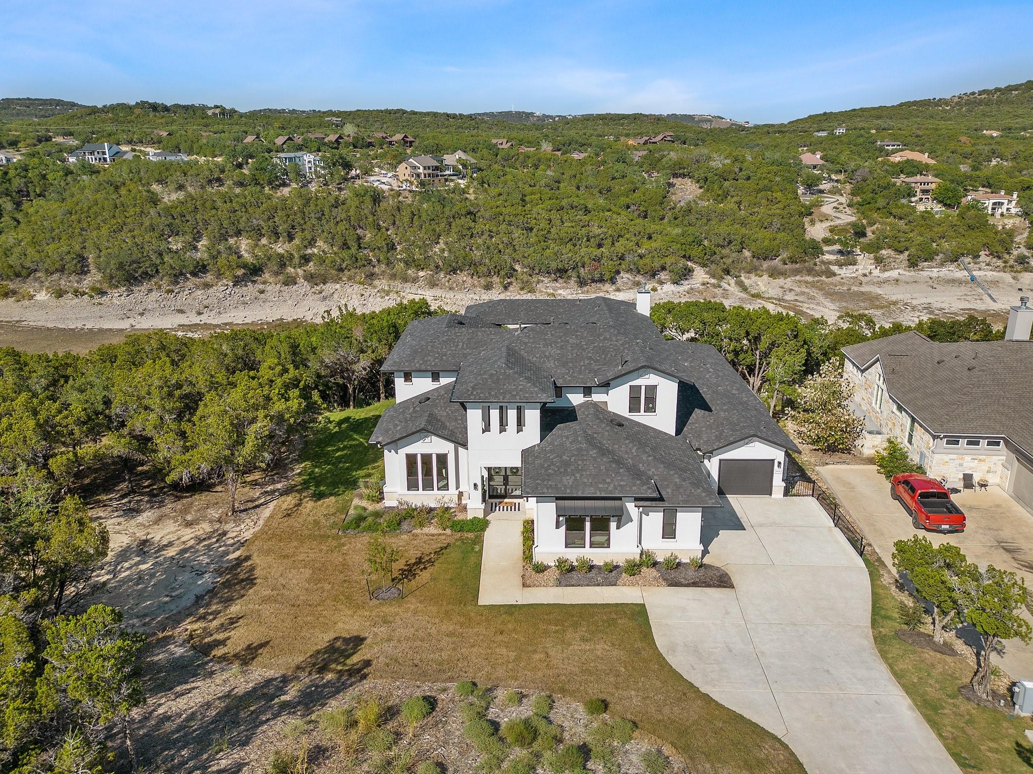Nestled on the tranquil banks of Lake Travis, near Devil's Cove, this exceptional Drees home is a testament to luxury living at its finest. With breathtaking views of rolling hills and trees gracing every vantage point along the rear of the home, this property offers a rare opportunity to immerse yourself in natural beauty and modern sophistication. As you approach, the grand exterior of this residence welcomes you with its striking architectural angles and contemporary design, showcasing meticulous attention to detail at every turn. Upon entering through the double front doors, you are immediately enveloped in an atmosphere of effortless elegance. The interior boasts an impeccable design, featuring 5 spacious bedrooms, including a primary suite with treetop views. The spa-like ensuite bath boasts a standalone soaking tub, a walk-in shower, and separate vanities, providing a sanctuary of relaxation and rejuvenation. The stunning chef's kitchen is a masterpiece, featuring quartz countertops, tile backsplash, shaker style cabinetry, and state-of-the-art appliances. The dreamy living space is bathed in natural light thanks to picture windows that frame magazine-worthy views. A cozy fireplace serves as the heart of the home, while stackable sliding glass doors seamlessly connect the interior to the outdoor living space. Step onto the elevated back patio and behold miles of unobstructed views that will leave you in awe. An outdoor grilling area and a grassy yard provide the perfect backdrop for outdoor entertainment and relaxation. Enjoy easy access to Bar-K-park, Haute Spot, Crystal Falls Golf Club, and a plethora of local eateries and shops, all within a 20-mile radius. This is all in addition to the beach club with 3 pools, a hot tub, gym, a restaurant, an additional pool area with basketball and pickleball courts plus a marina with a kayak club, right in the neighborhood. Here, you'll find a level of luxury that is unmatched!