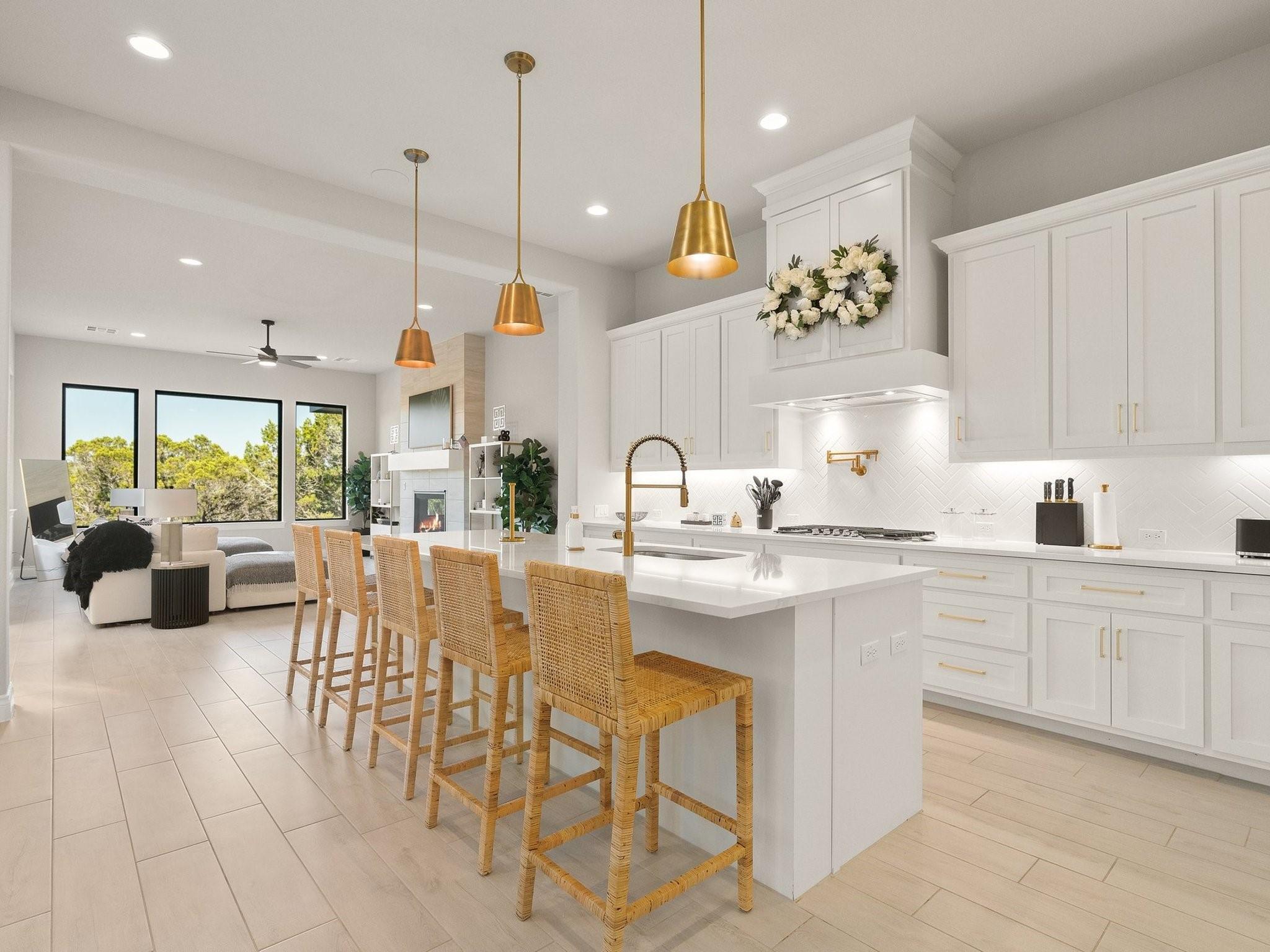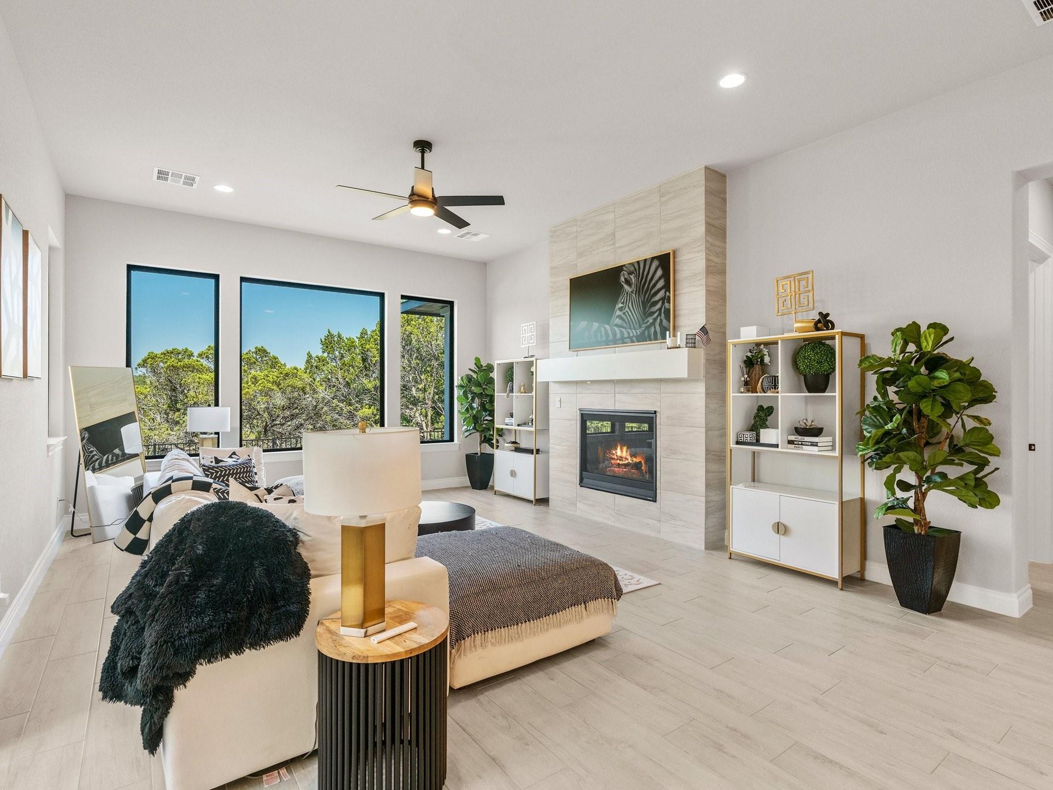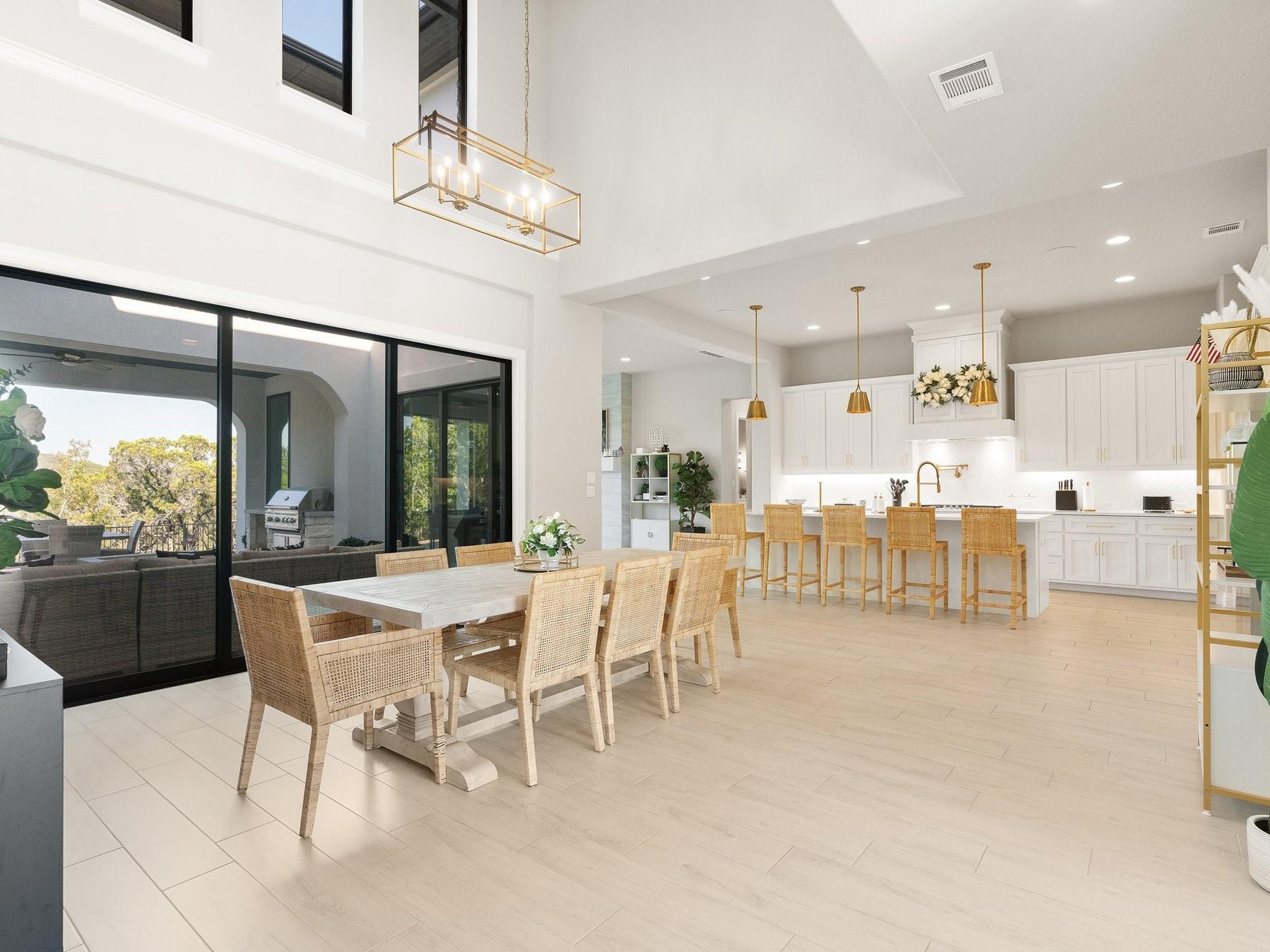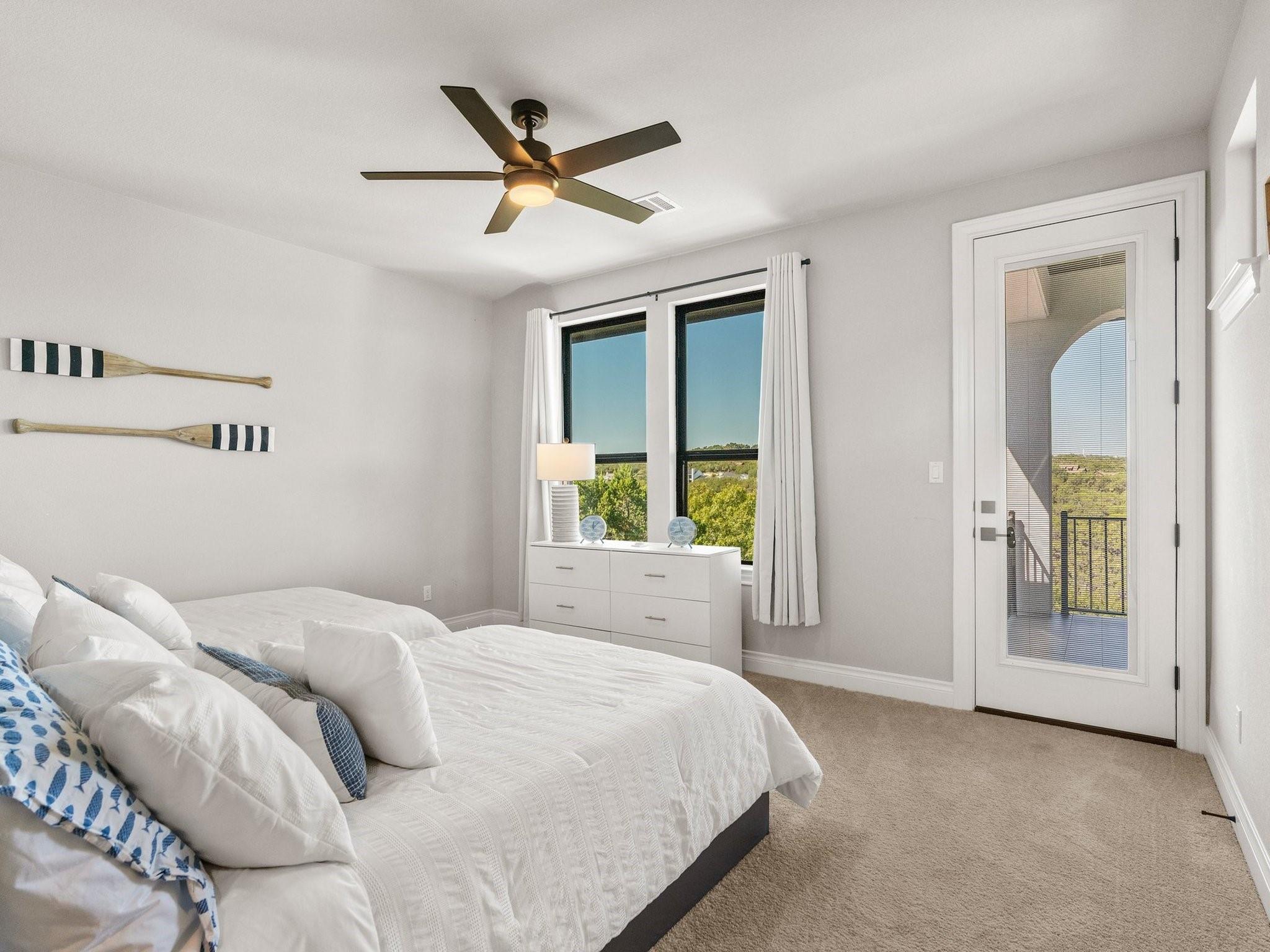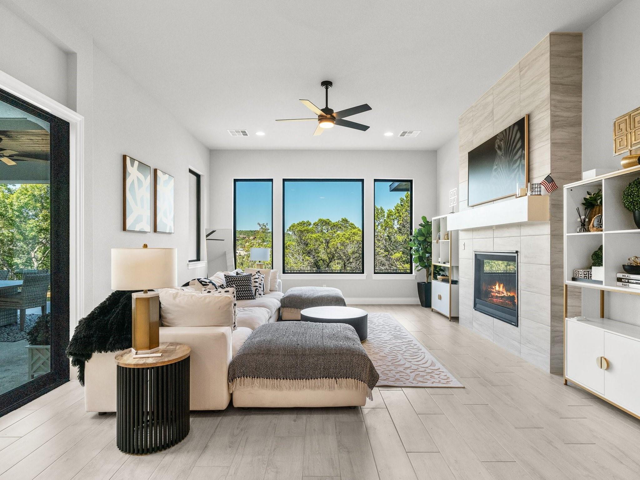 Nestled on the tranquil banks of Lake Travis, near Devil's Cove, this exceptional Drees home is a testament to luxury living at its finest. With breathtaking views of rolling hills and trees gracing every vantage point along the rear of the home, this property offers a rare opportunity to immerse yourself in natural beauty and modern sophistication. As you approach, the grand exterior of this residence welcomes you with its striking architectural angles and contemporary design, showcasing meticulous attention to detail at every turn. Upon entering through the double front doors, you are immediately enveloped in an atmosphere of effortless elegance. The interior boasts an impeccable design, featuring 5 spacious bedrooms, including a primary suite with treetop views. The spa-like ensuite bath boasts a standalone soaking tub, a walk-in shower, and separate vanities, providing a sanctuary of relaxation and rejuvenation. The stunning chef's kitchen is a masterpiece, featuring quartz countertops, tile backsplash, shaker style cabinetry, and state-of-the-art appliances. The dreamy living space is bathed in natural light thanks to picture windows that frame magazine-worthy views. A cozy fireplace serves as the heart of the home, while stackable sliding glass doors seamlessly connect the interior to the outdoor living space. Step onto the elevated back patio and behold miles of unobstructed views that will leave you in awe. An outdoor grilling area and a grassy yard provide the perfect backdrop for outdoor entertainment and relaxation. Enjoy easy access to Bar-K-park, Haute Spot, Crystal Falls Golf Club, and a plethora of local eateries and shops, all within a 20-mile radius. This is all in addition to the beach club with 3 pools, a hot tub, gym, a restaurant, an additional pool area with basketball and pickleball courts plus a marina with a kayak club, right in the neighborhood. Here, you'll find a level of luxury that is unmatched!