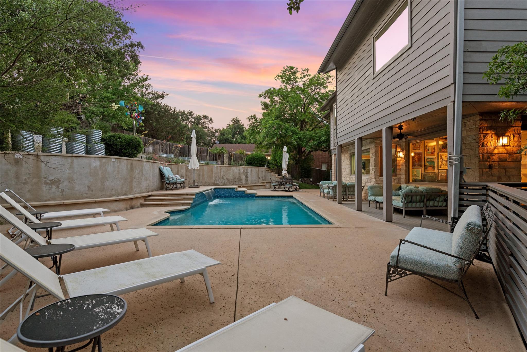 Soft Contemporary Davenport Ranch with views & large pool right outside kitchen picture window. Highly rated Bridgepoint Elementary is just steps away – and will very soon be walkable. Ignore the map, zero visual or road noise. The views are special, and the total renovation & expansion was executed with care and quality by meticulous owners. Home is essentially less than 10 years old inside and out. Two living rooms on main level, plus office tucked away. Primary suite is spectacular, with custom wood work throughout, and a hidden 3rd closet lined with cedar paneling. Large recently-replaced windows all have custom window treatments which convey. Eat-in kitchen is a magnet for family of all ages, with large center island anchoring the casual elegance. High ceilings add outstanding room volume, and don’t miss the oversized closets in every room. Ensuite baths in every bedroom. Roomy utility room with double sink, drop zone off garage and storage, storage, and more storage. The outdoor living is as sophisticated and varied as the inside. Covered patios create multiple protected areas for relaxing year-round. Pool decking is extensive, and most outdoor furnishings can convey. Views to east are sweeping and dramatic. Views to SW are of greenbelt, where there is a private gate leading to greenbelt trails which connect with Cavalcade Ct. off Riva Ridge. It’s a hiker’s paradise – and then plunge in the pool to cool down!