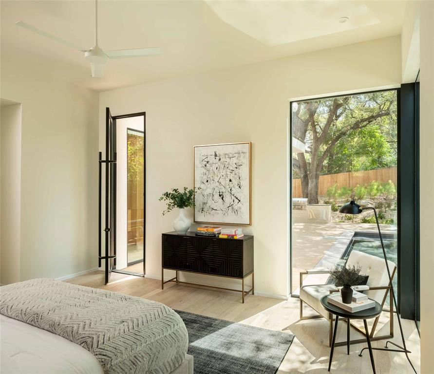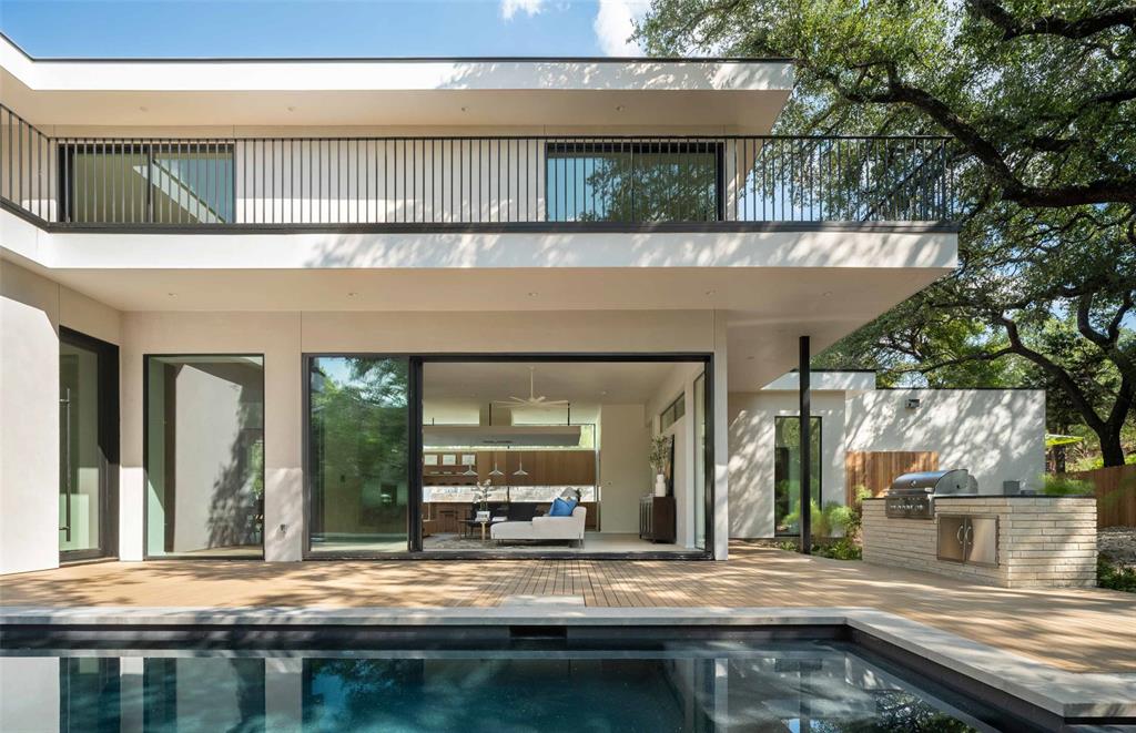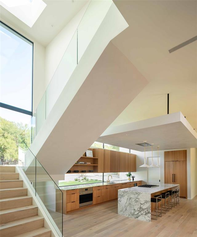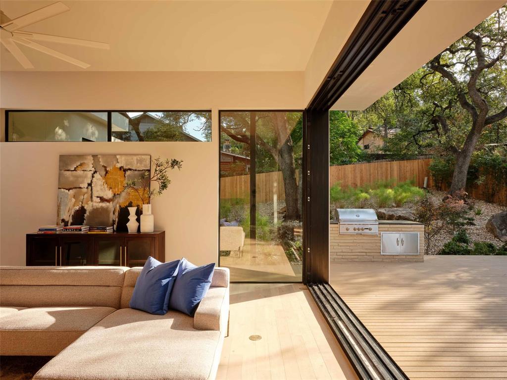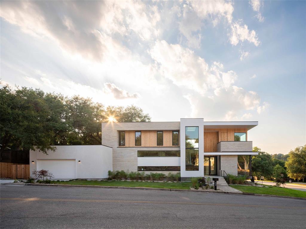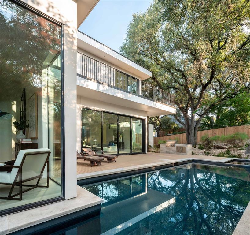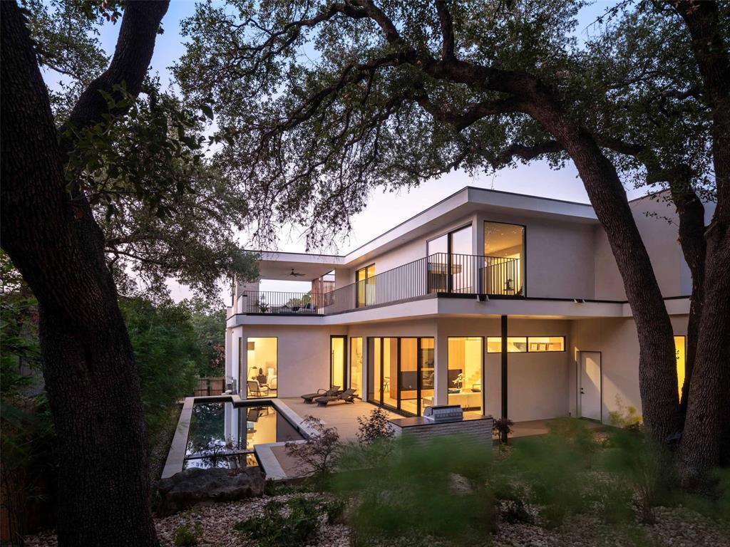Floating among live oaks on a sprawling corner lot, in a private pocket of Barton Hills, Stonehaven stands as a home of meaningful experience. This stunning new residence at 2601 Barton Hills Drive was designed, curated, and built by the award-winning firm Joseph Design Build. Pairing impeccable craftsmanship with premium finishes, it offers thoughtfully designed living spaces that inspire and uplift. Past the grand entryway and terraced fountain, you’ll enter an inviting entertaining area warmly lit by a glass canopy above the kitchen and a wall of floor-to-ceiling telescopic doors that connect directly to the private backyard. The open kitchen includes grain-matched White Oak cabinetry, Arabescato Marble countertops, and a complete Wolf and Sub-Zero appliance package, perfect for even the most seasoned chefs. Stepping through the sliding doors, you’ll find a sparkling pool, spa, and lounge patio area encircled by a lush landscape. Framing the space from above is an expansive wraparound terrace, highlighted by a stone-wrapped covered fireplace. The terrace is one of several spots to enjoy panoramic Greenbelt views and gorgeous sherbet-colored sunsets. Off the lower level sits the private primary suite, a sanctuary of skylights and sophisticated finishes. It includes a spa-style bath with a freestanding soaking tub and marble-wrapped walk-in shower, alongside a custom California-style wardrobe closet. The upper level holds the remaining bedrooms, a spacious home office, a second den, and a large flex room with floor-to-ceiling windows, ideal for a home gym or theater. The entire design is brimming with sustainable elements, including energy-efficient windows, appliances, and insulation, smart thermostats, low-VOC flooring and paint, and more. Full details at jdbatx.com/available/2601-barton-hills