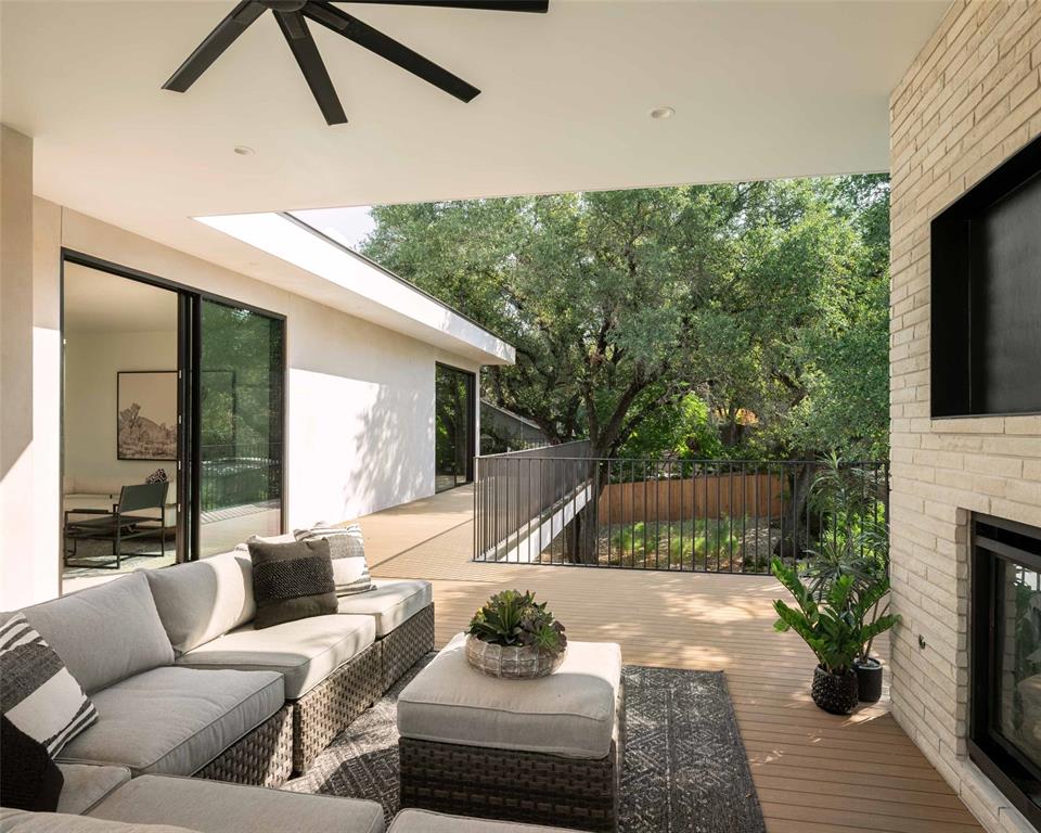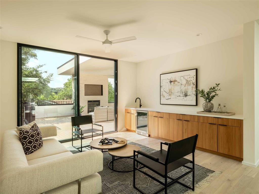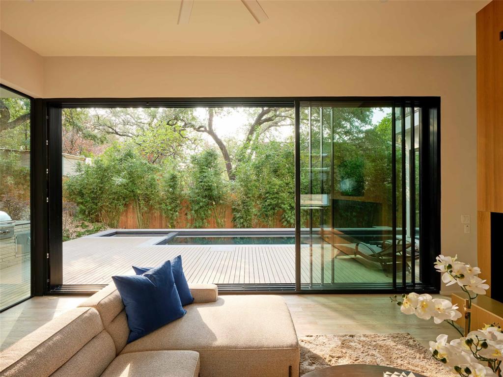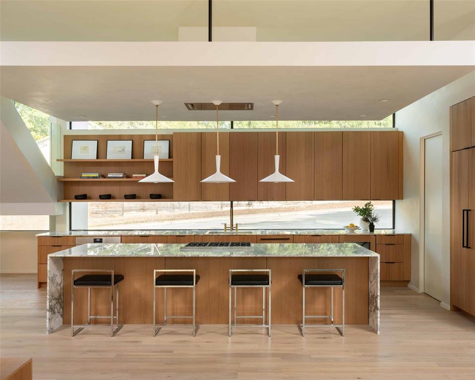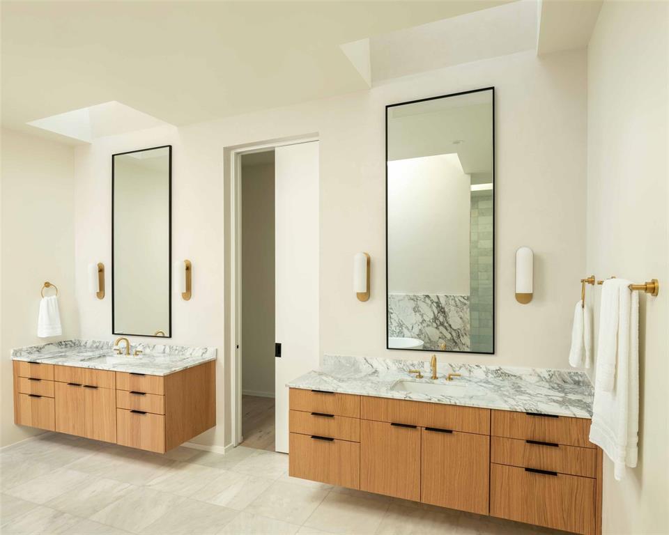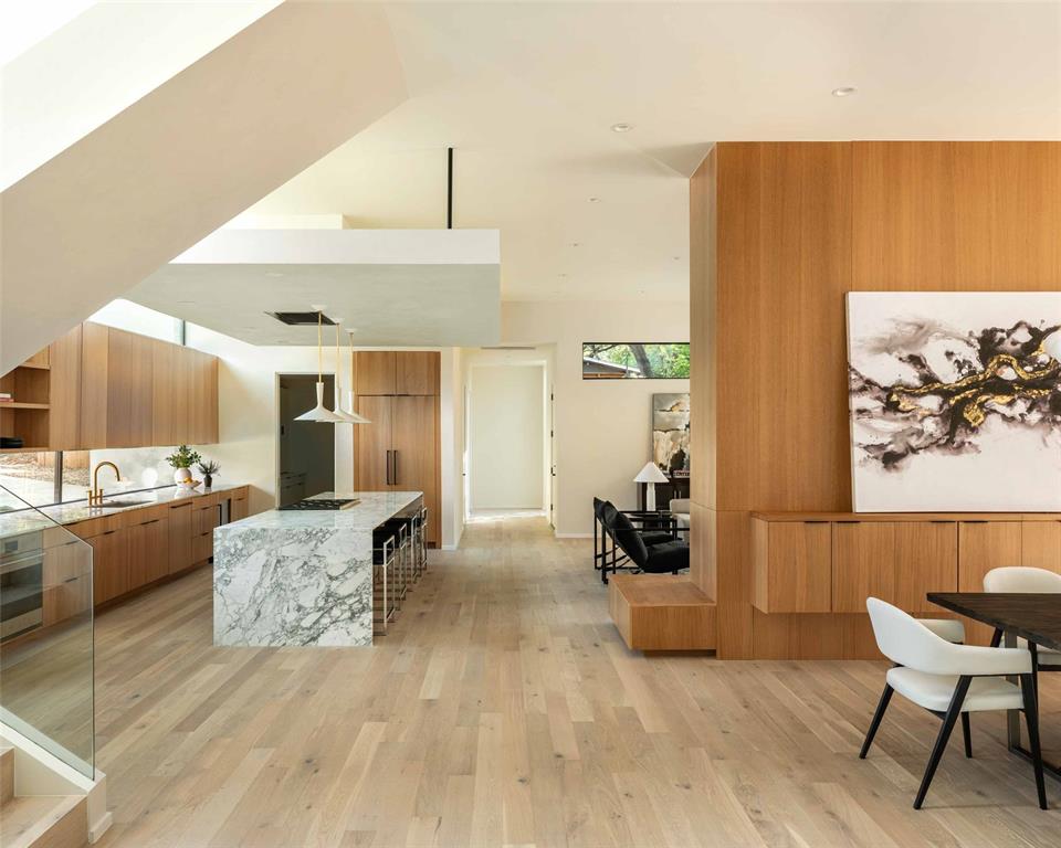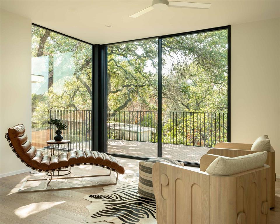 Floating among live oaks on a sprawling corner lot, in a private pocket of Barton Hills, Stonehaven stands as a home of meaningful experience. This stunning new residence at 2601 Barton Hills Drive was designed, curated, and built by the award-winning firm Joseph Design Build. Pairing impeccable craftsmanship with premium finishes, it offers thoughtfully designed living spaces that inspire and uplift. Past the grand entryway and terraced fountain, you’ll enter an inviting entertaining area warmly lit by a glass canopy above the kitchen and a wall of floor-to-ceiling telescopic doors that connect directly to the private backyard. The open kitchen includes grain-matched White Oak cabinetry, Arabescato Marble countertops, and a complete Wolf and Sub-Zero appliance package, perfect for even the most seasoned chefs. Stepping through the sliding doors, you’ll find a sparkling pool, spa, and lounge patio area encircled by a lush landscape. Framing the space from above is an expansive wraparound terrace, highlighted by a stone-wrapped covered fireplace. The terrace is one of several spots to enjoy panoramic Greenbelt views and gorgeous sherbet-colored sunsets. Off the lower level sits the private primary suite, a sanctuary of skylights and sophisticated finishes. It includes a spa-style bath with a freestanding soaking tub and marble-wrapped walk-in shower, alongside a custom California-style wardrobe closet. The upper level holds the remaining bedrooms, a spacious home office, a second den, and a large flex room with floor-to-ceiling windows, ideal for a home gym or theater. The entire design is brimming with sustainable elements, including energy-efficient windows, appliances, and insulation, smart thermostats, low-VOC flooring and paint, and more. Full details at jdbatx.com/available/2601-barton-hills