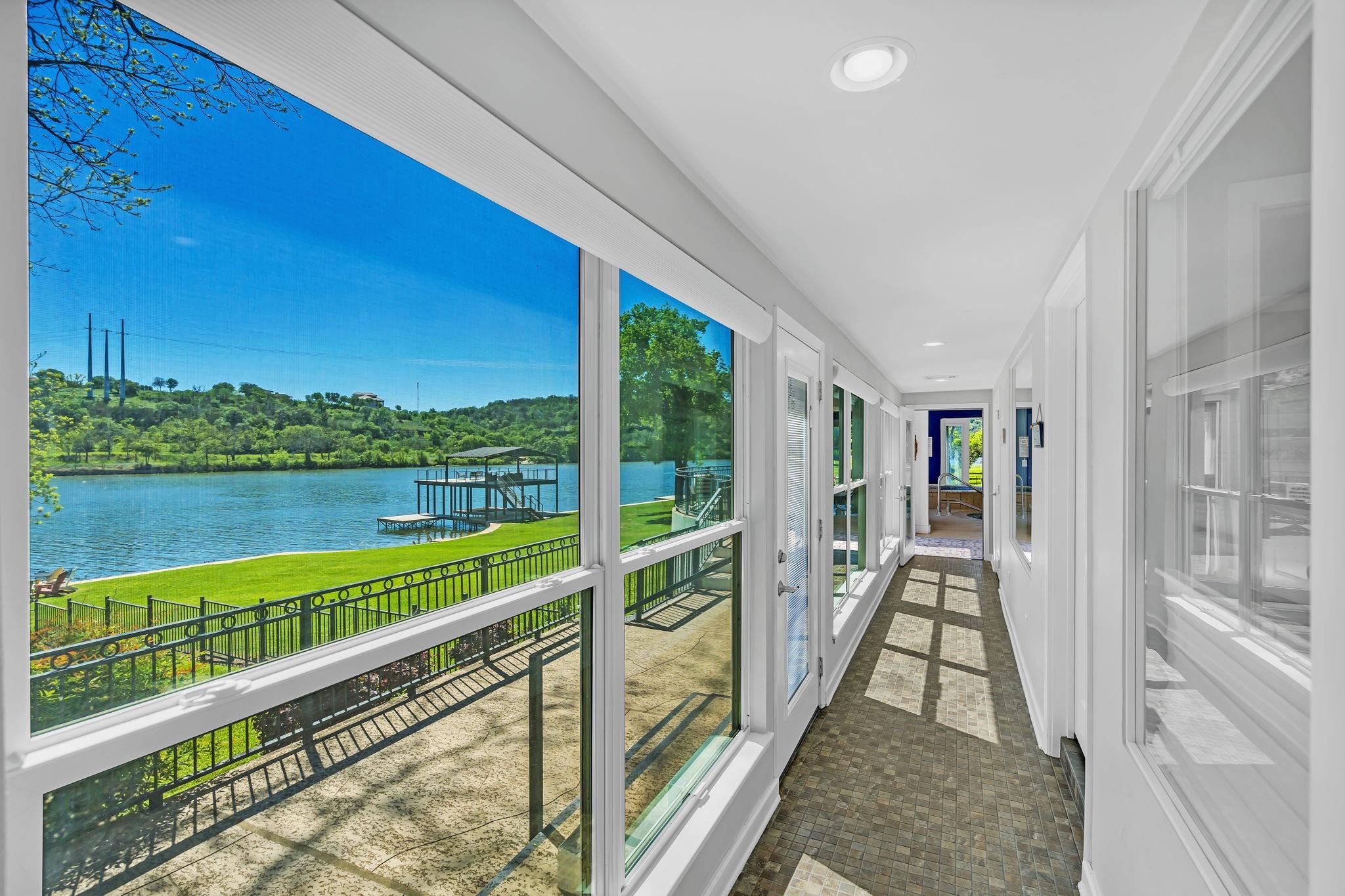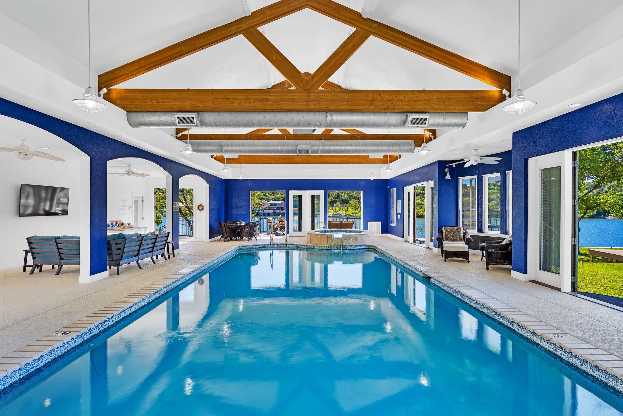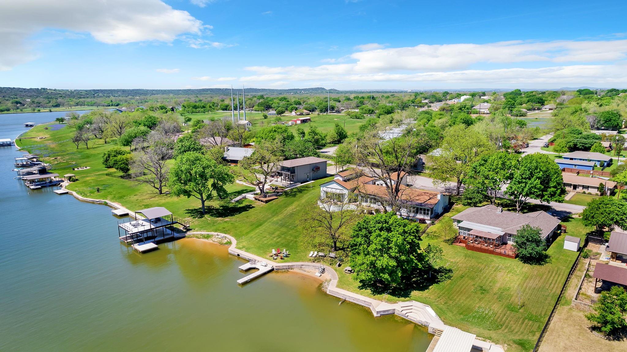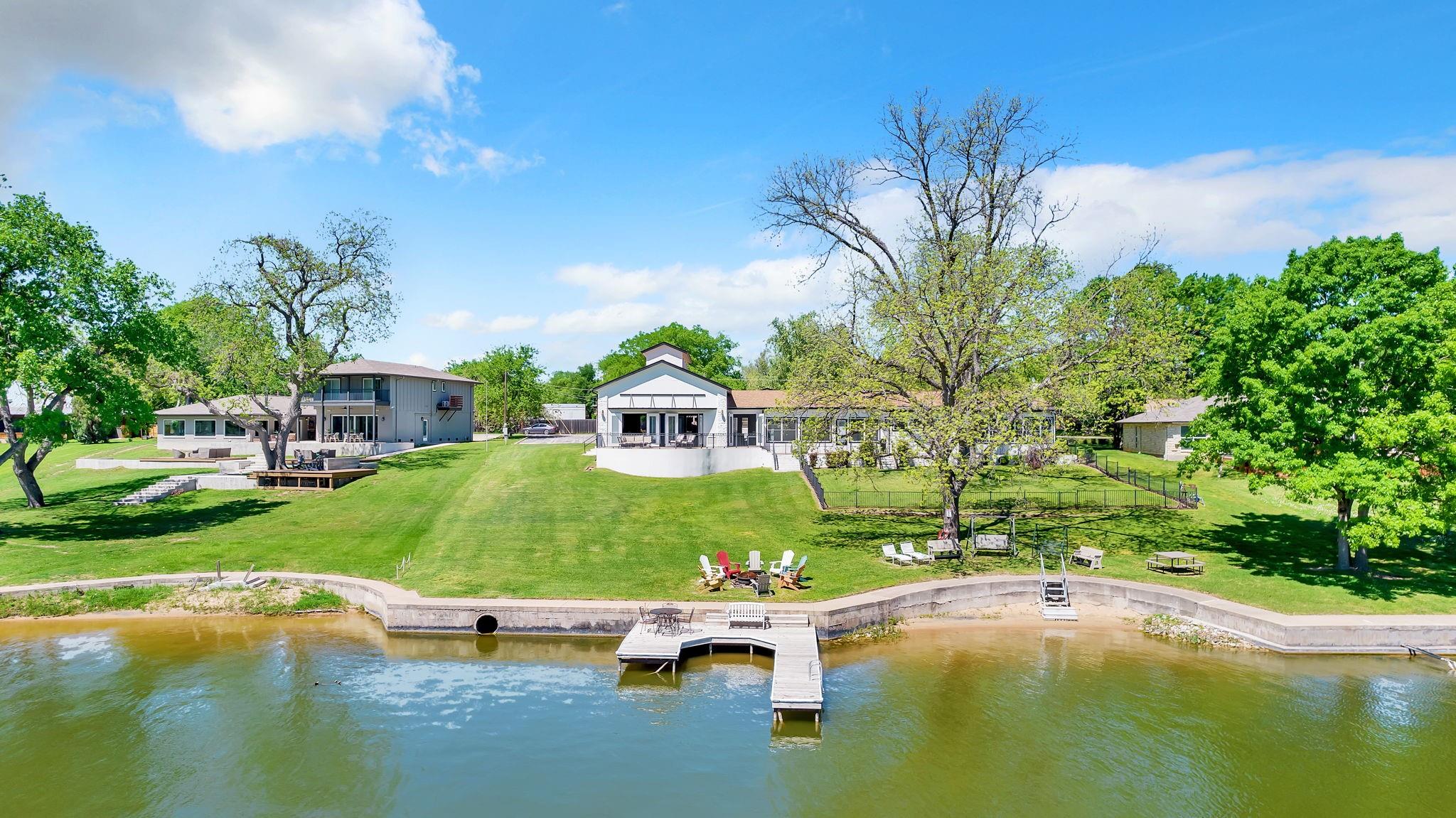 This amazing Lake Marble Falls property offers a fantastic opportunity for luxurious waterfront living or a vacation rental investment. With a newly remodeled 2525 sq ft home, featuring 4 bedrooms and 3 baths, it provides ample living space (sleeps 12) for full-time residents, weekend visitors, or short-term renters. The vibrant and urban-themed décor adds a modern touch to the property with furnishings to convey with the sale (excluding a few items). The highlight of this property is the impressive 2179 sq ft natatorium, which includes a heated pool, spa, and seating areas. The climate-controlled environment with a commercial-grade dehumidifying HVAC system ensures year-round comfort for residents and guests. Other features include a fenced yard, parking for 15+, and 3 garages, including space for an RV. Outside, the property boasts large pecan trees, a lush lawn gently sloping towards the 130 ft of waterfront, complete with a beach area, retaining wall, boat dock, and pier. Located at the heart of the Hill Country in Marble Falls, just 50 miles northwest of Austin and 85 miles north of San Antonio, this property offers a convenient escape from city life while still being within reach of major urban centers. Don't miss this unique opportunity to experience lakeside living at its best, whether as a primary residence, a vacation home, or a lucrative short-term rental. Available for Showings starting Thursday, 4/11.
