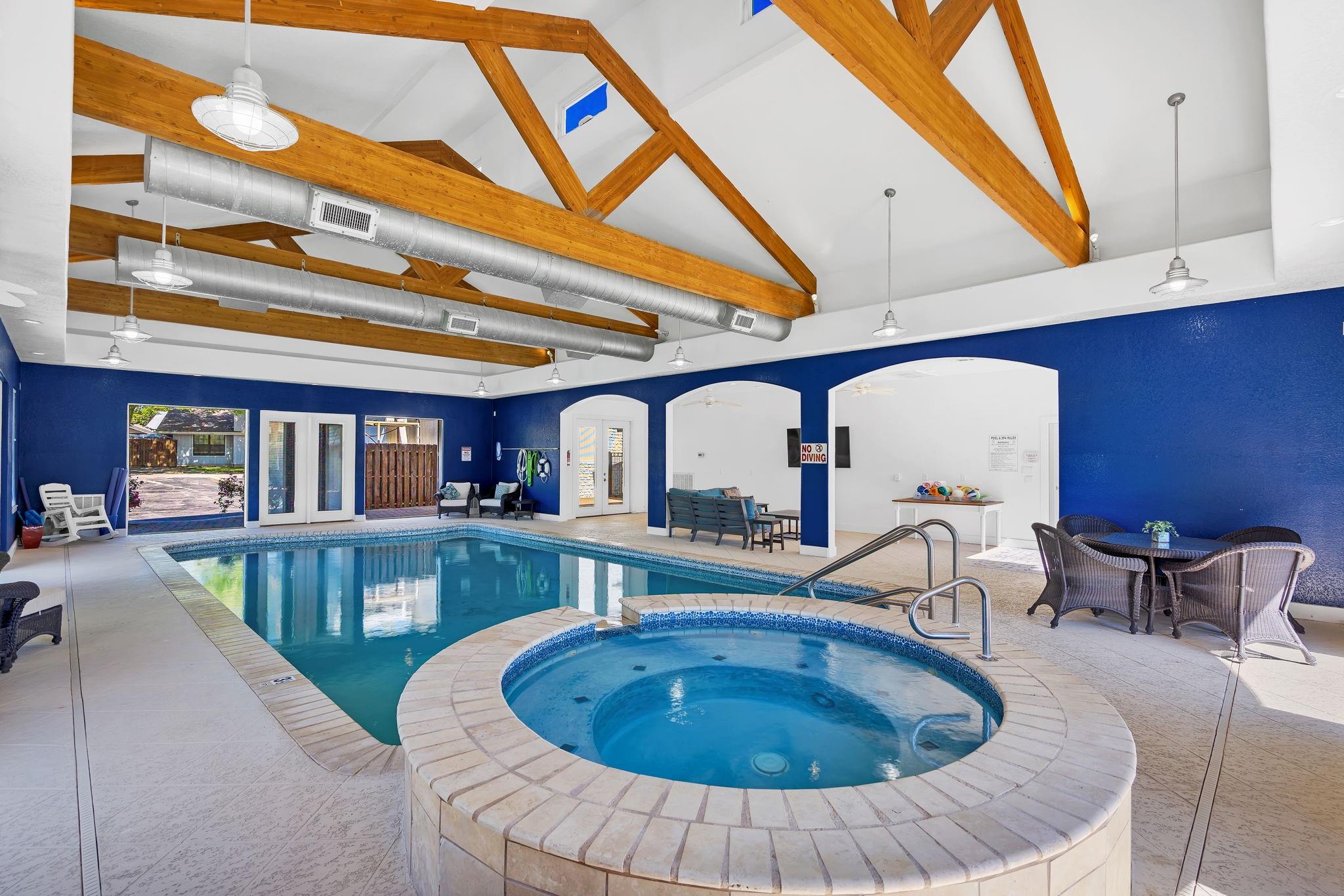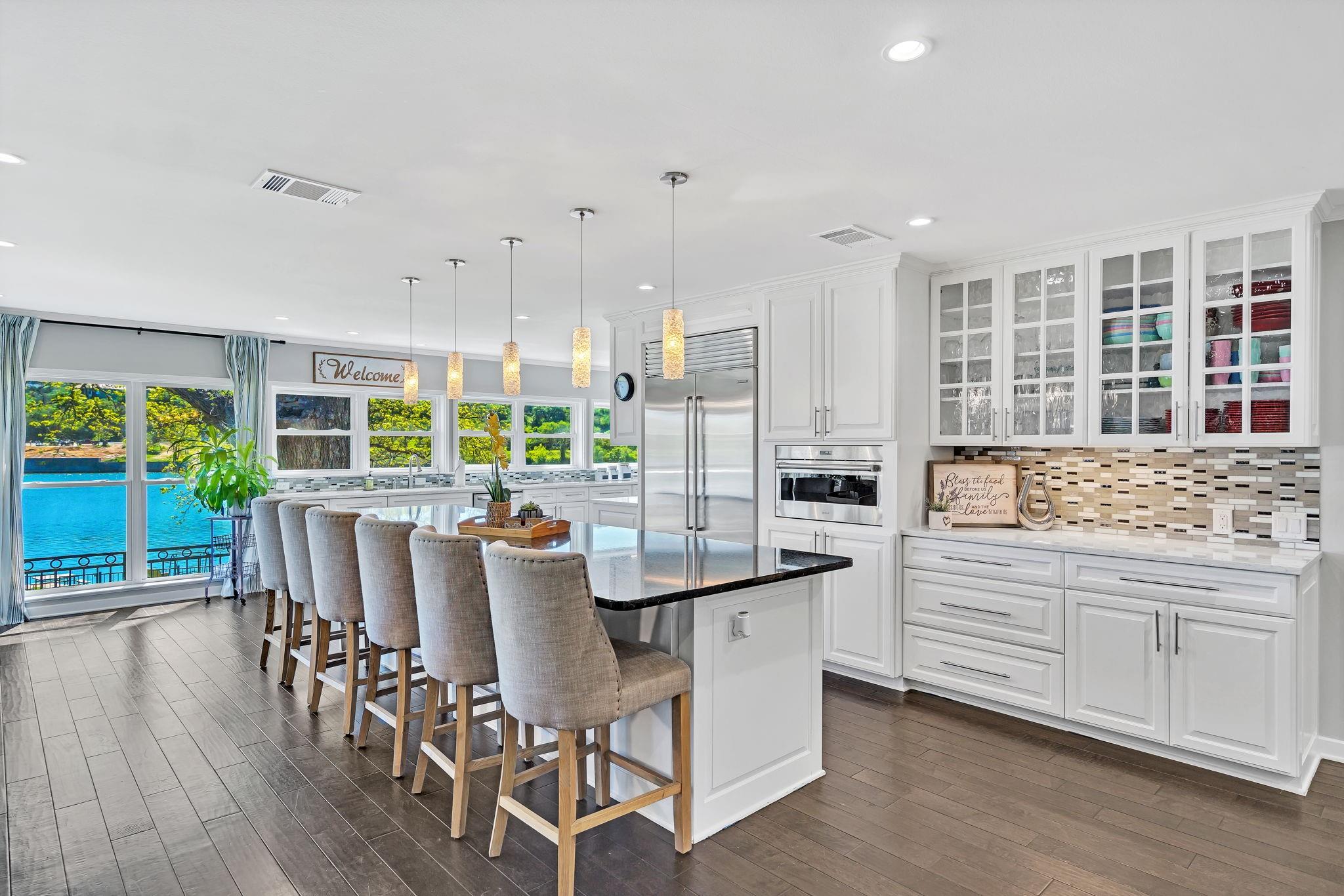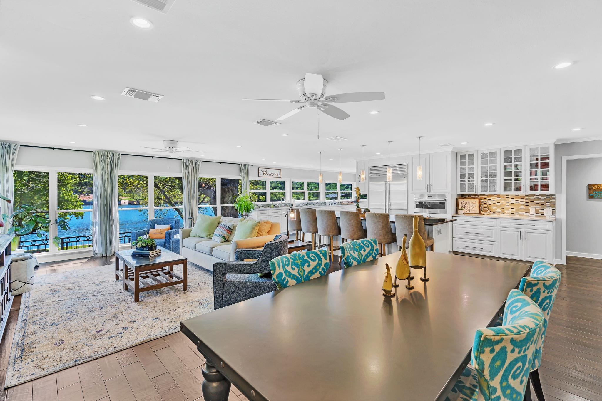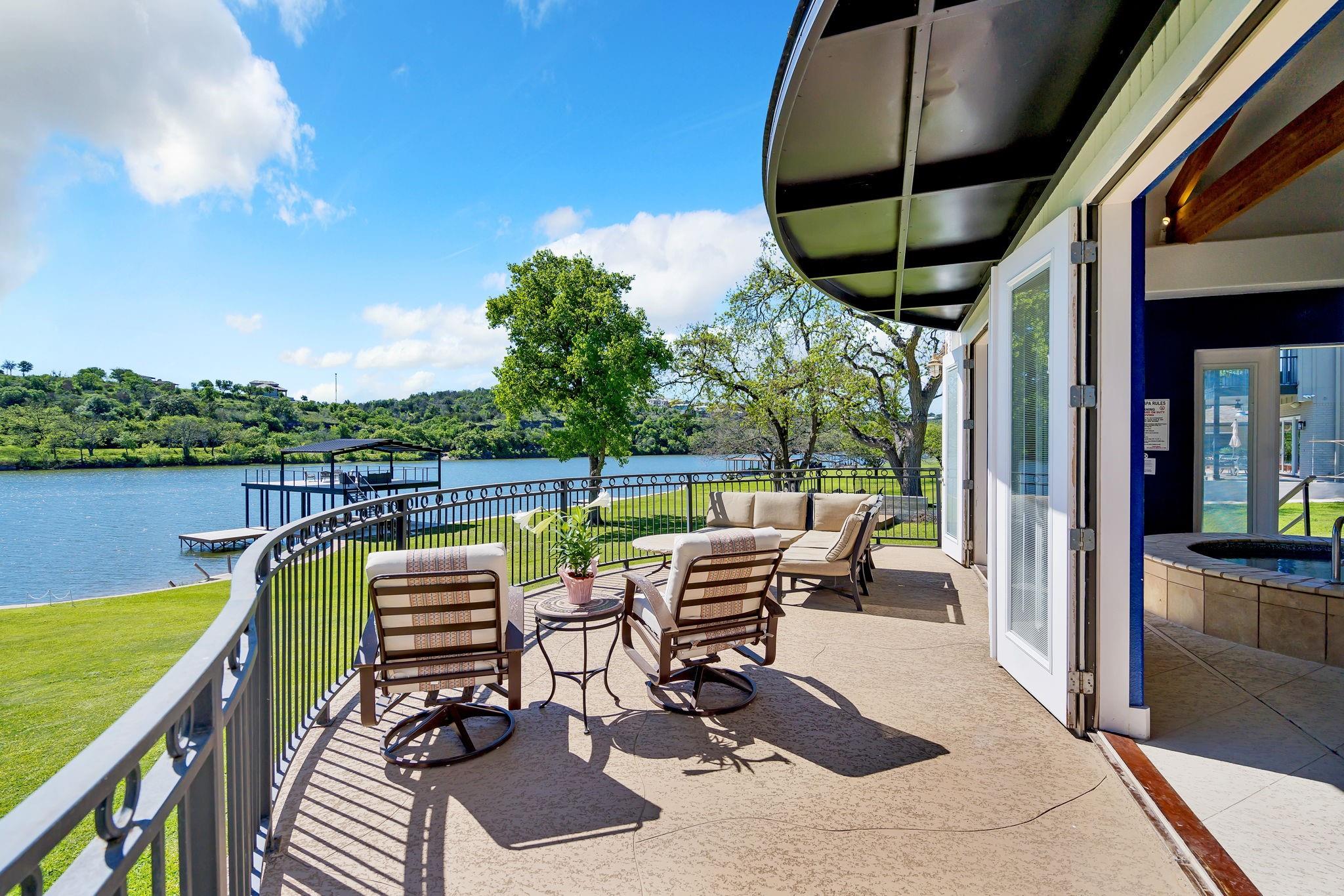 This amazing Lake Marble Falls property offers a fantastic opportunity for luxurious waterfront living or a vacation rental investment. With a newly remodeled 2525 sq ft home, featuring 4 bedrooms and 3 baths, it provides ample living space (sleeps 12) for full-time residents, weekend visitors, or short-term renters. The vibrant and urban-themed décor adds a modern touch to the property with furnishings to convey with the sale (excluding a few items). The highlight of this property is the impressive 2179 sq ft natatorium, which includes a heated pool, spa, and seating areas. The climate-controlled environment with a commercial-grade dehumidifying HVAC system ensures year-round comfort for residents and guests. Other features include a fenced yard, parking for 15+, and 3 garages, including space for an RV. Outside, the property boasts large pecan trees, a lush lawn gently sloping towards the 130 ft of waterfront, complete with a beach area, retaining wall, boat dock, and pier. Located at the heart of the Hill Country in Marble Falls, just 50 miles northwest of Austin and 85 miles north of San Antonio, this property offers a convenient escape from city life while still being within reach of major urban centers. Don't miss this unique opportunity to experience lakeside living at its best, whether as a primary residence, a vacation home, or a lucrative short-term rental. Available for Showings starting Thursday, 4/11.