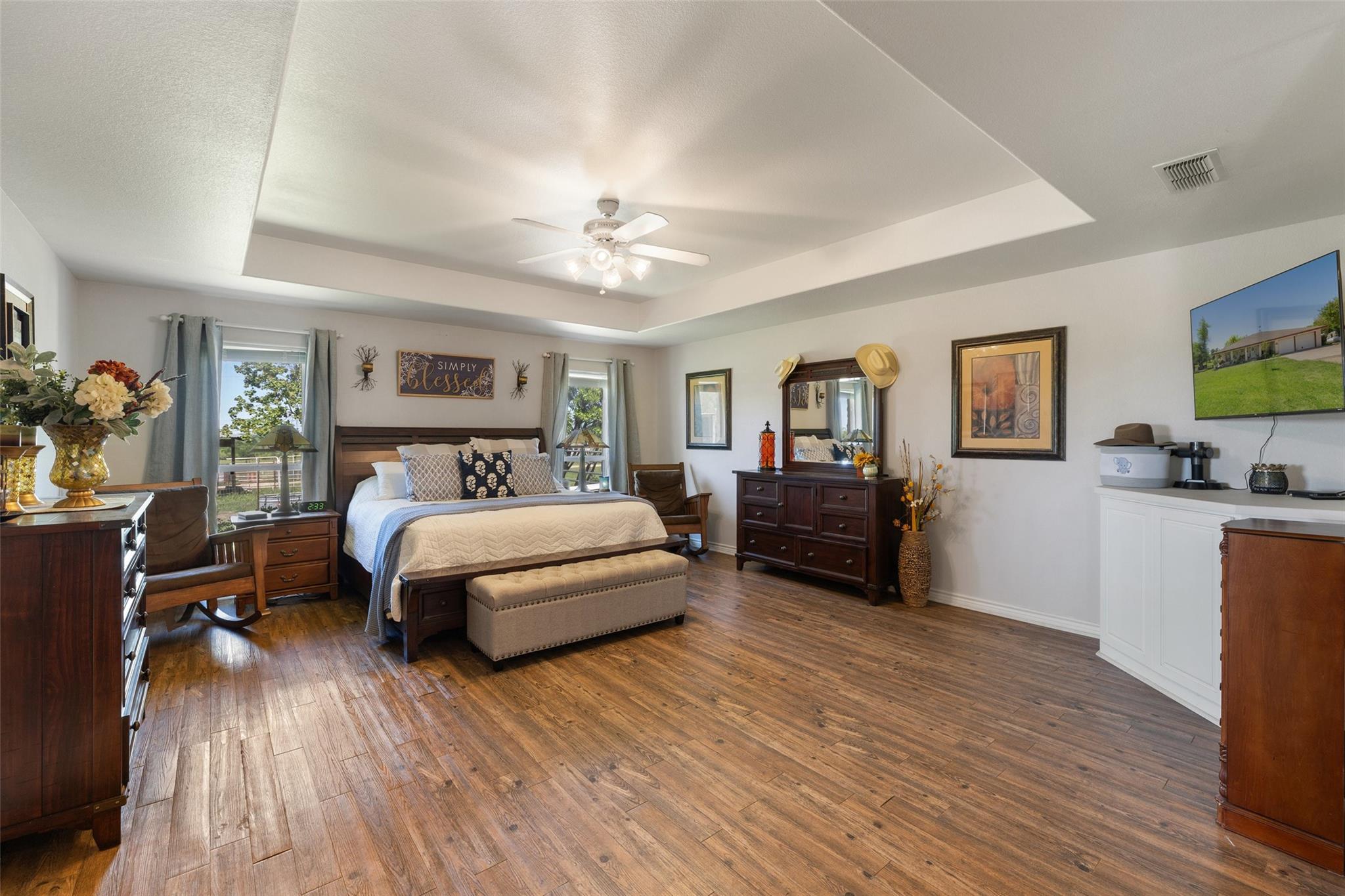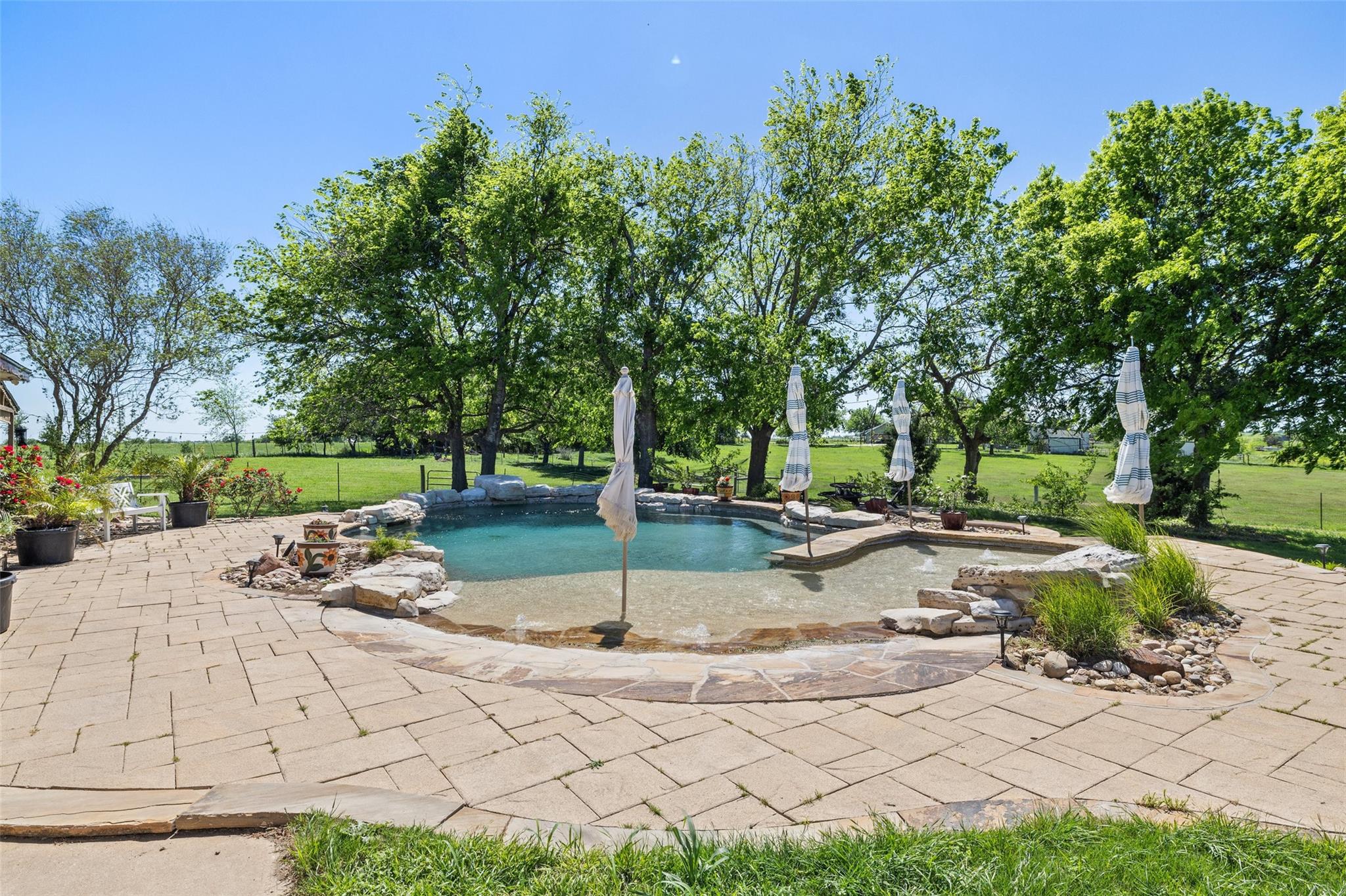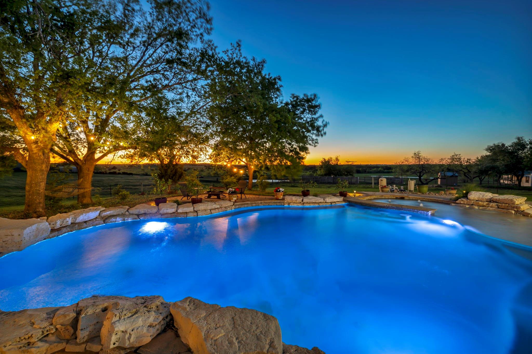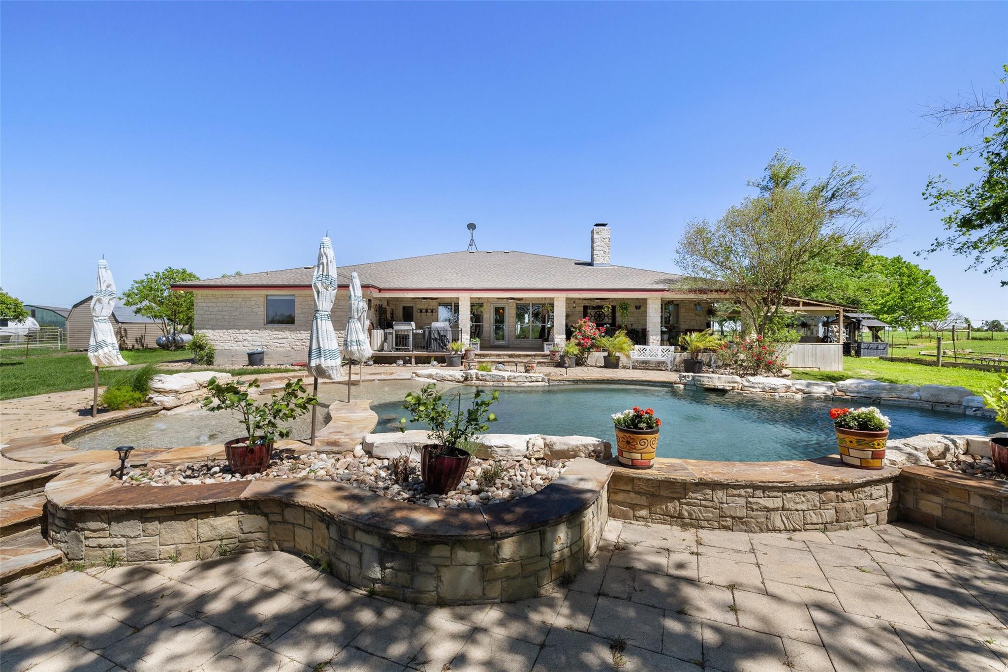 Welcome home! This gem is the perfect blend of luxury and comfort. Upon entering, you're greeted by a formal dining room and an office. The kitchen is a chef's paradise, complete with ample cabinetry, double ovens, stainless steel appliances, and an island fit for culinary creations. The family room boasts a cozy wood burning fireplace. Owner's retreat includes an ensuite bath with his and hers vanities, walk-in closet, separate shower and a garden tub with a fantastic view! Step outside to an outdoor living center oasis with gorgeous countryside views and a resort-style pool that features a waterfall and a large beach area with umbrellas! Enjoy over 30 acres of farm/equestrian land with two storage buildings, stock ponds, pens and fences. Guest quarters that include an additional 2 bed/2bath sit on its own parcel with its own power, propane, water and septic. A backup generator for the main home and pool were installed in 2021. Pool pumps with cellular control and HVAC for the main home were added in 2019. The back of the property faces downtown Taylor and is just a short 12 minute drive from the Samsung Semiconductor facility!