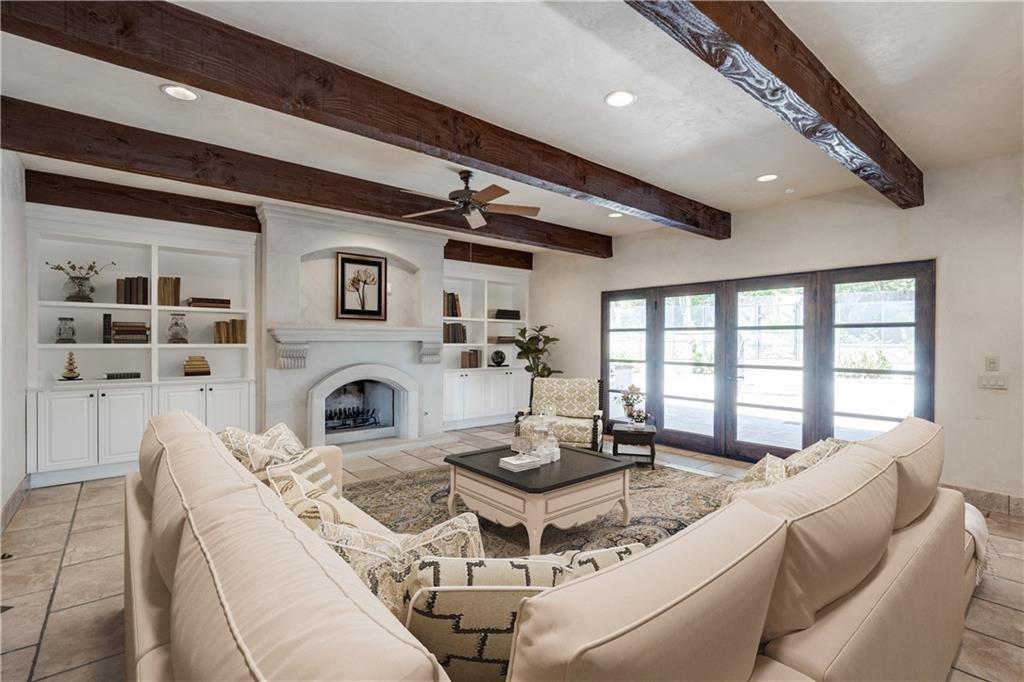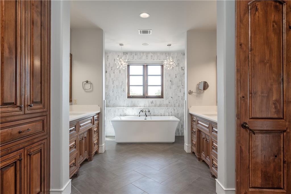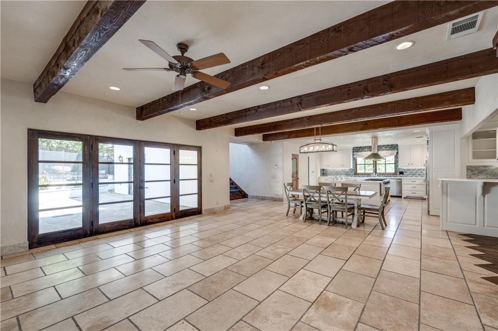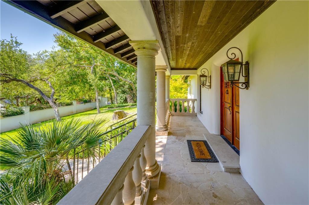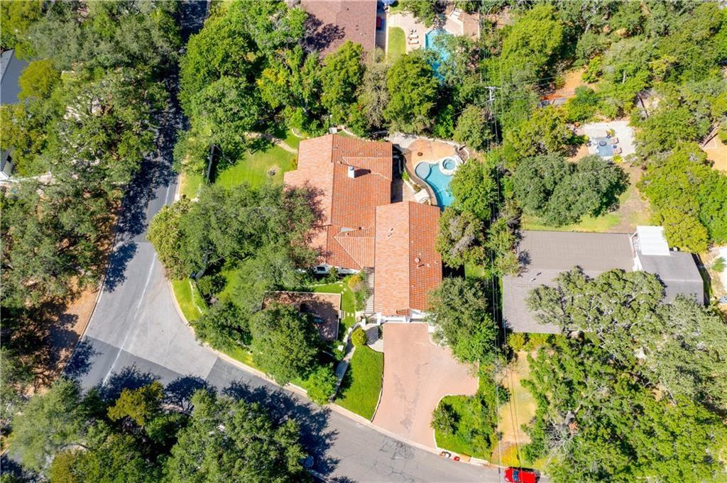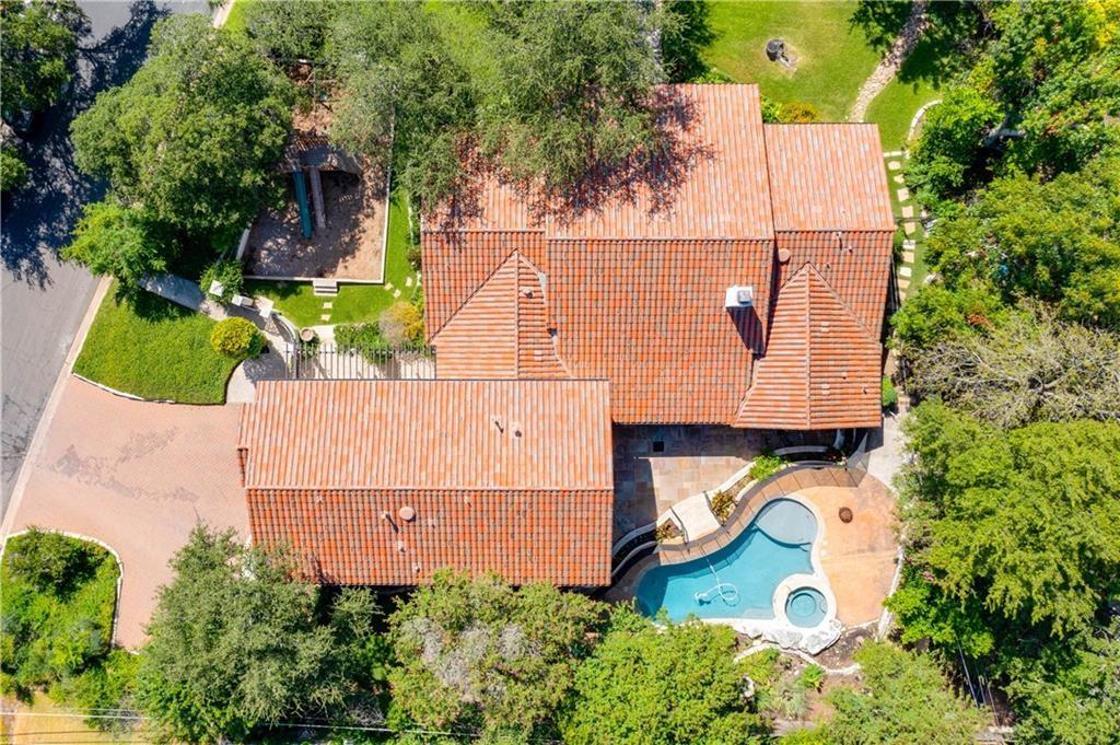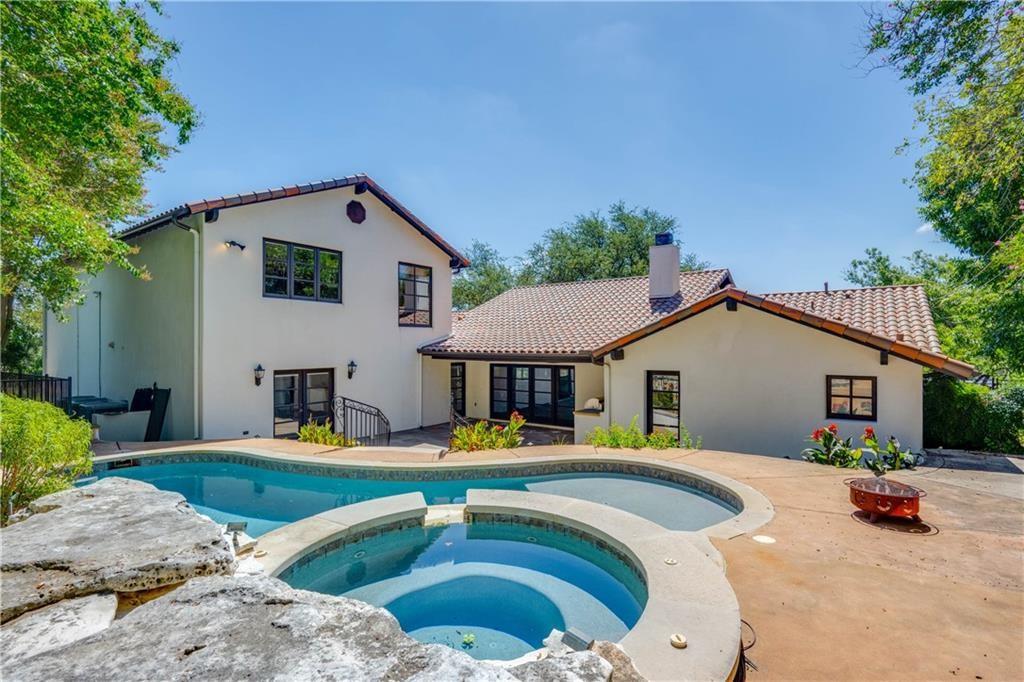 Fantastic location less than 6 miles from downtown, and easy access to The Domain and North Austin Tech corridor. This private estate offers Spanish influence beautifully blended with the latest high-end finishes. The lush pool area is right out of a magazine, and includes gorgeous flowering landscape and waterfalls. Inside, you'll find rich dark beamed ceiling, wood floors, a cast stone fireplace, a wall of French doors, and massive marble island-kitchen with a Viking gas cooktop. the kitchen is further finished with handmade glass backsplash. Primary suite features an elegant marble shower/tub area, a private office, 2 walk-ins & views!