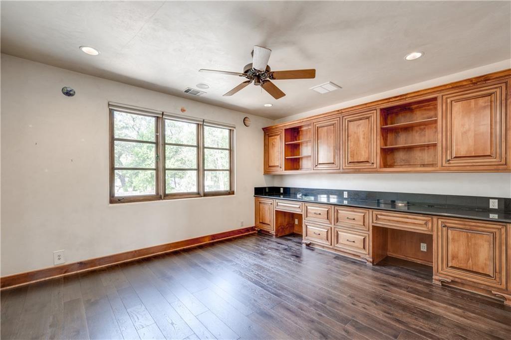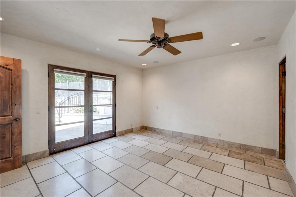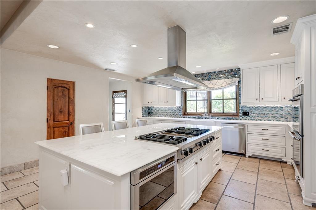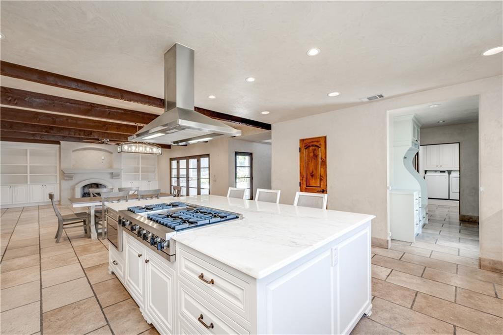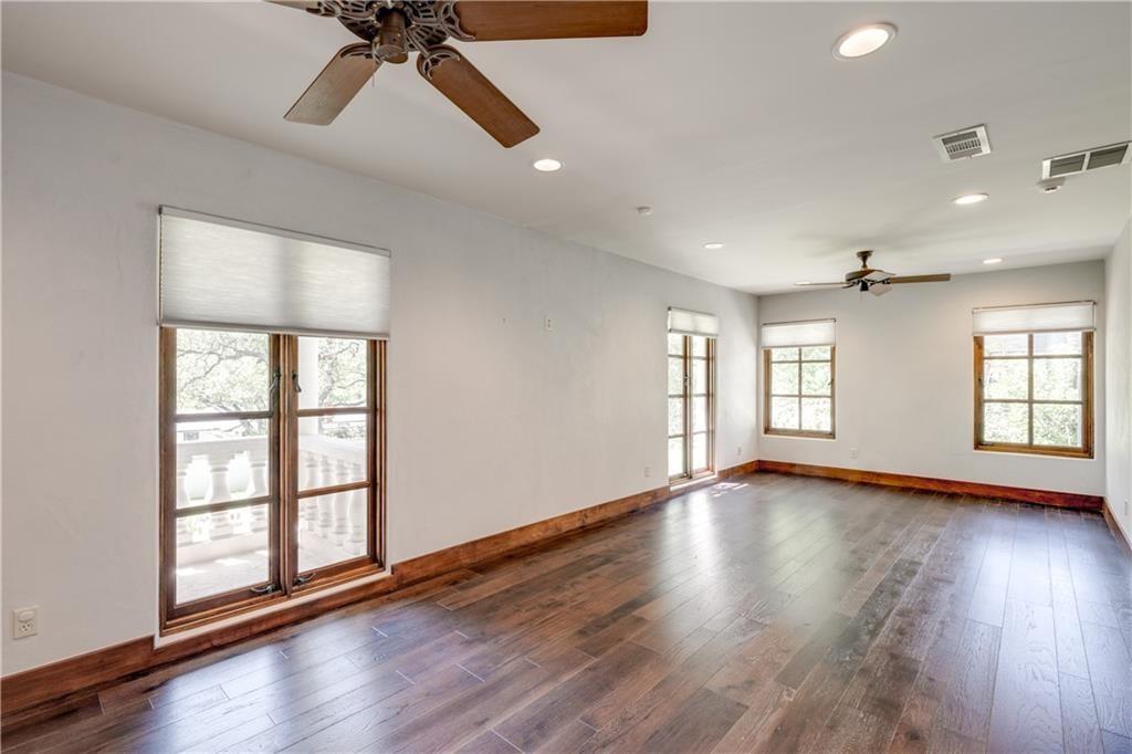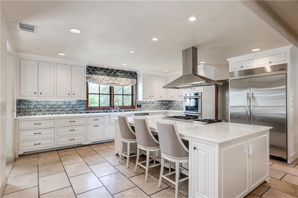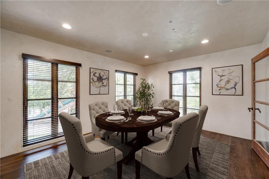 Fantastic location less than 6 miles from downtown, and easy access to The Domain and North Austin Tech corridor. This private estate offers Spanish influence beautifully blended with the latest high-end finishes. The lush pool area is right out of a magazine, and includes gorgeous flowering landscape and waterfalls. Inside, you'll find rich dark beamed ceiling, wood floors, a cast stone fireplace, a wall of French doors, and massive marble island-kitchen with a Viking gas cooktop. the kitchen is further finished with handmade glass backsplash. Primary suite features an elegant marble shower/tub area, a private office, 2 walk-ins & views!