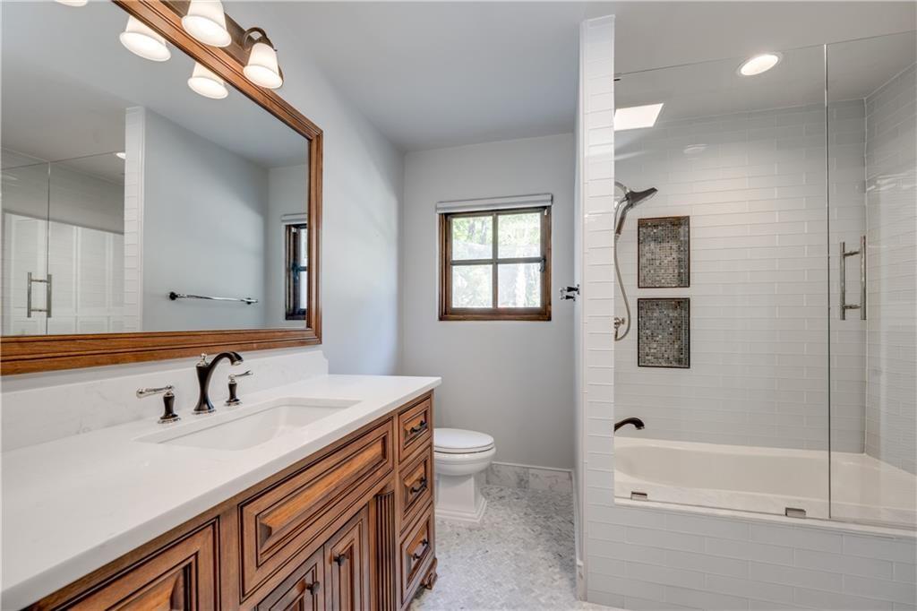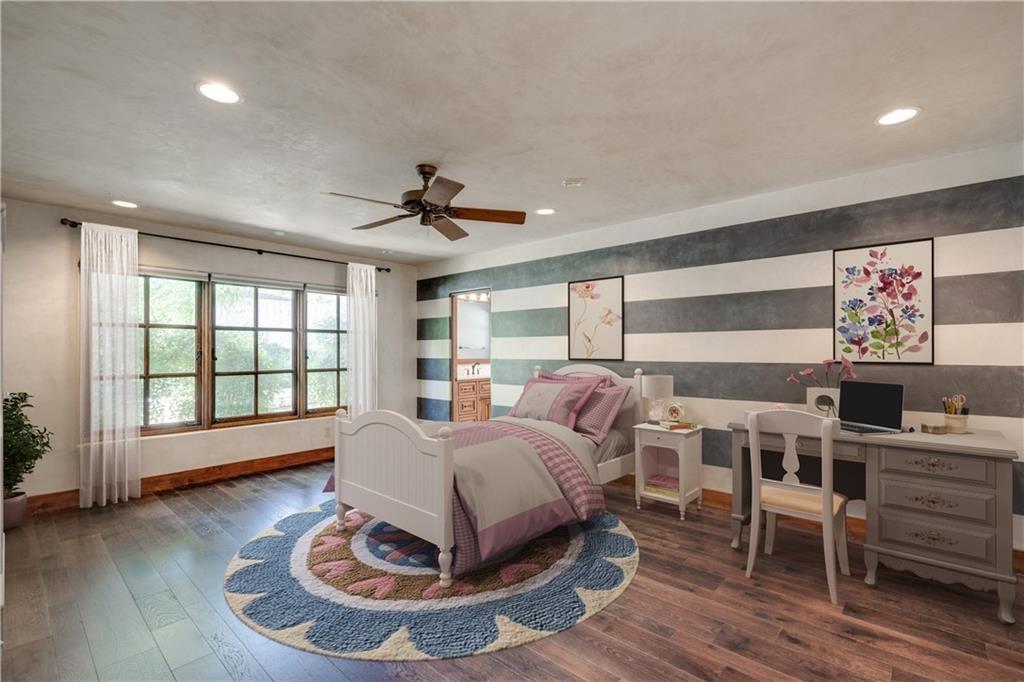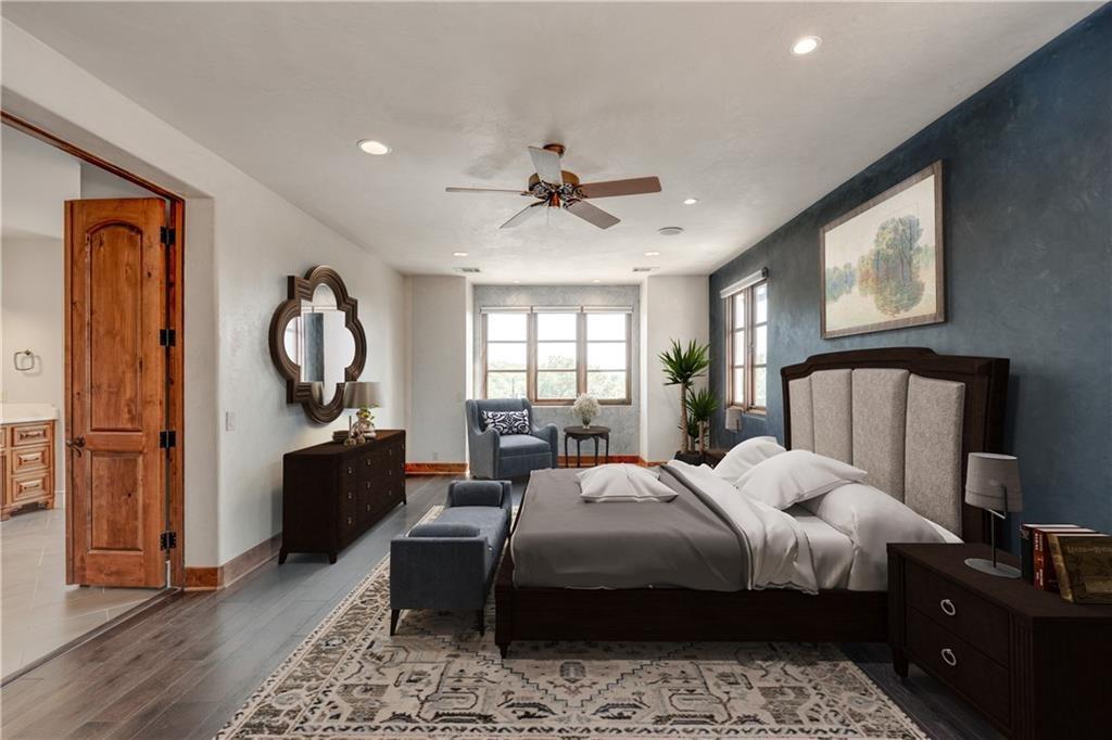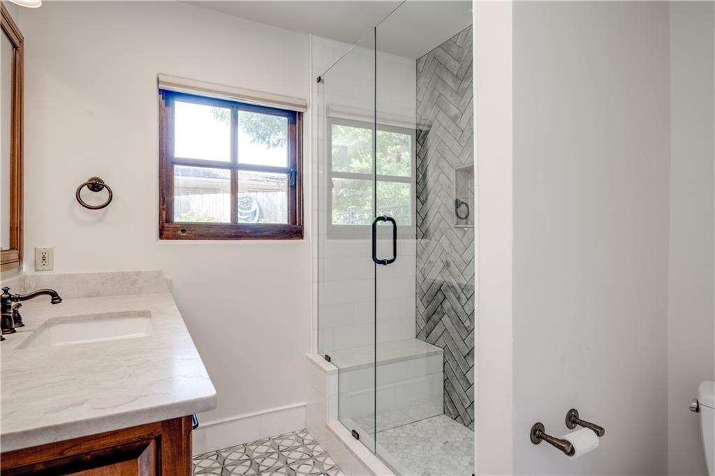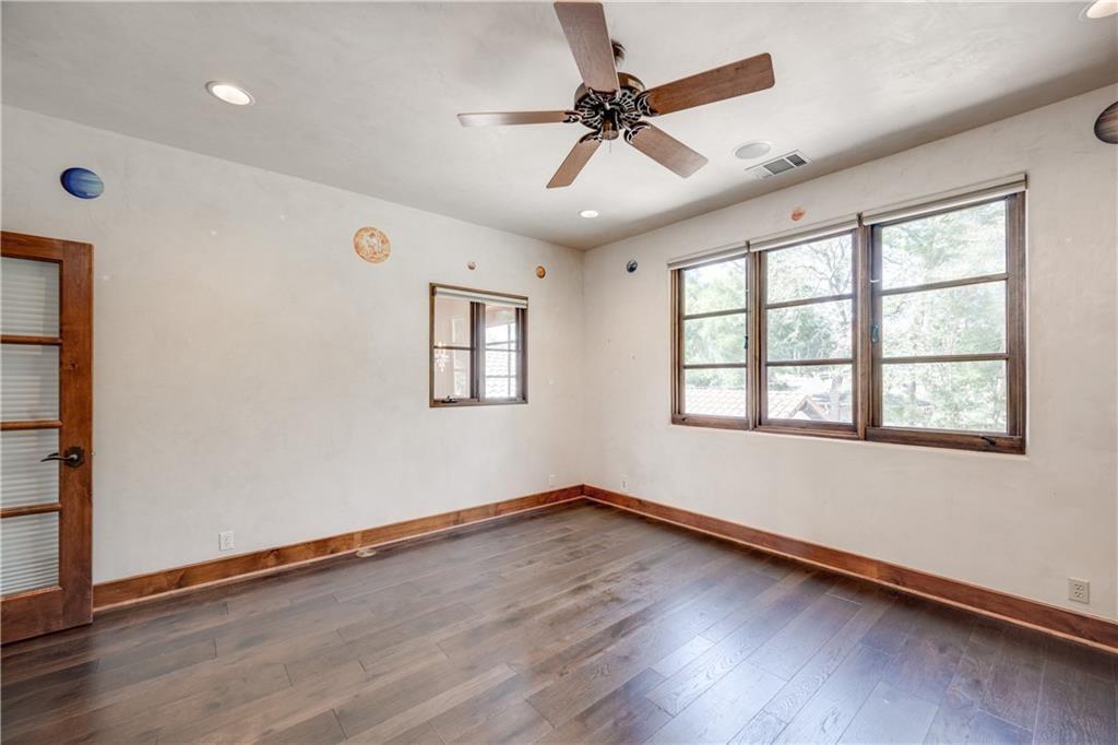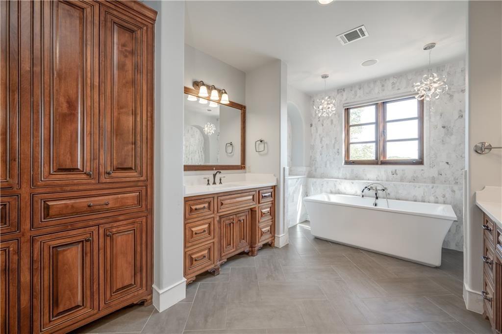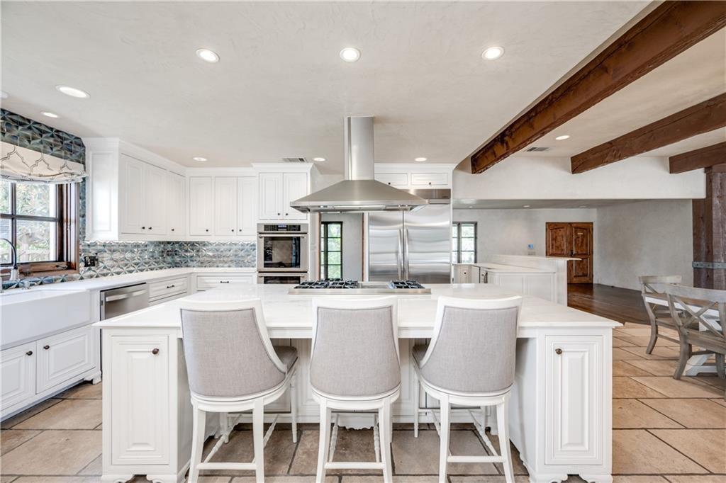 Fantastic location less than 6 miles from downtown, and easy access to The Domain and North Austin Tech corridor. This private estate offers Spanish influence beautifully blended with the latest high-end finishes. The lush pool area is right out of a magazine, and includes gorgeous flowering landscape and waterfalls. Inside, you'll find rich dark beamed ceiling, wood floors, a cast stone fireplace, a wall of French doors, and massive marble island-kitchen with a Viking gas cooktop. the kitchen is further finished with handmade glass backsplash. Primary suite features an elegant marble shower/tub area, a private office, 2 walk-ins & views!