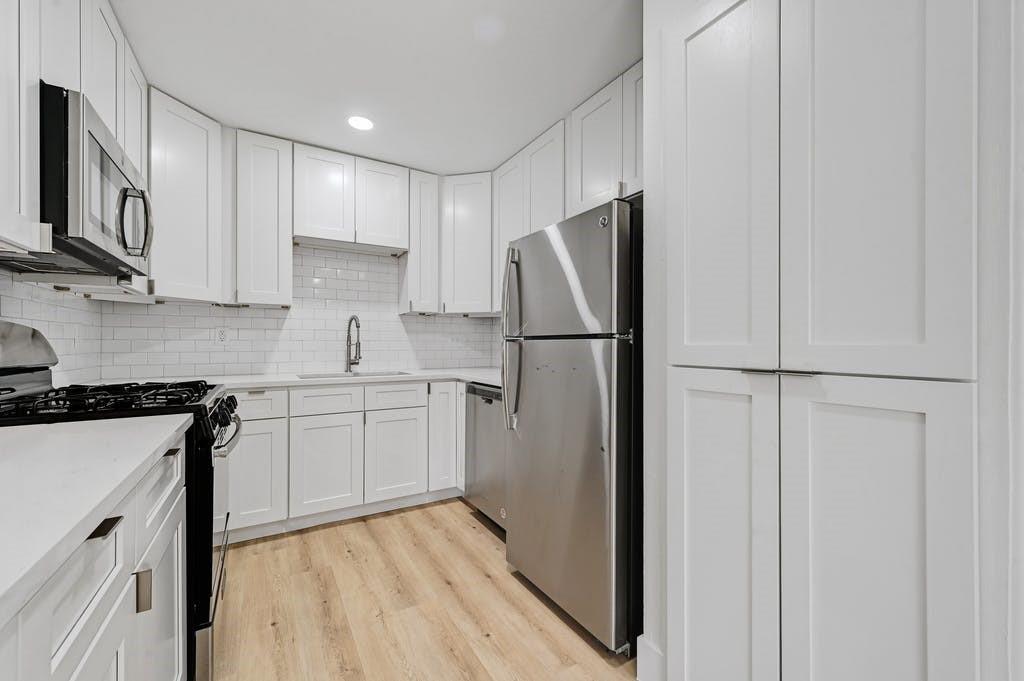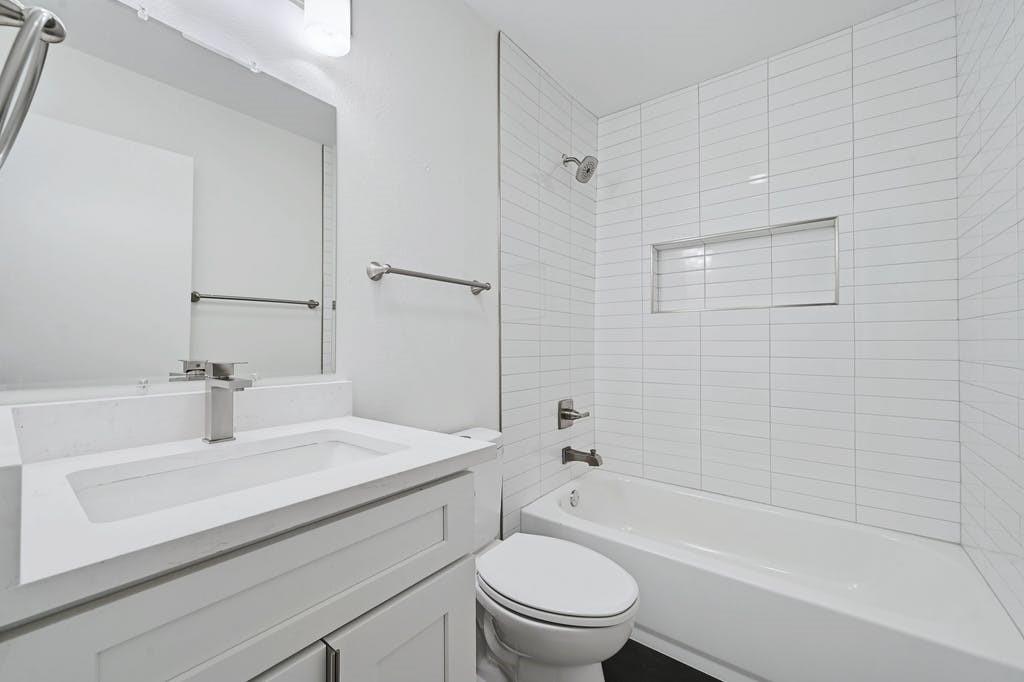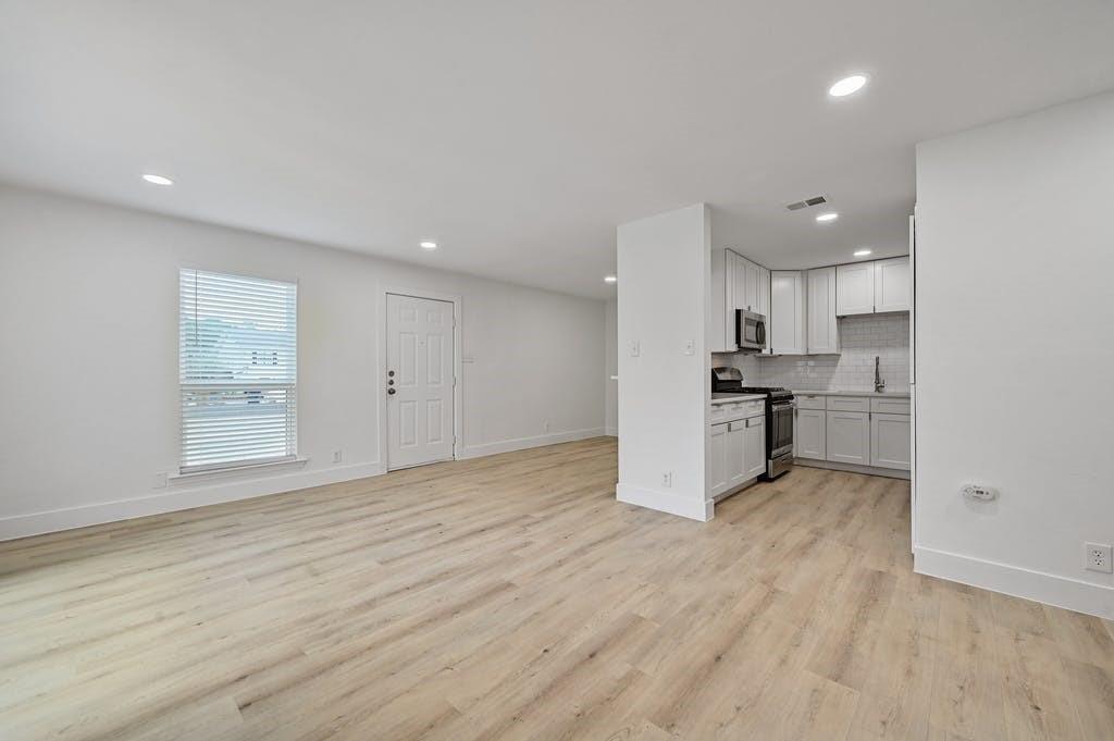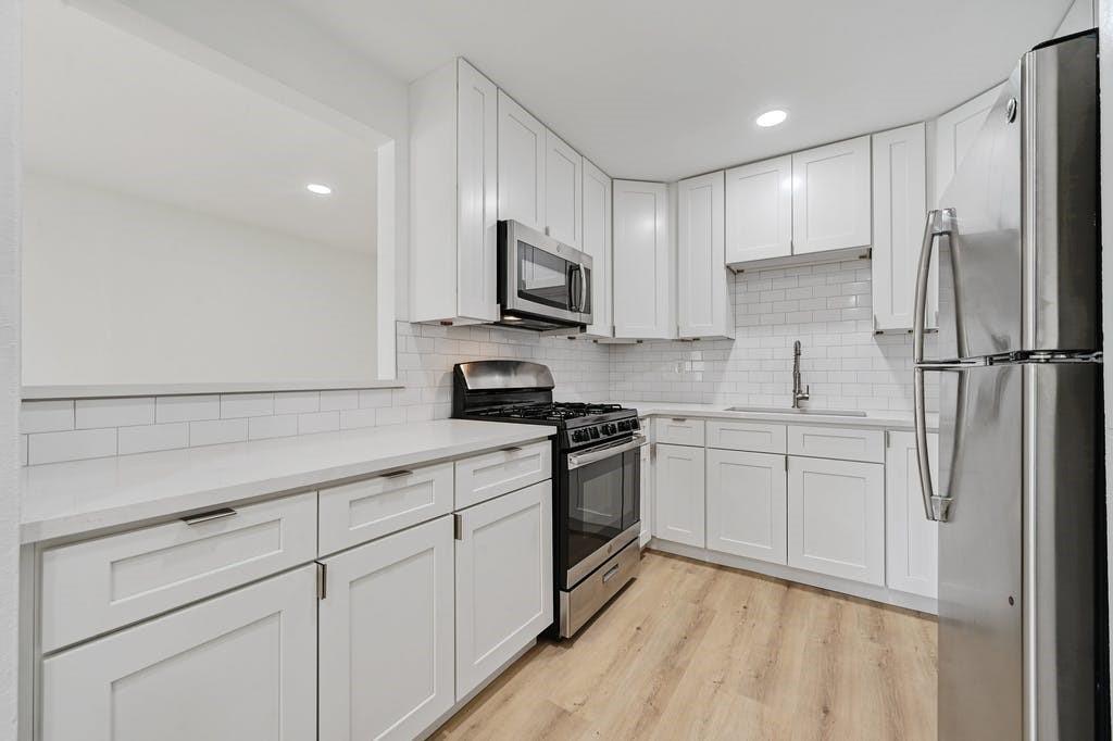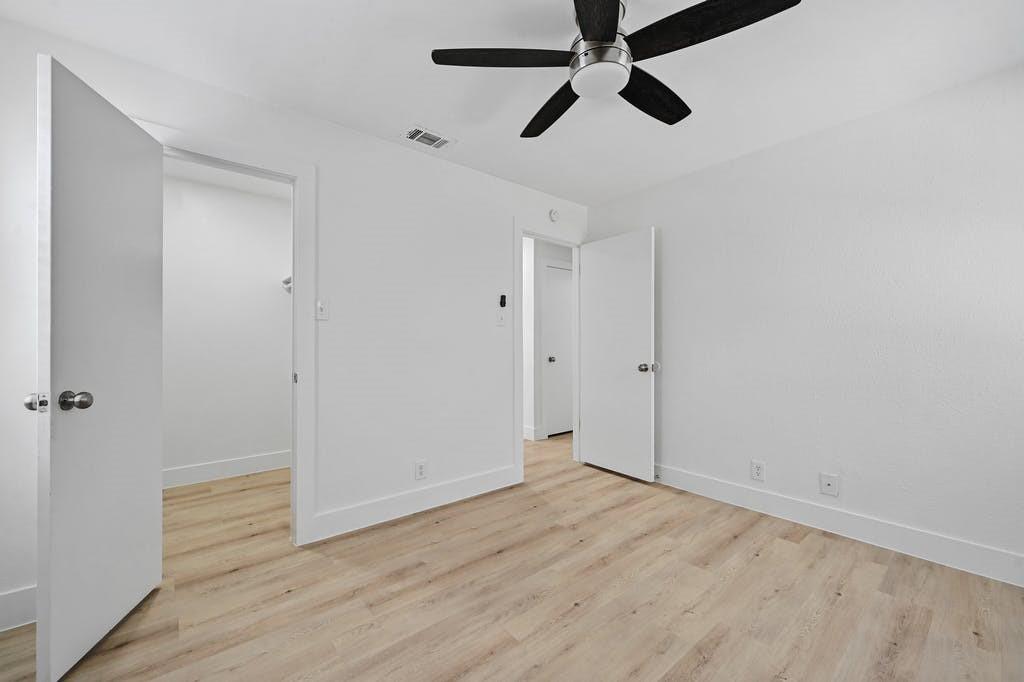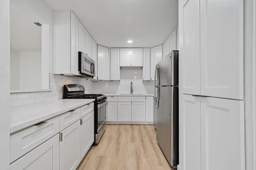 Available April 1. Gorgeous 4-plex unit was completely remodeled less than 2 years ago, including flooring, stainless appliances, bathroom vanity and tub, and blinds. Open plan with dining and living areas, sparkling kitchen with refrigerator, gas stove, dishwasher, microwave, pantry and loads of cabinets. Modern bathroom, walk-in closet and modern ceiling fans. Sliding glass doors lead to fenced yard shared with unit above only, and comes with own locked laundry and storage closet. Pets welcome. Lawn care and quarterly pest control included. 12-24 month lease.