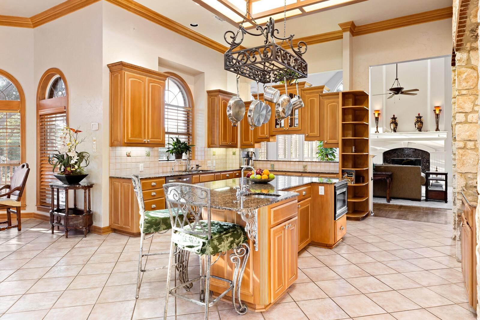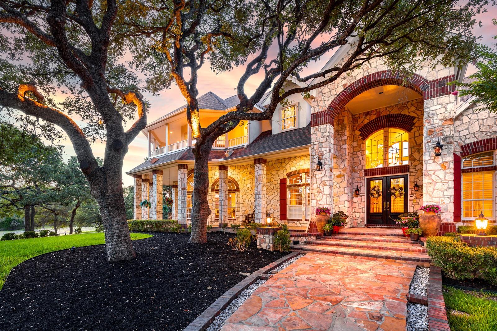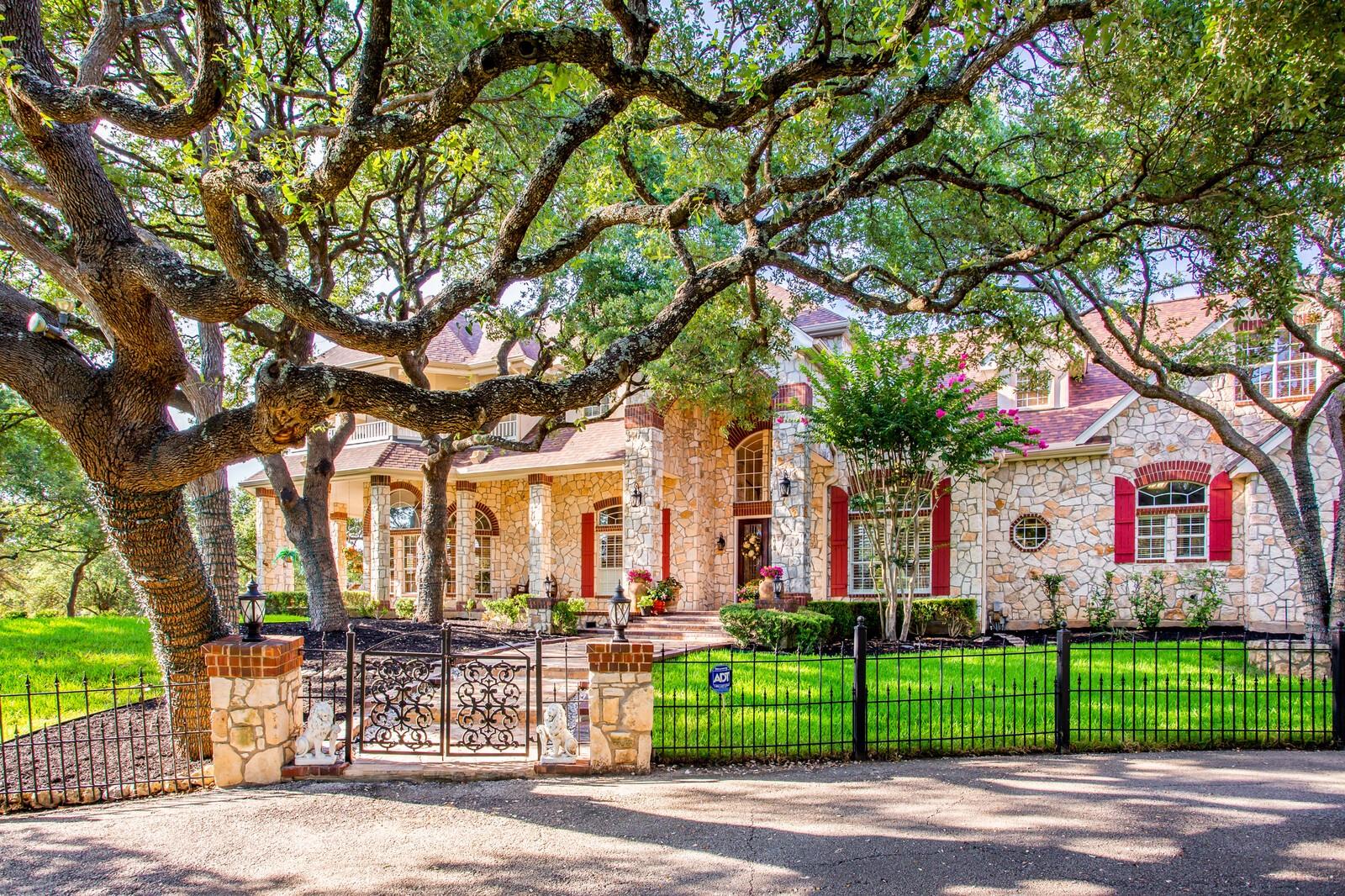 Grand Estate in Fair Oaks Ranch on 6.6acres framed by majestic oaks. Accented by the circular drive, the wraparound porch and upstairs wraparound balcony adds an element of timelessness offering stunning views of this parklike acreage. Soaring entry is flanked by stone columns into formal dining and butlers panty. Gorgeous dual staircase is an architectural focal point. Baby grand in the entry that flows into the casual living with fireplace and built-ins. Gourmet kitchen with central island, pot rack, double ovens, induction cooktop plus casual dining and gathering area. Guest suite is downstairs and the primary suite is a delight. Dual sided fireplace, sitting area, spa bath with garden tub, shower and dual closets- upstairs steam shower, workout area, her office. Large secondary ensuite bedrooms are up with spacious library/living. Additional game room is up with stacked rock wall fireplace, dining and game area.Extensive patios and decks with firepit and hot tub to enjoy the Texas sunsets. A stand alone exterior guest suite or office adds to the lovely functionality of this property. Three car garage, large laundry plus a kennel with washing station and a garden/greenhouse area. Property is two separate lots .
