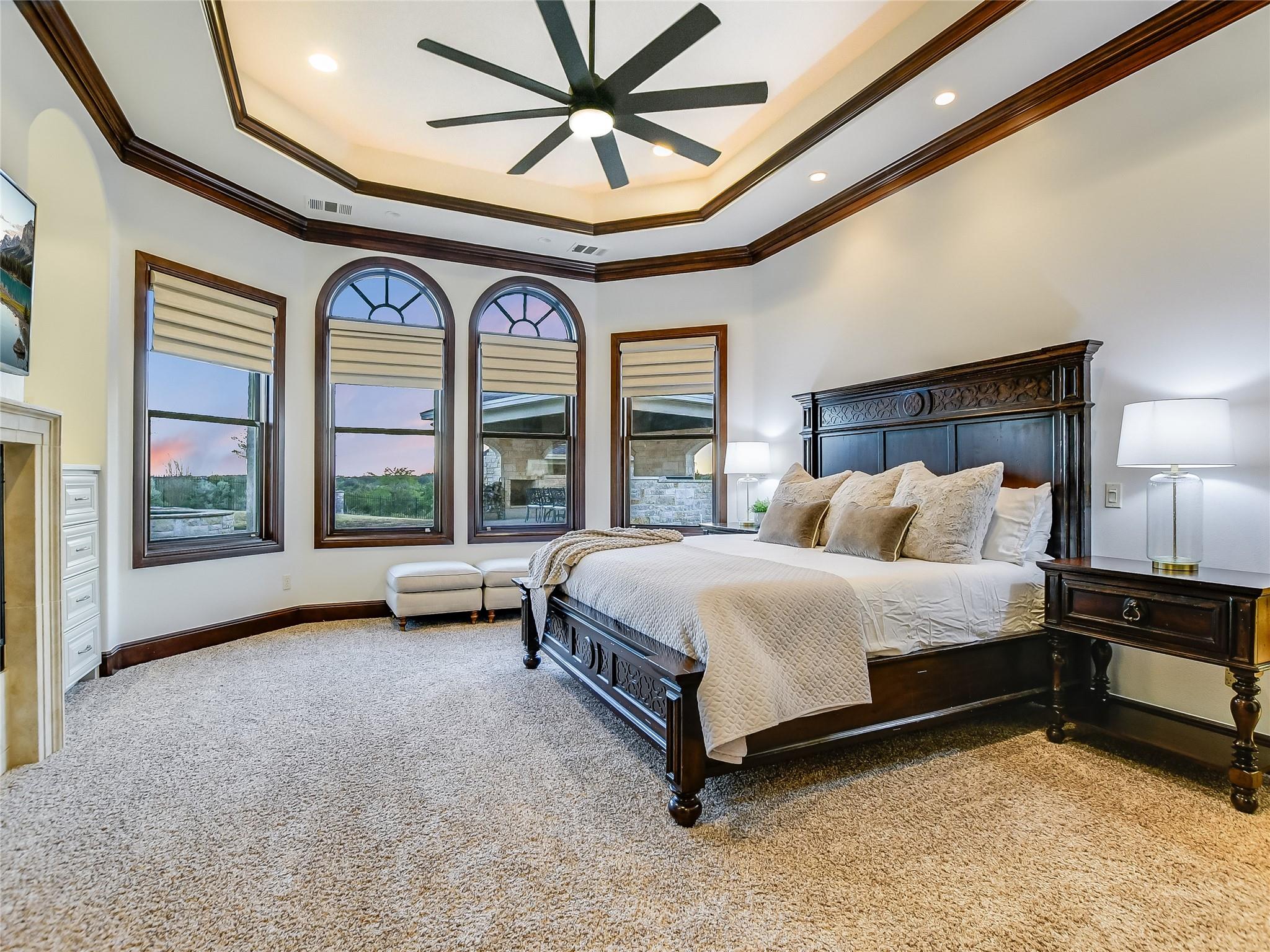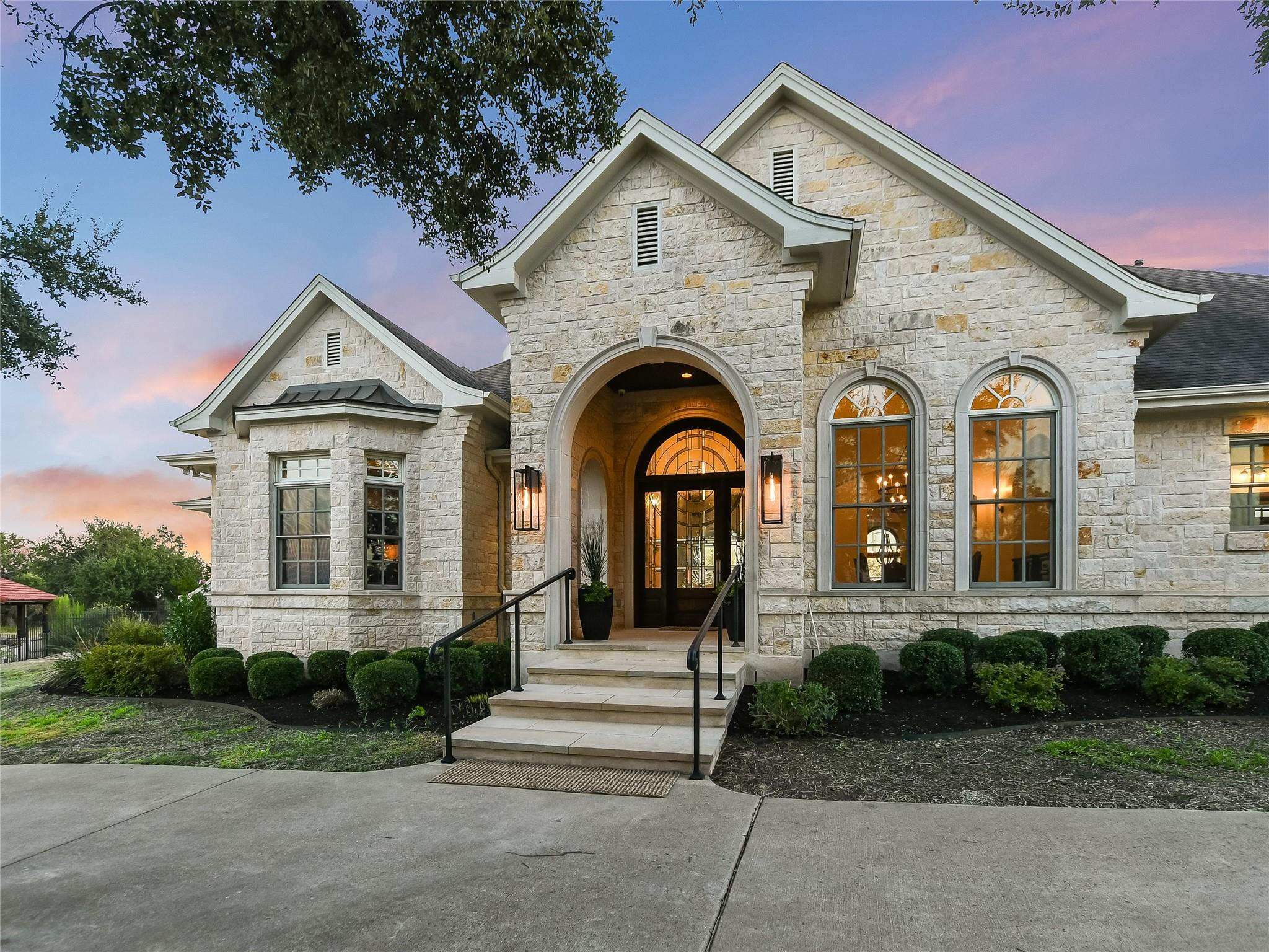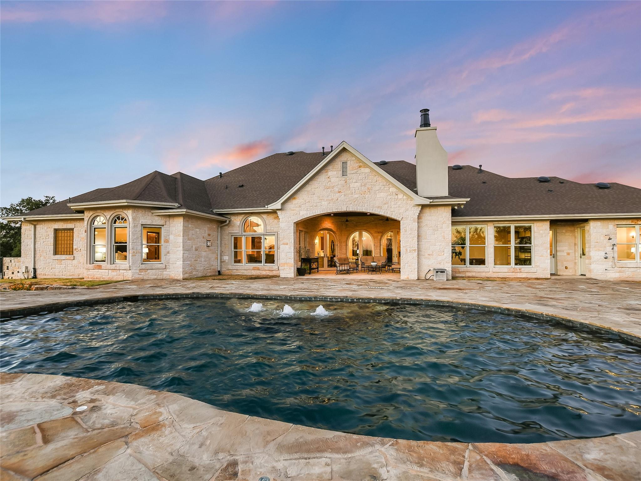 Welcome to your dream luxury home at the top of the hill with amazing Hill Country views in The Preserve, one of the most sought-after neighborhoods in Dripping Springs! This immaculate home was thoughtfully designed by the Geschke Group and built with the upmost quality craftsmanship by John Siemering Custom Homes. This 4-bedroom, each featuring its own en-suite bath and walk-in closet, boasts sophistication and modern style with its beautiful quartz countertops, designer lighting, and built-in wood cabinets throughout. The breathtaking pool and Hill Country views can be enjoyed from the back patio as well as the adjacent Cabana with its own crackling fireplace and outdoor kitchen, which makes this home perfect for entertaining or just enjoying an evening sunset. The luxurious pool also provides the perfect patio ambience with its water features and lighting in and out. The owner's sanctuary offers seclusion with its own fireplace, sitting area, and spa-like luxury bathroom. The gourmet kitchen, with rich wood cabinets and quartz countertops, overlooks the family room, breakfast area, and breathtaking views through the backyard. The sizable office space doubles as a fifth bedroom with large walk-in cedar closet. A second master bedroom with en-suite bath is conveniently located next to the playroom which also has access to the back patio. A large bonus area upstairs could be used as an additional bedroom, home theater, additional office, or gym and has a 10x20 storage closet lined with shelving. The home includes two 2-car garages and an oversized parking pad and carport that are all behind a gate for convenient, secure home access. There is also a bonus golf cart garage with extra storage area that is perfect for this gated community, which could also be converted into a second home office space.