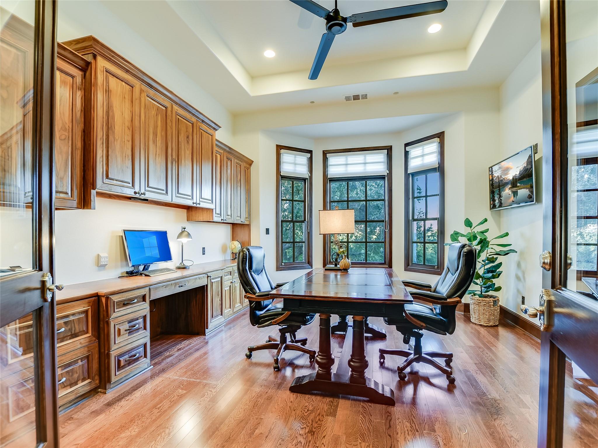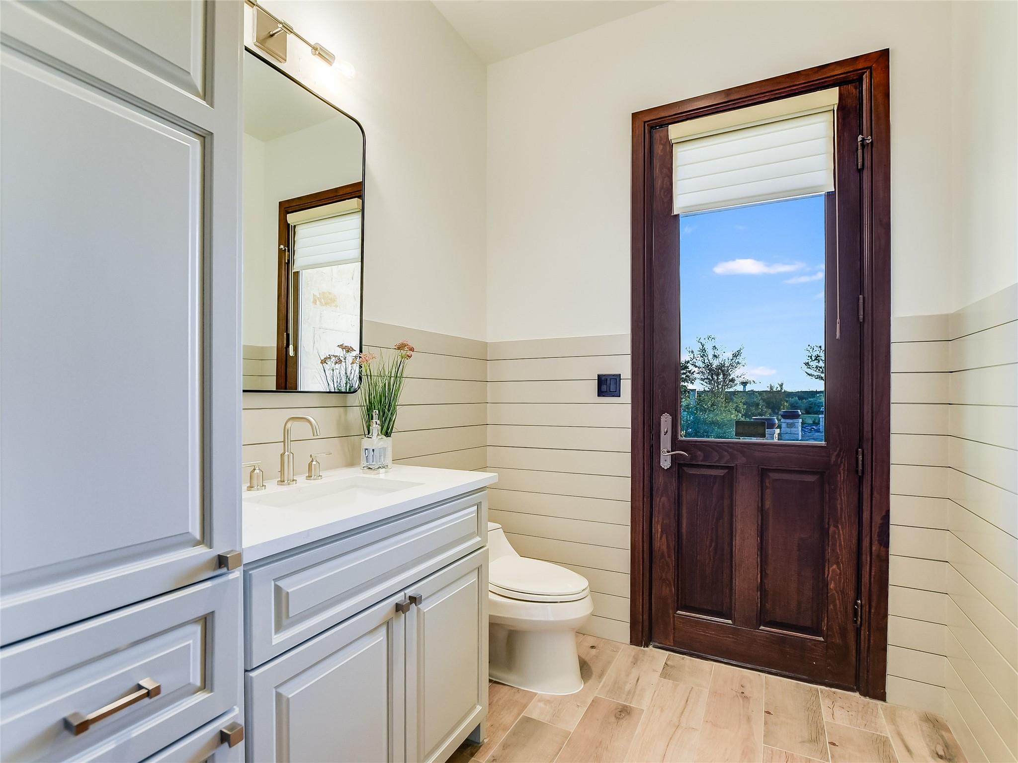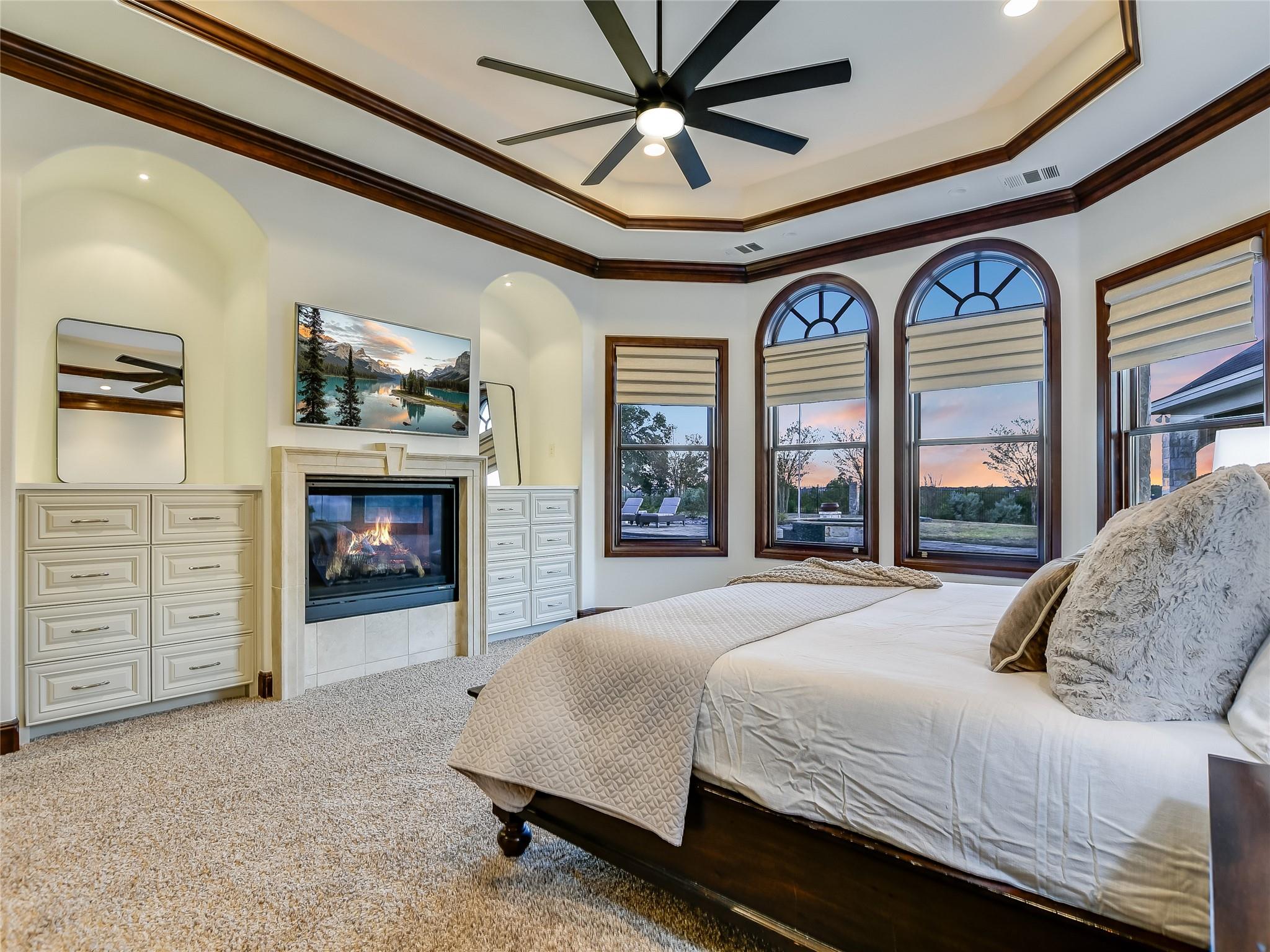 Welcome to your dream luxury home at the top of the hill with amazing Hill Country views in The Preserve, one of the most sought-after neighborhoods in Dripping Springs! This immaculate home was thoughtfully designed by the Geschke Group and built with the upmost quality craftsmanship by John Siemering Custom Homes. This 4-bedroom, each featuring its own en-suite bath and walk-in closet, boasts sophistication and modern style with its beautiful quartz countertops, designer lighting, and built-in wood cabinets throughout. The breathtaking pool and Hill Country views can be enjoyed from the back patio as well as the adjacent Cabana with its own crackling fireplace and outdoor kitchen, which makes this home perfect for entertaining or just enjoying an evening sunset. The luxurious pool also provides the perfect patio ambience with its water features and lighting in and out. The owner's sanctuary offers seclusion with its own fireplace, sitting area, and spa-like luxury bathroom. The gourmet kitchen, with rich wood cabinets and quartz countertops, overlooks the family room, breakfast area, and breathtaking views through the backyard. The sizable office space doubles as a fifth bedroom with large walk-in cedar closet. A second master bedroom with en-suite bath is conveniently located next to the playroom which also has access to the back patio. A large bonus area upstairs could be used as an additional bedroom, home theater, additional office, or gym and has a 10x20 storage closet lined with shelving. The home includes two 2-car garages and an oversized parking pad and carport that are all behind a gate for convenient, secure home access. There is also a bonus golf cart garage with extra storage area that is perfect for this gated community, which could also be converted into a second home office space.