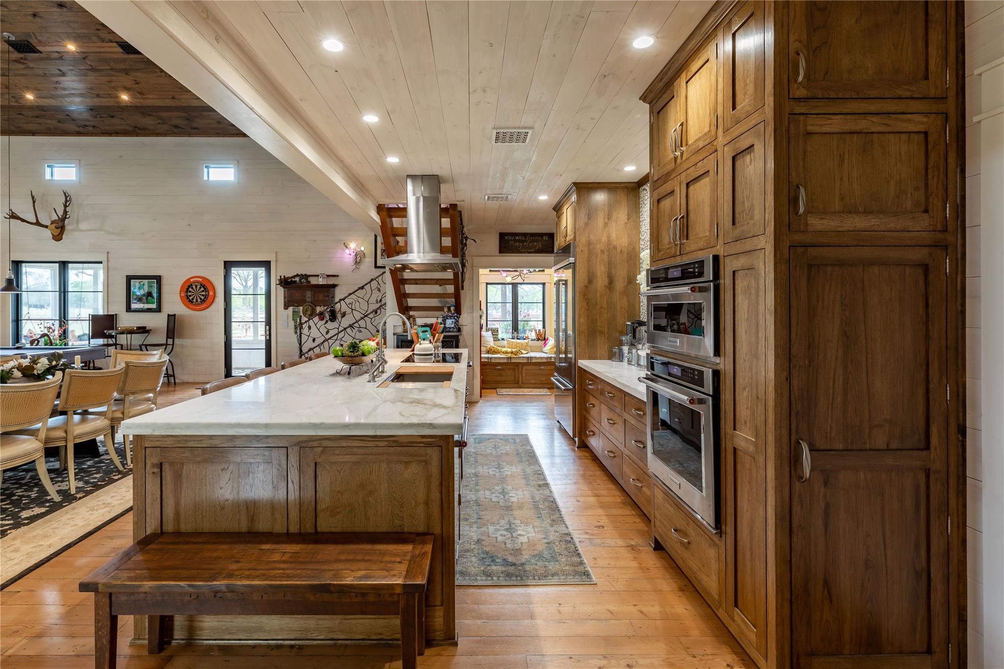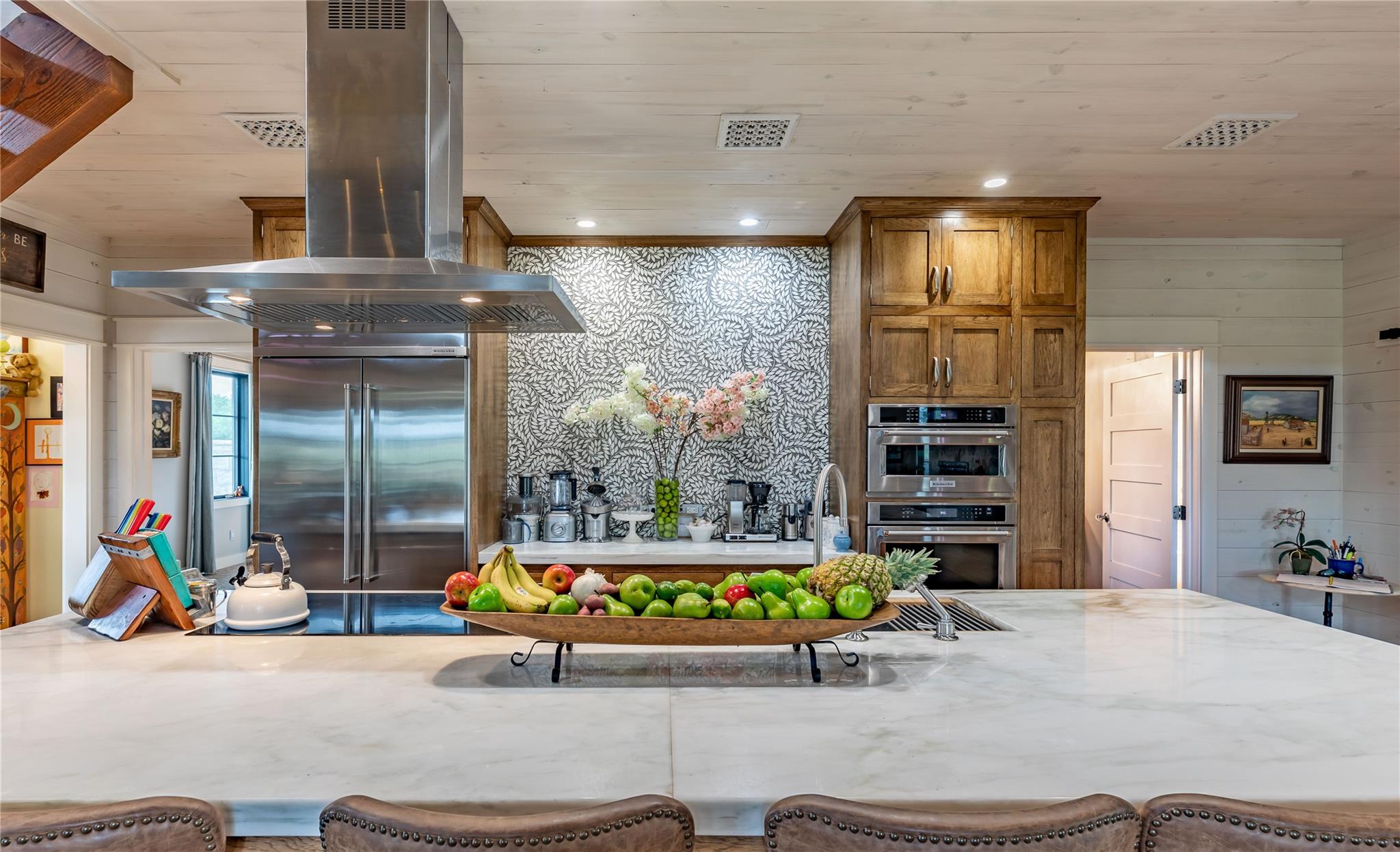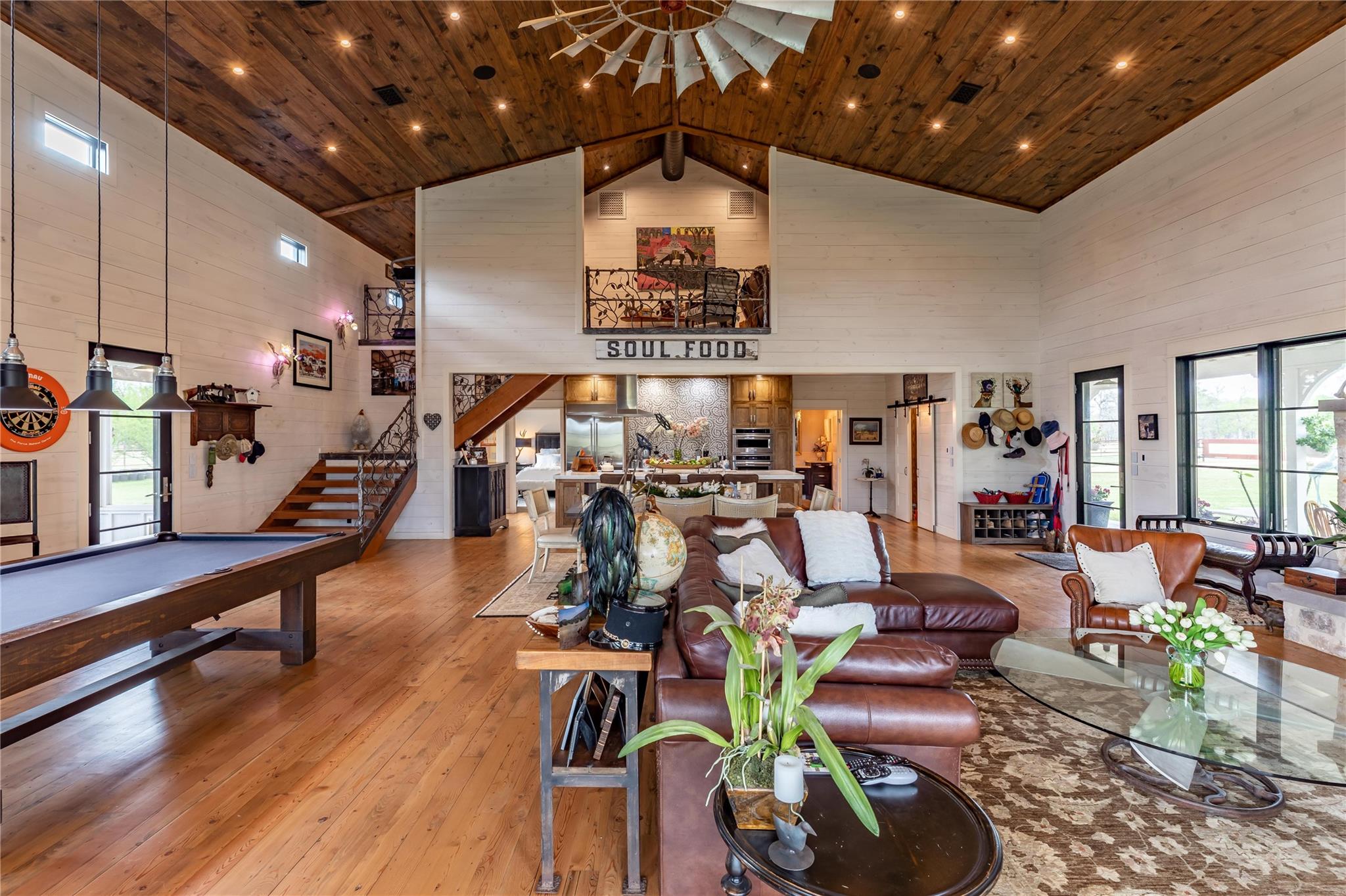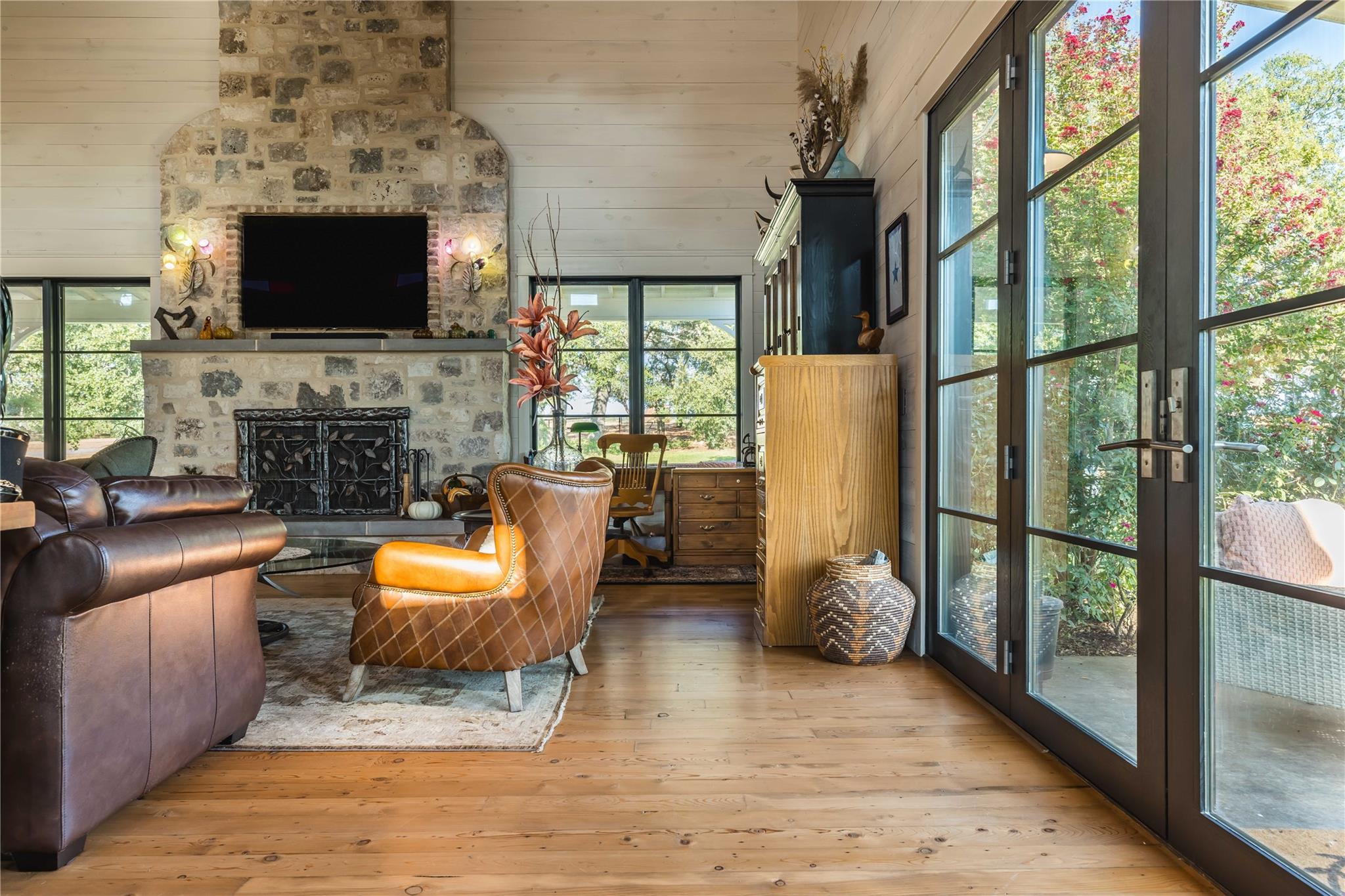 HILL COUNTRY HAVEN! Located on 69+/- acres in Fredericksburg, Texas, at the end of a country road that provides ideal privacy and quiet solitude, yet only a few minutes to town. Bring your horses, your RV, and your love for land and a beautiful home, and settle into your own Hill Country Lifestyle. The home is surrounded by porches. On one side is a beautiful pool, and on the other side is a screened porch with an outdoor circular patio with a center fire pit. The open concept home is outfitted with high-quality finishes throughout, including reclaimed pine flooring from an 1800s barn, Murano glass fixtures, Rocky Mountain Hardware, custom tile backsplash (inspired by the Plaza Hotel in NYC), custom iron railing, shiplap walls, a fan that is made from a windmill, and a beautiful rock fireplace with a custom forged screen. The kitchen displays custom walnut cabinetry, top-of-the-line appliances, an ice maker, a workstation sink, and a large pantry. Next to the kitchen is a cozy nook, perfect for your morning coffee, reading, or simply enjoying the solitude. The primary is located on the main floor and has a large walk-in closet complete with built-ins. The ensuite has a dual vanity and large dual walk-in shower. Two guest bedrooms share a bathroom and double vanity, tub/shower combo and are adjacent to a second living area. This property includes 8 horse stalls and a barn along with perimeter and cross fencing. There is 450 feet of Palo Alto Creek running through, and you’ll see Sika, Black Buck Antelope, Axis, and White Tail Deer roaming through. The land is sandy loam and has an Ag Valuation.